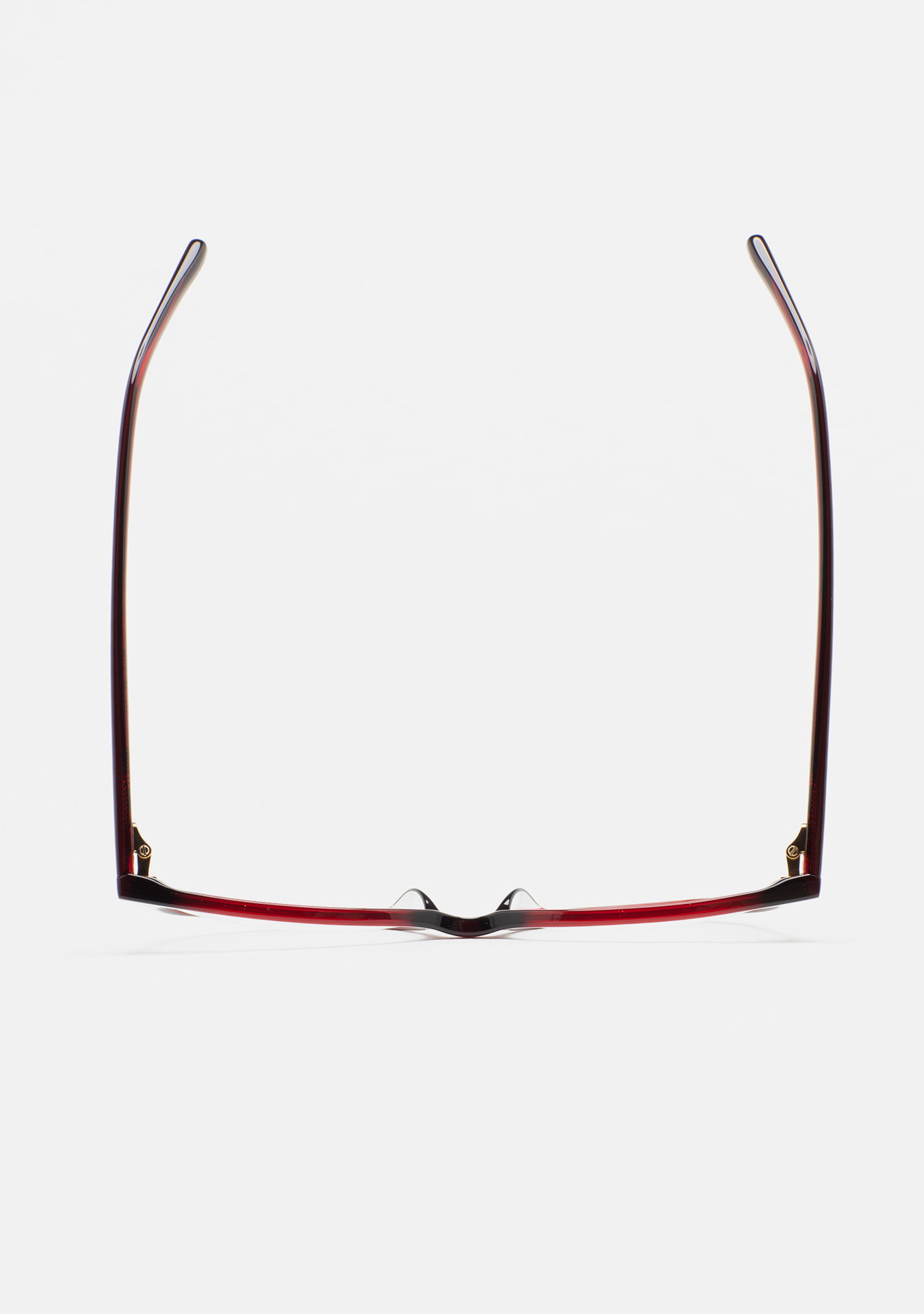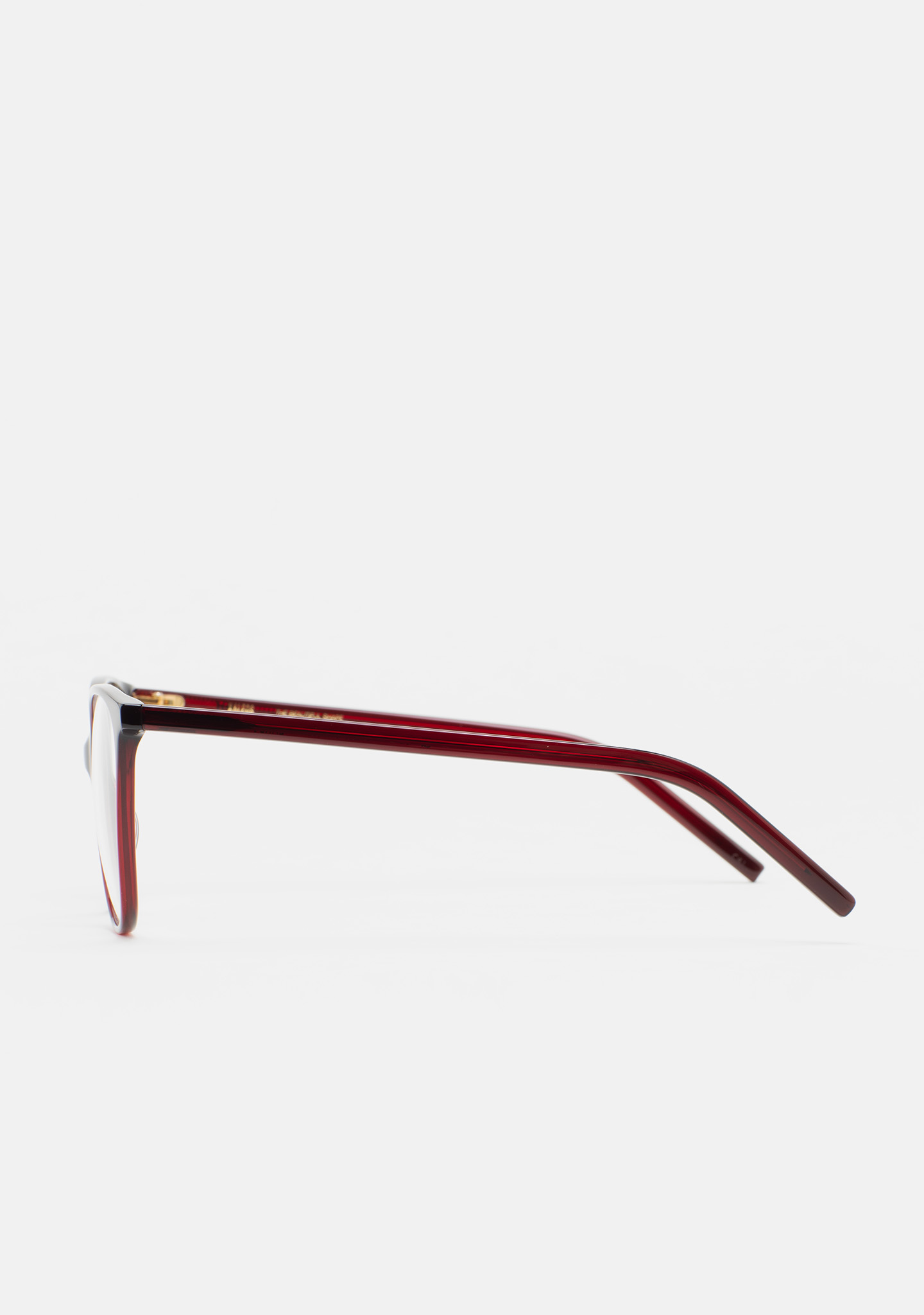 Lunettes de vue de forme papillon. Monture et branches en acétate haute densité bordeaux translucide. Plaquettes en acétate intégrées. Fait main.