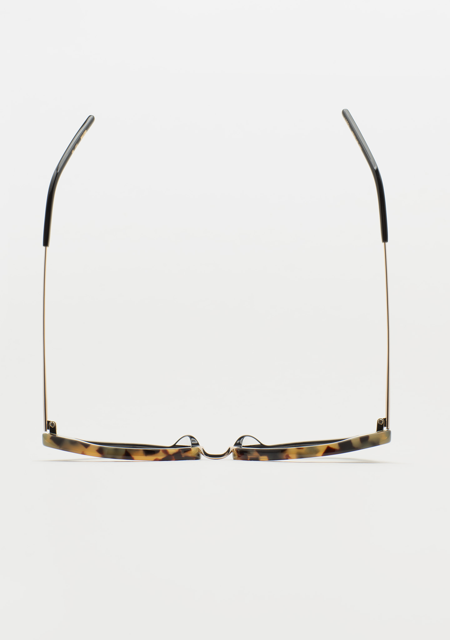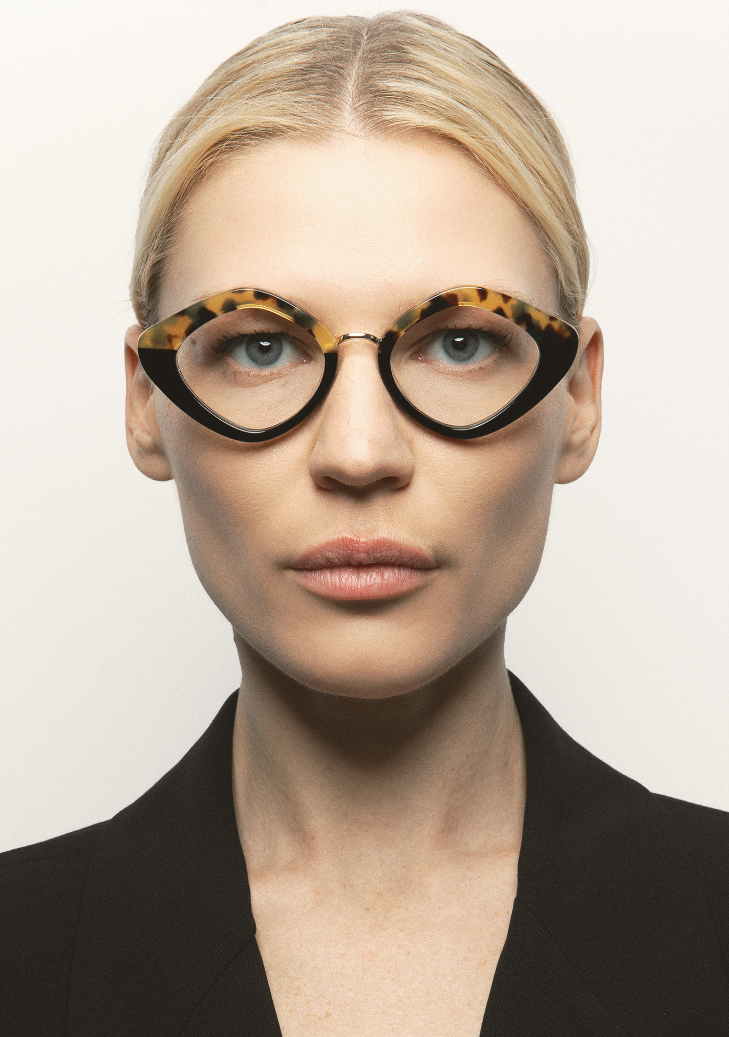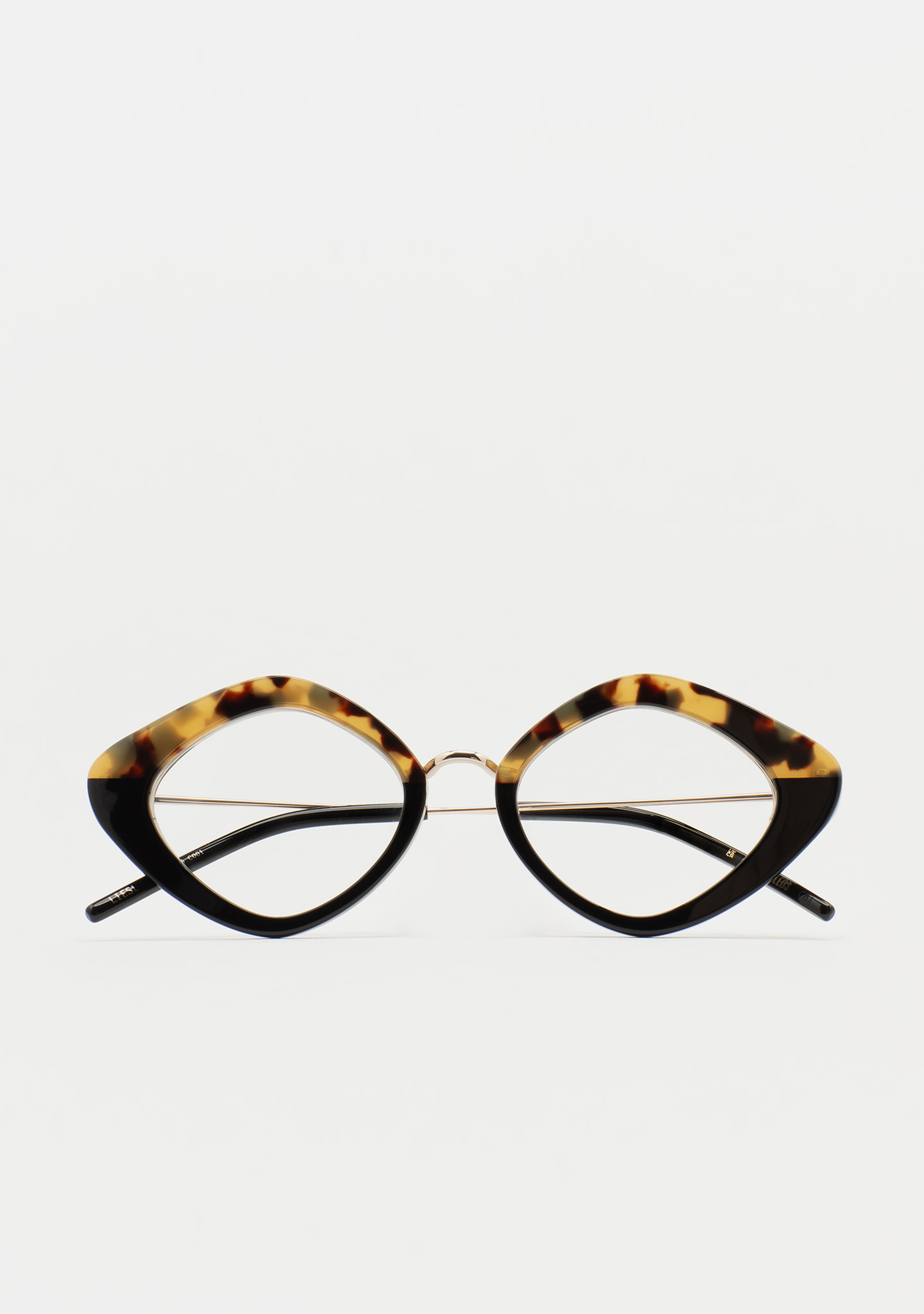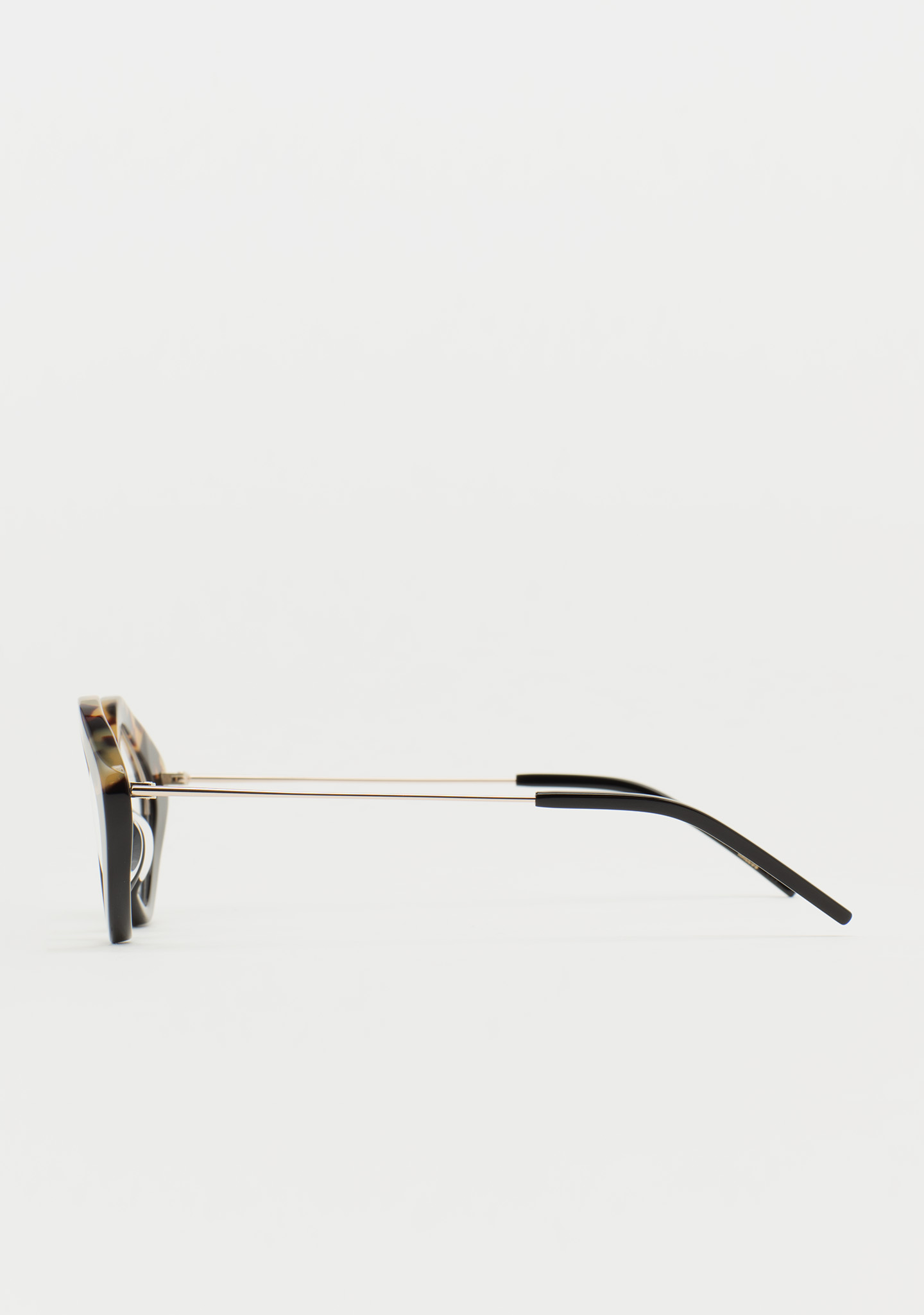 Lunettes de vue de forme Sil-de-chat. Un design qui respire la modernité. Face en acétate noir avec laminage havane marron. Structure et pont en acier inoxydable doré. Branches en acier inoxydable avec embouts en acétate noir. Plaquettes en acétate intégrées. Fabriquées à la main.