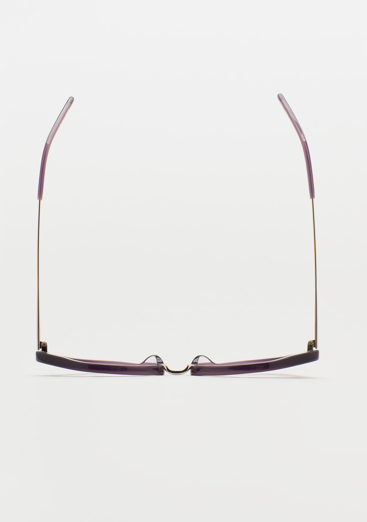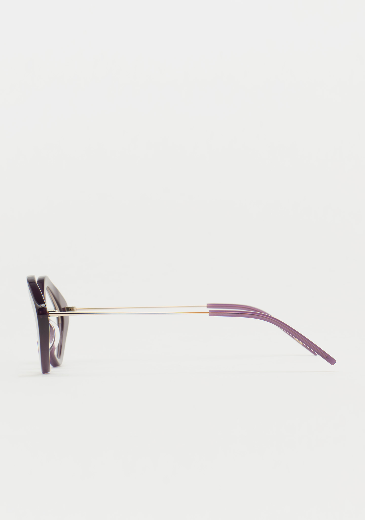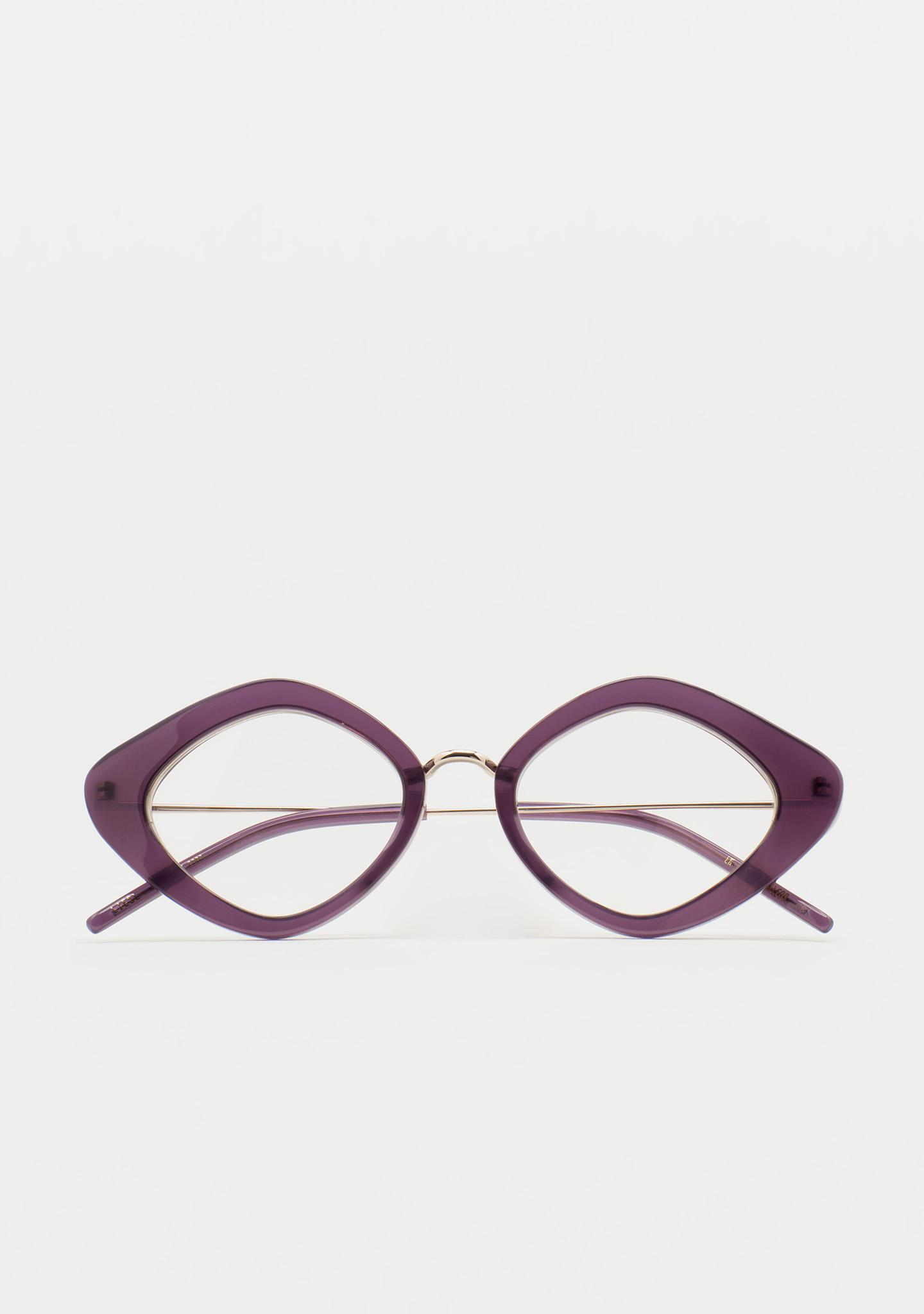 Lunettes de vue de forme Sil-de-chat. Un design qui respire la modernité. Face en acétate pourpre transparent. Structure et pont en acier inoxydable doré. Branches en acier inoxydable avec embouts en acétate pourpre transparent. Plaquettes en acétate intégrées. Fabriquées à la main.