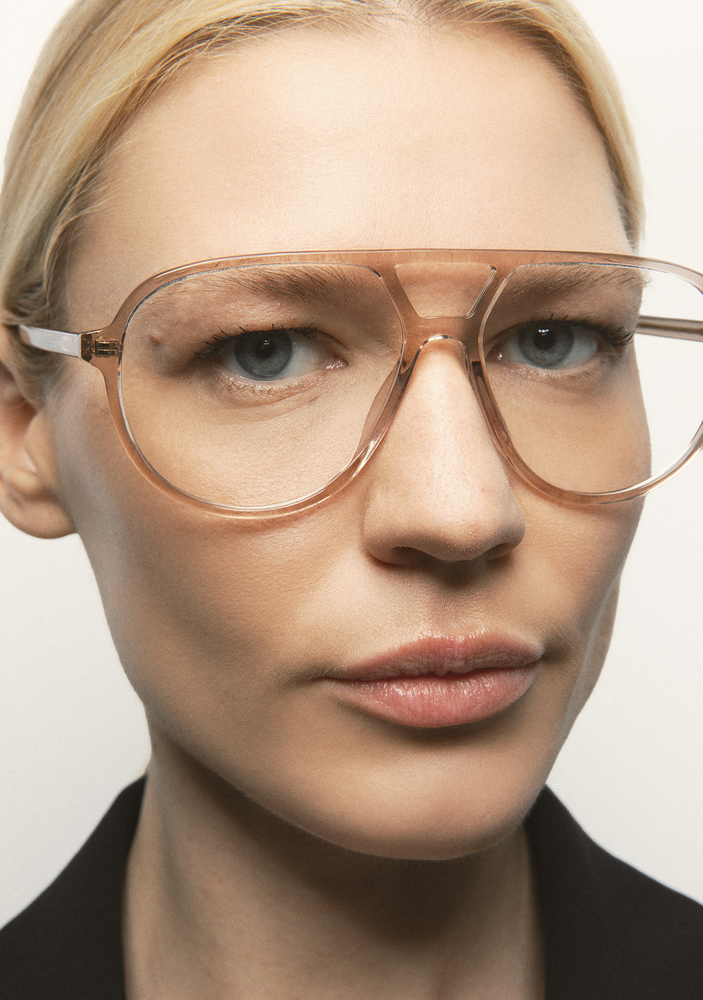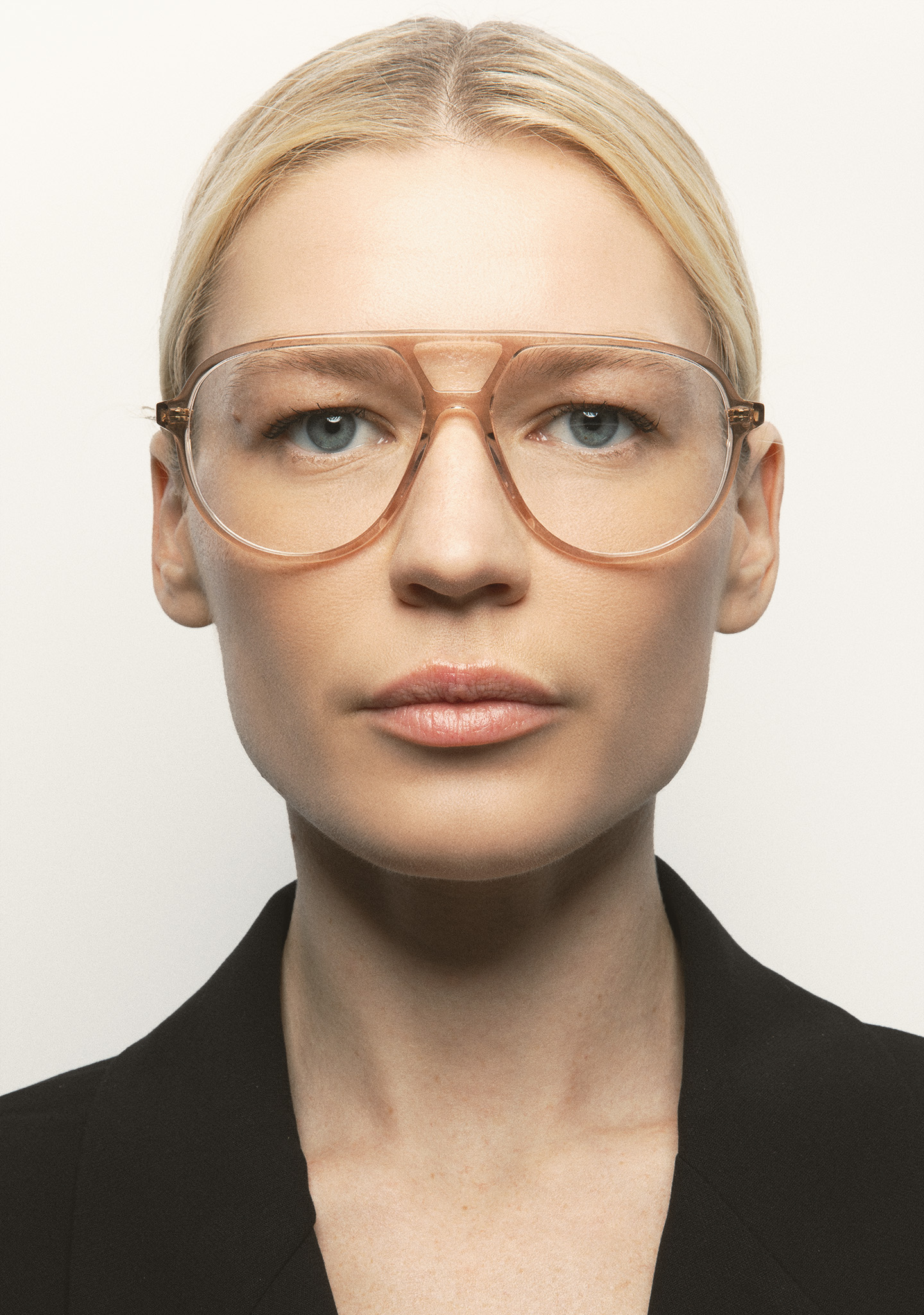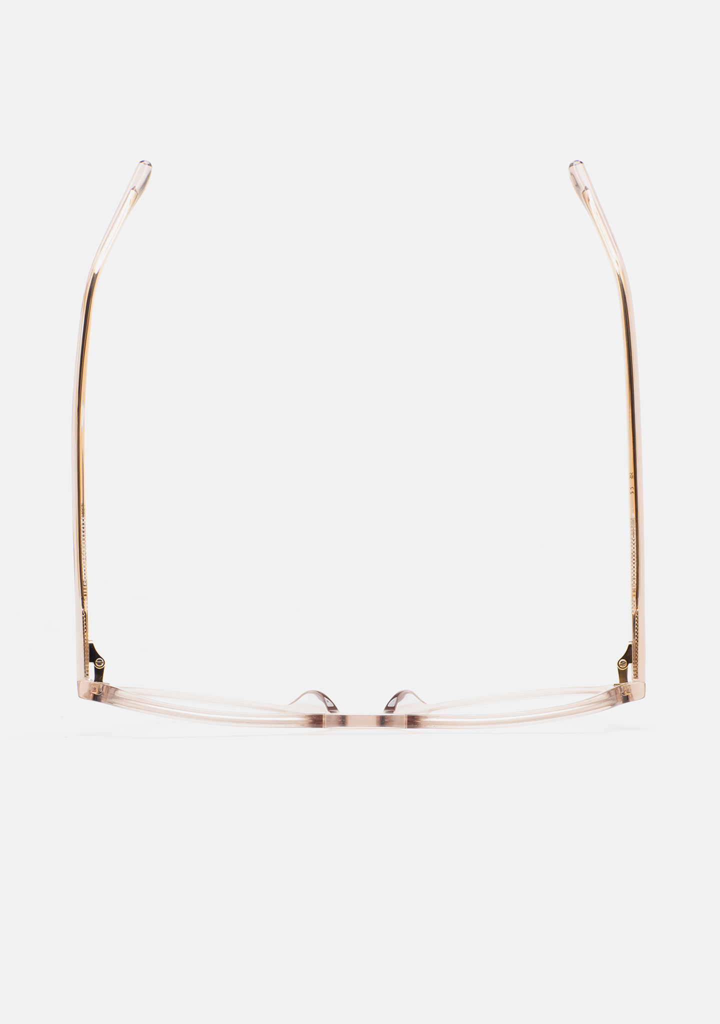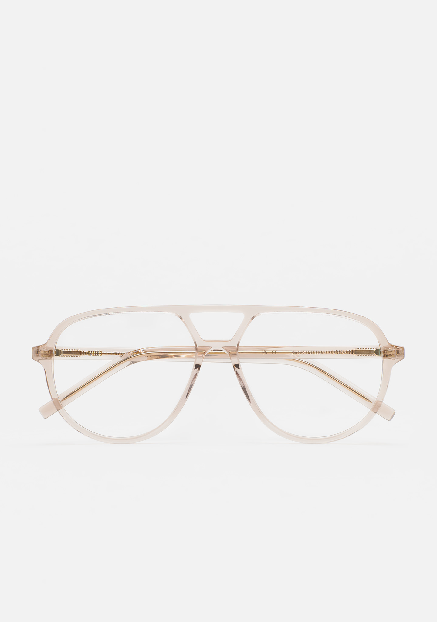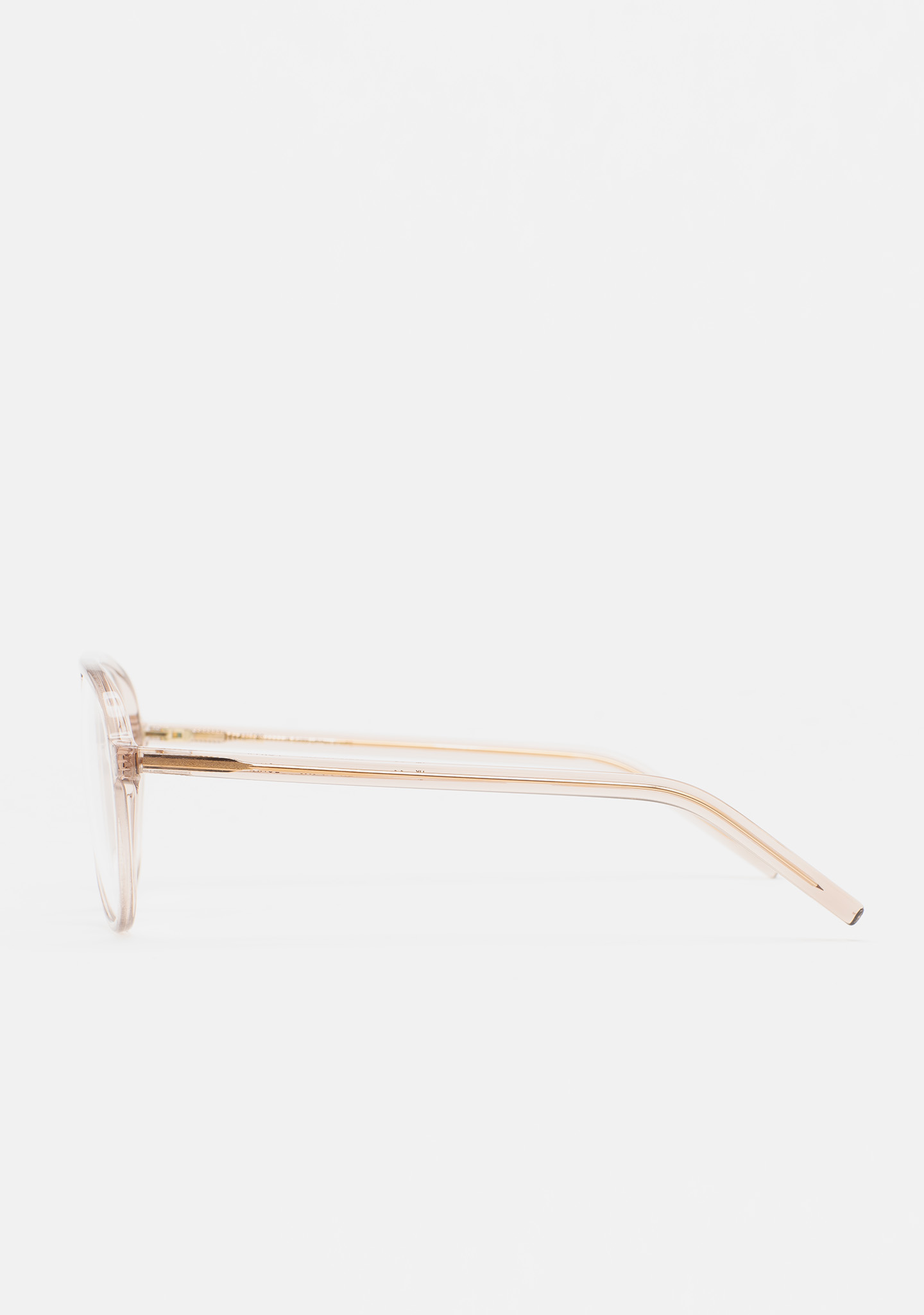 Lunettes de vue de forme aviateur avec double pont. Monture et branches en acétate haute densité rose clair transparent. Plaquettes en acétate intégrées. Fait main.