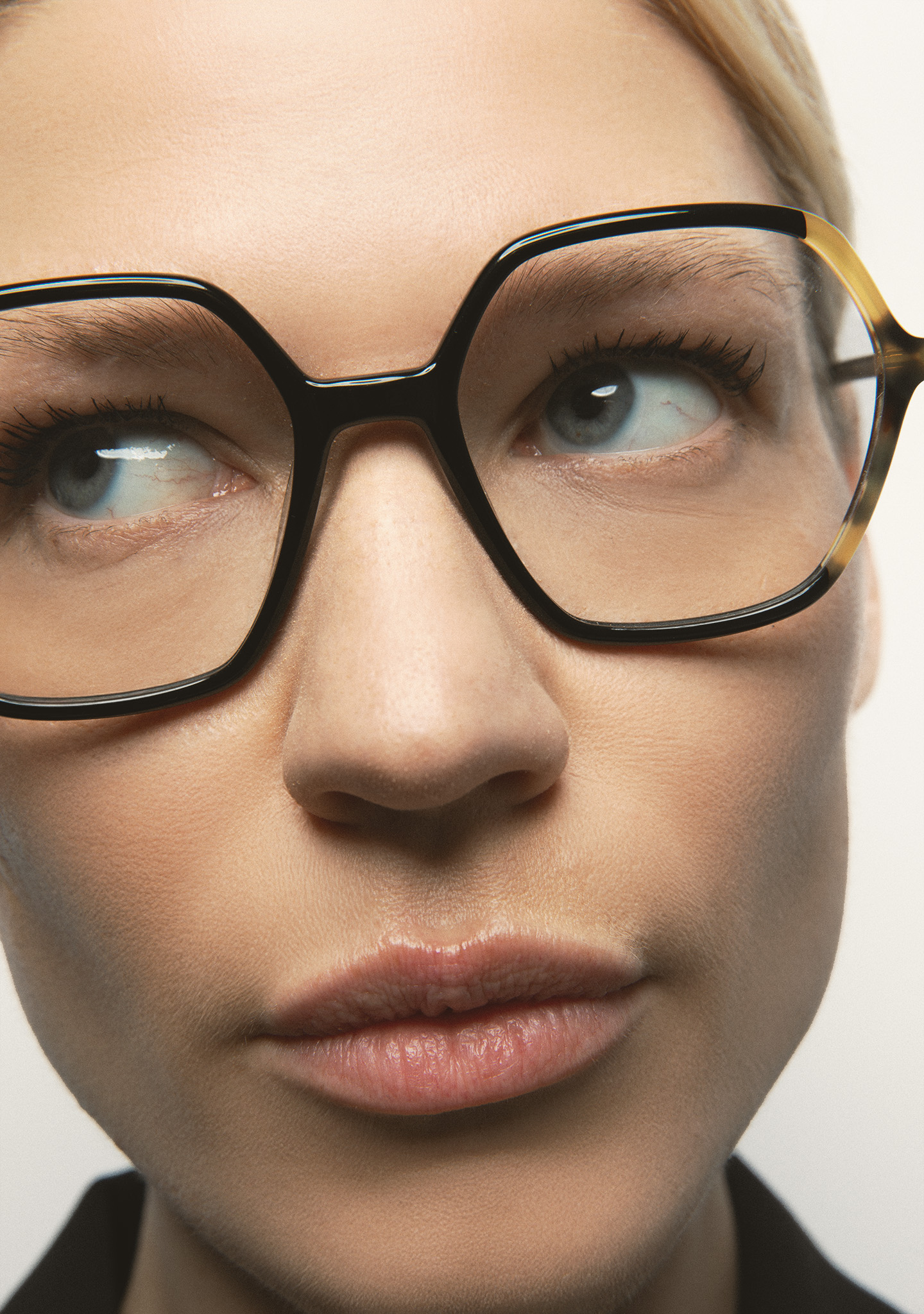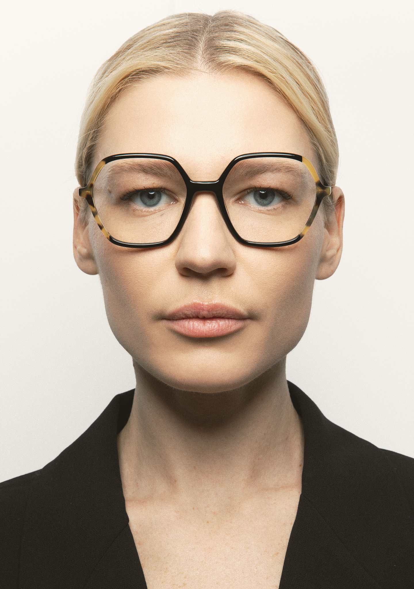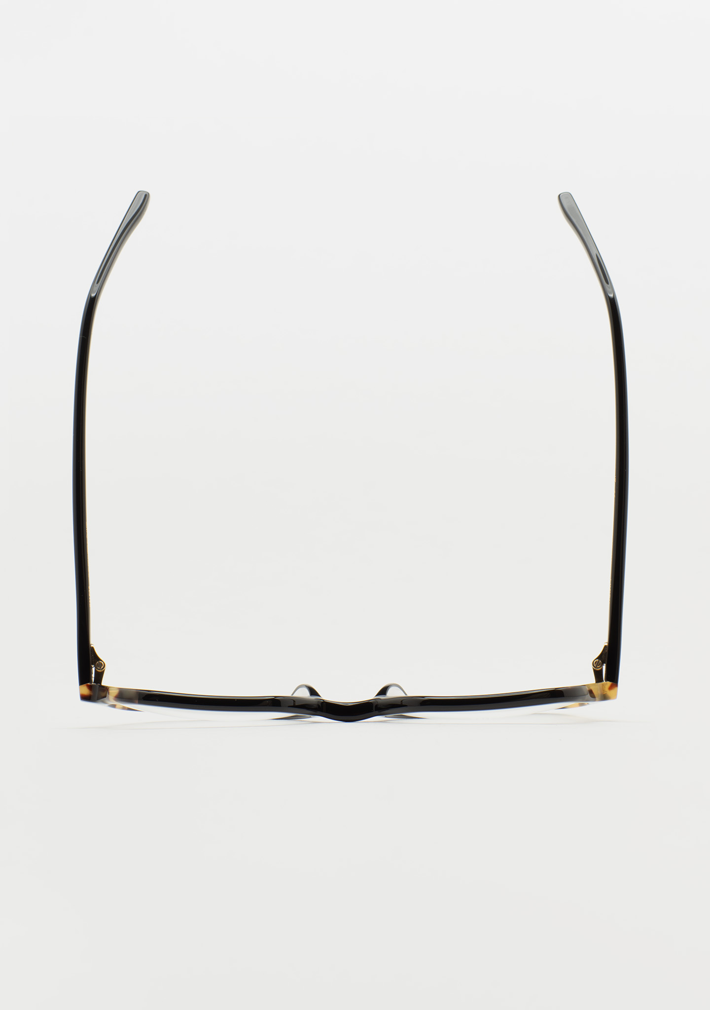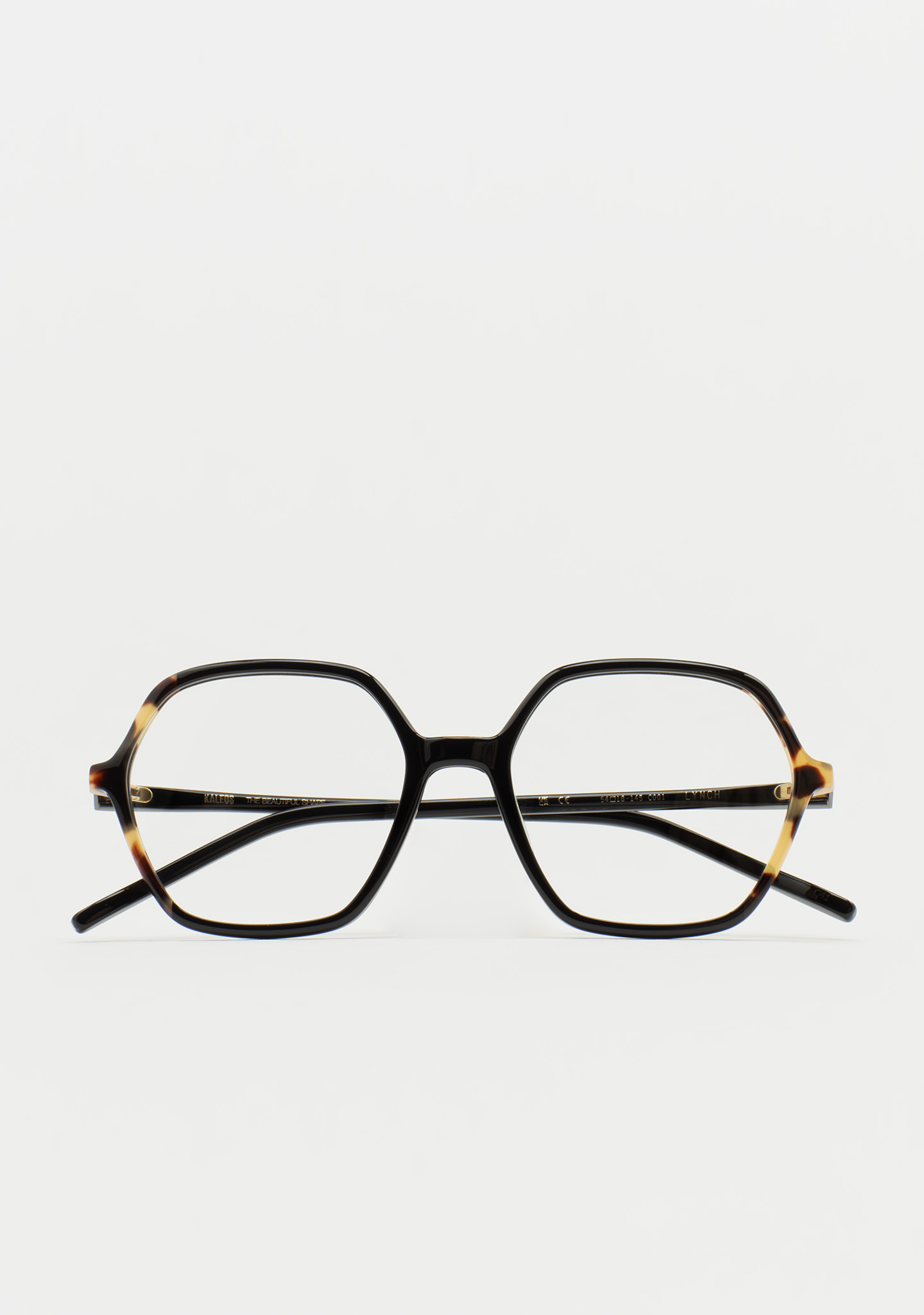Lunettes de vue hexagonales. Un design qui allie forme et fonction. Face avant en acétate haute densité noir avec laminage havane marron. Branches en acétate haute densité noir. Plaquettes de nez en acétate intégrées. Fabriquées à la main.