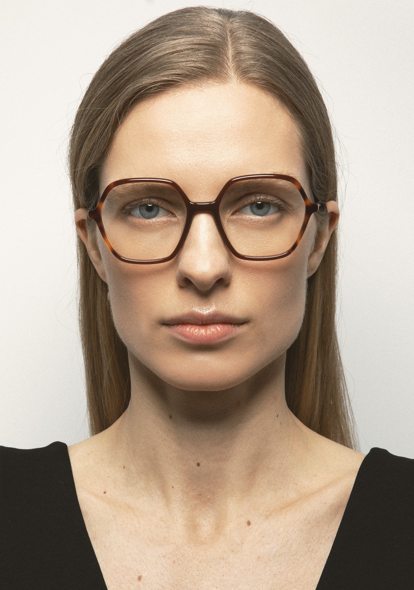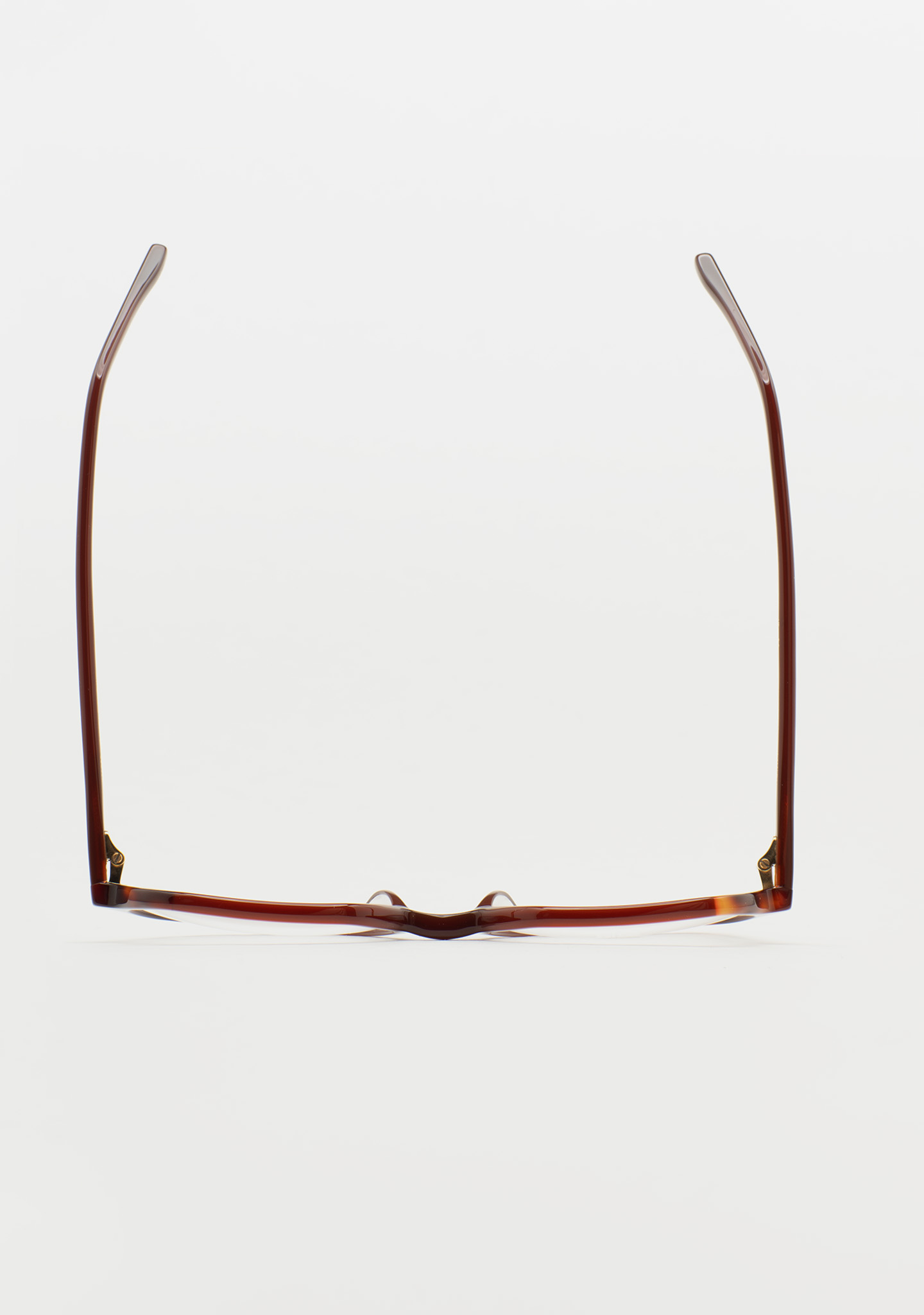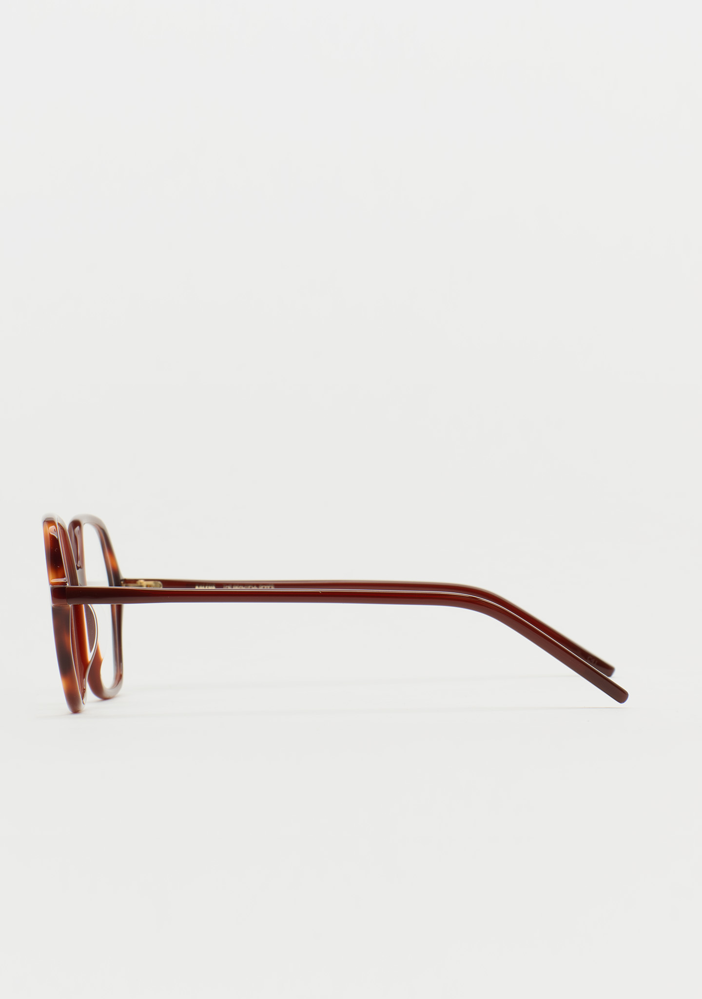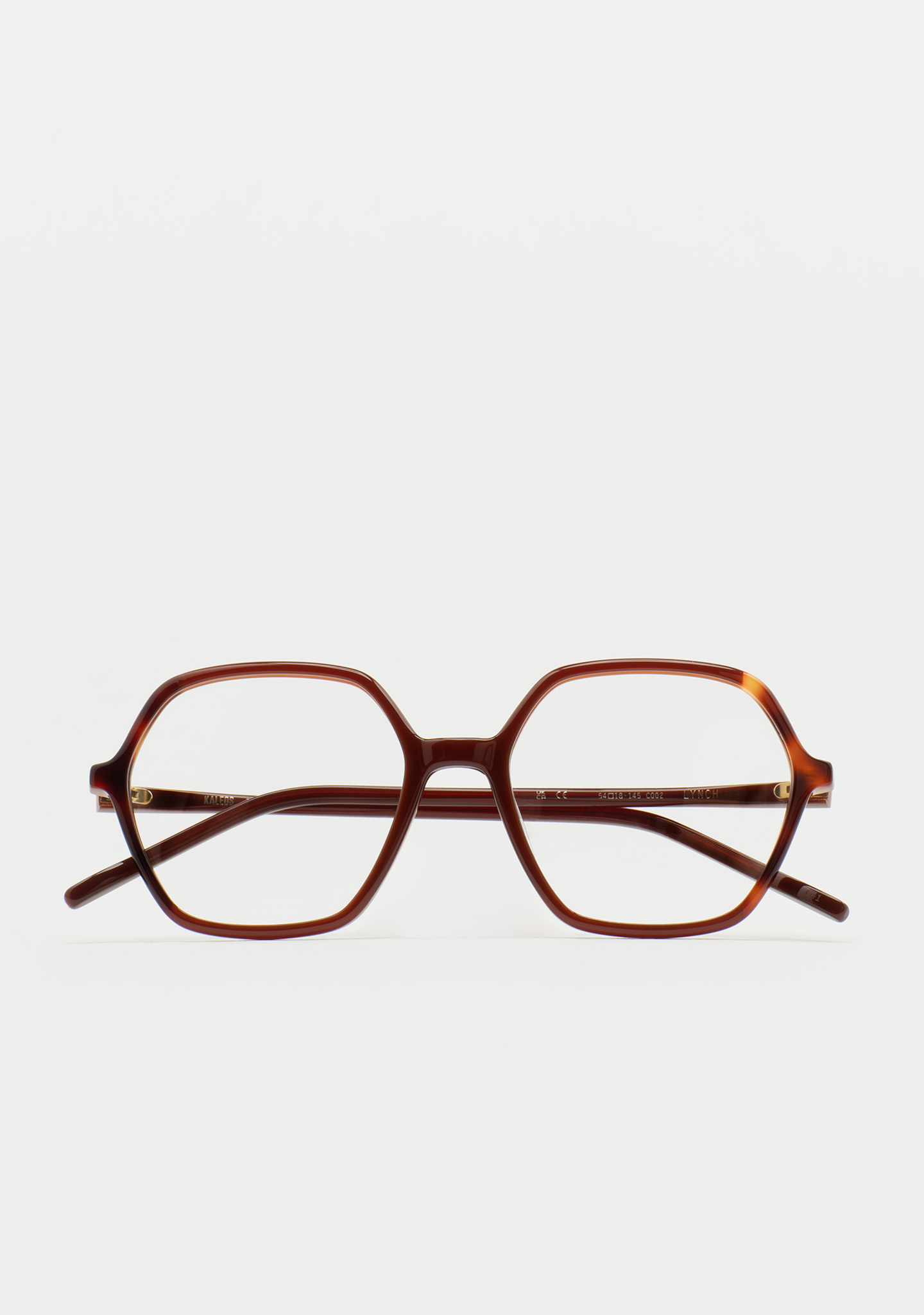 Lunettes de vue hexagonales. Un design qui allie forme et fonction. Face avant en acétate haute densité marron translucide avec laminage havane marron. Branches en acétate haute densité marron translucide. Plaquettes de nez en acétate intégrées. Fabriquées à la main.