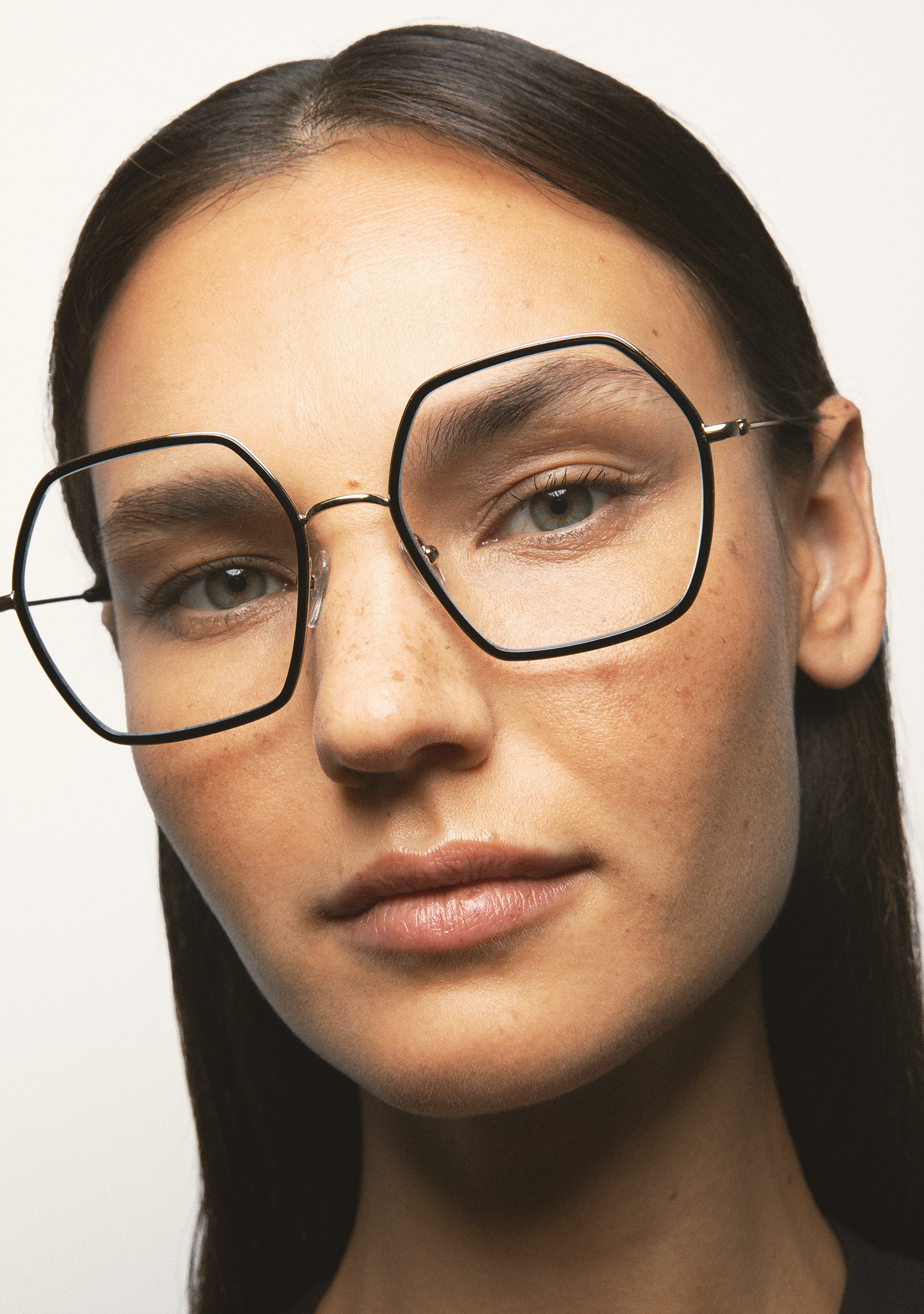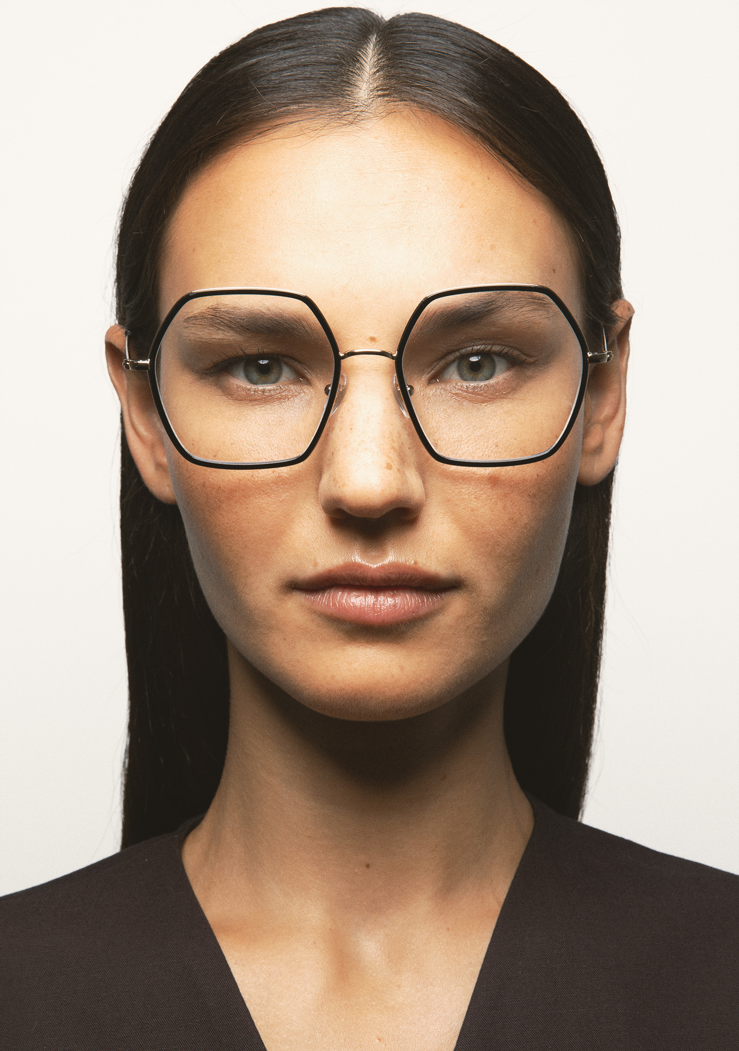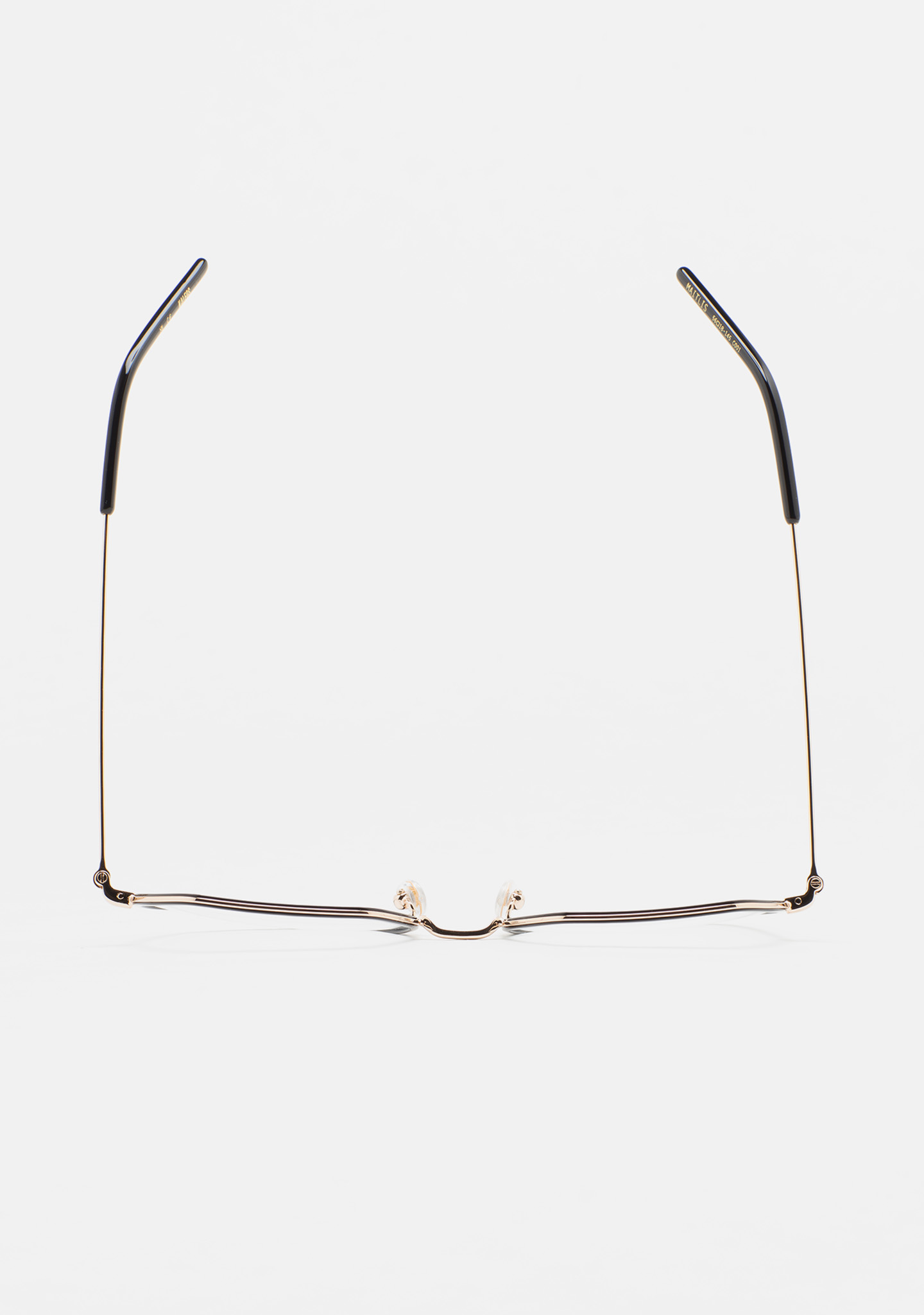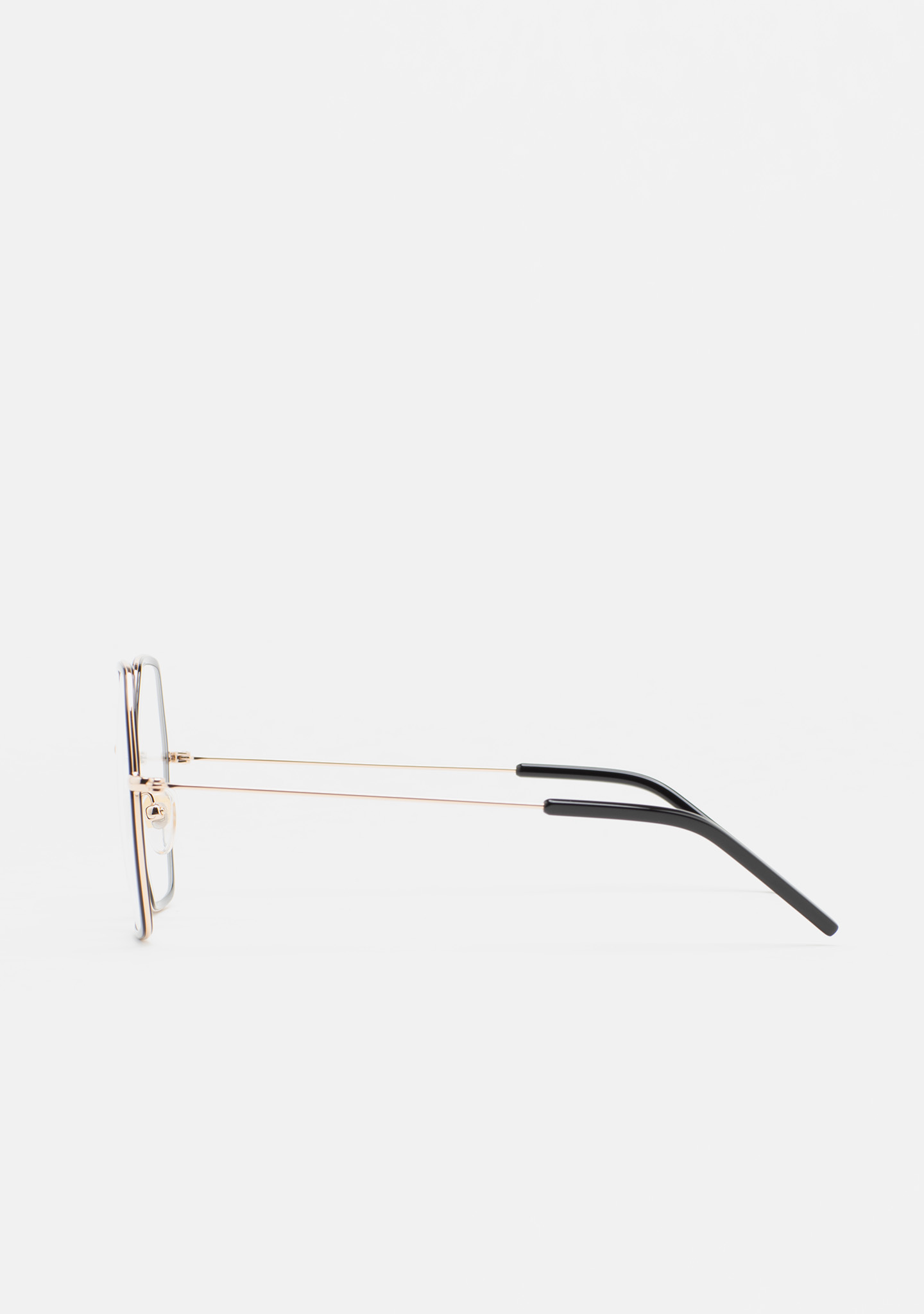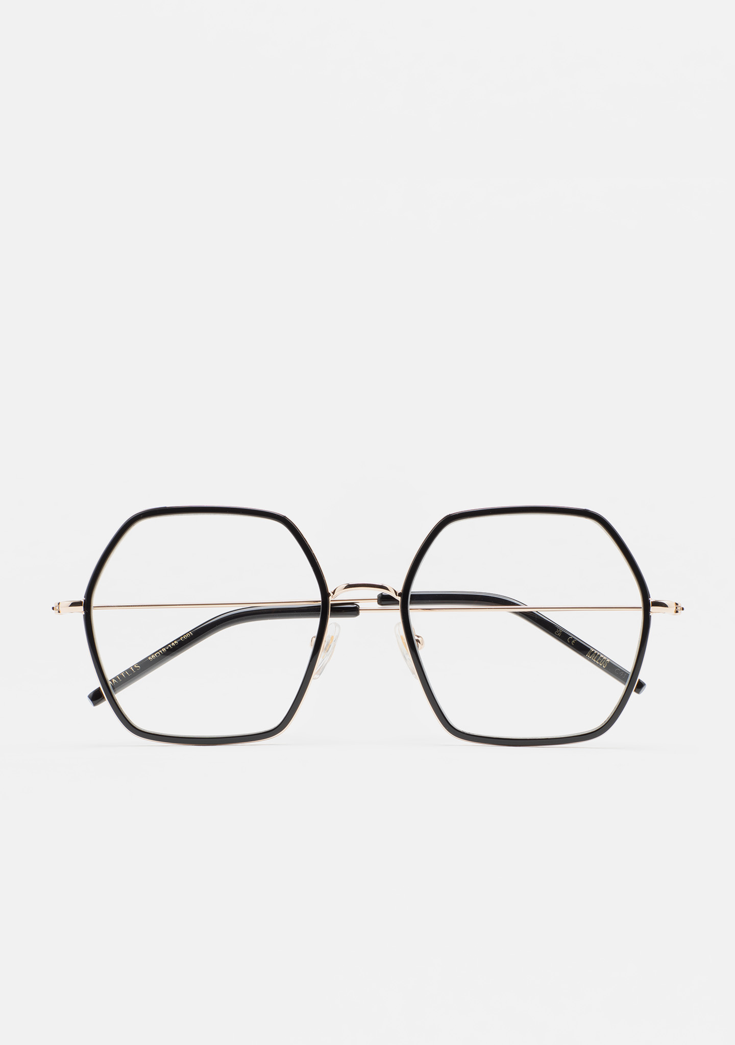 Lunettes de vue de forme hexagonale. Monture en acier inoxydable doré avec cerclage intérieur en acétate haute densité noir. Pont et branches en acier inoxydable doré. Branches avec embouts en acétate noir. Plaquettes en acétate intégrées. Fait main.