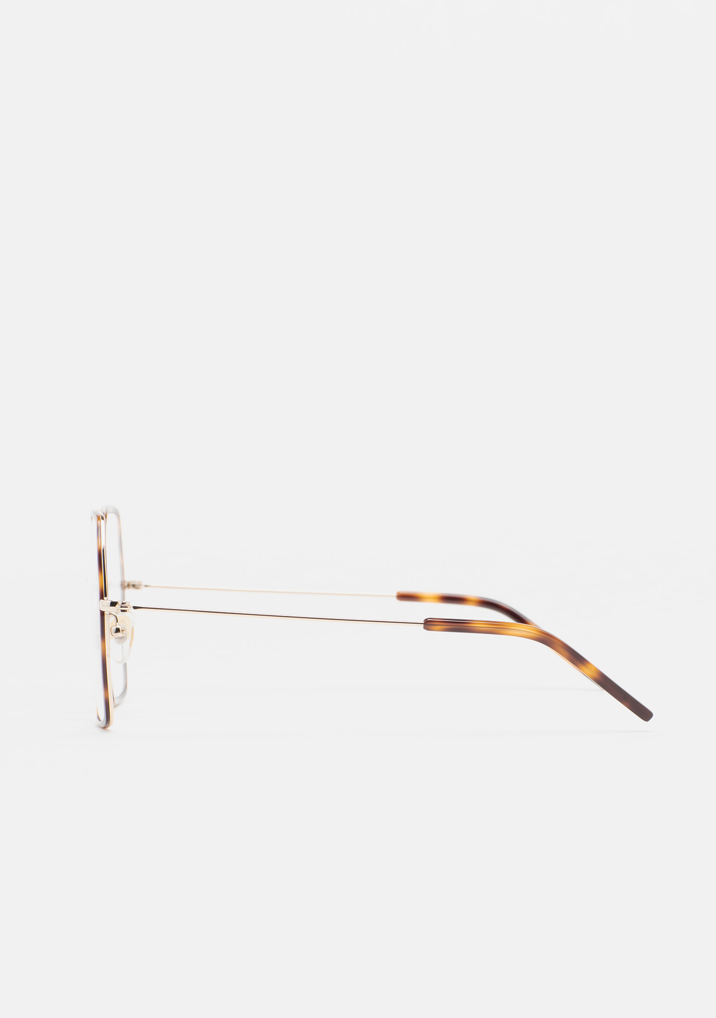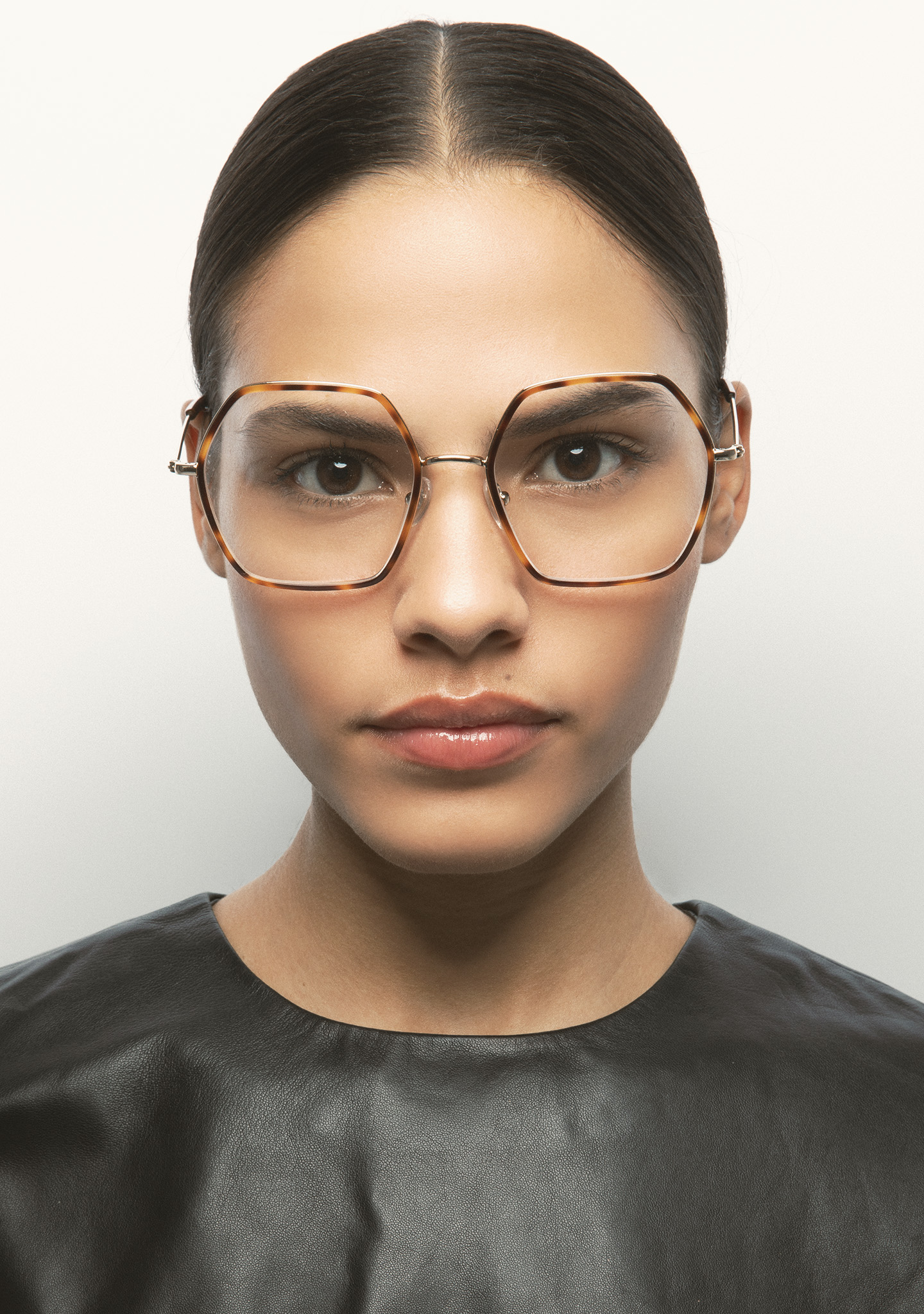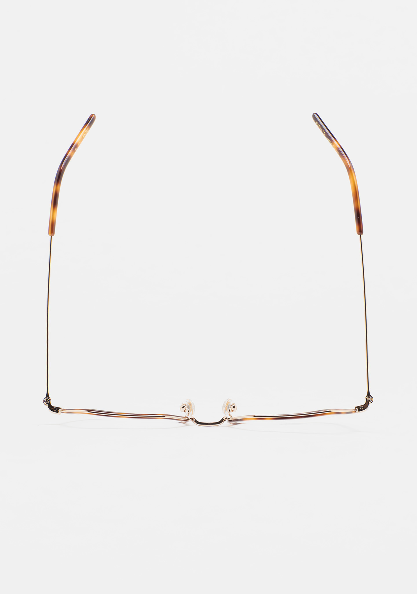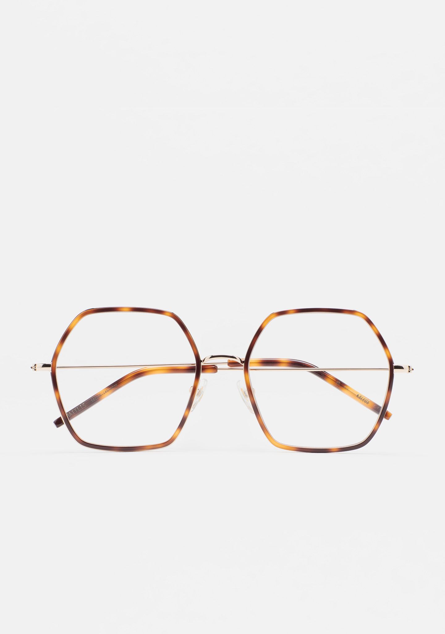 Lunettes de vue de forme hexagonale. Monture en acier inoxydable doré avec cerclage intérieur en acétate haute densité havane marron. Pont et branches en acier inoxydable doré. Branches avec embouts en acétate havane marron. Plaquettes en acétate intégrées. Fait main.