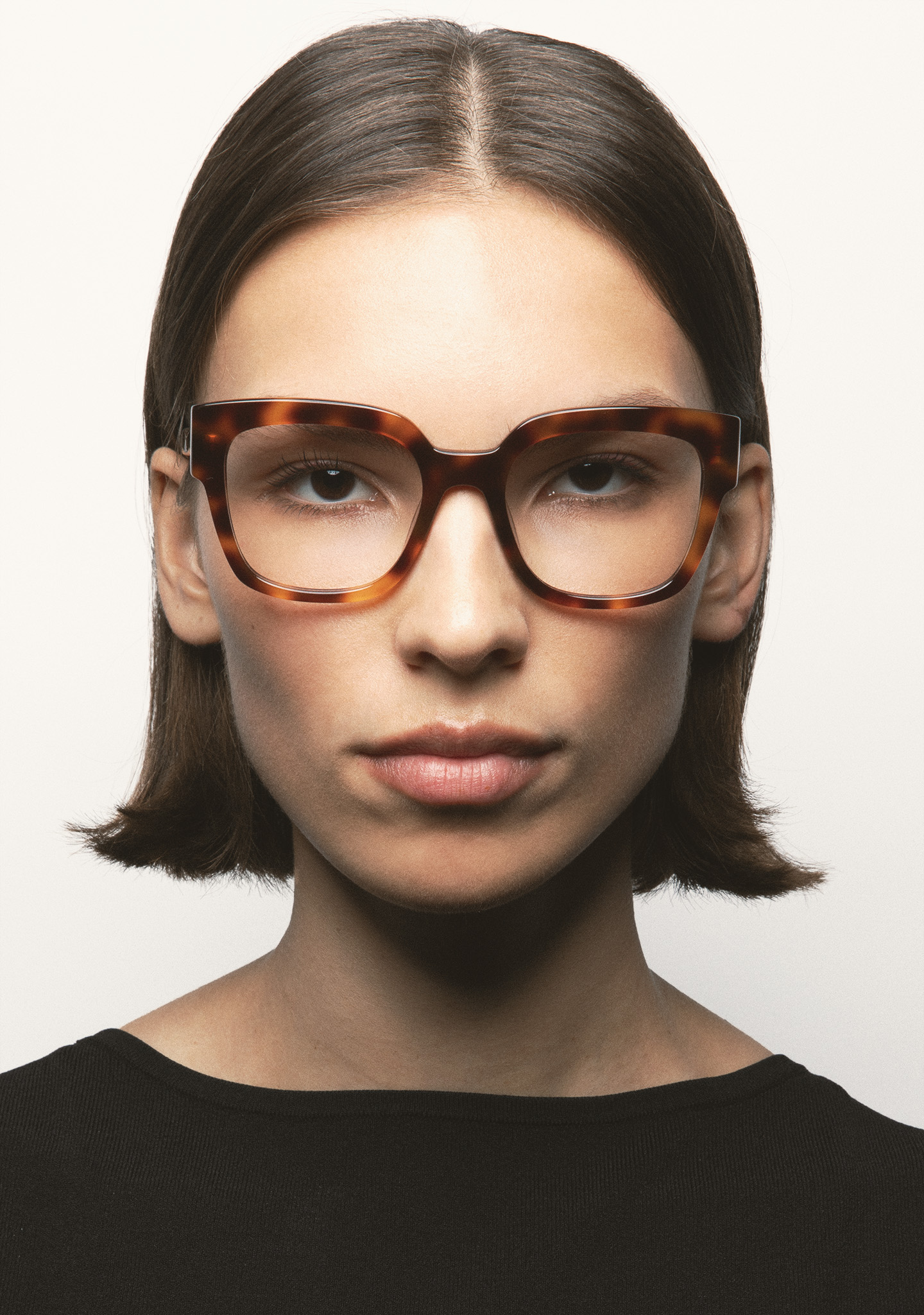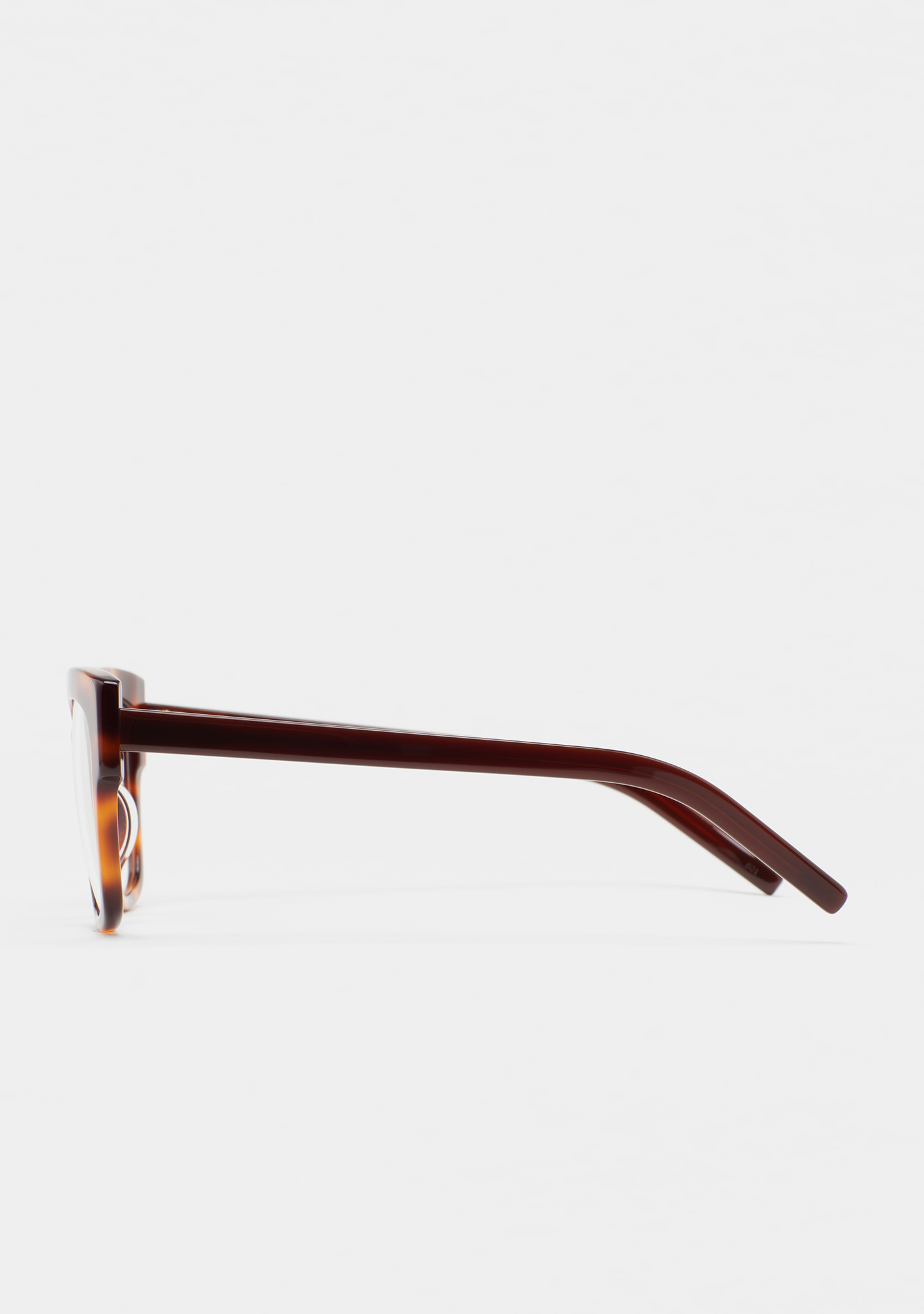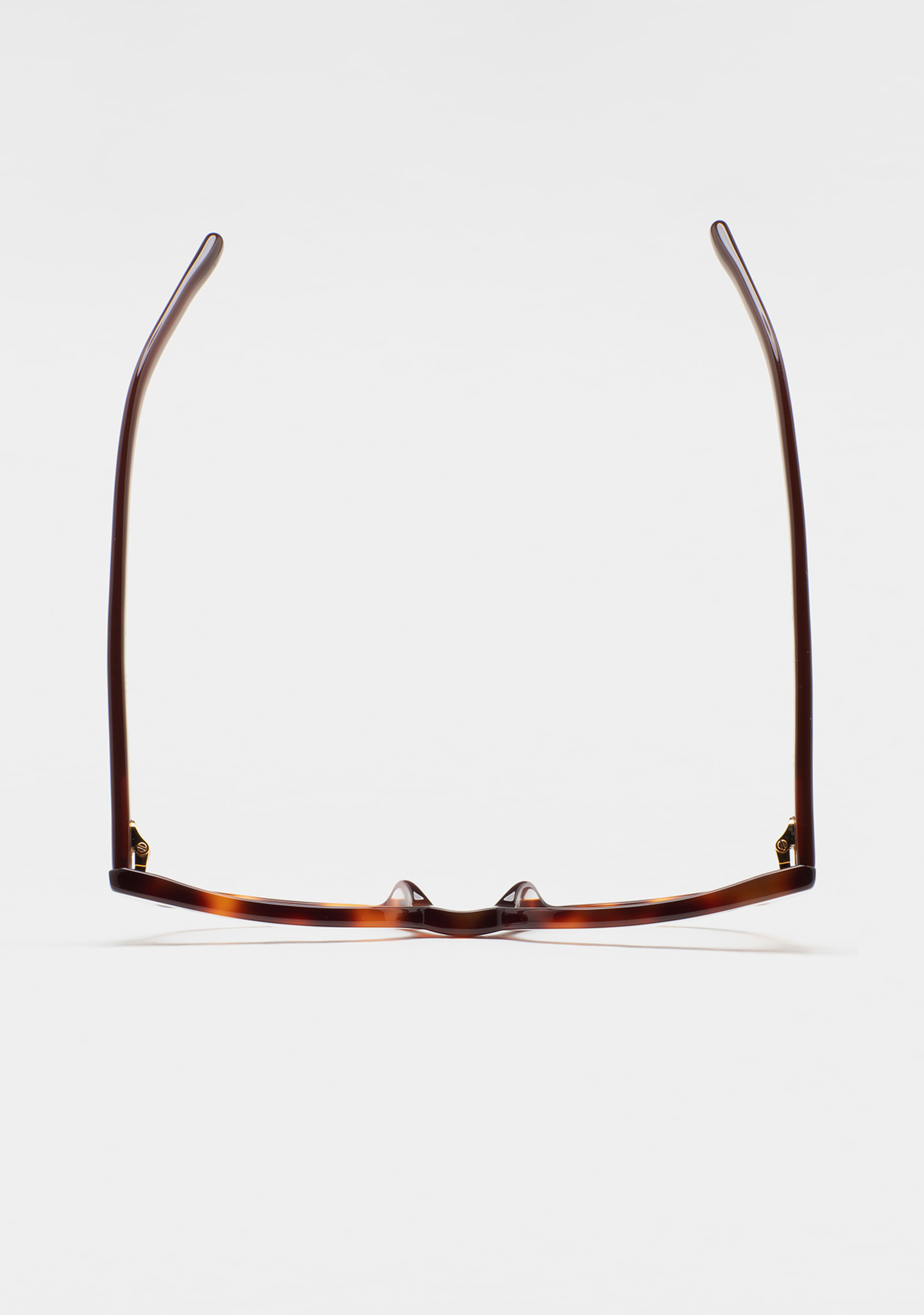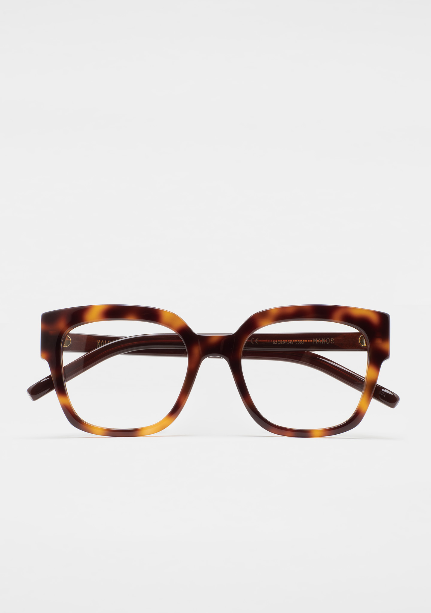 Lunettes de vue de forme carrée. Monture en acétate havane marron foncé. Branches en acétate marron translucide. Plaquettes en acétate intégrées. Fait main.