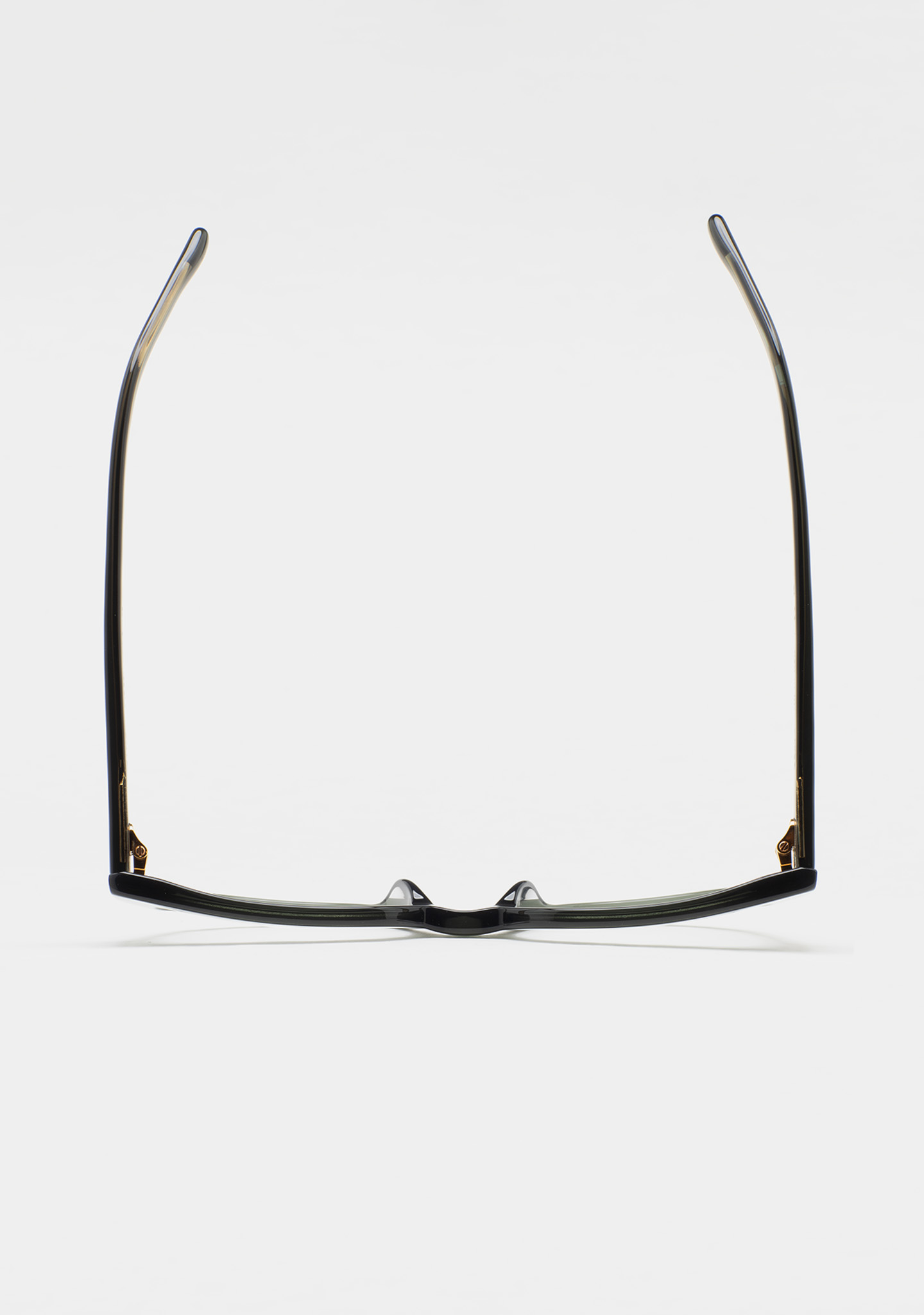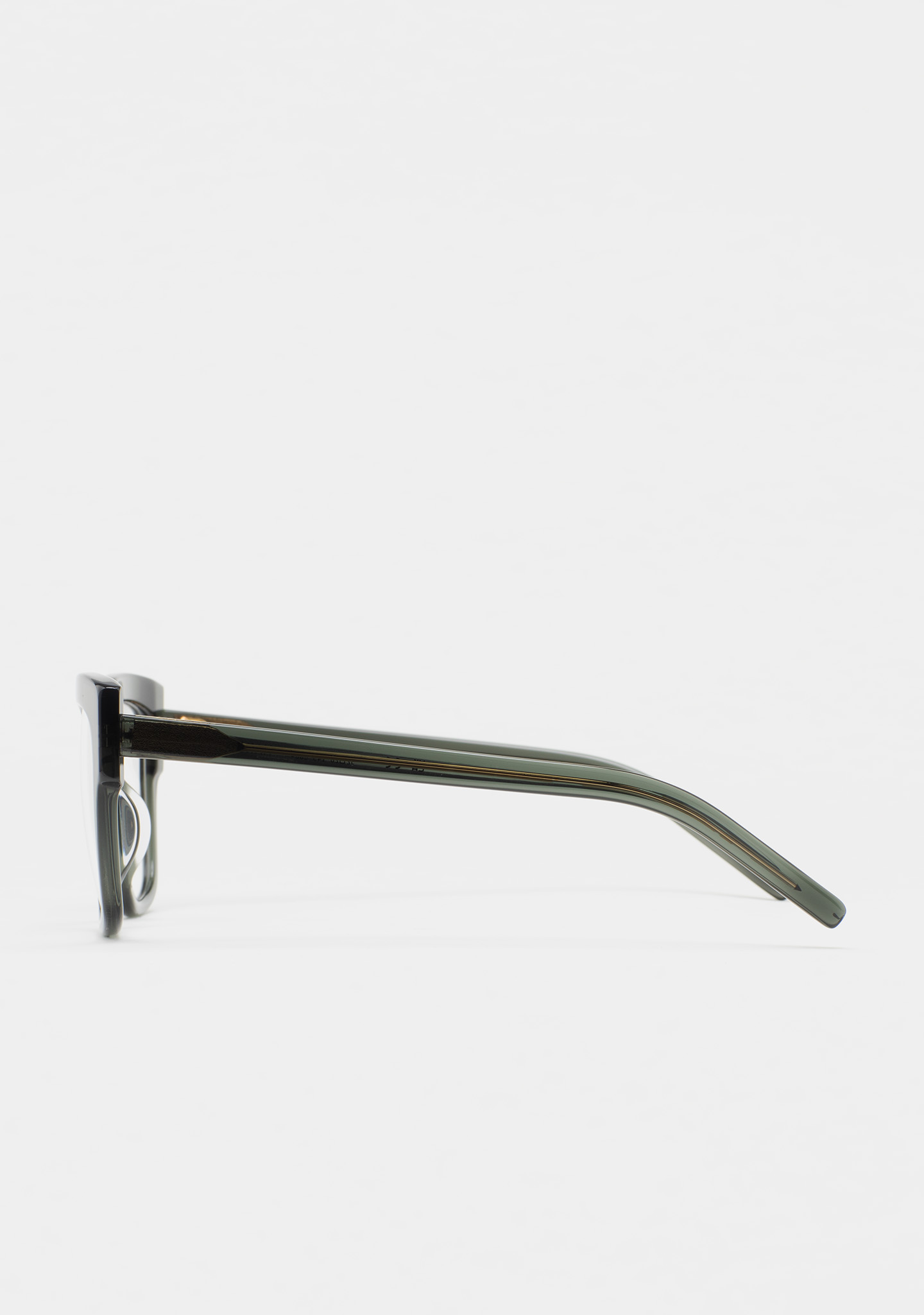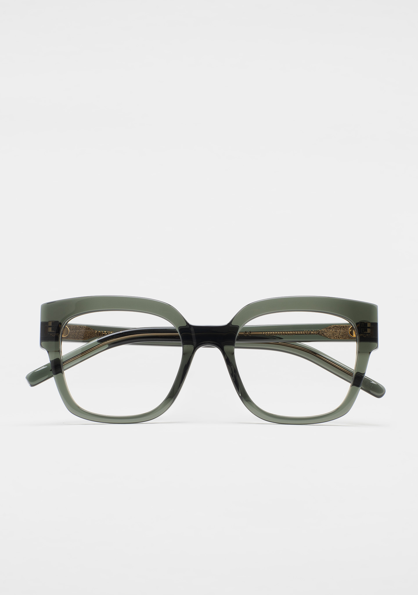 Lunettes de vue de forme carrée. Monture et branches en acétate vert translucide. Plaquettes en acétate intégrées. Fait main.