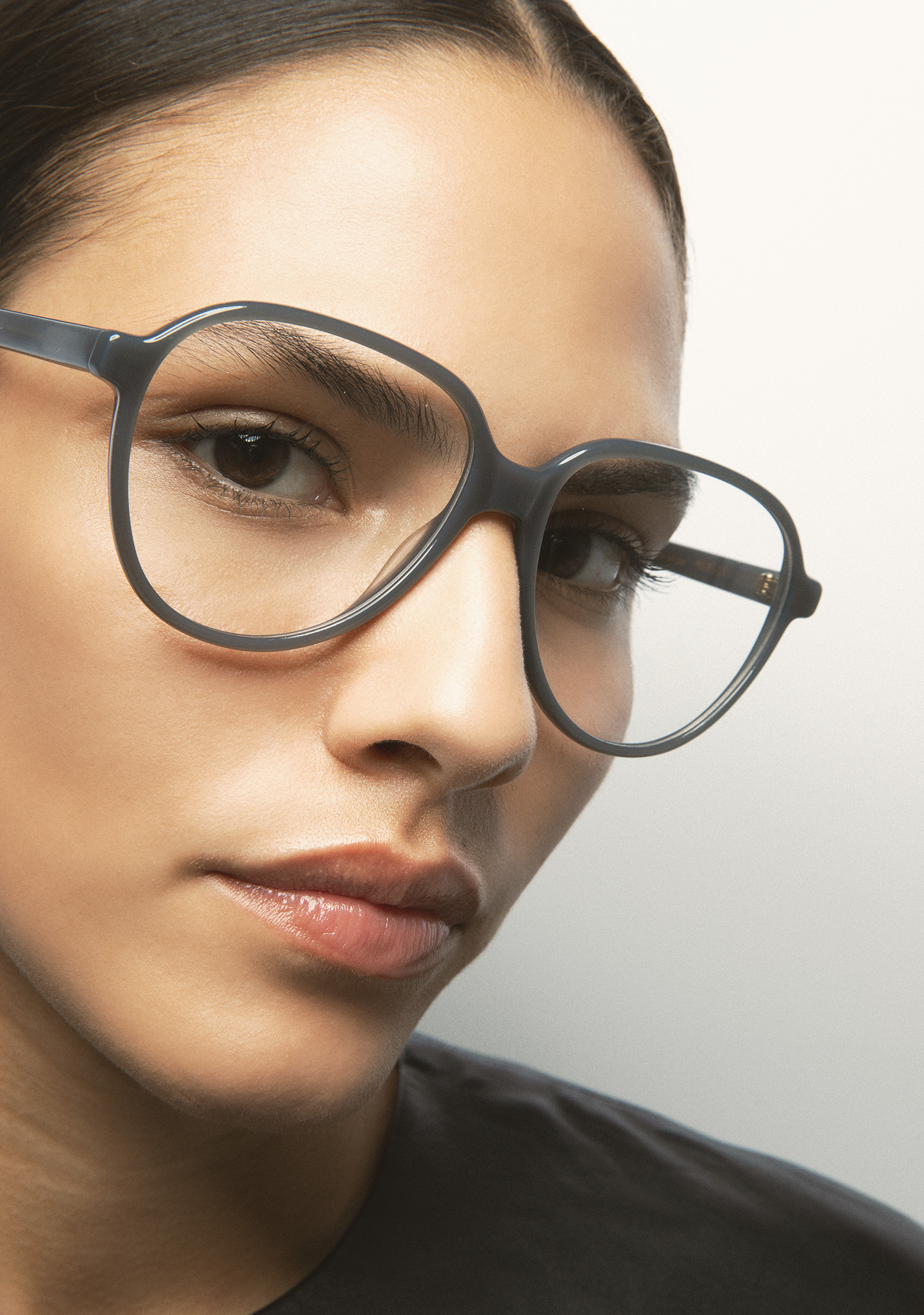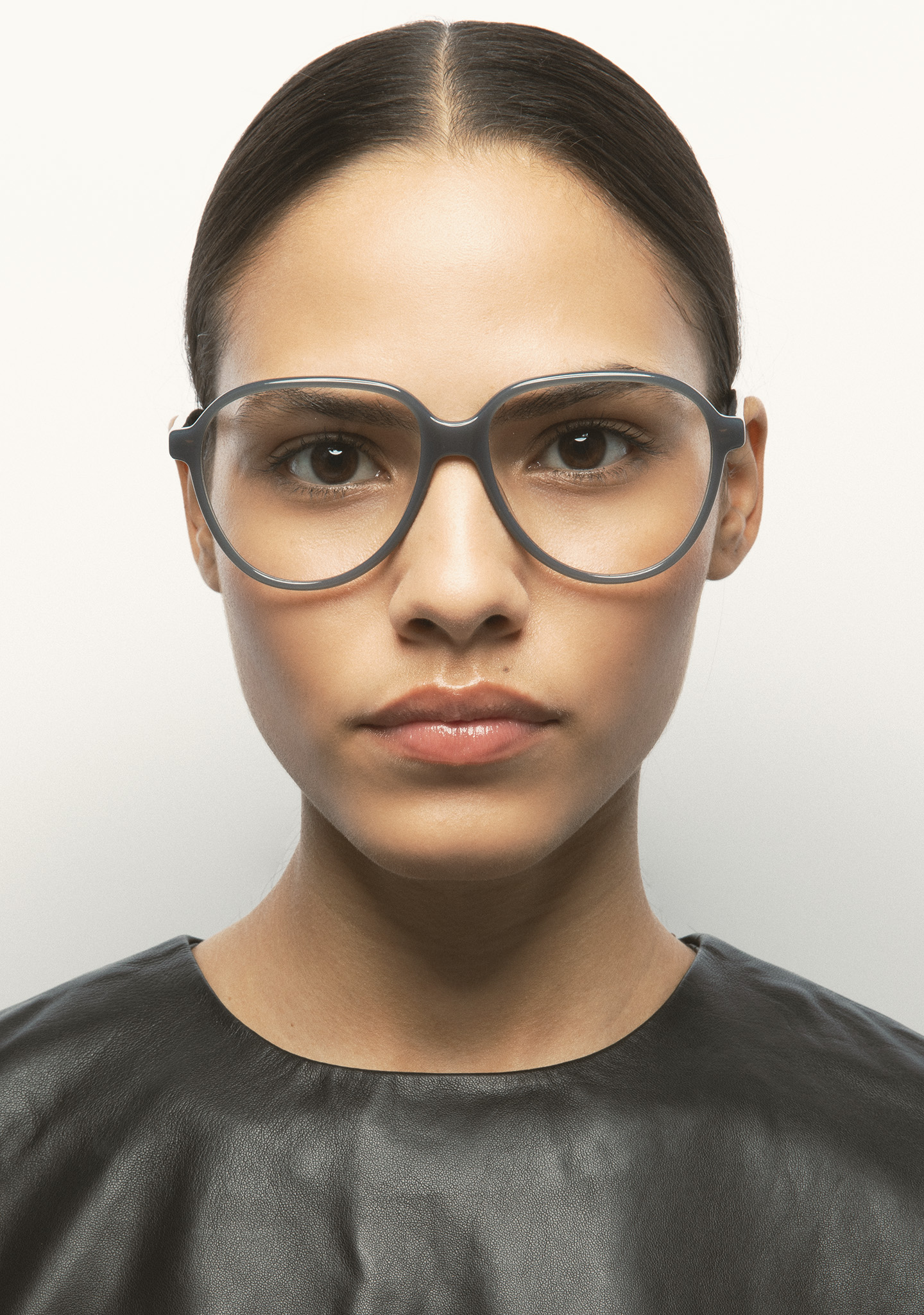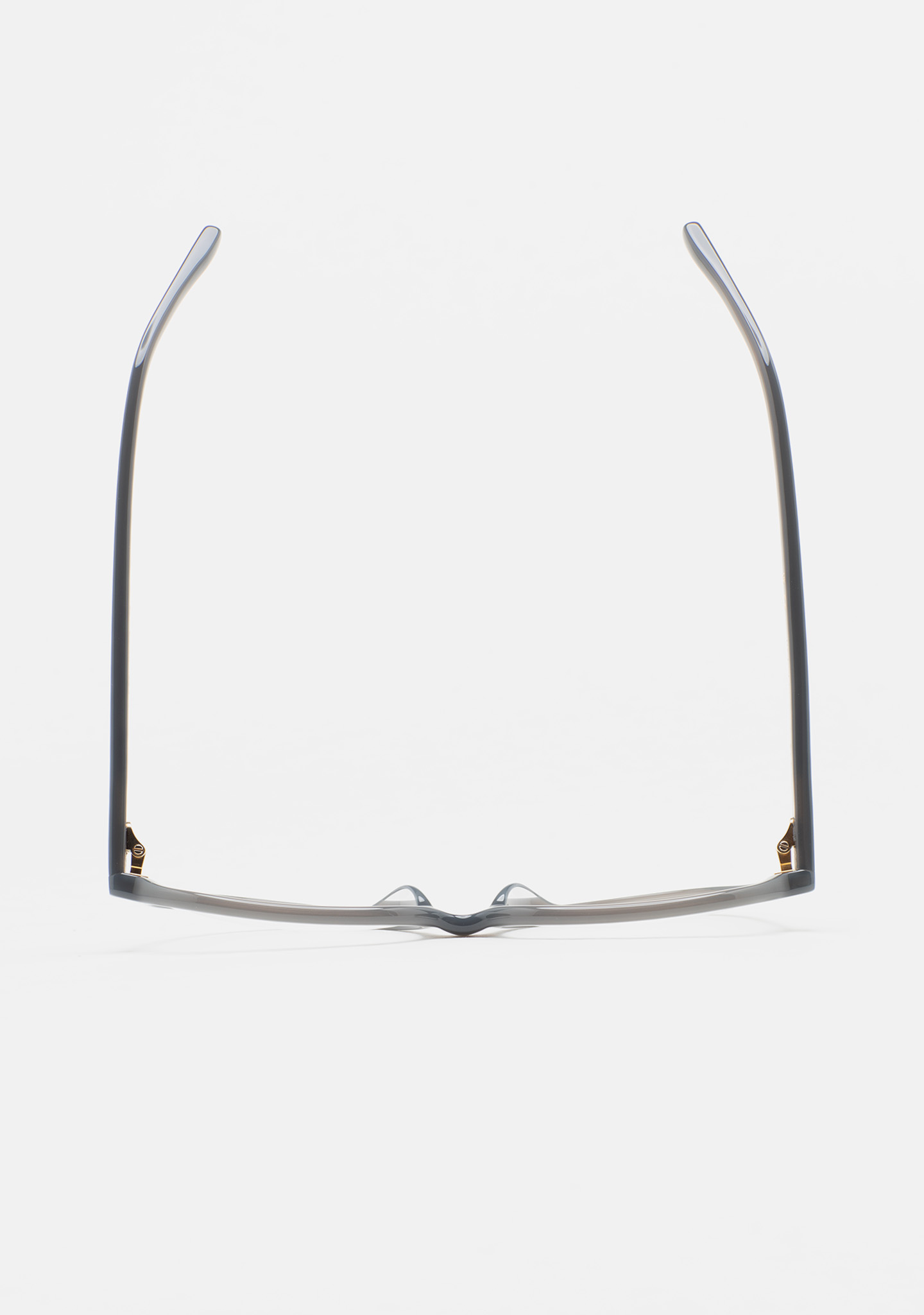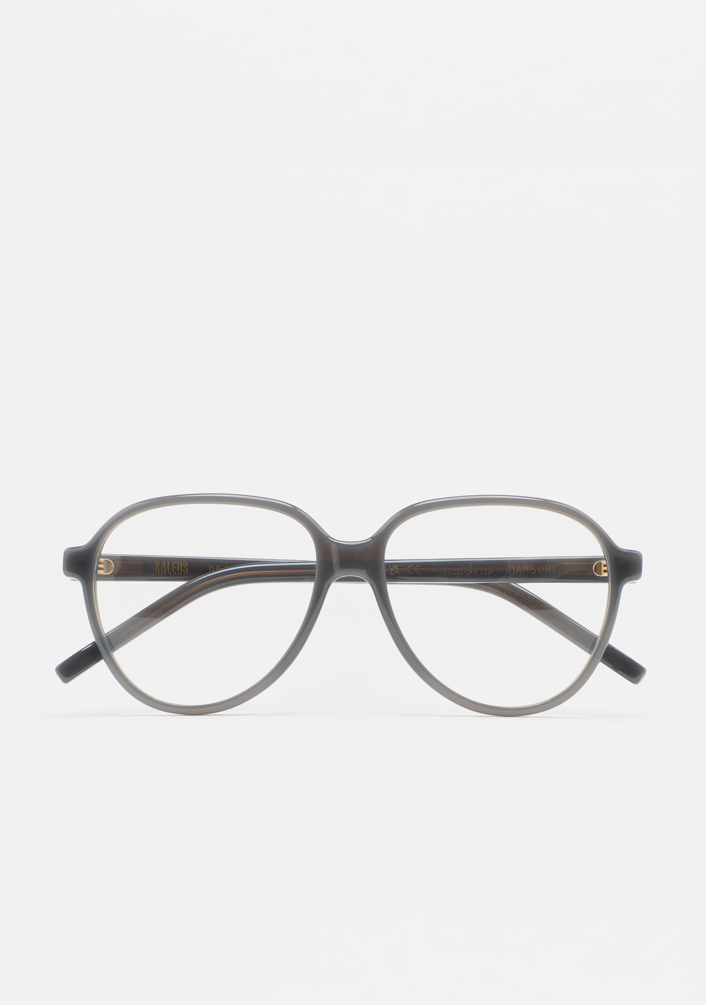 Lunettes de vue de forme aviateur. Monture et branches en acétate haute densité gris translucide. Plaquettes en acétate intégrées. Fait main.