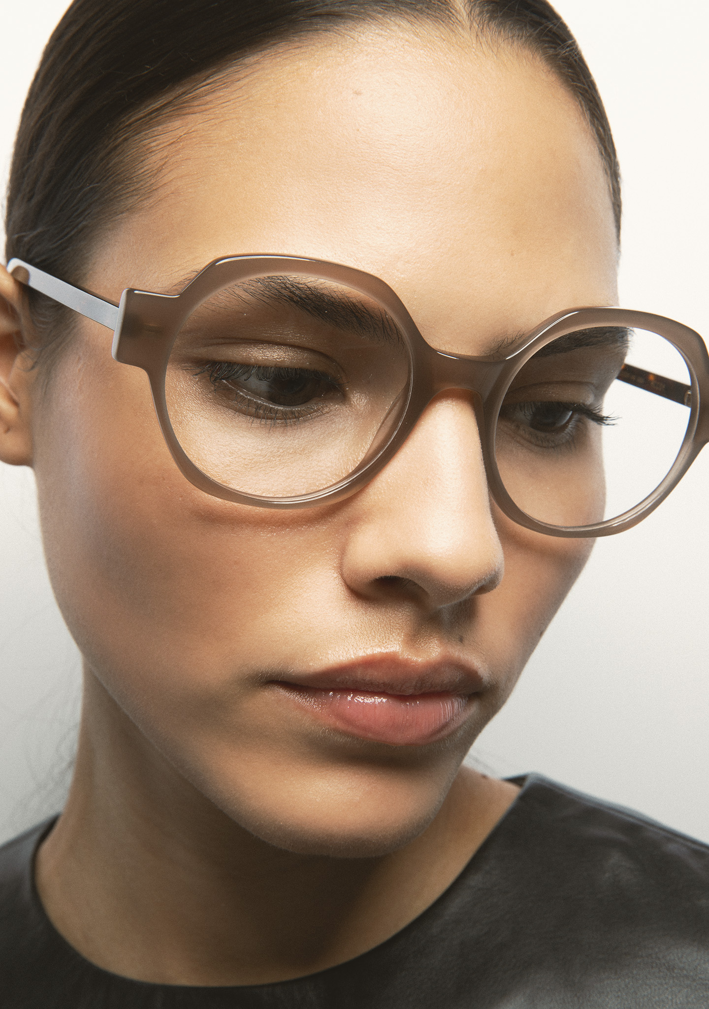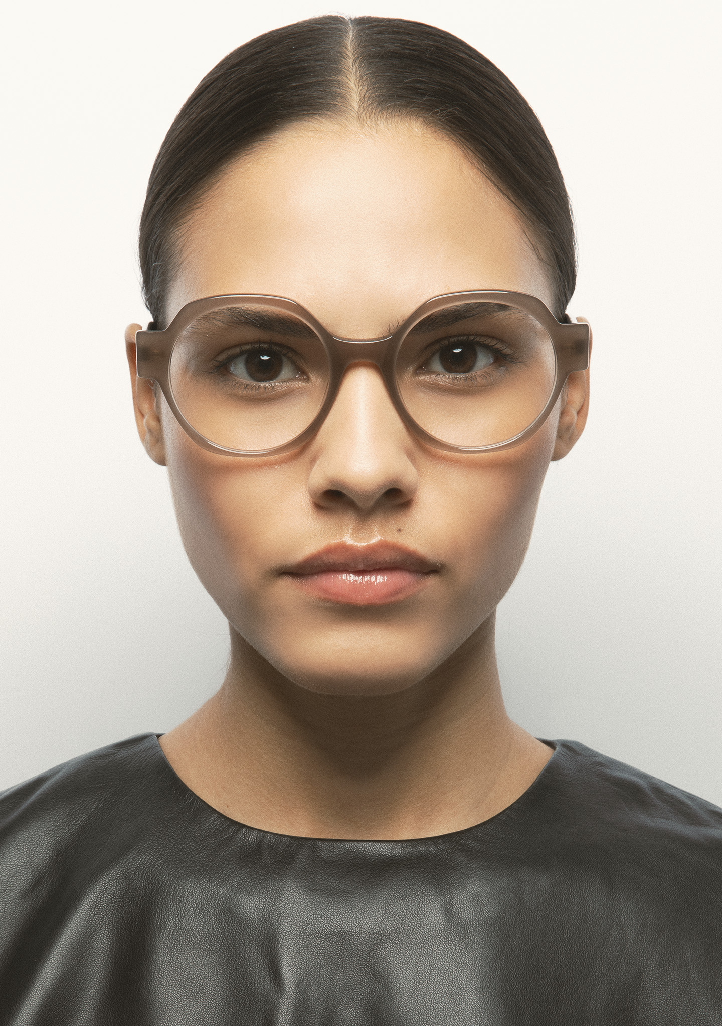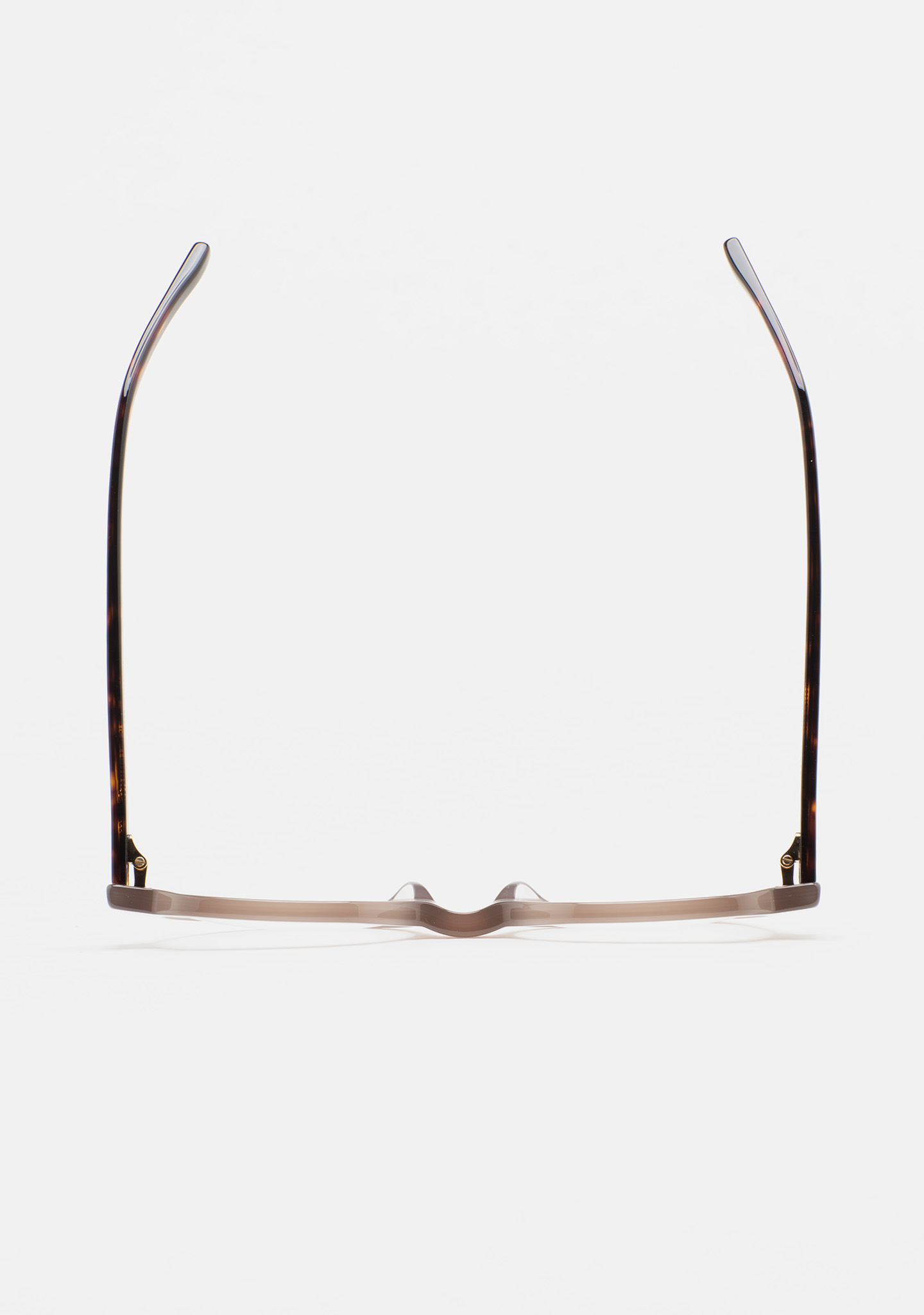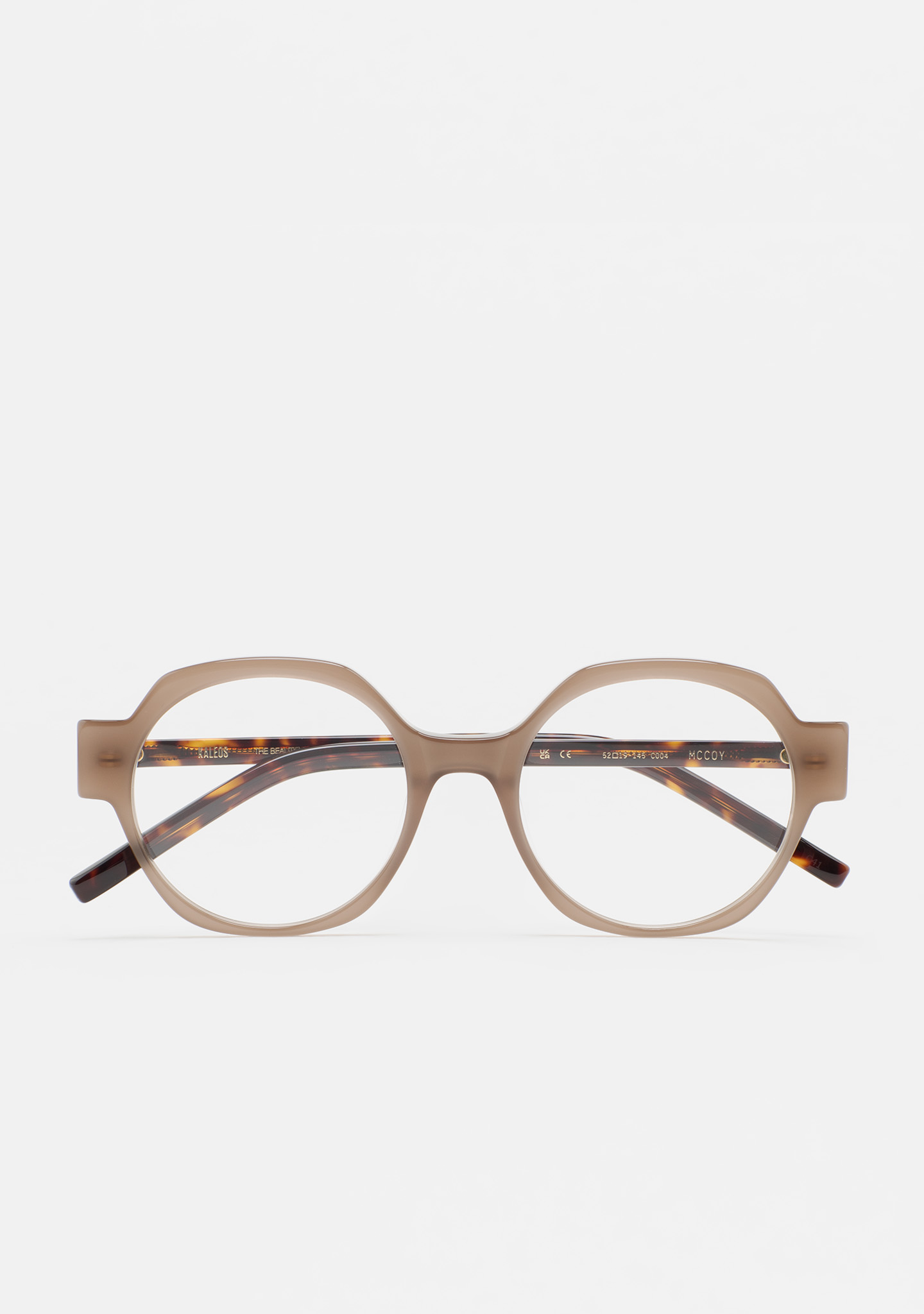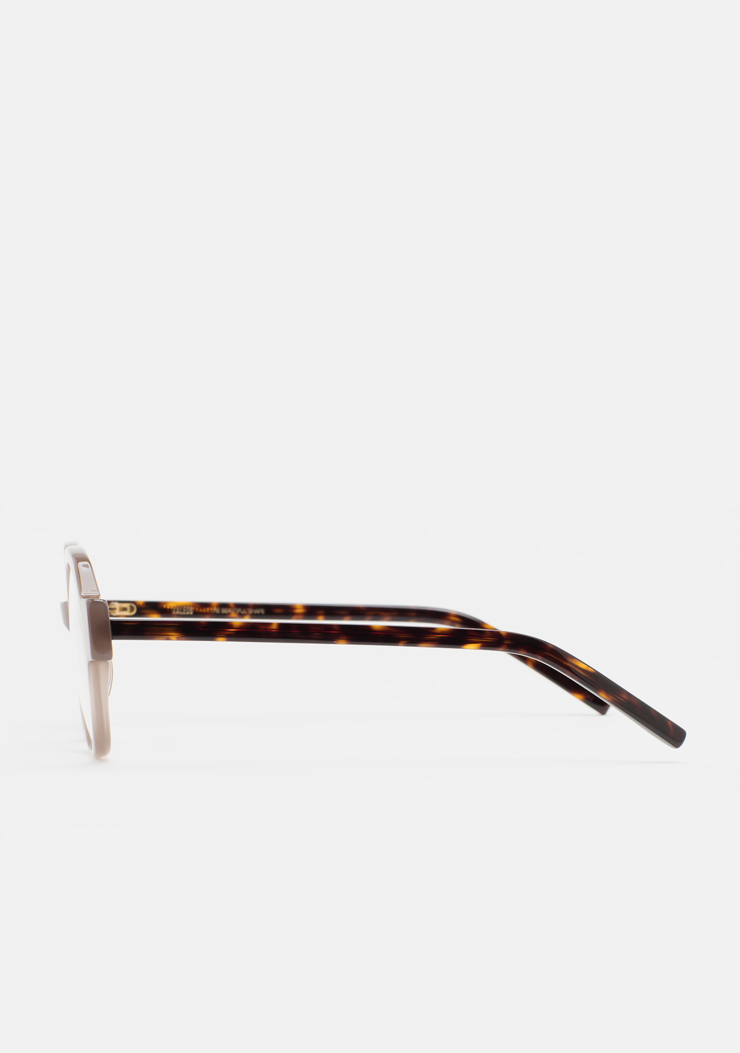 Lunettes de vue de forme arrondie. Monture en acétate beige translucide. Branches en acétate havane marron foncé. Plaquettes en acétate intégrées. Fait main.