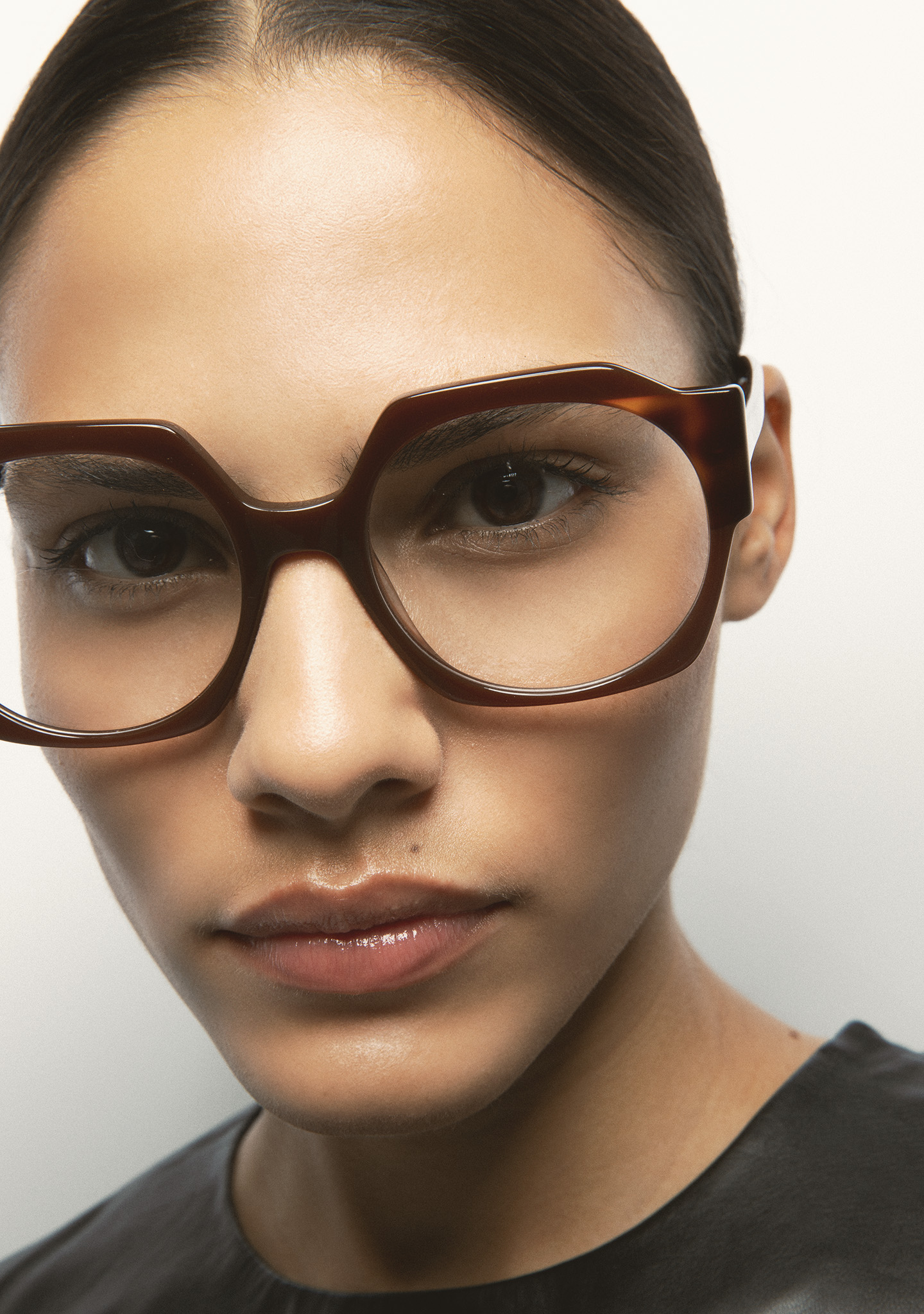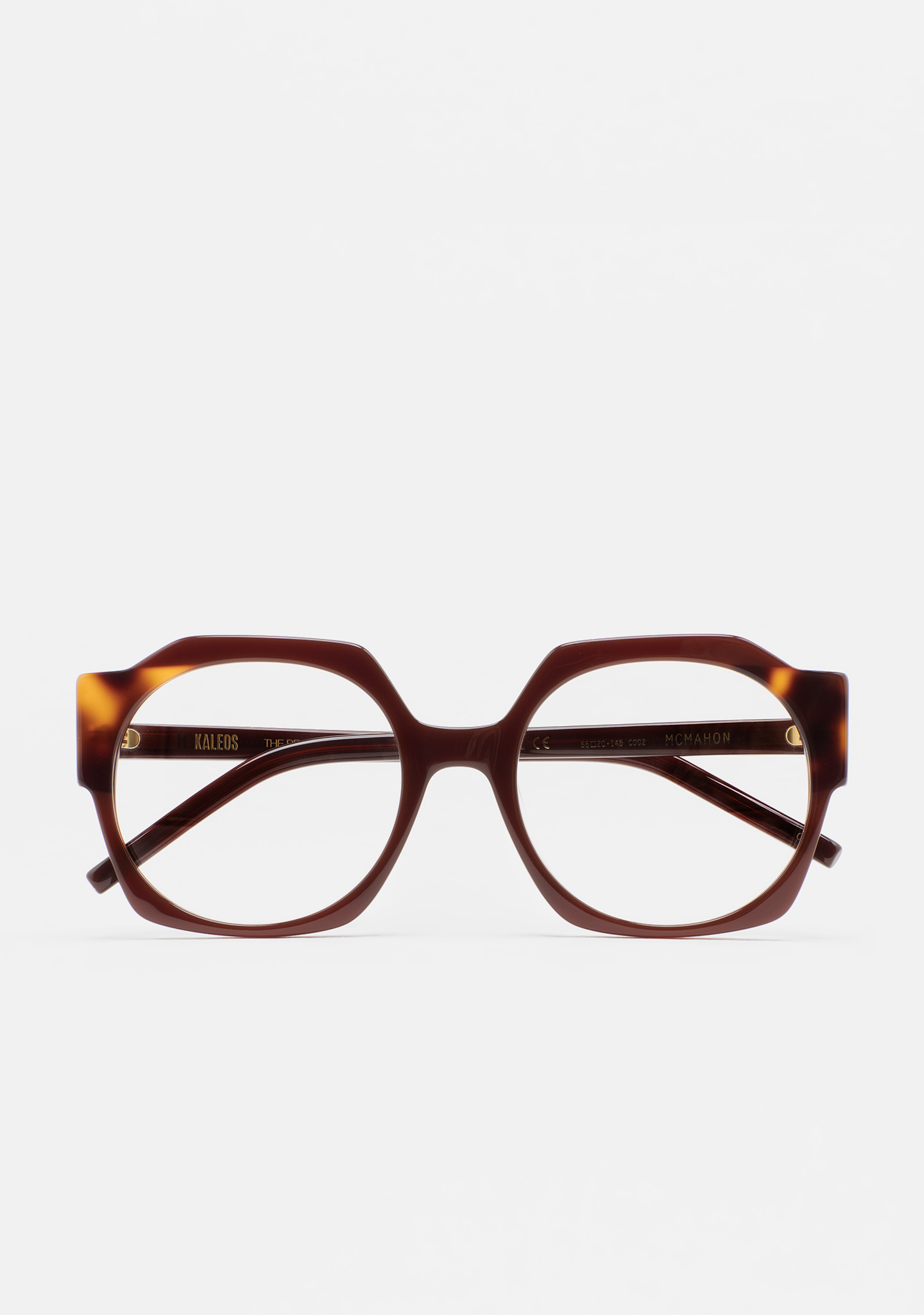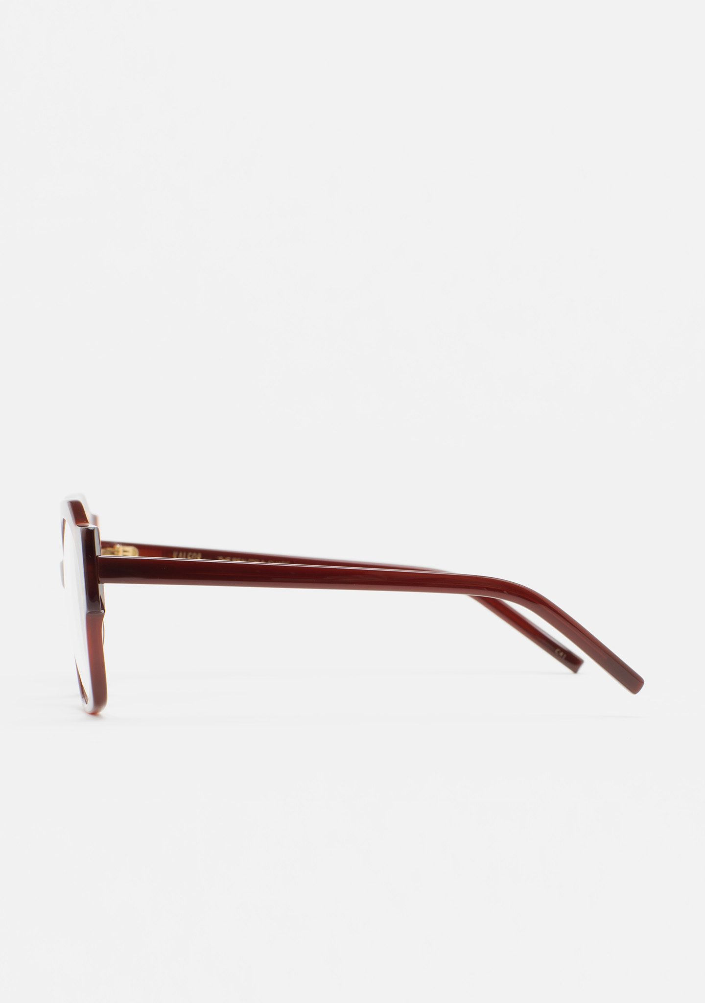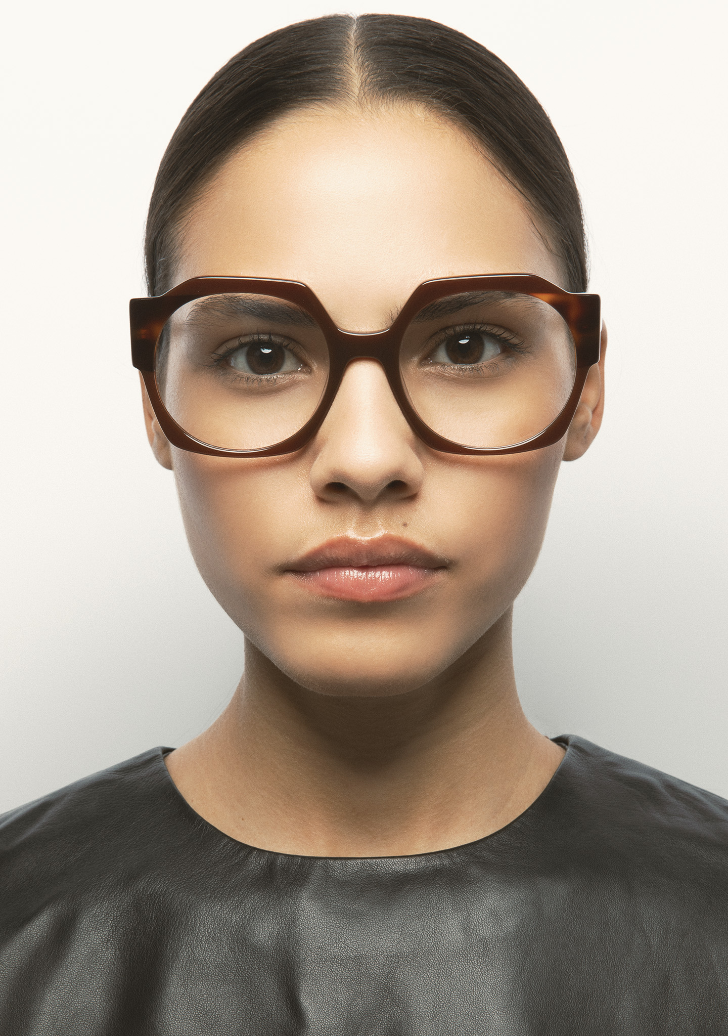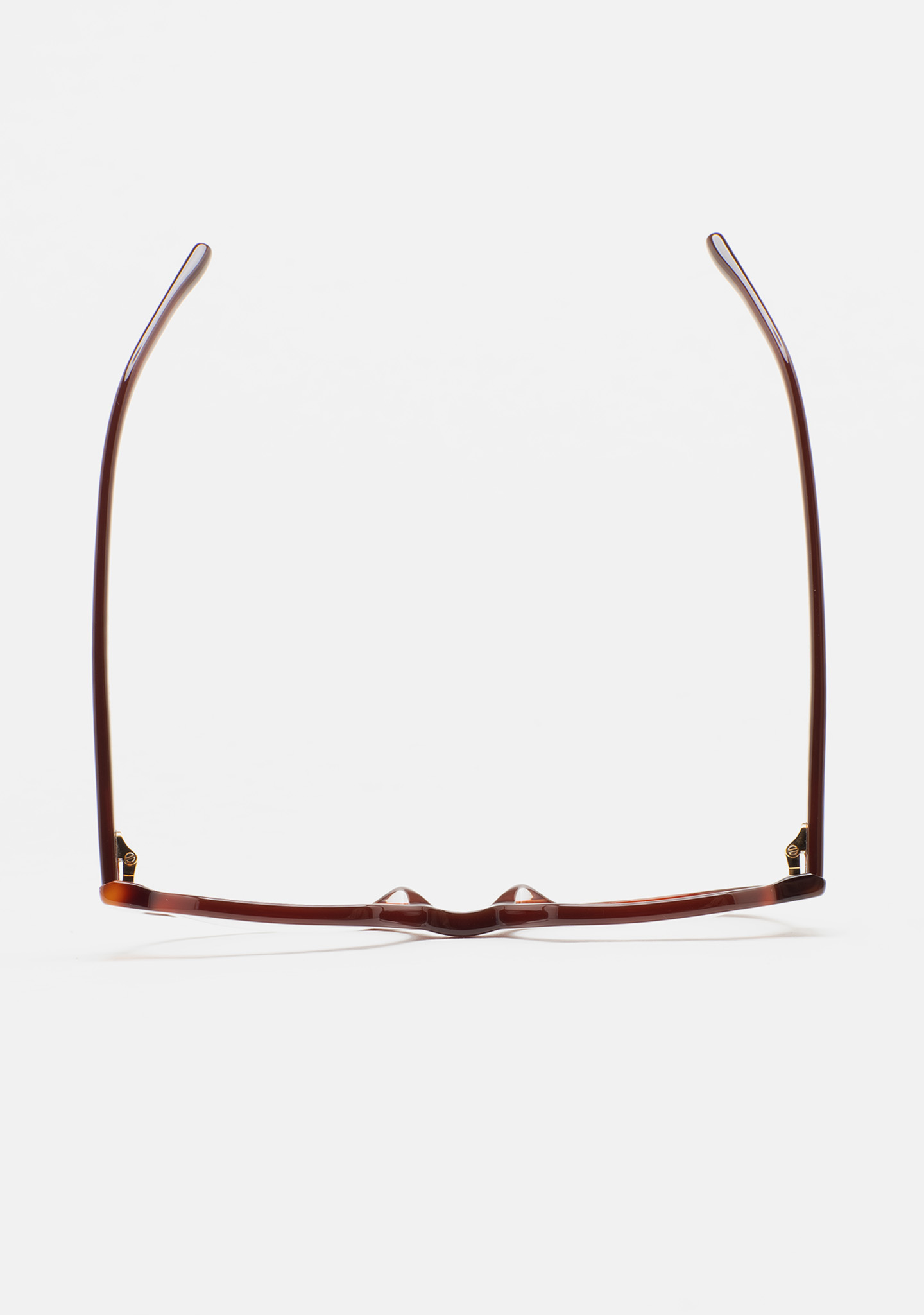 Lunettes de vue de forme hexagonale. Monture en acétate marron translucide avec laminé havane marron foncé. Branches en acétate marron translucide. Plaquettes en acétate intégrées. Fait main.