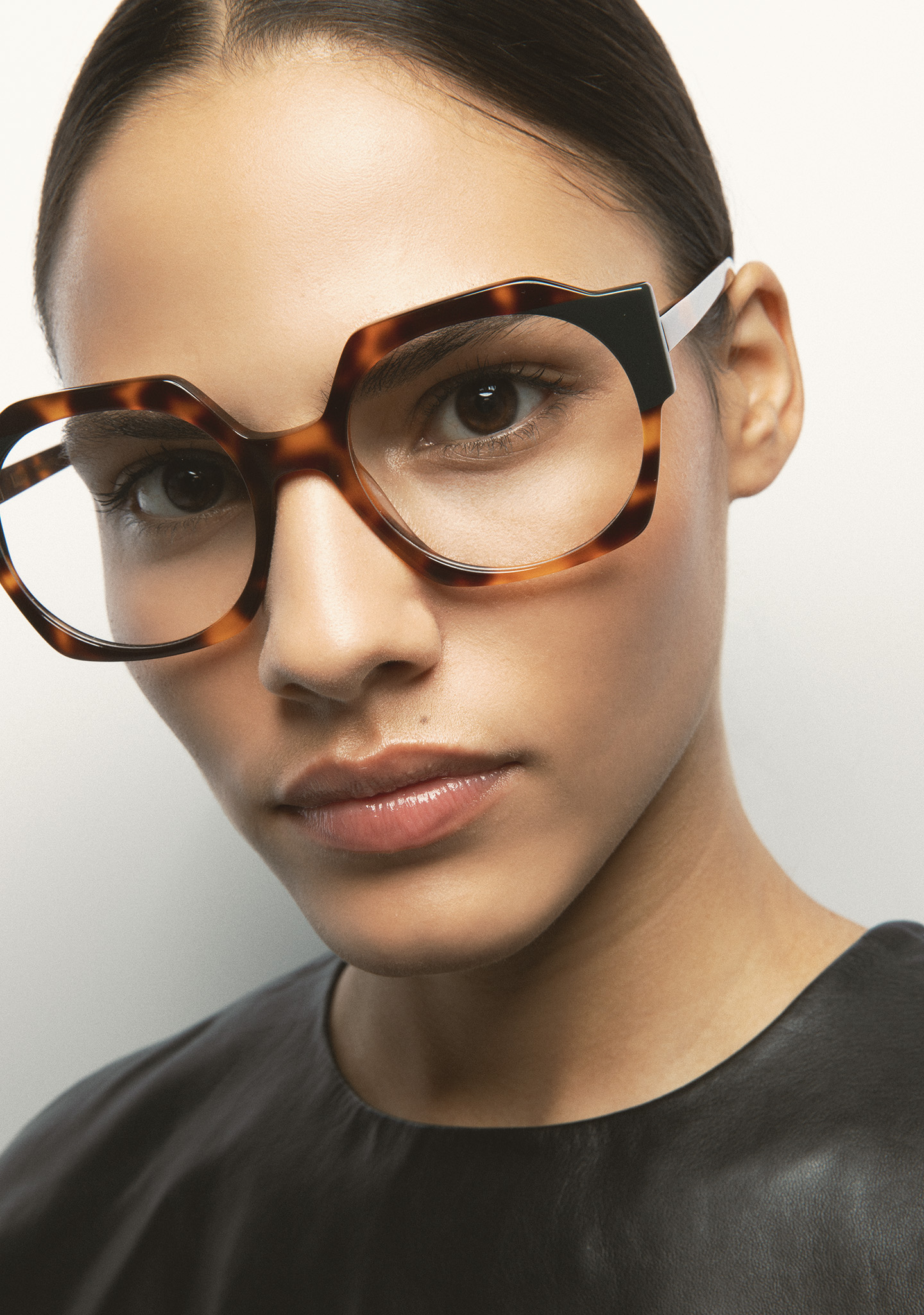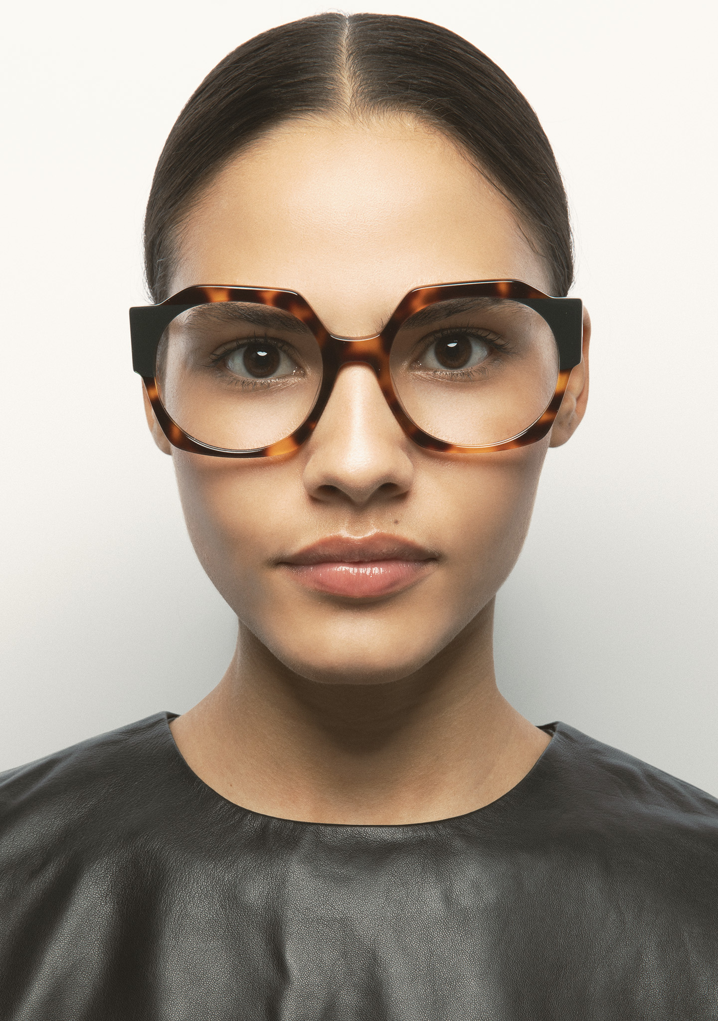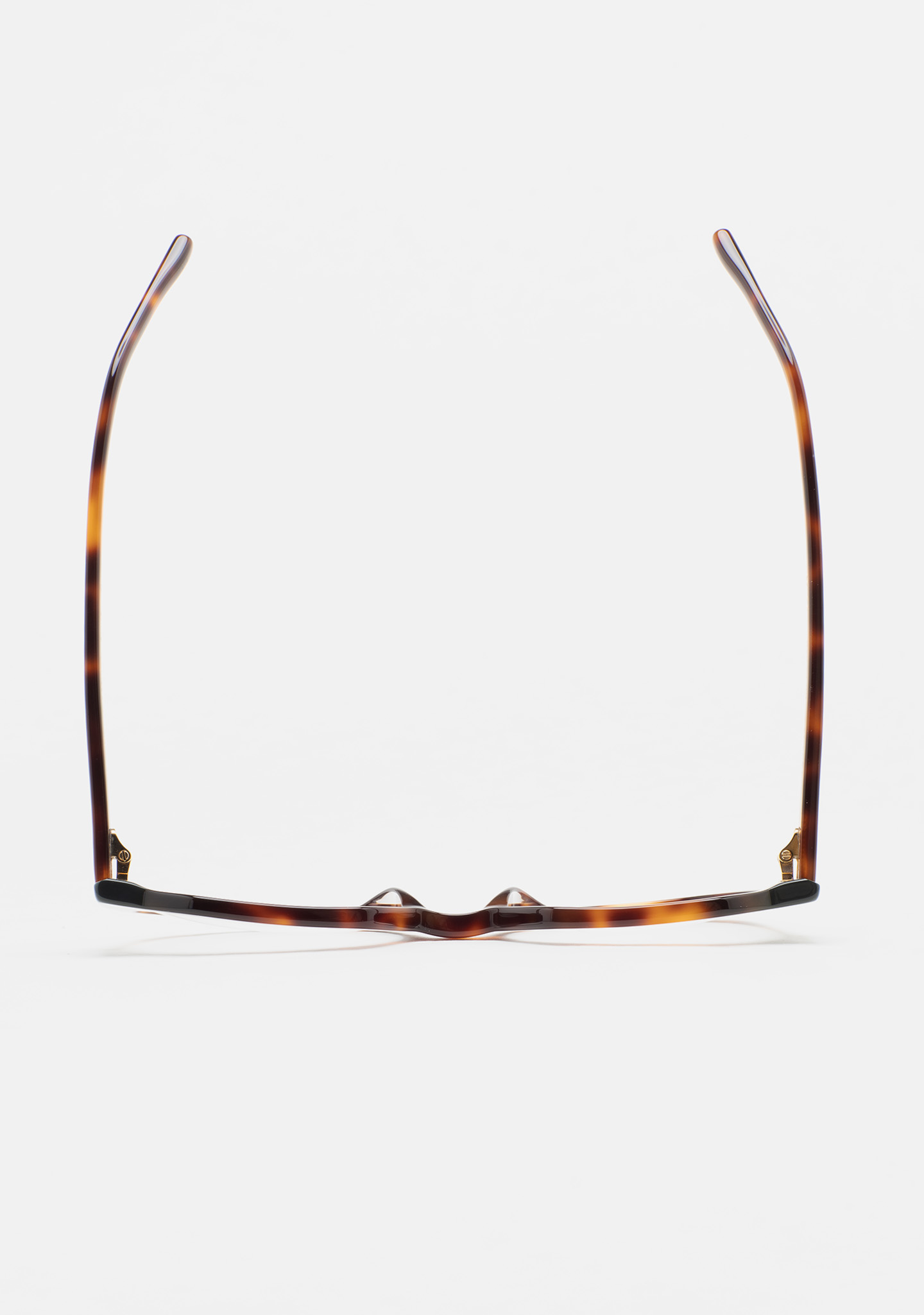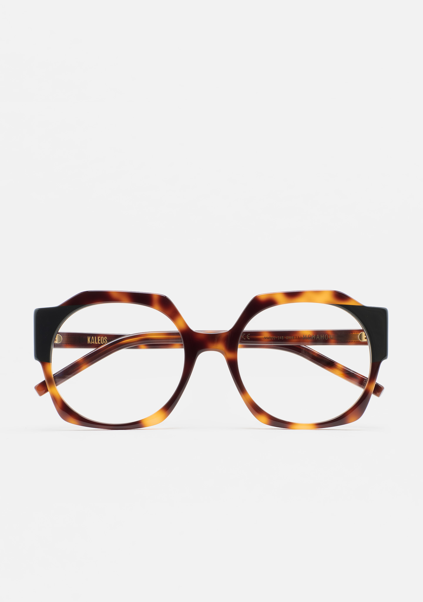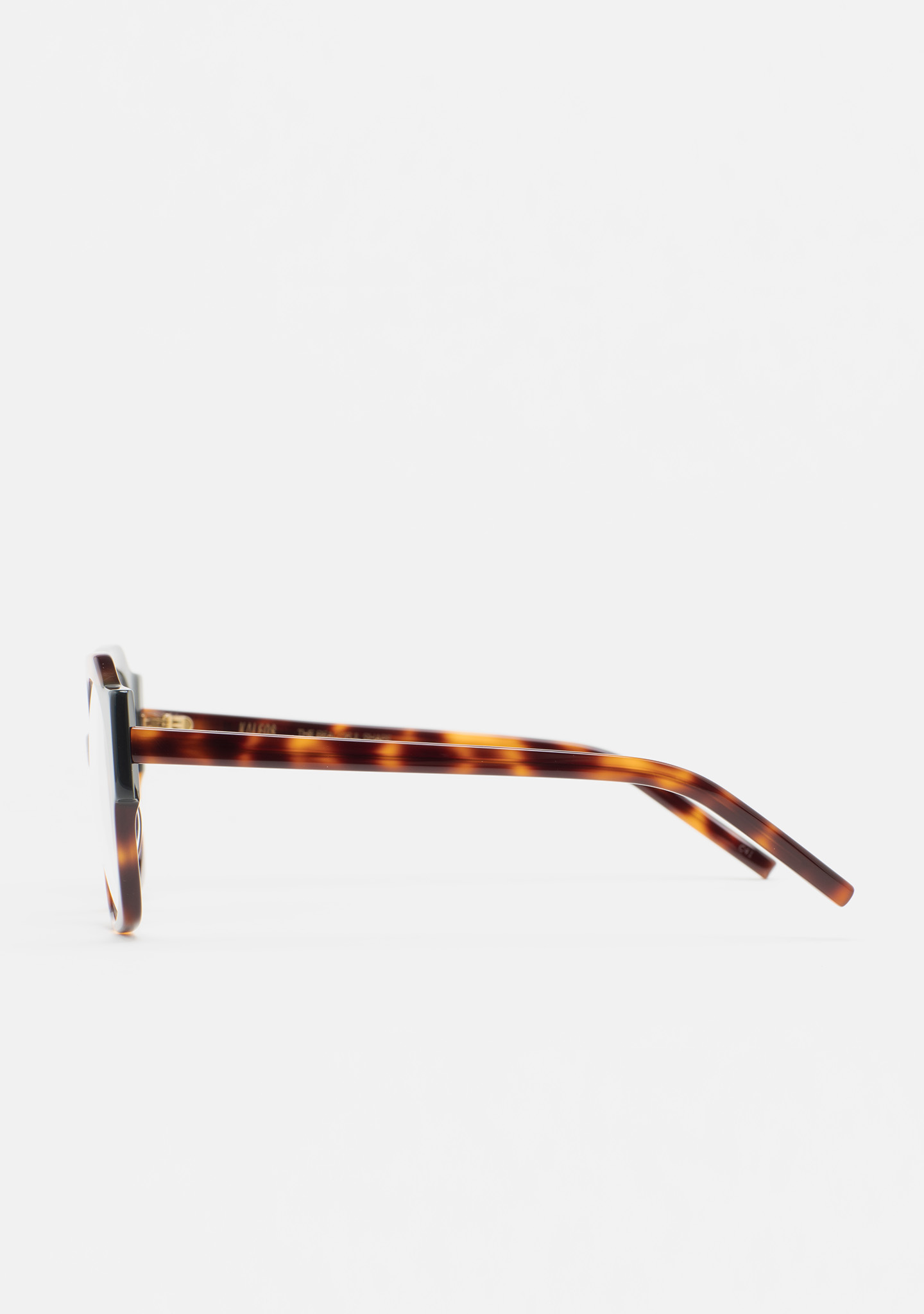 Lunettes de vue de forme hexagonale. Monture en acétate havane marron avec laminé vert foncé. Branches en acétate havane marron. Plaquettes en acétate intégrées. Fait main.
