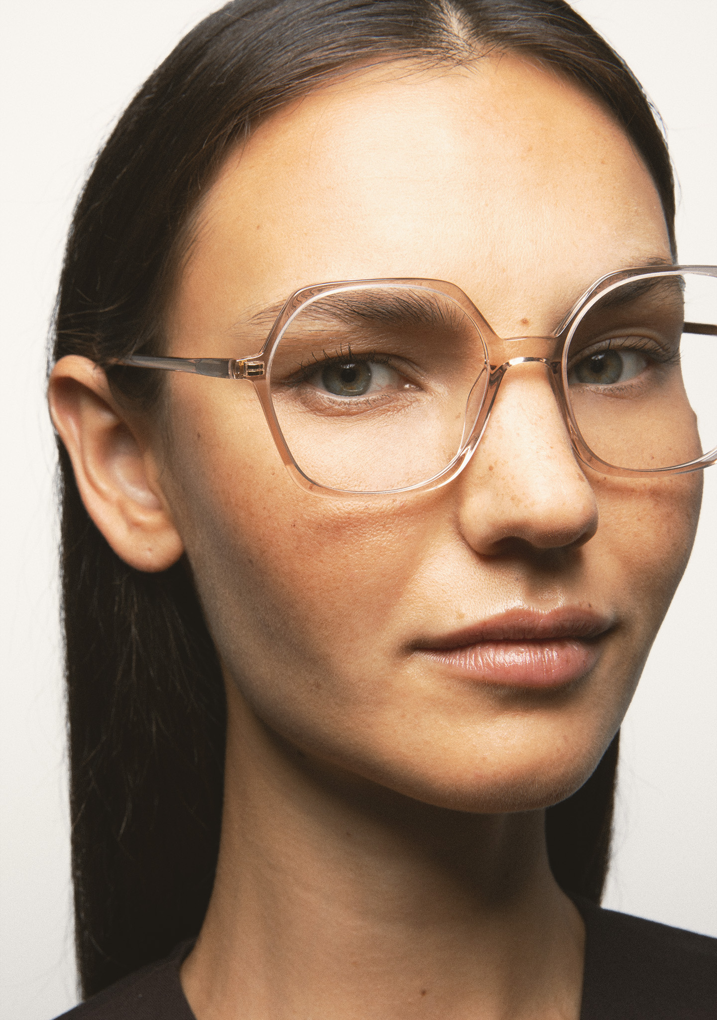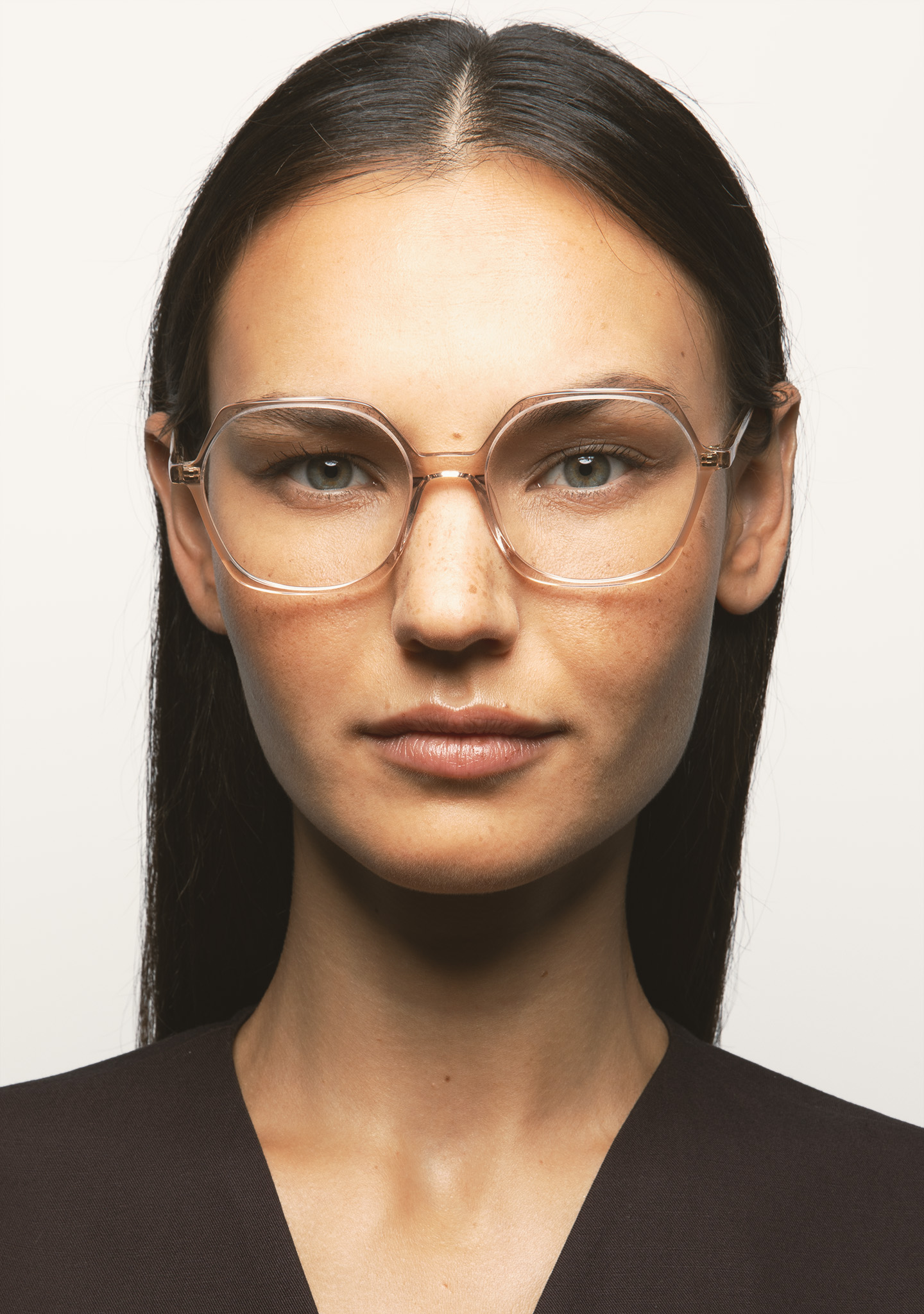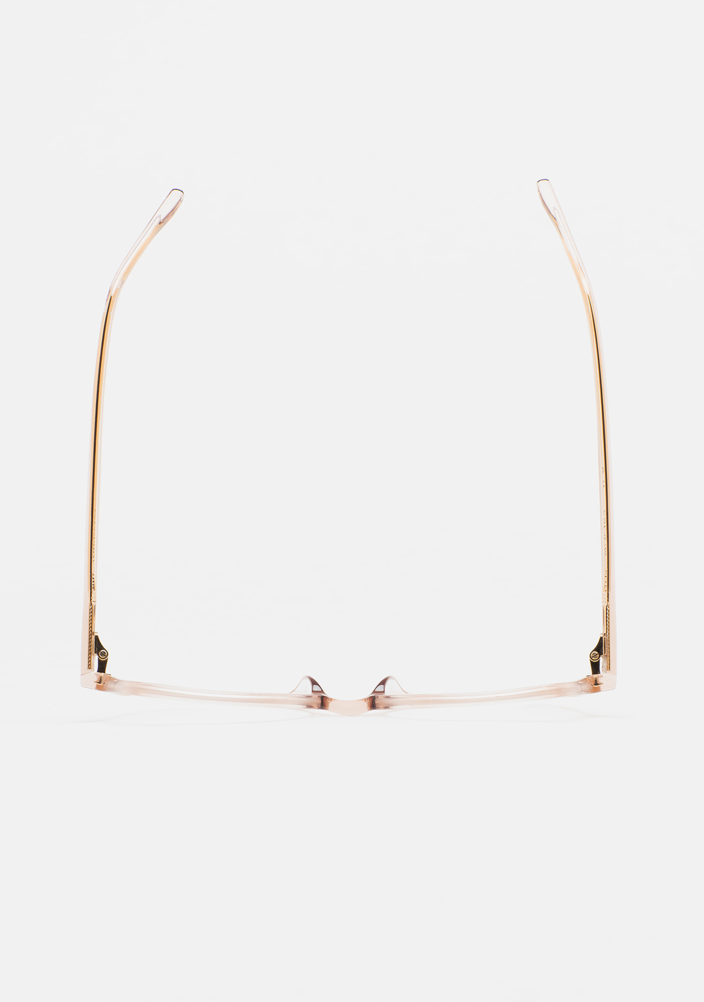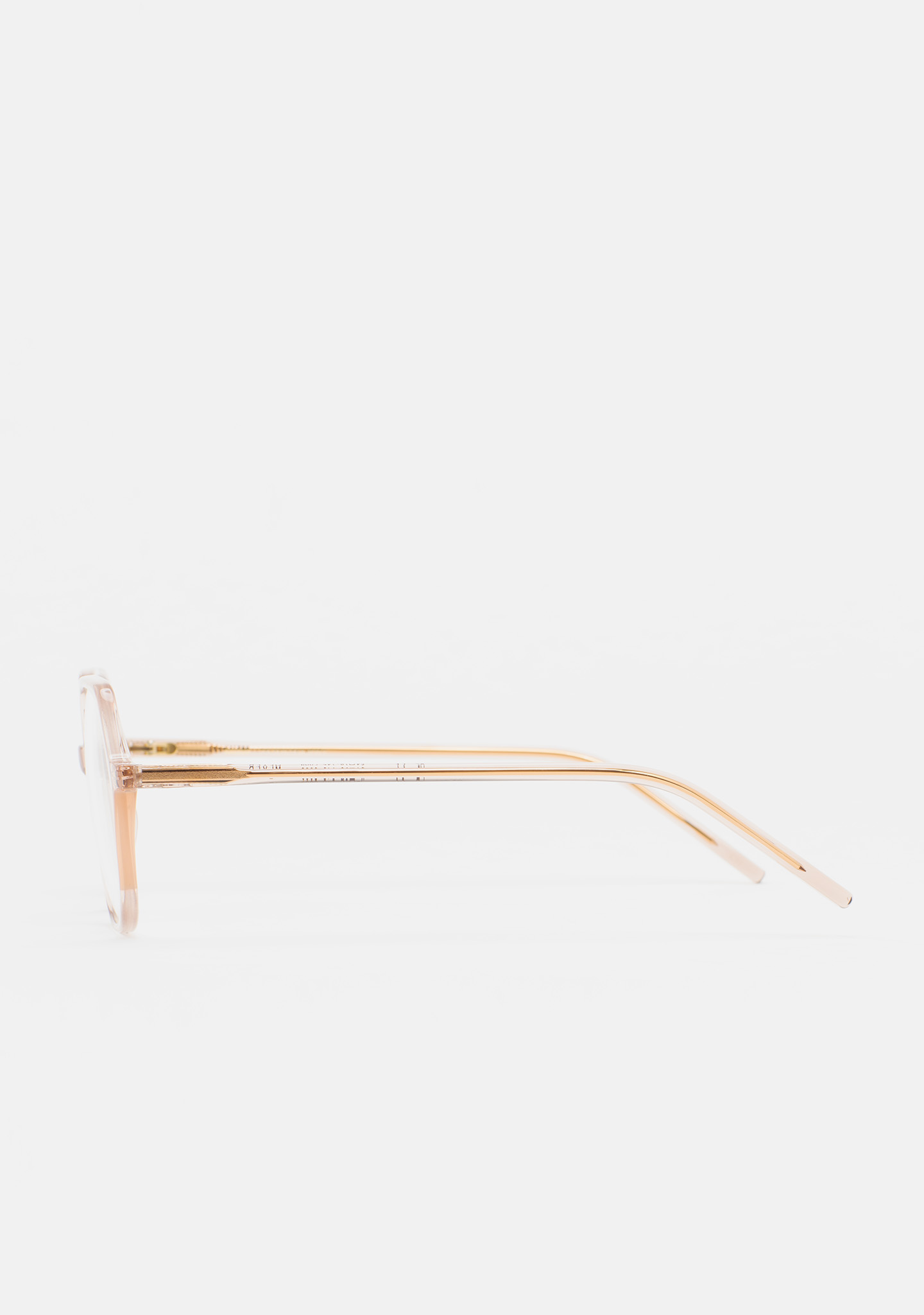 Lunettes de vue de forme hexagonale. Monture en acétate haute densité rose clair transparent avec laminé ambre translucide. Branches en acétate rose clair transparent. Plaquettes en acétate intégrées. Fait main.