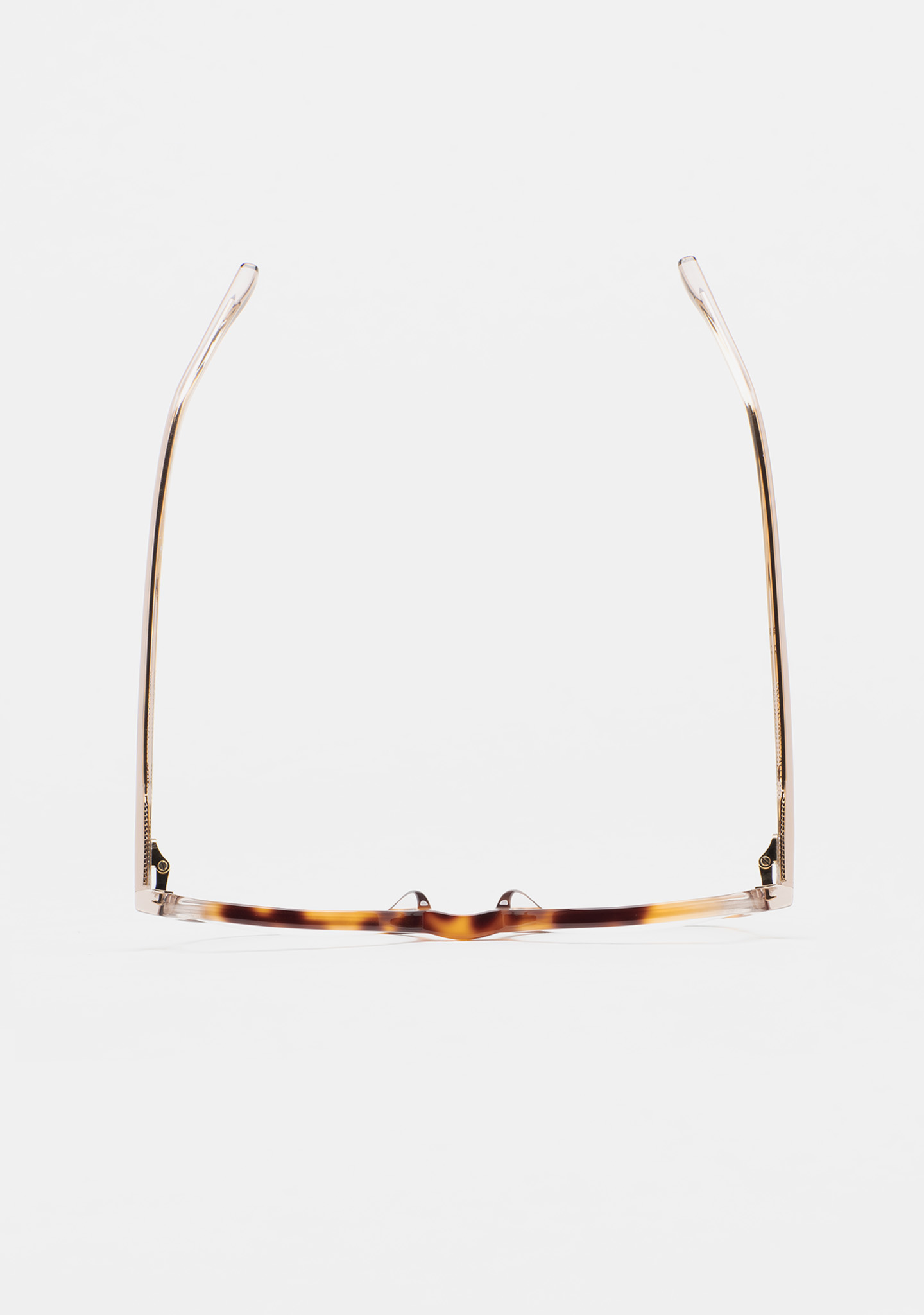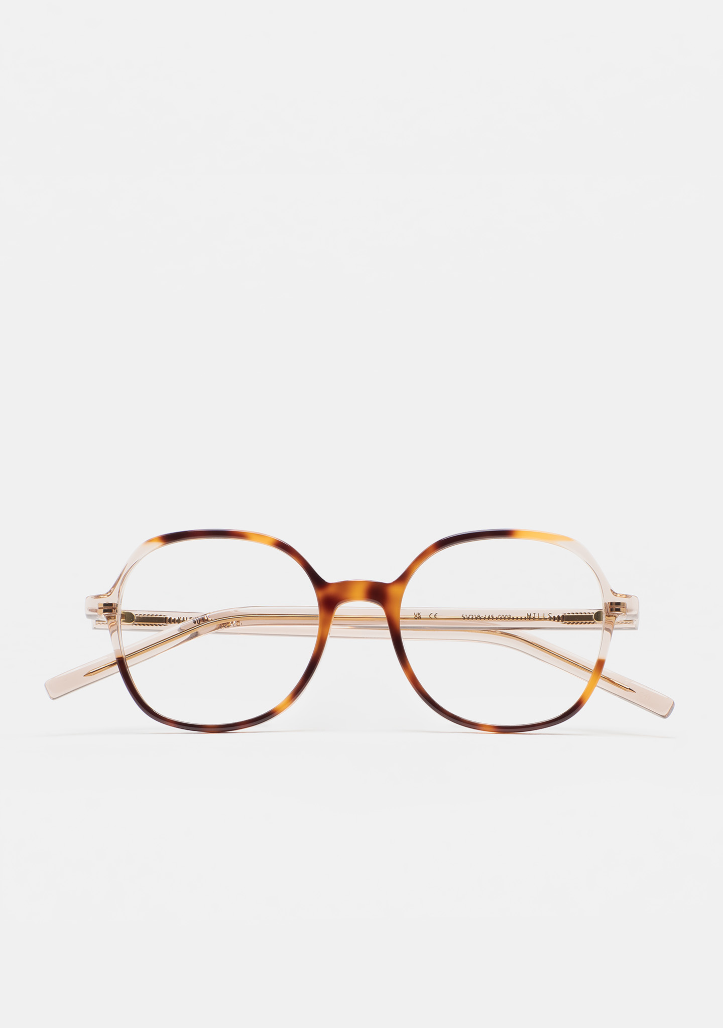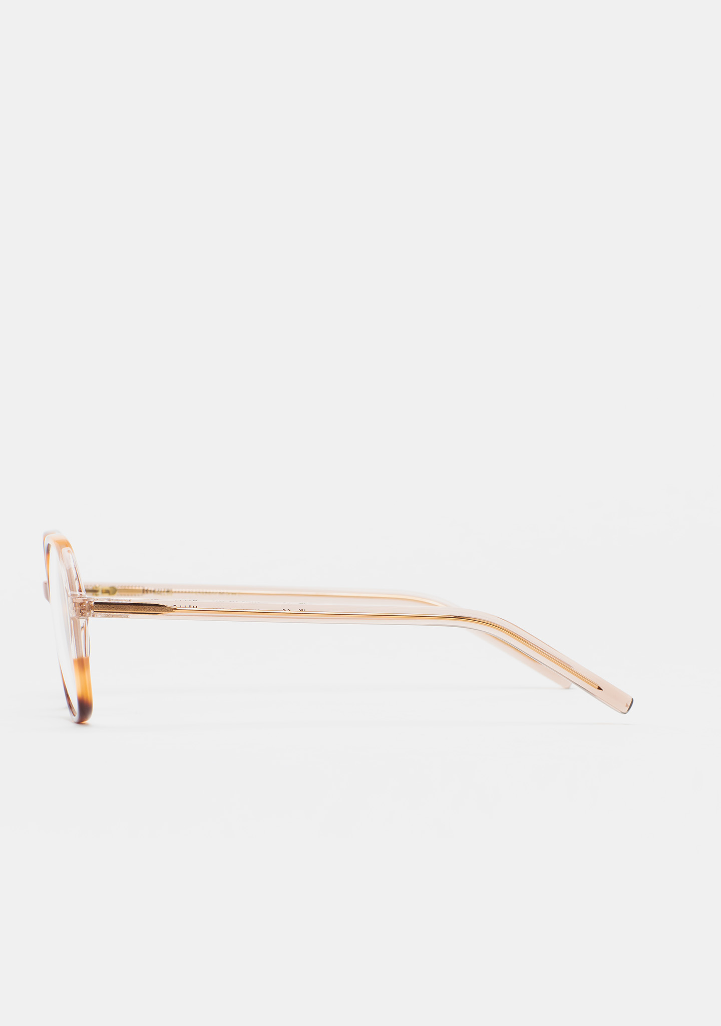 Lunettes de vue de forme arrondie. Monture en acétate haute densité havane marron avec laminé rose clair transparent. Branches en acétate haute densité rose clair transparent. Plaquettes en acétate intégrées. Fait main.
