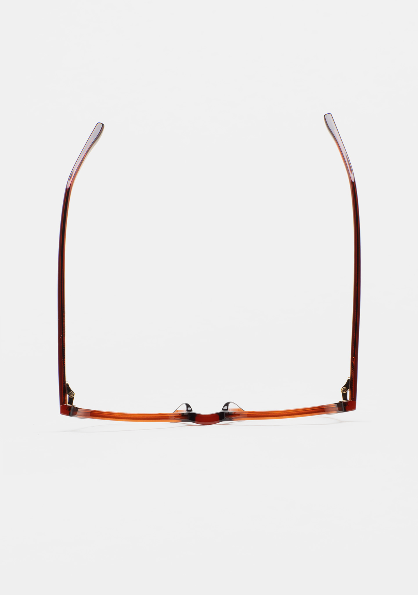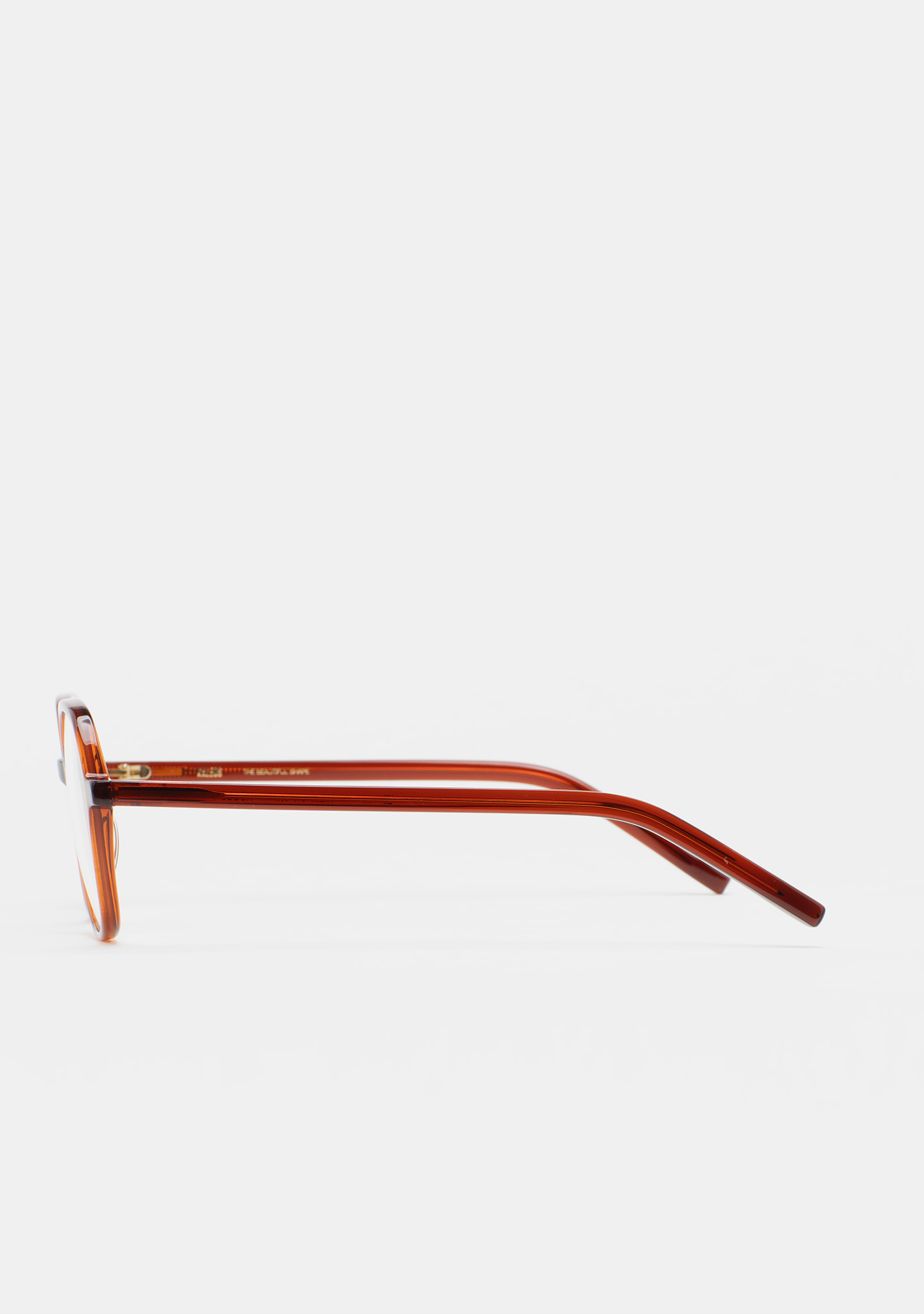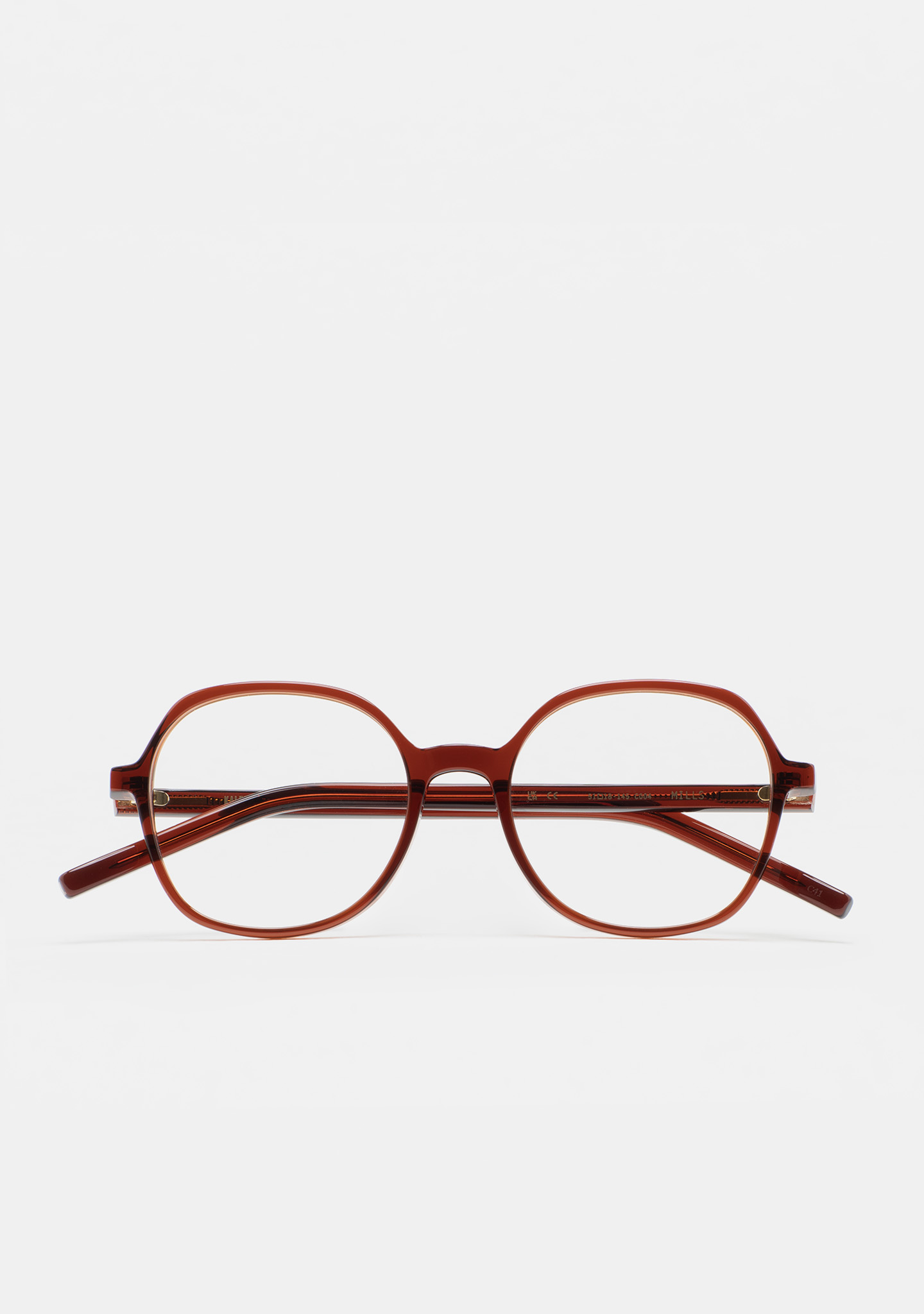 Lunettes de vue de forme arrondie. Monture et branches en acétate haute densité marron transparent. Plaquettes en acétate intégrées. Fait main.