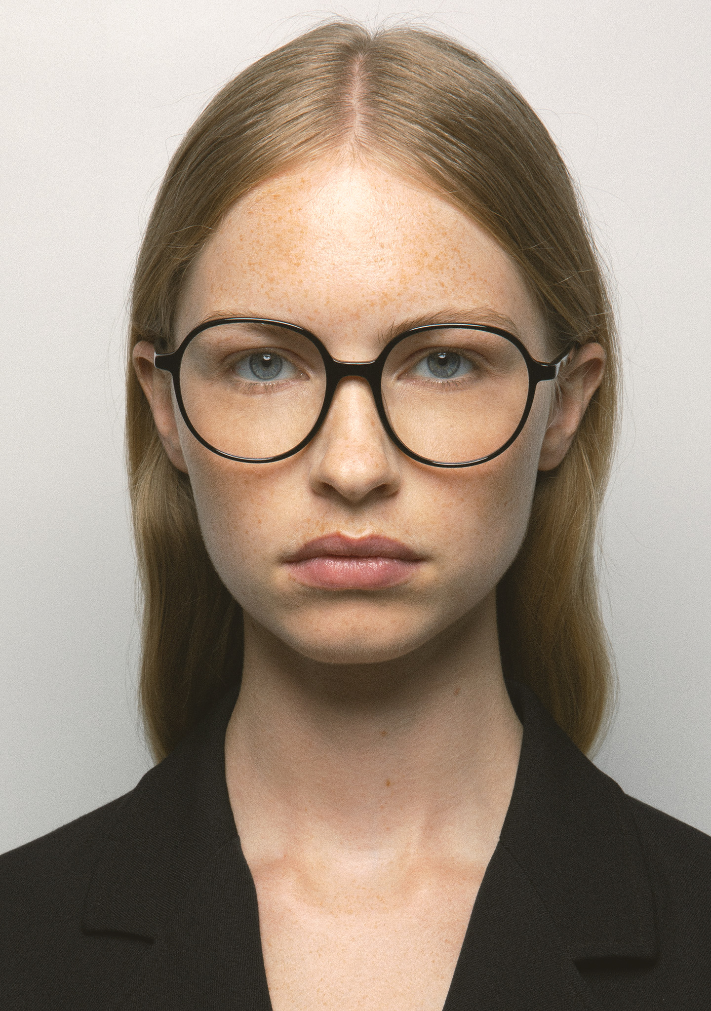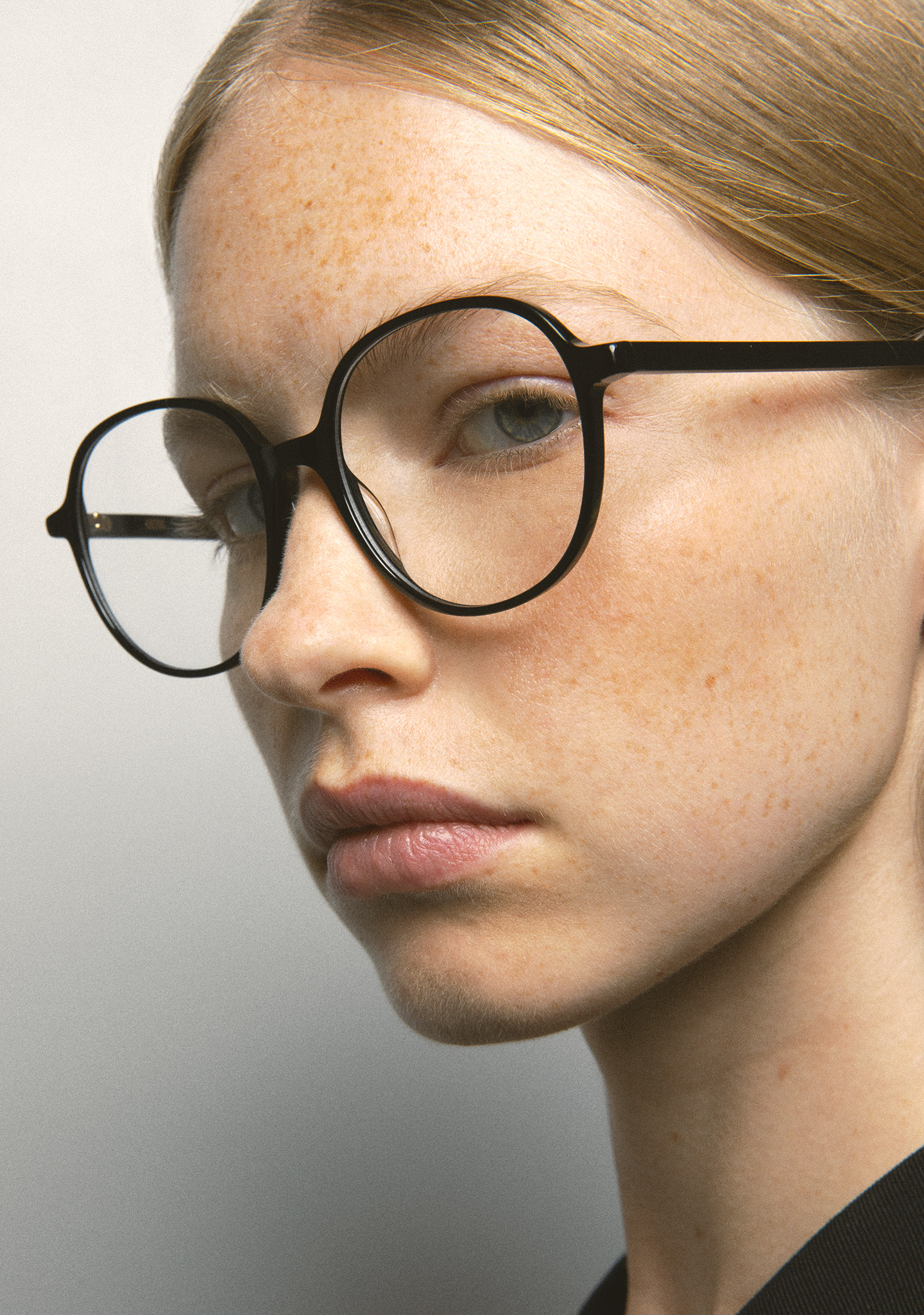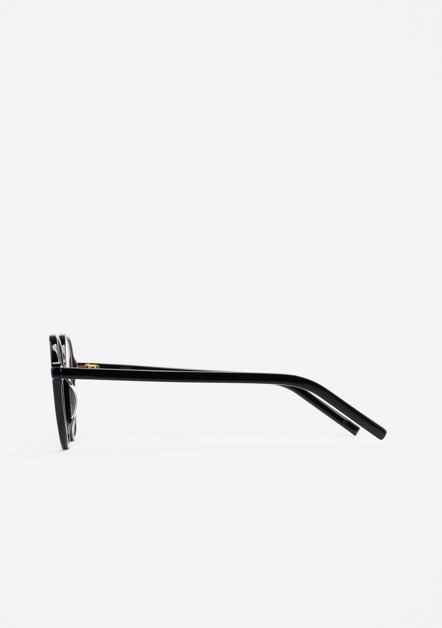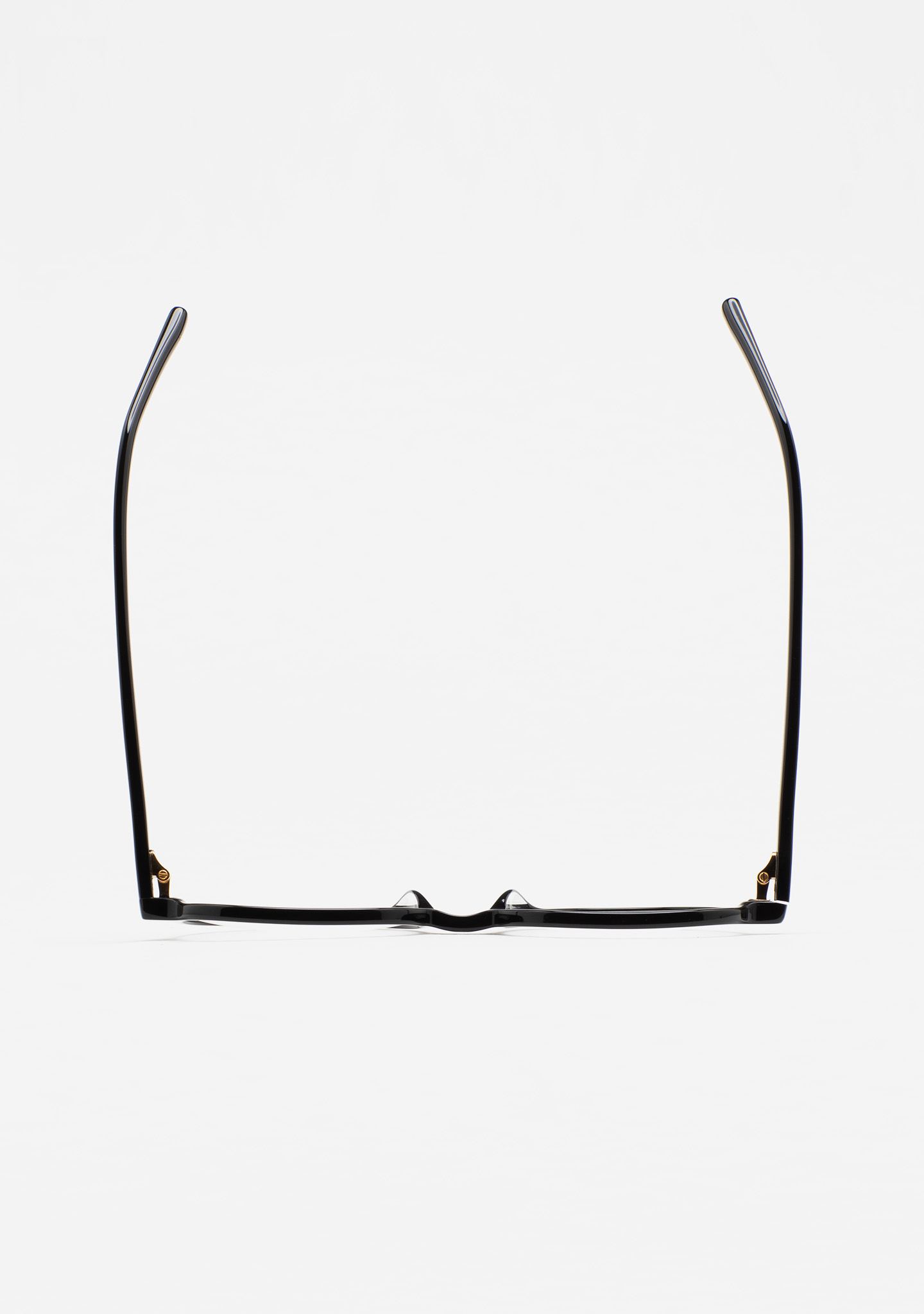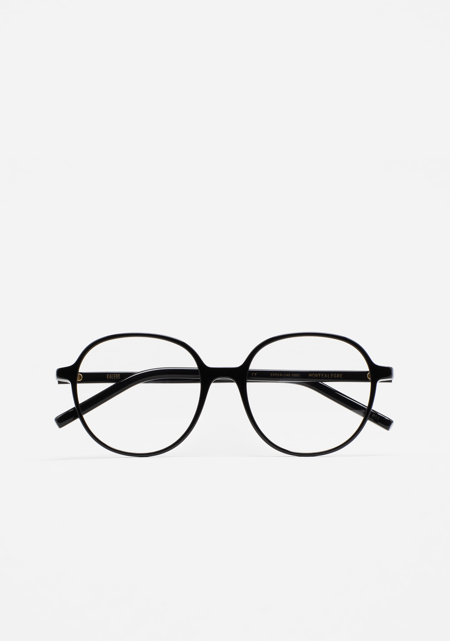 Lunettes de vue arrondies. Frontal et branches en acétate haute densité noir. Plaquettes en acétate fixes. Fait main.