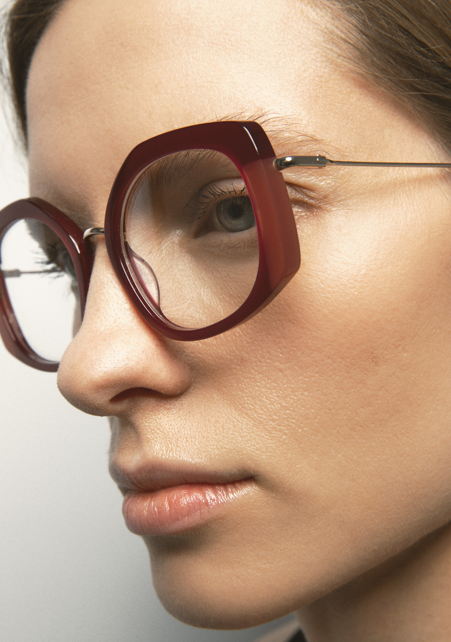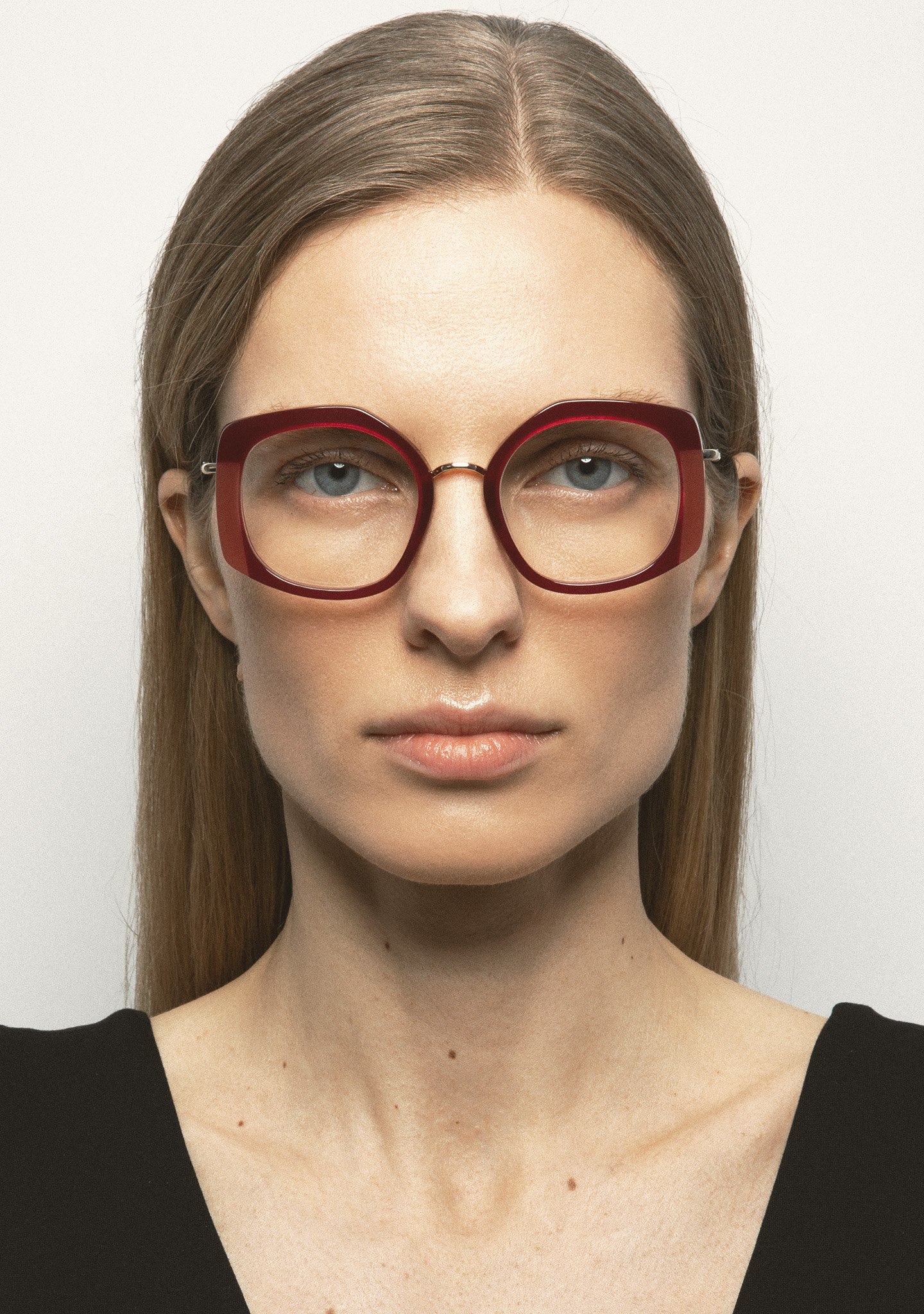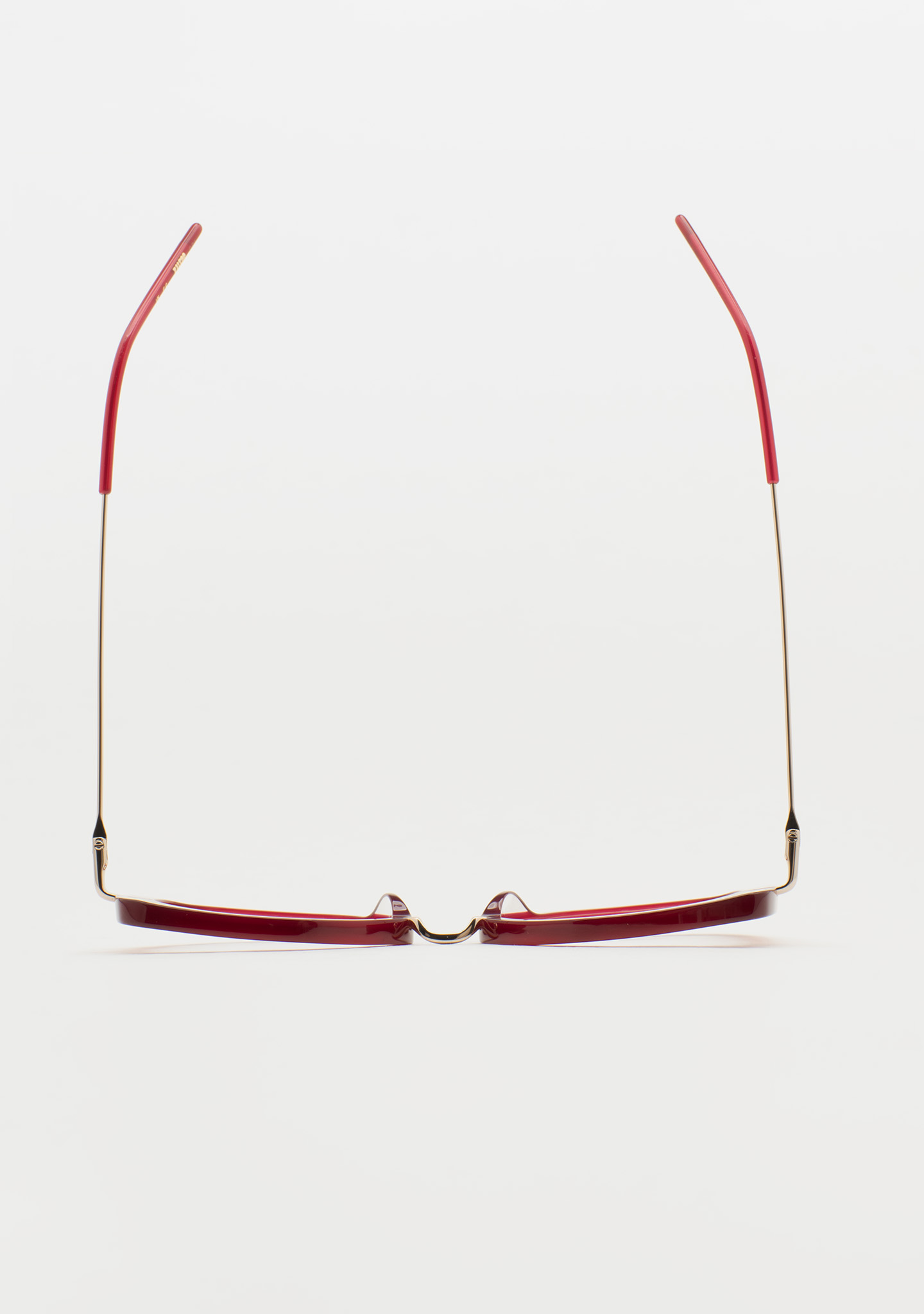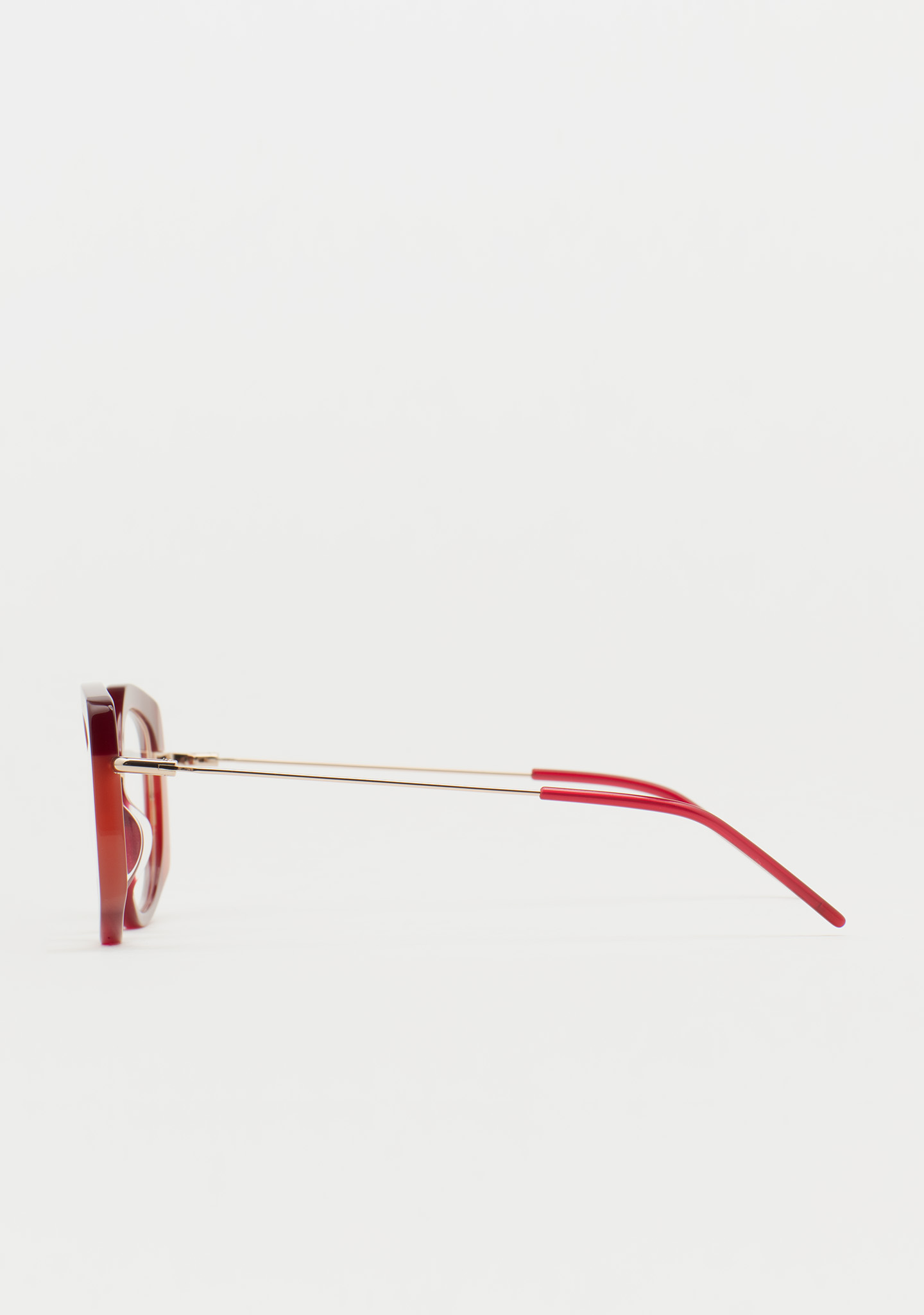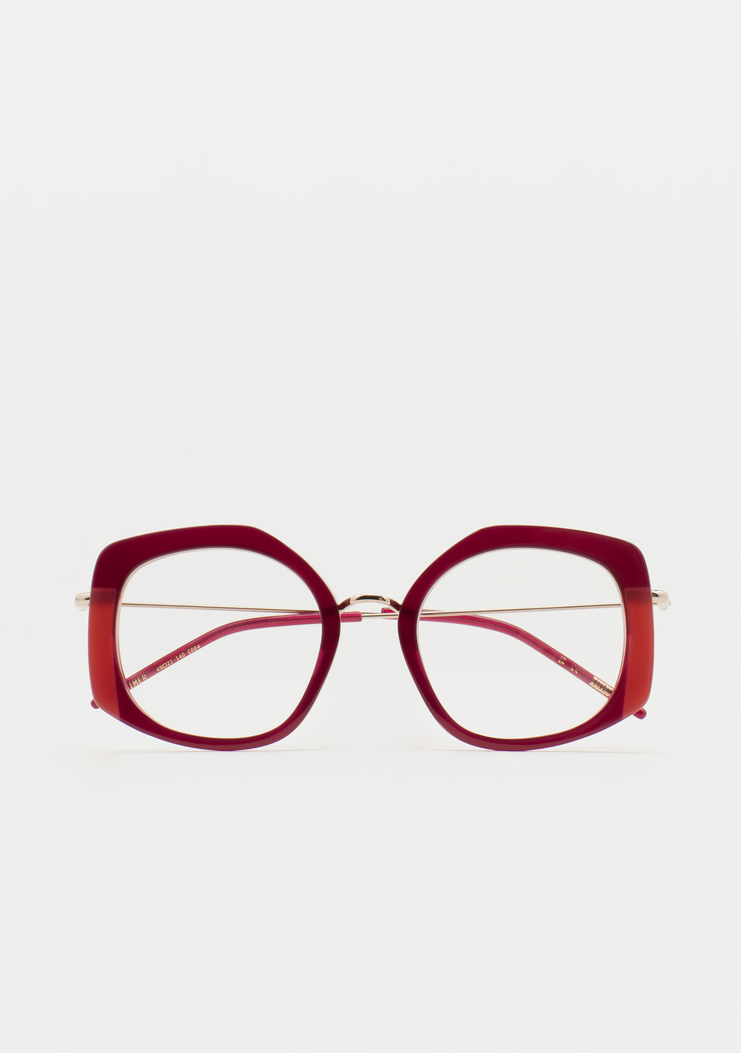 Lunettes de vue de forme pentagonale. Audace et personnalité à chaque angle. Face en acétate pourpre avec laminage orange translucide. Structure et pont en acier inoxydable doré. Branches en acier inoxydable avec embouts en acétate orange translucide. Plaquettes en acétate intégrées. Fabriquées à la main.