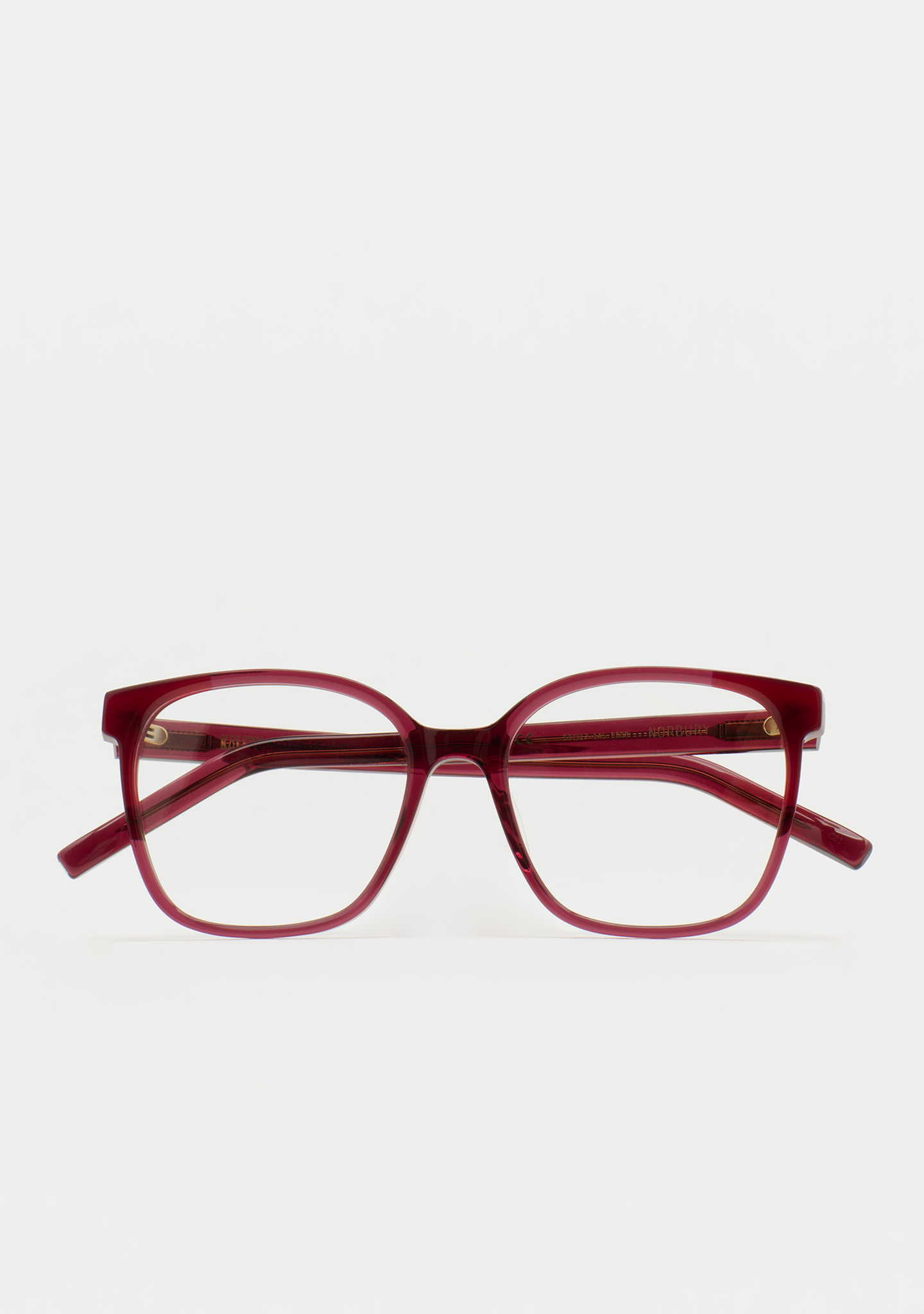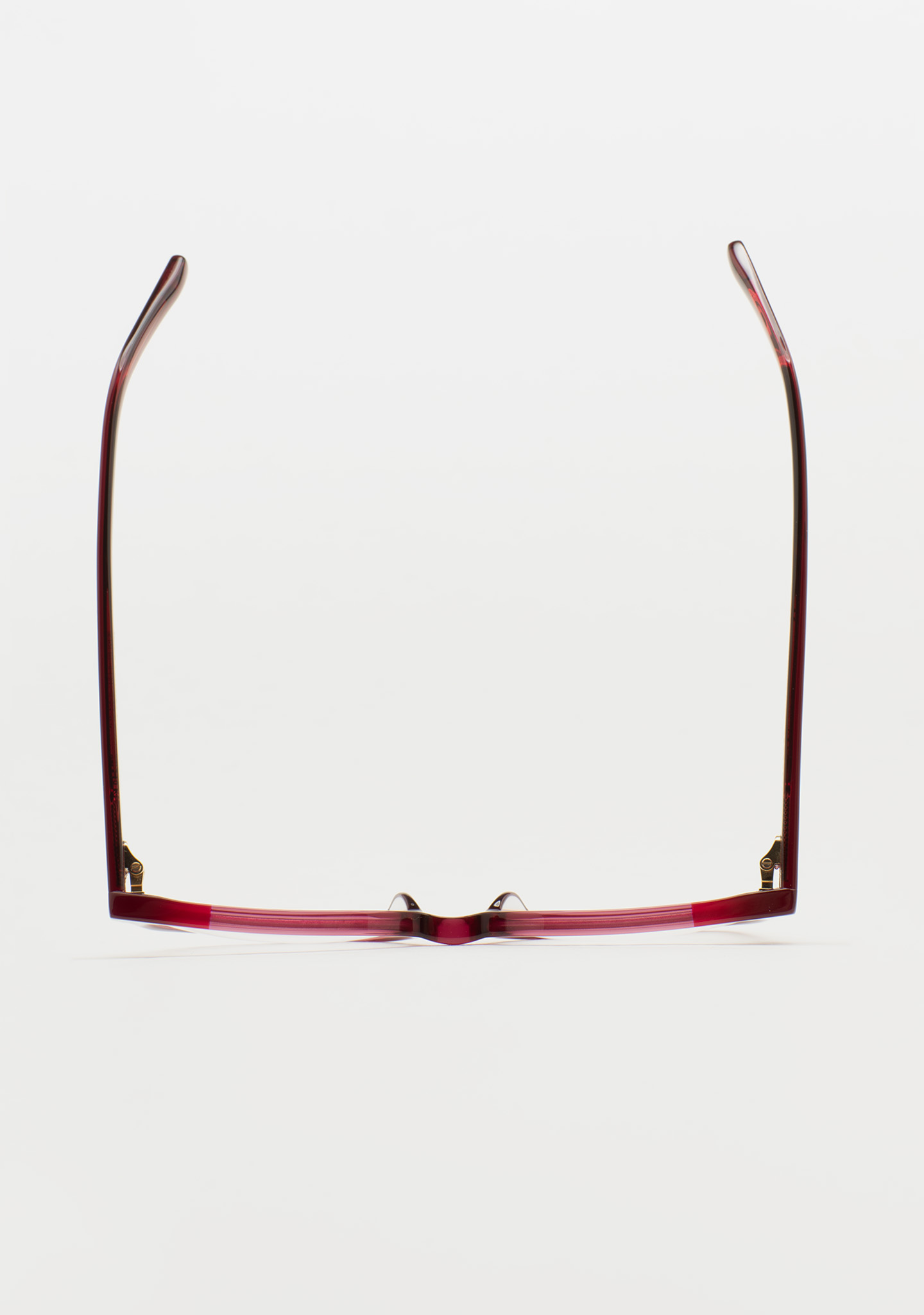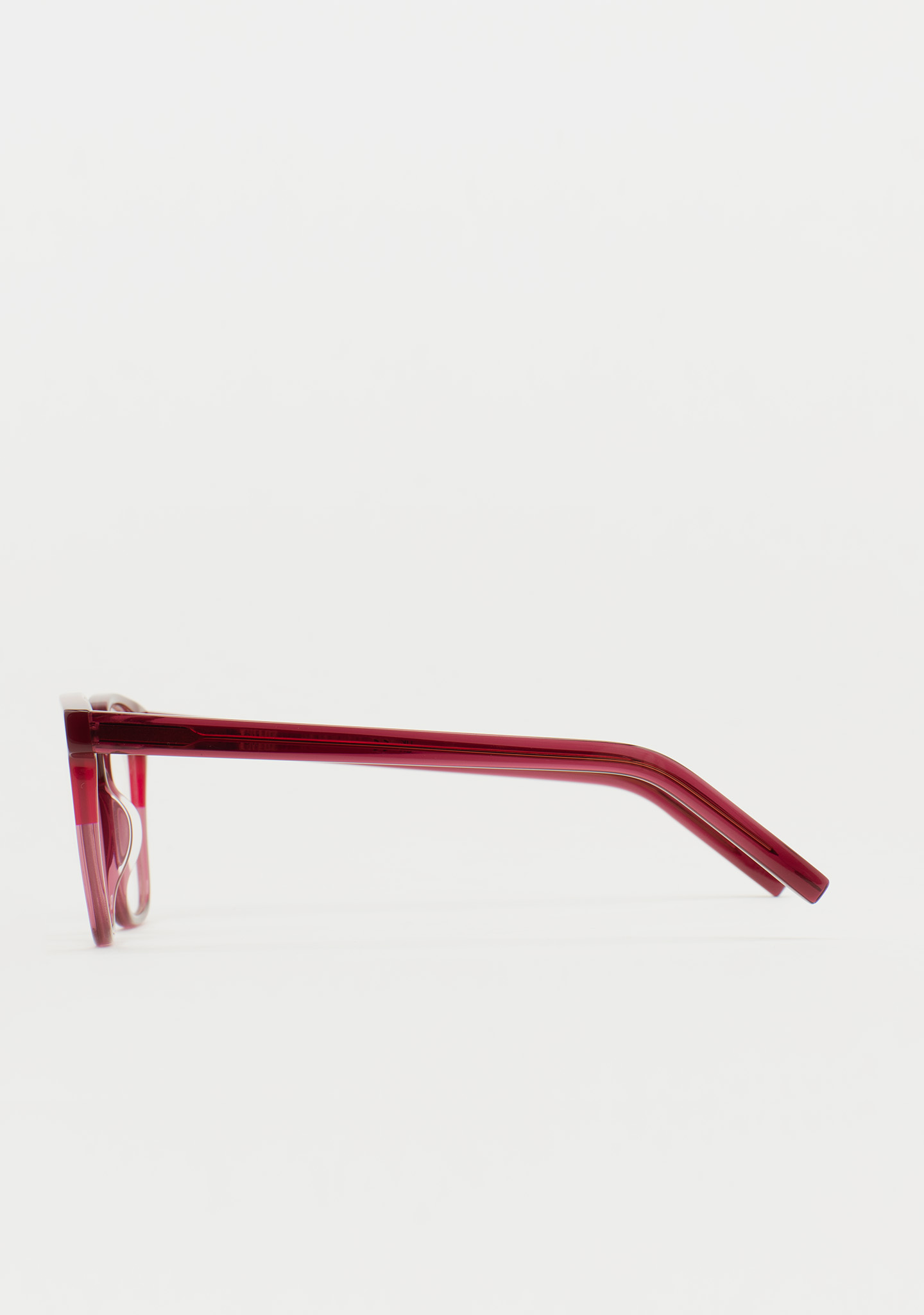 Lunettes de vue carrées. Lignes épurées et percutantes. Face avant et branches en acétate rouge transparent. Plaquettes de nez en acétate intégrées. Fabriquées à la main.