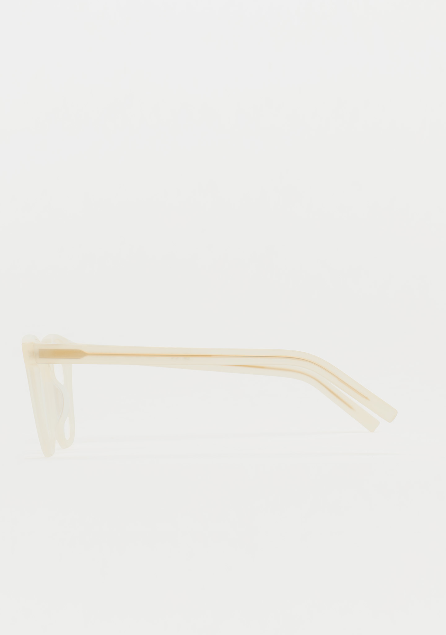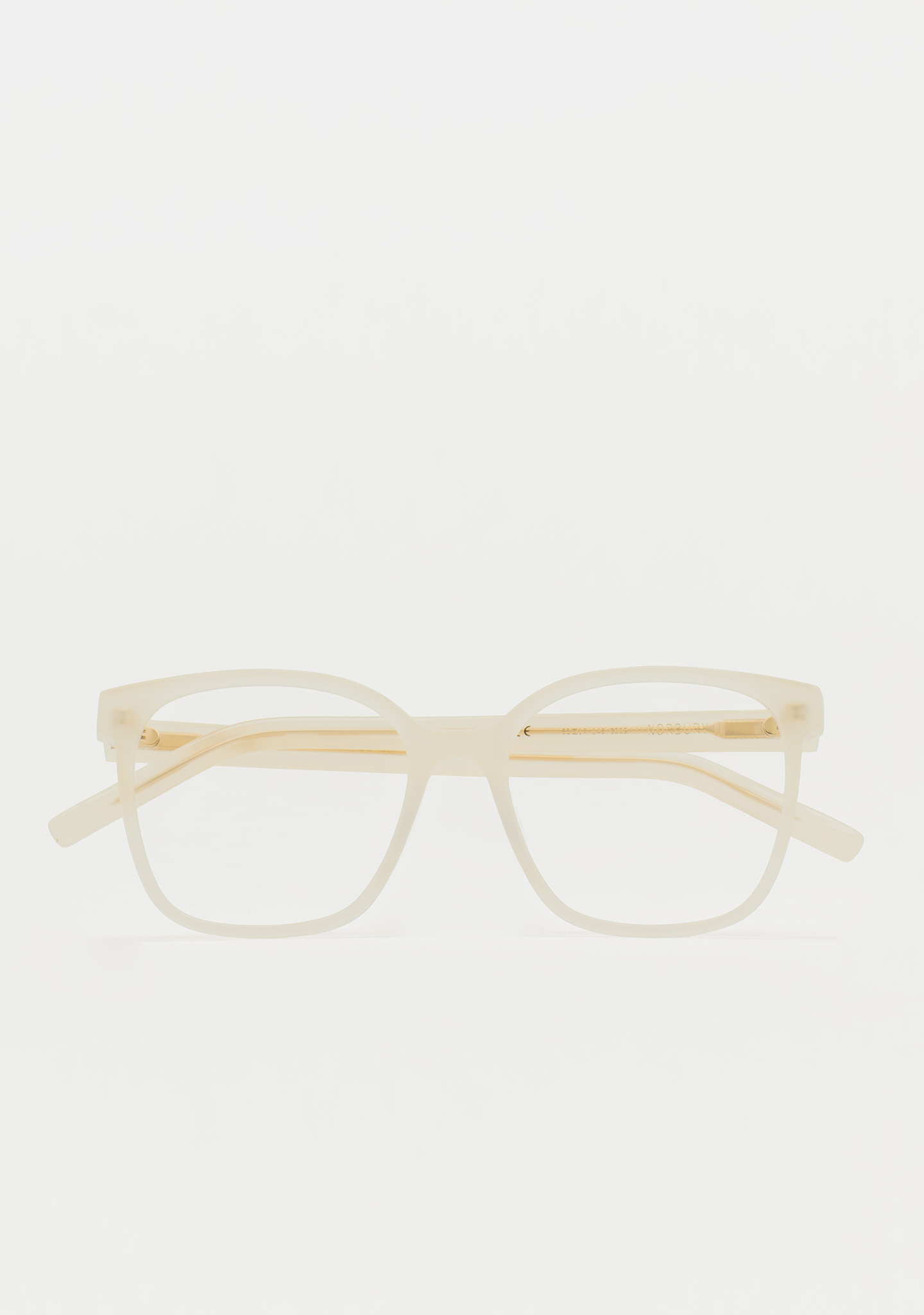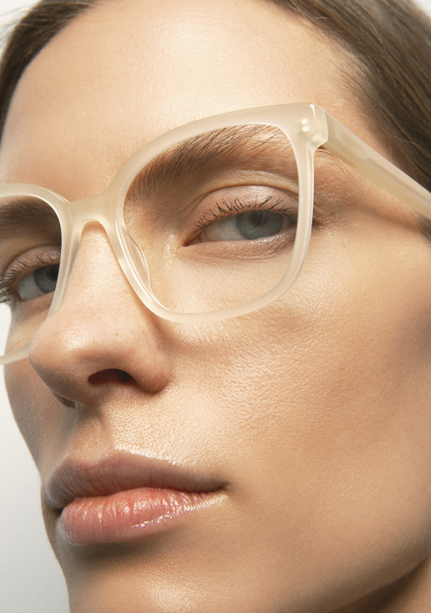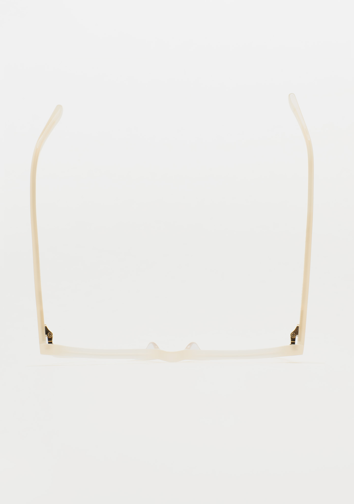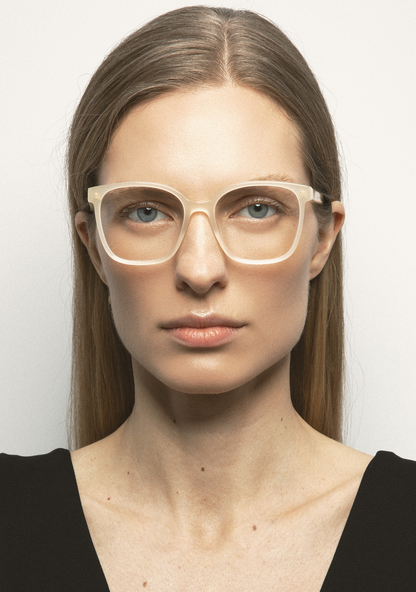 Lunettes de vue carrées. Lignes épurées et percutantes. Face avant et branches en acétate beige translucide. Plaquettes de nez en acétate intégrées. Fabriquées à la main.