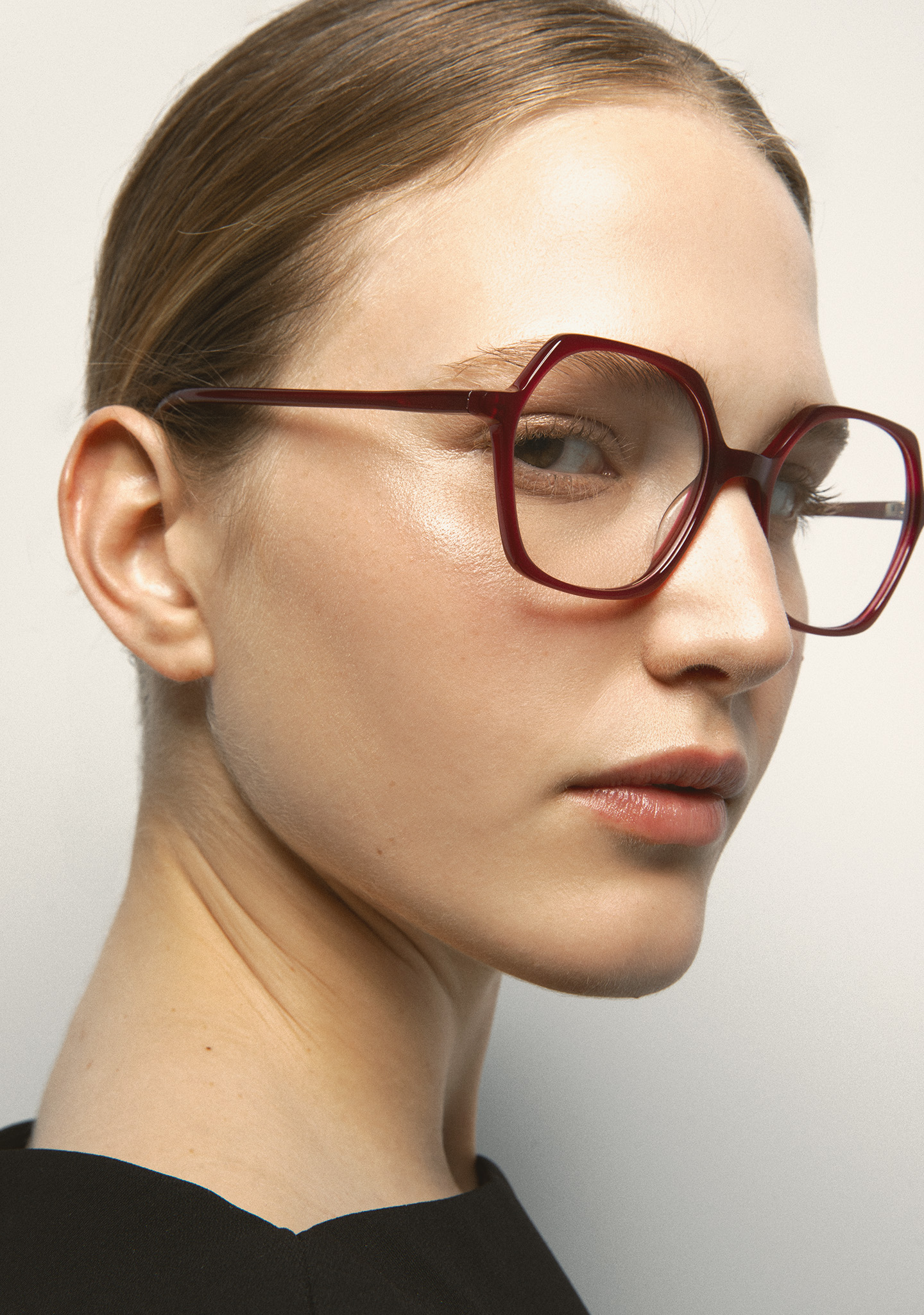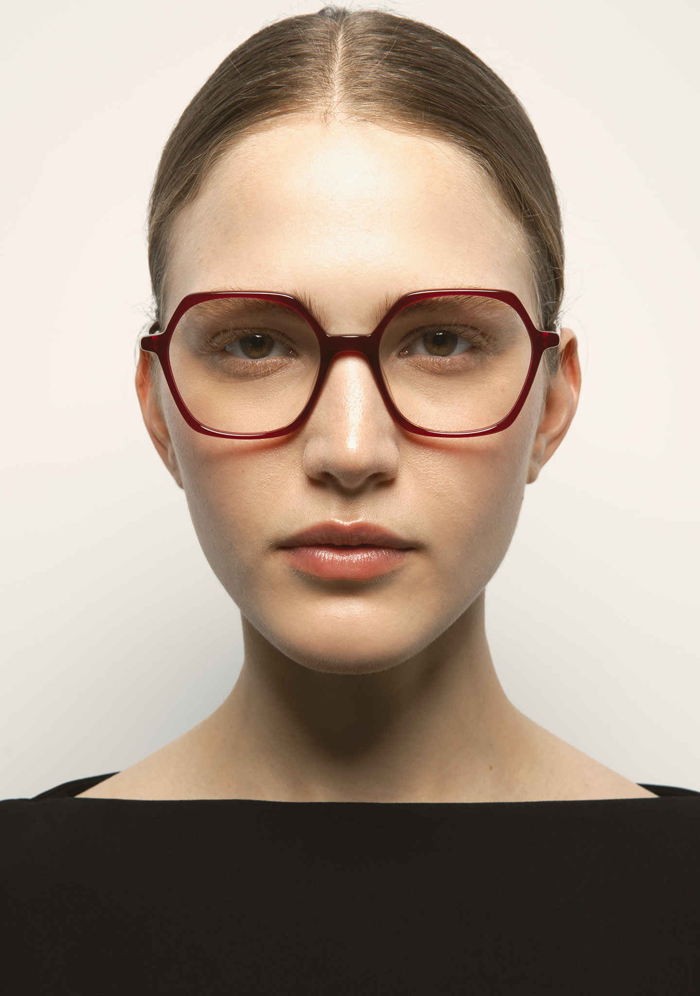 Lunettes de vue hexagonales. Un minimalisme qui ne passe pas inaperçu. Face avant et branches en acétate rouge transparent. Plaquettes de nez en acétate intégrées. Fabriquées à la main.