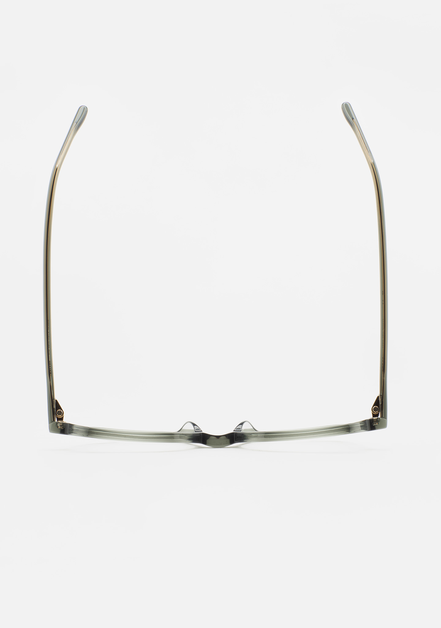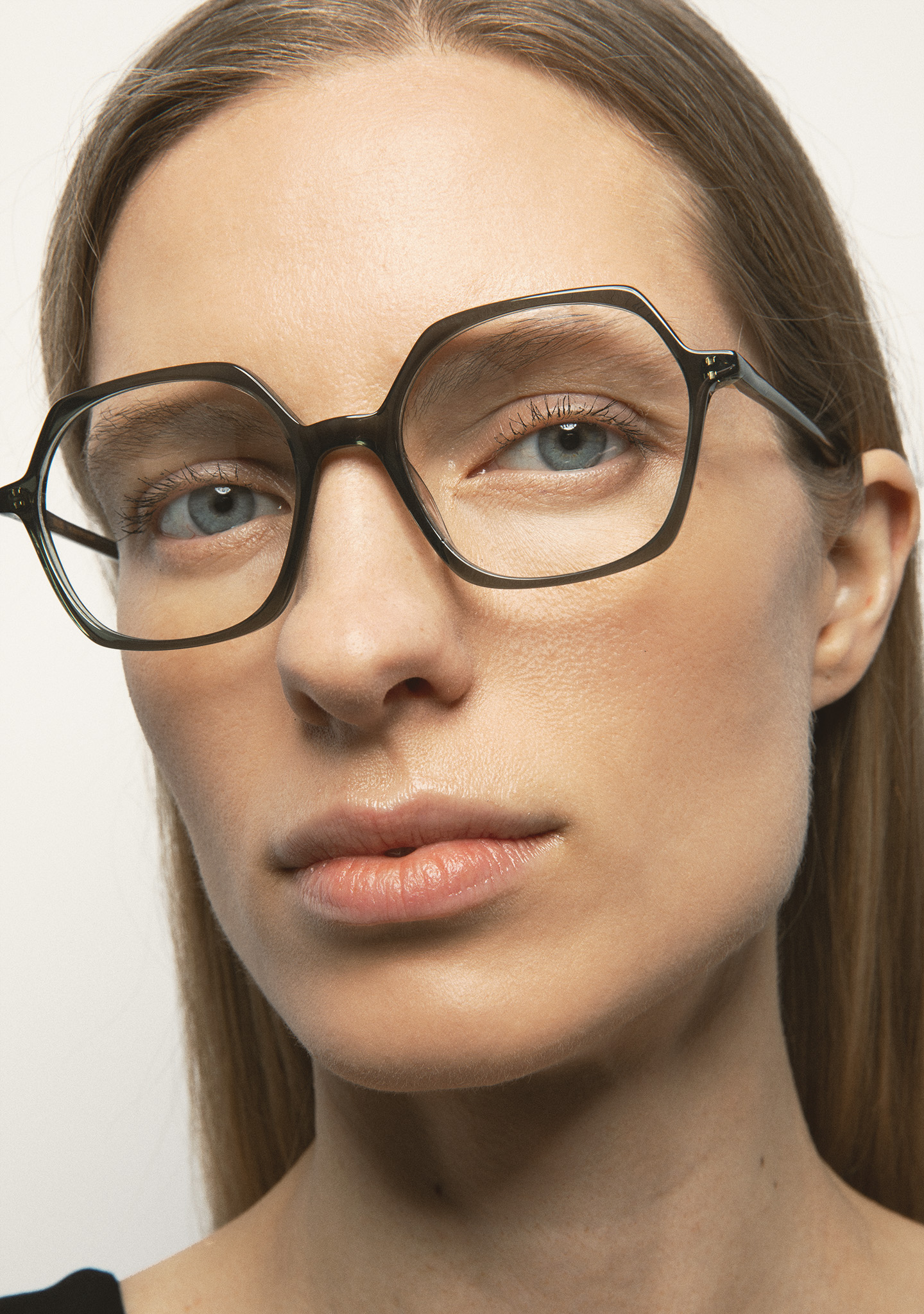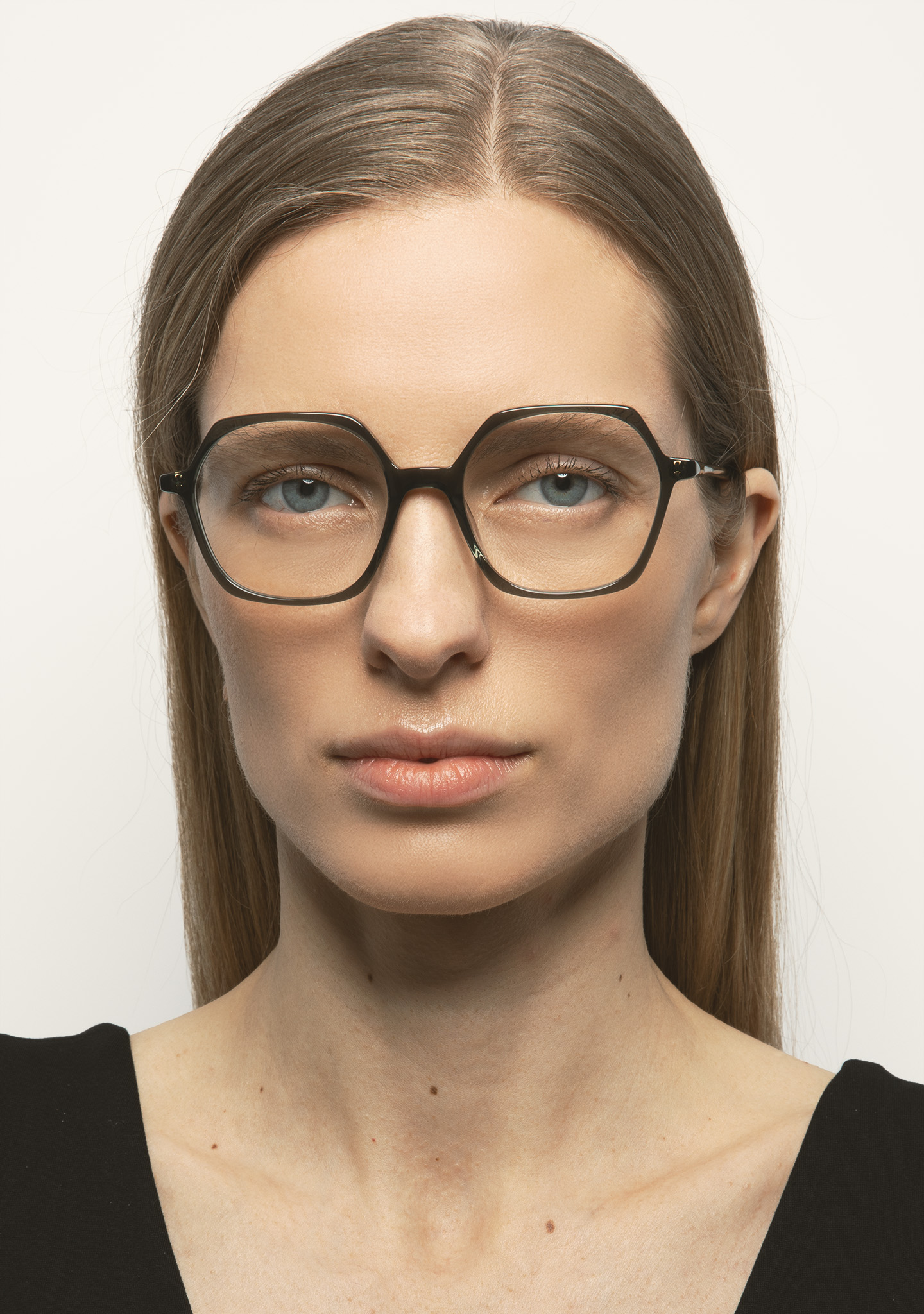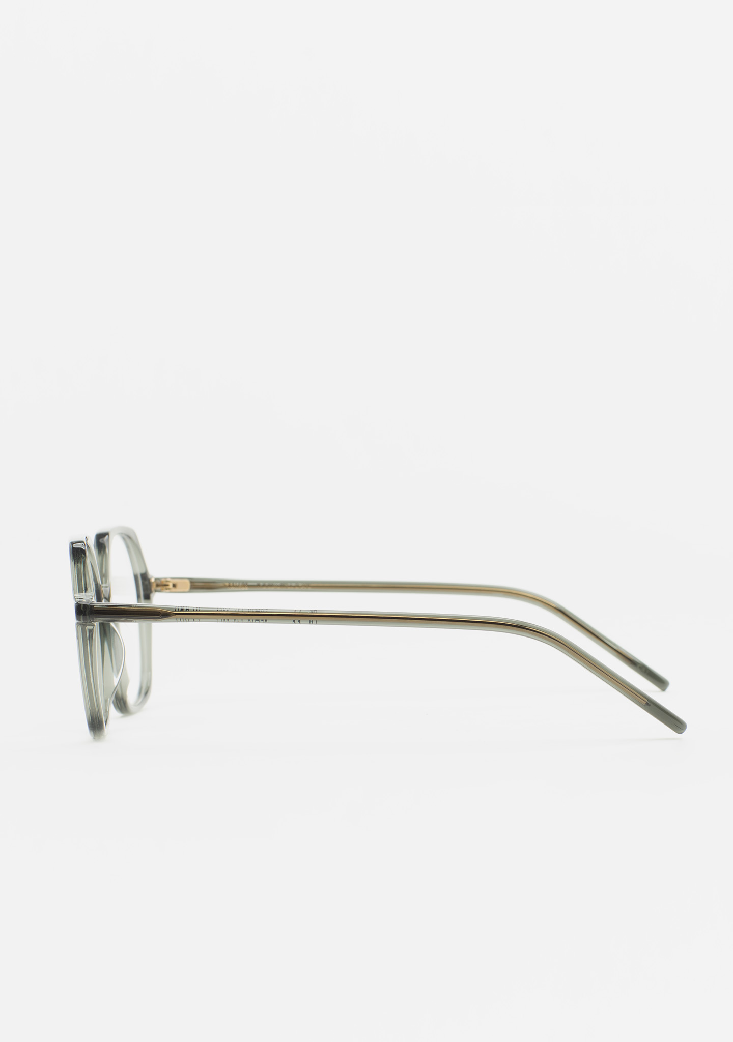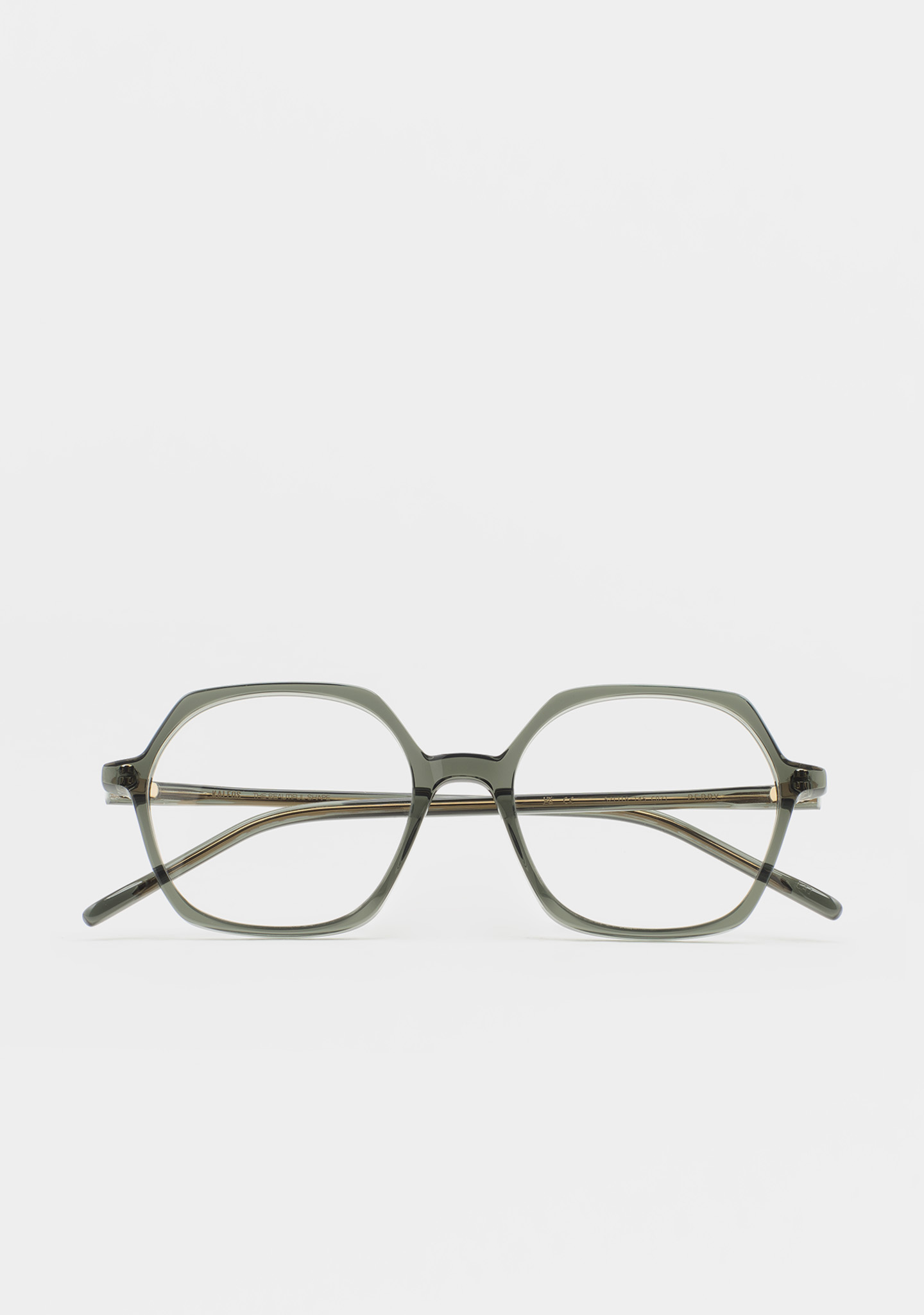 Lunettes de vue de forme hexagonale. Un minimalisme qui ne passe pas inaperçu. Face et branches en acétate vert transparent. Plaquettes en acétate intégrées. Fabriquées à la main.