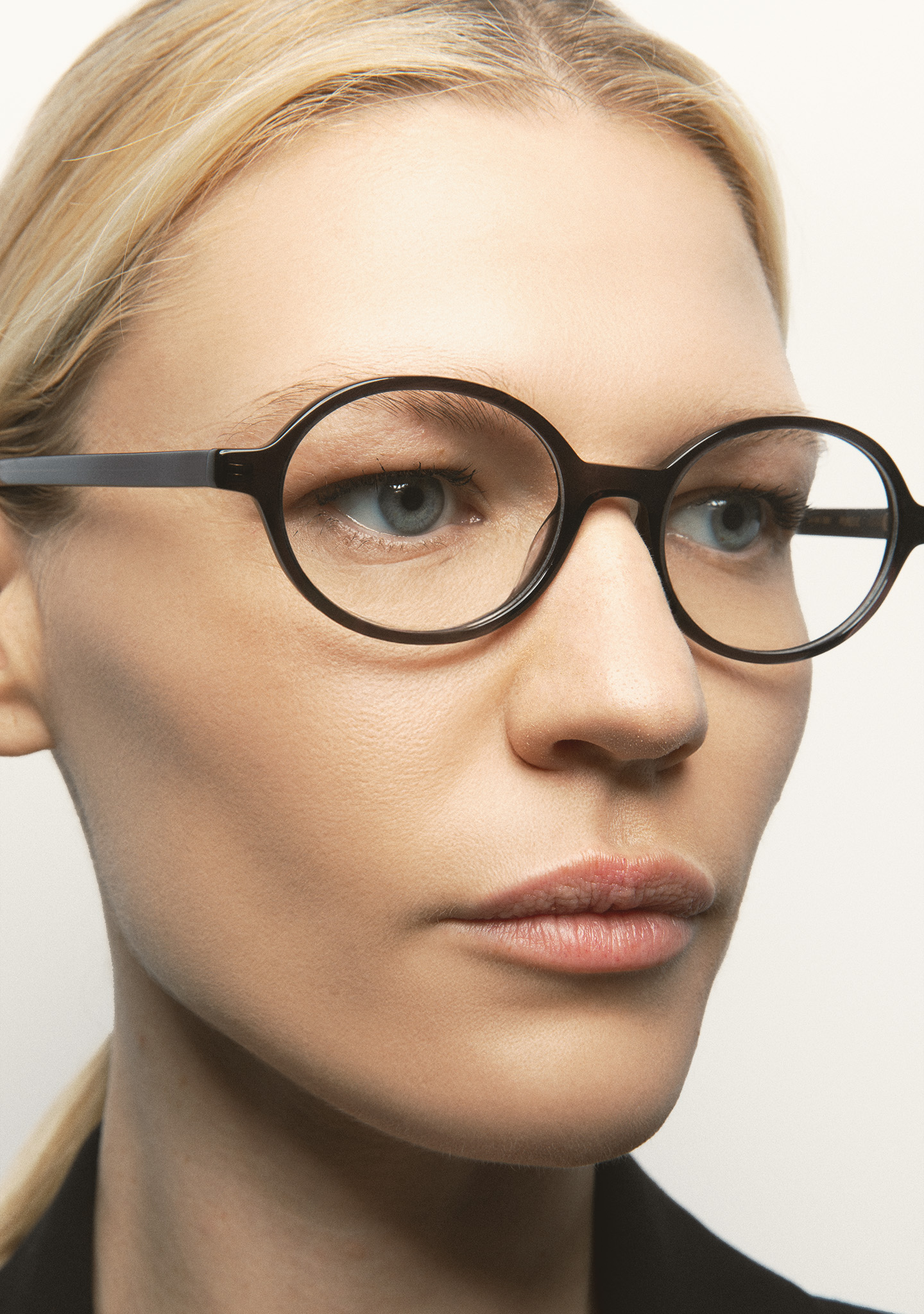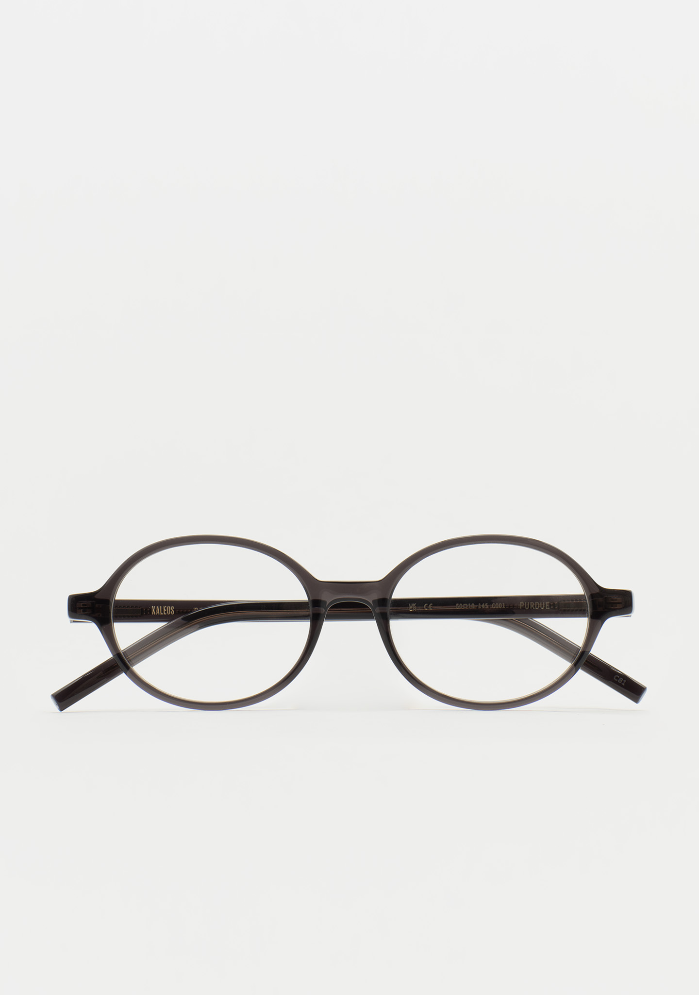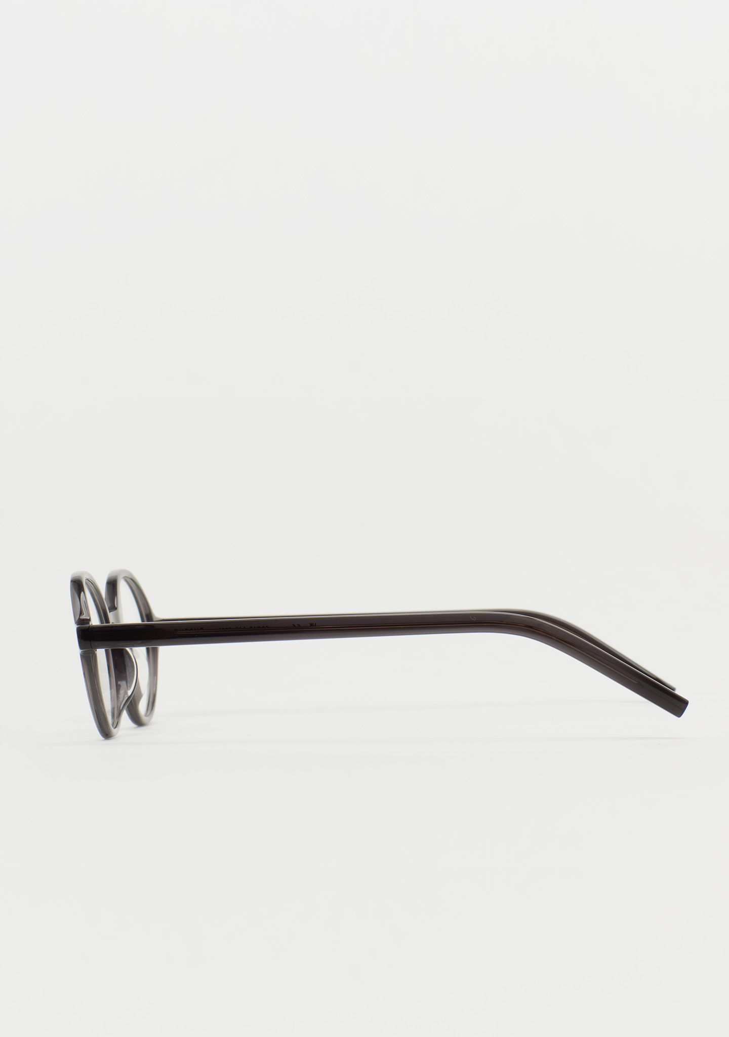 Lunettes de vue de forme ovale. Une géométrie qui crée la tendance. Face et branches en acétate gris foncé transparent. Plaquettes en acétate intégrées. Fabriquées à la main.