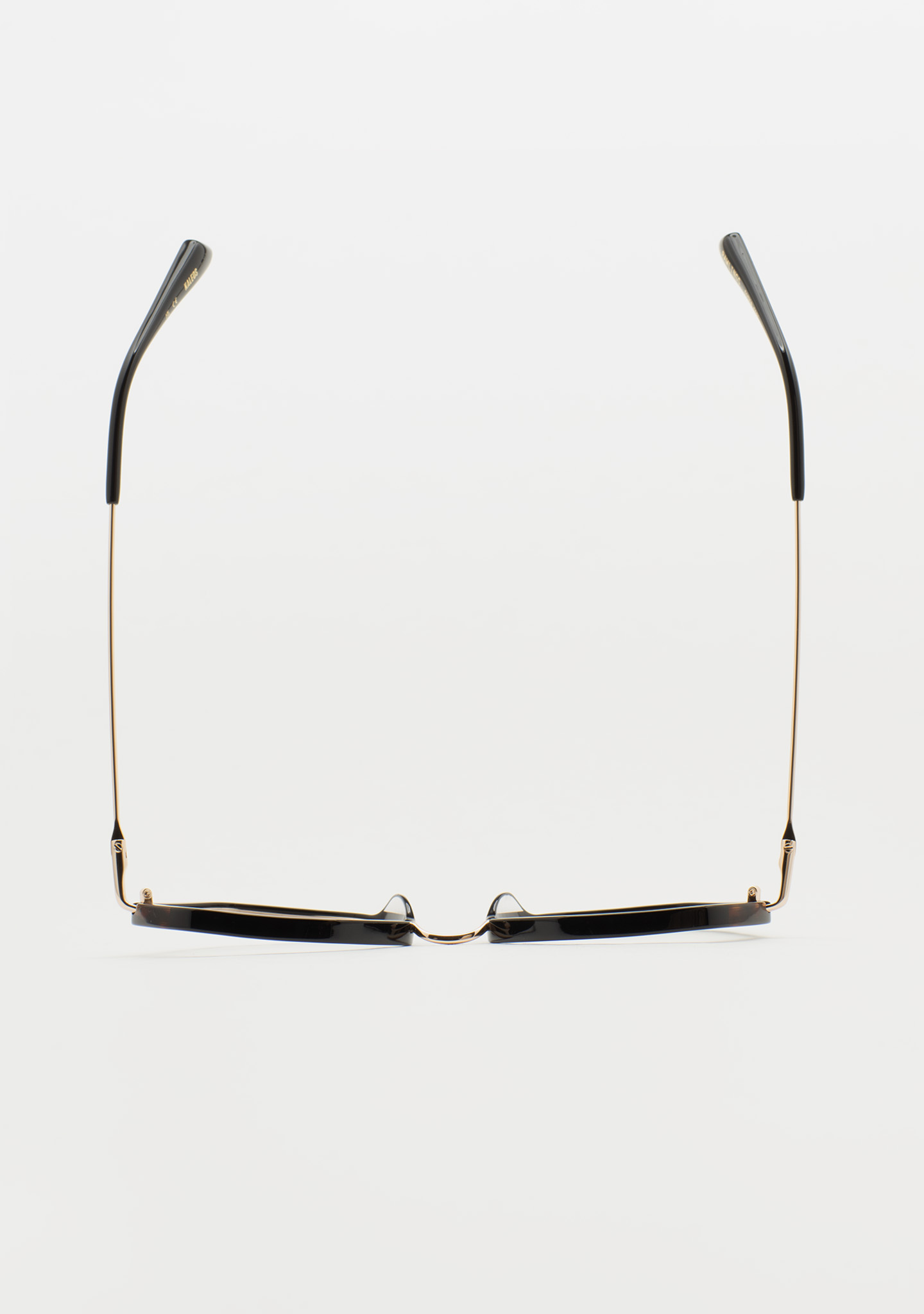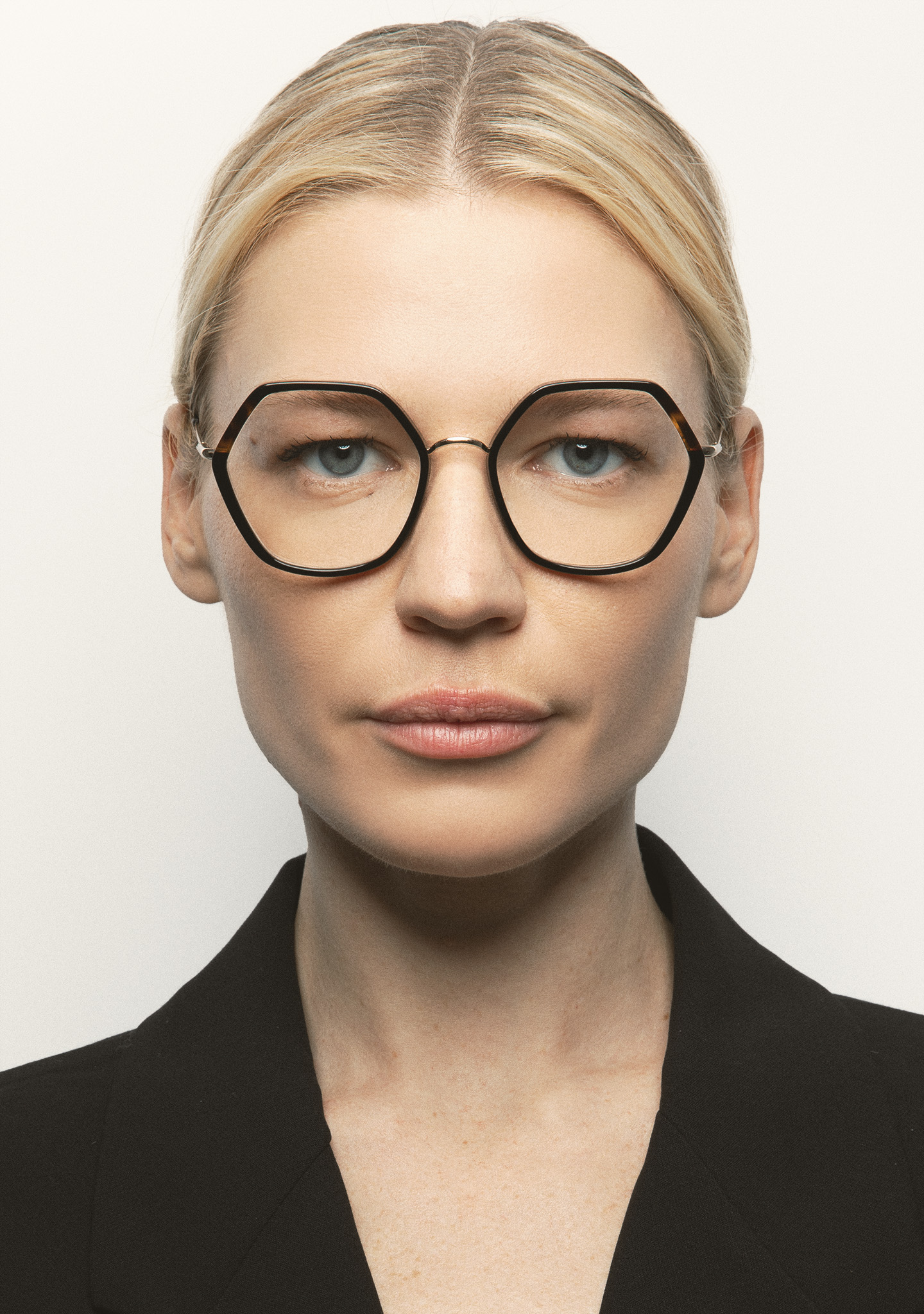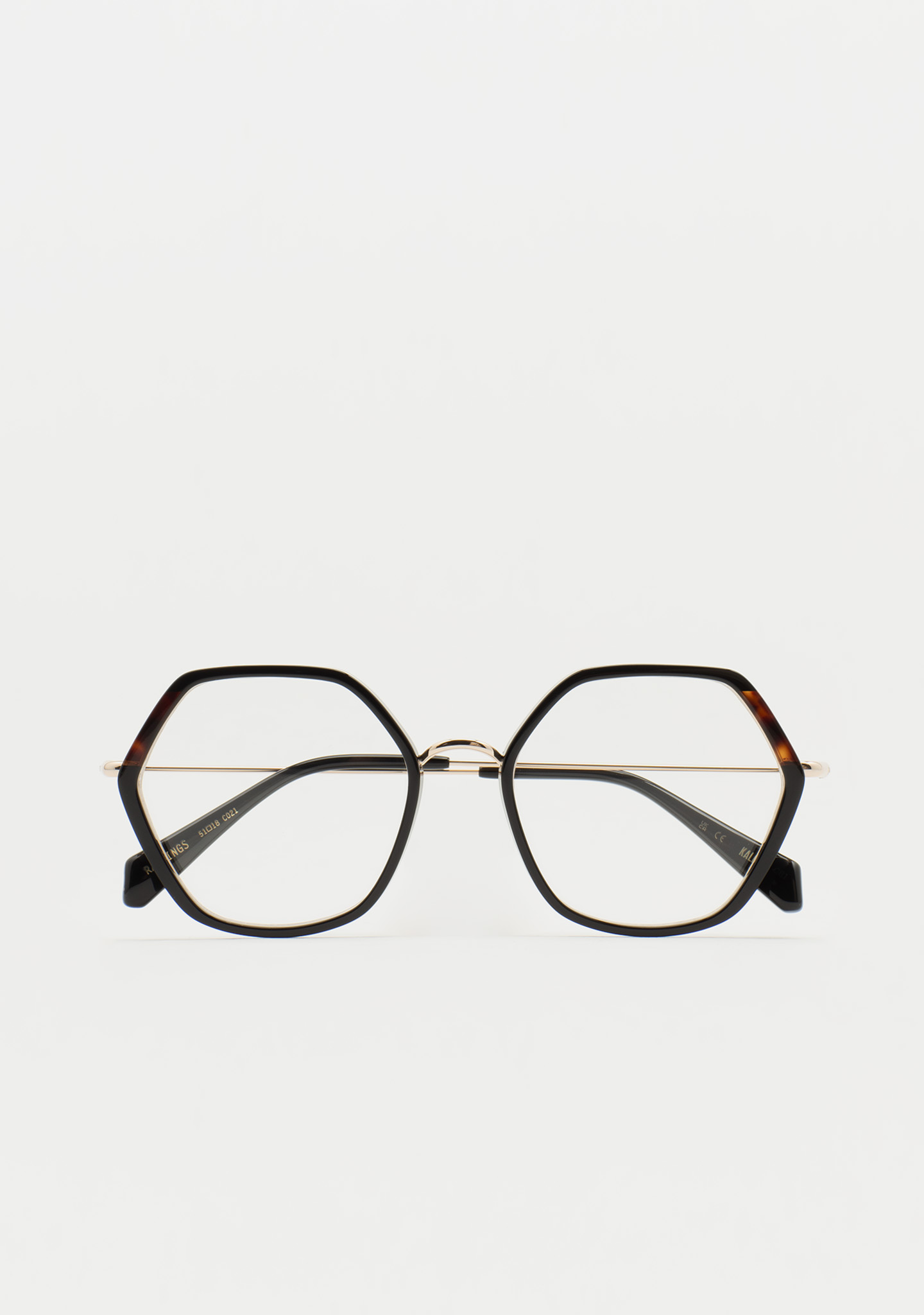 Lunettes de vue de forme hexagonale. Design pensé dans chaque angle. Face avant en acétate noir avec laminage havane marron. Structure et pont en acier inoxydable doré. Branches en acier inoxydable avec embouts en acétate noir. Plaquettes de nez en acétate intégrées. Fabriquées à la main.