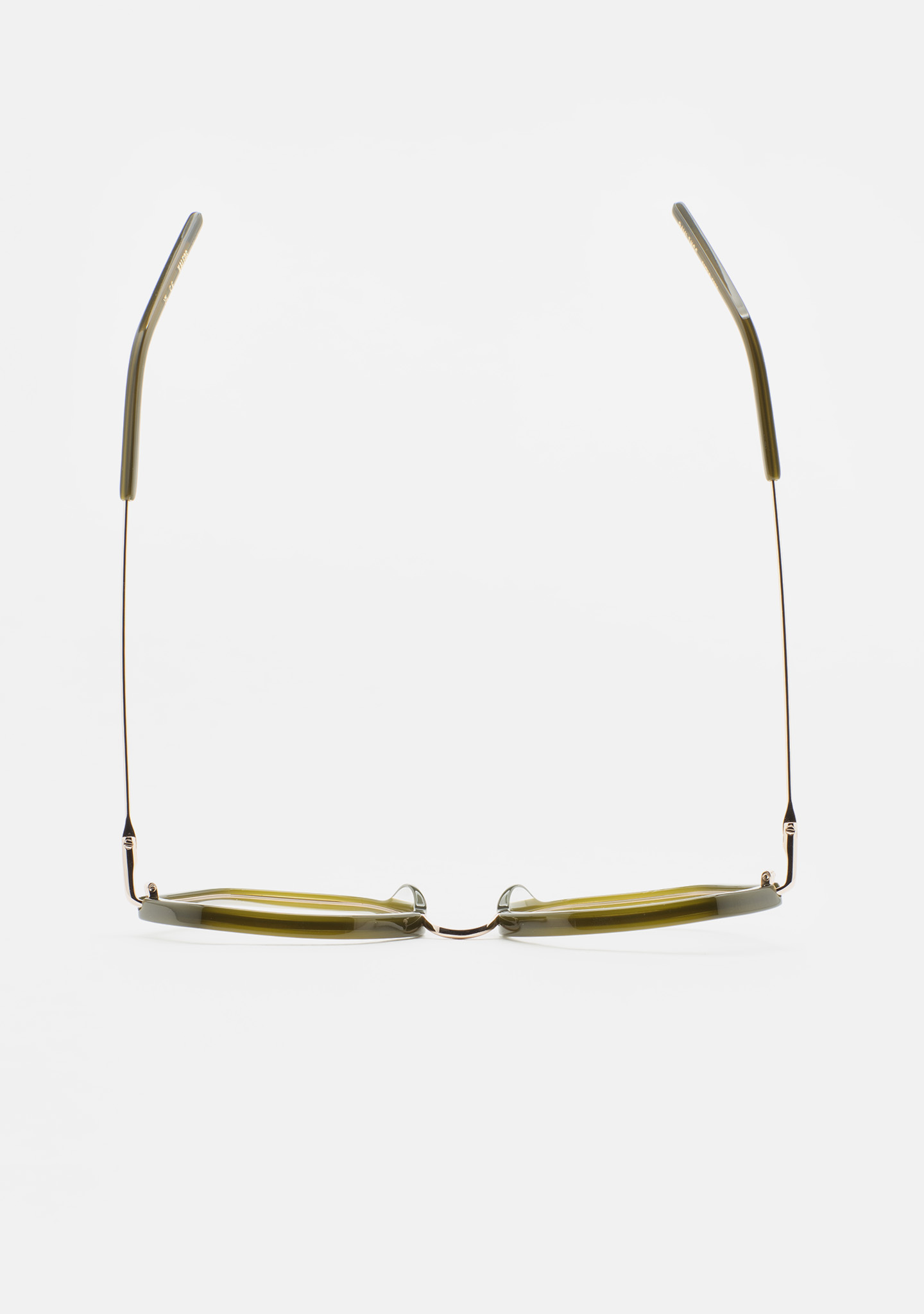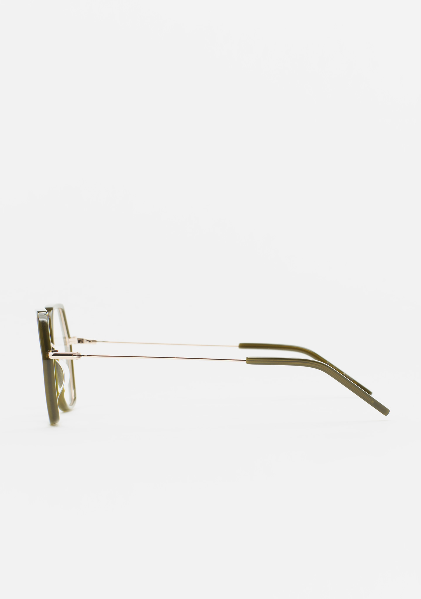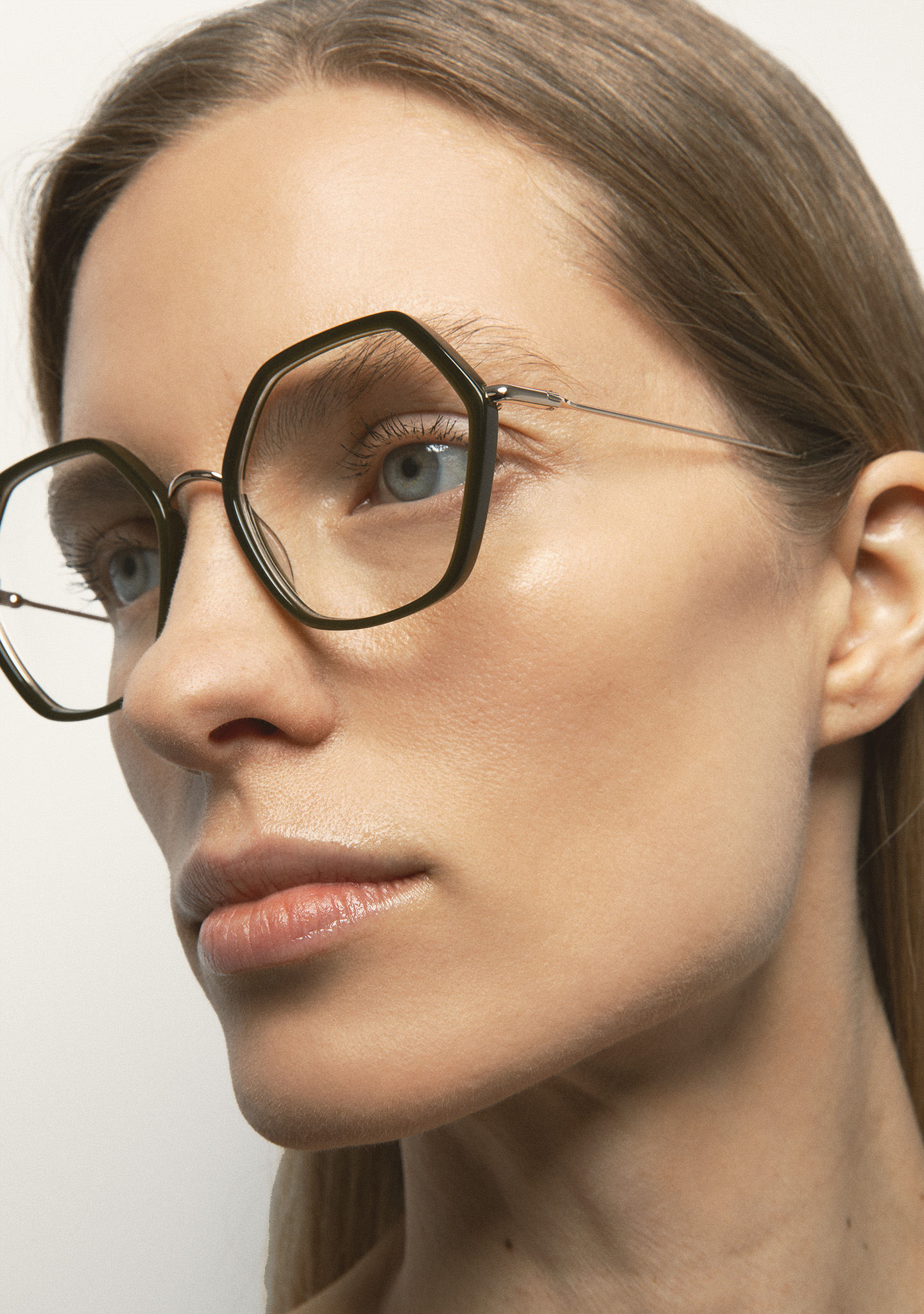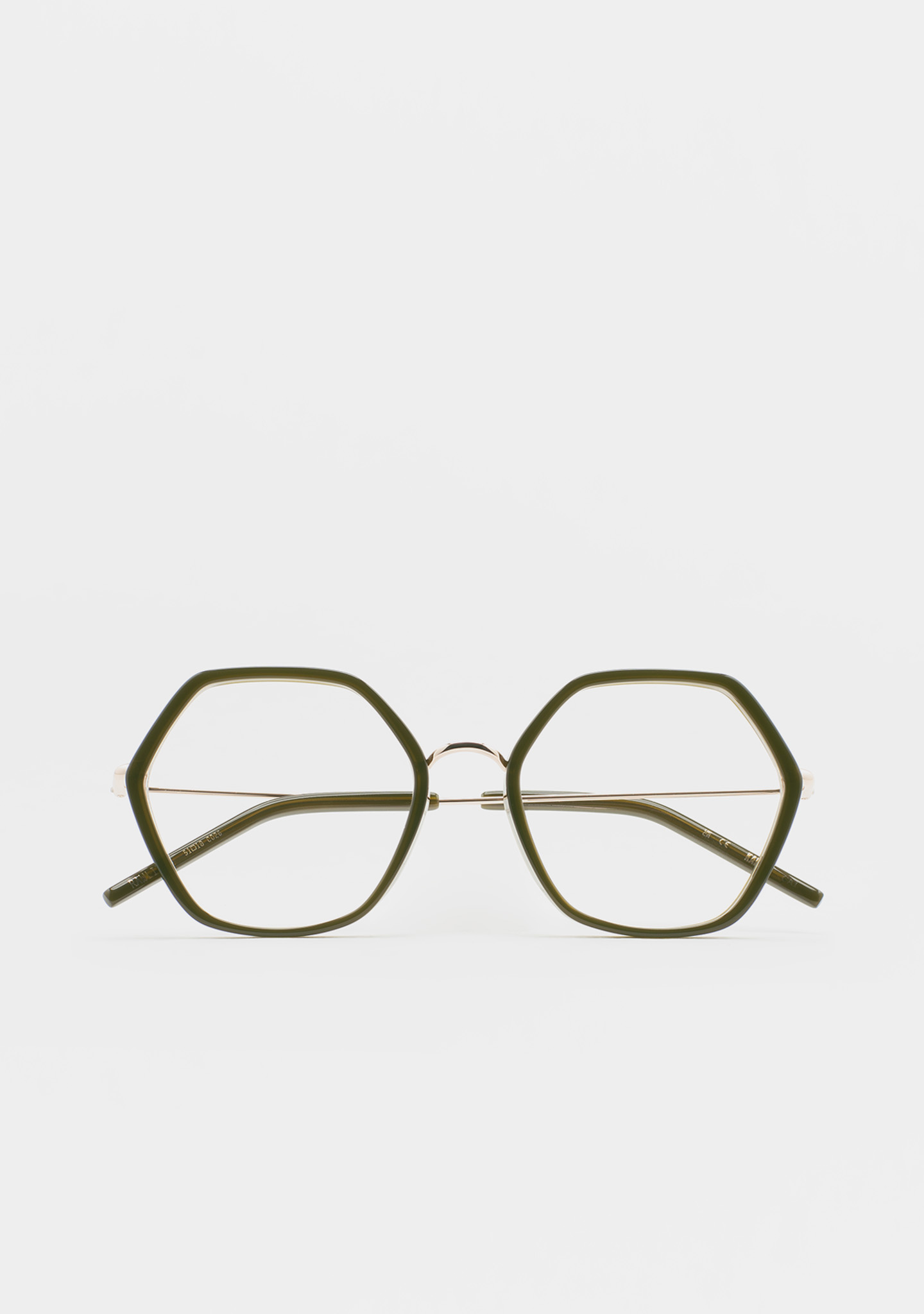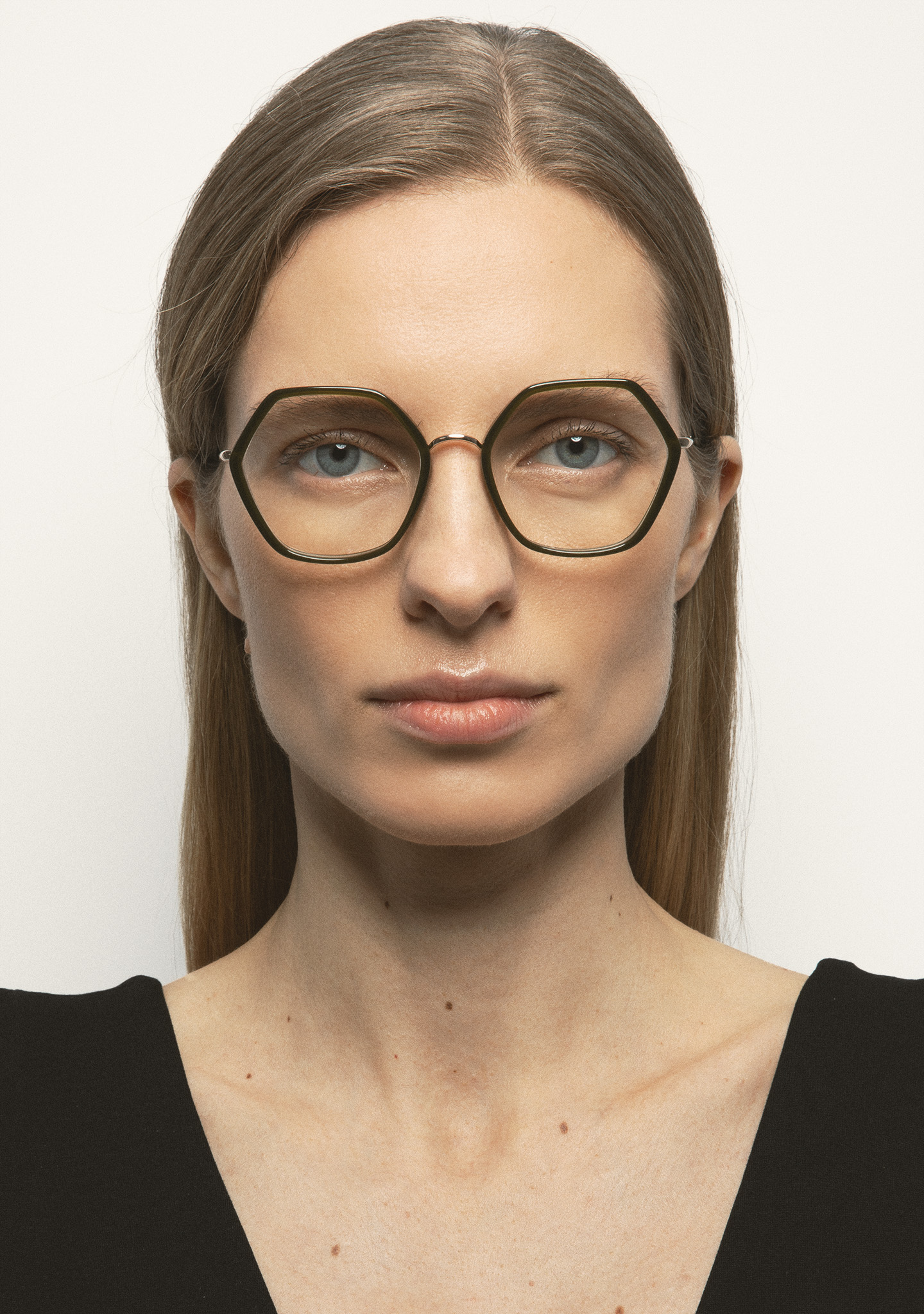 Lunettes de vue de forme hexagonale. Un design pensé dans chaque angle. Face en acétate vert translucide. Structure et pont en acier inoxydable doré. Branches en acier inoxydable avec manchons en acétate vert translucide. Plaquettes en acétate intégrées. Fabriquées à la main.