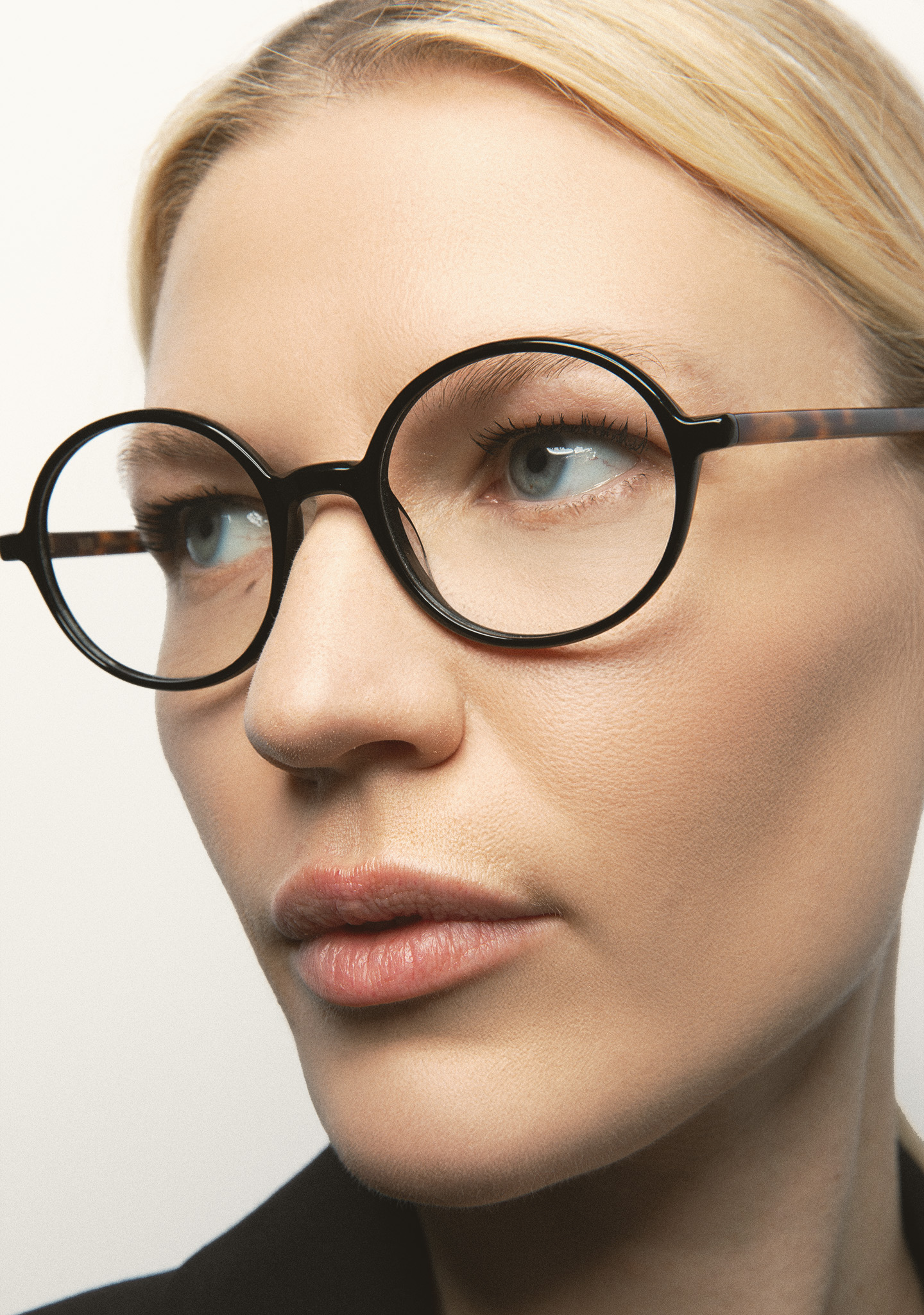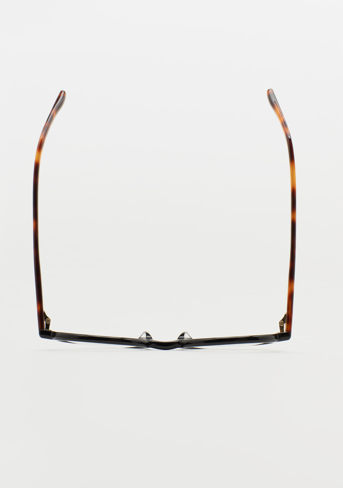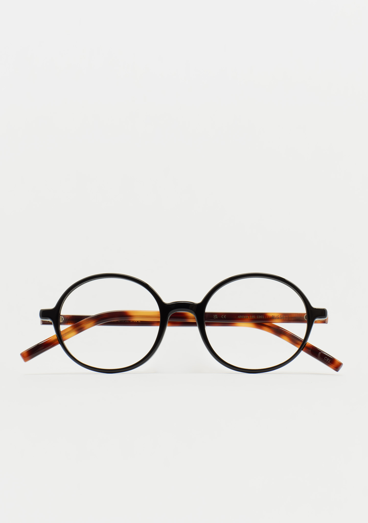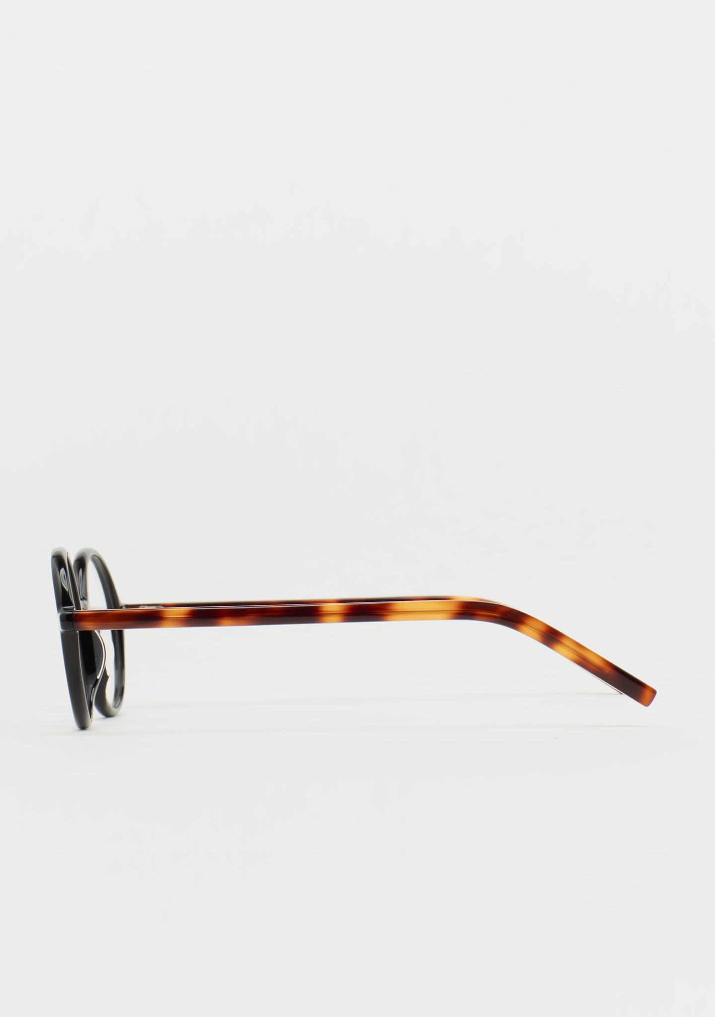 Lunettes de vue rondes. Précision dans chaque courbe. Face avant en acétate haute densité noir. Branches en acétate haute densité havane marron. Plaquettes de nez en acétate intégrées. Fabriquées à la main.