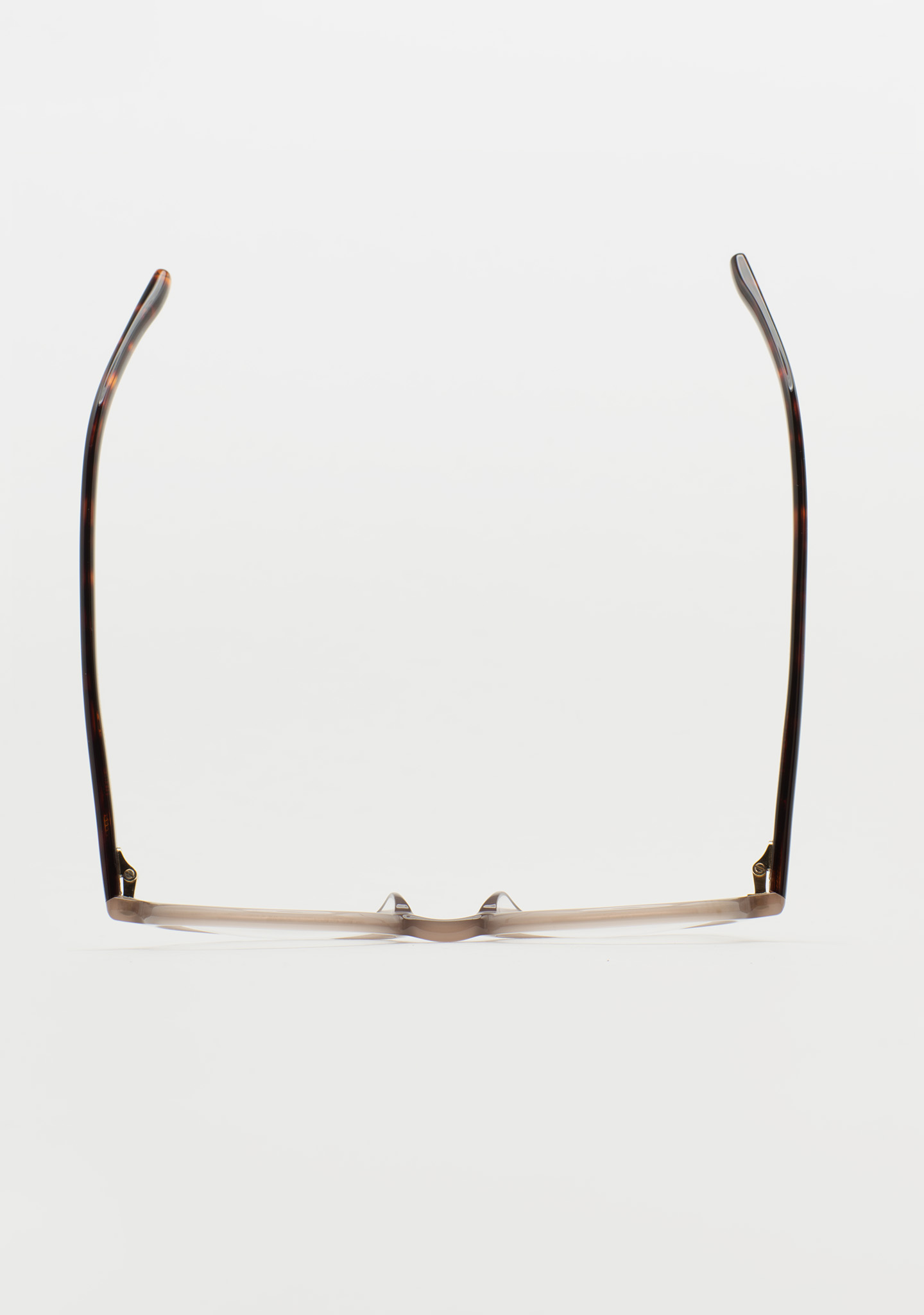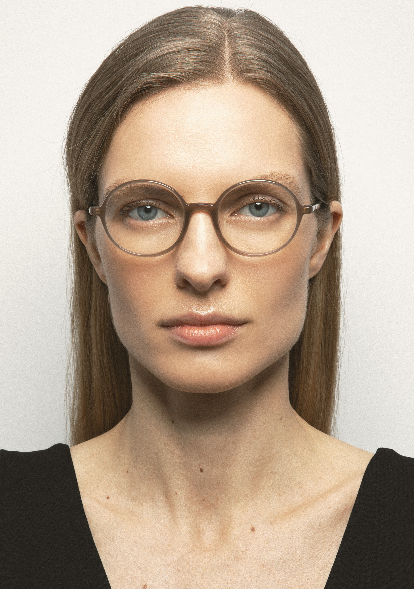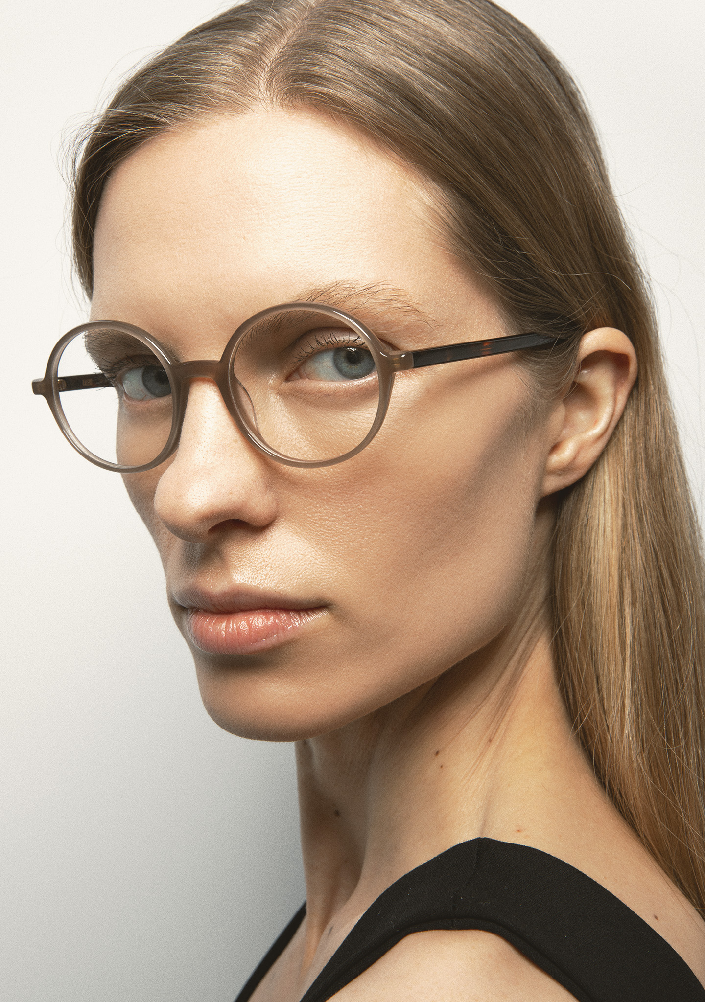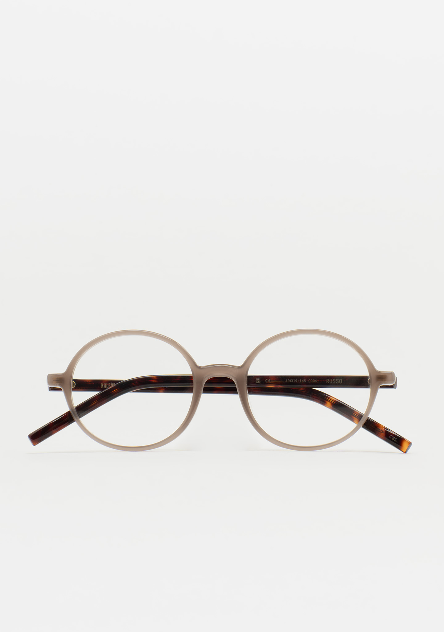 Lunettes de vue rondes. Précision dans chaque courbe. Face avant en acétate haute densité marron transparent. Branches en acétate haute densité havane marron foncé. Plaquettes de nez en acétate intégrées. Fabriquées à la main.