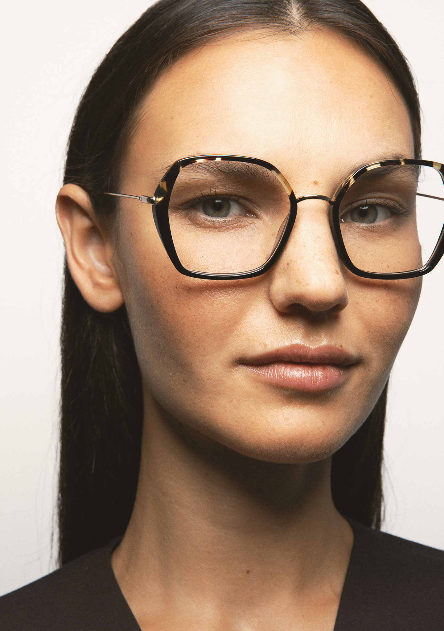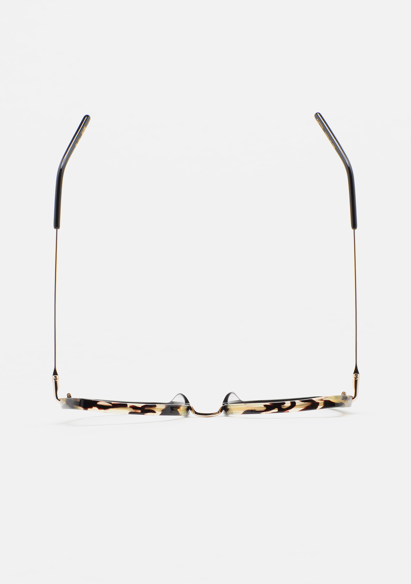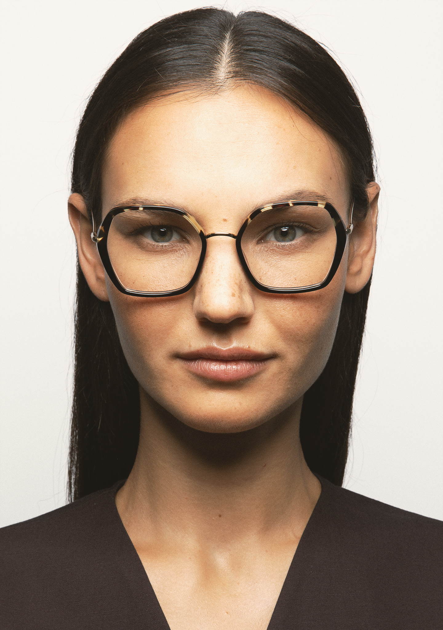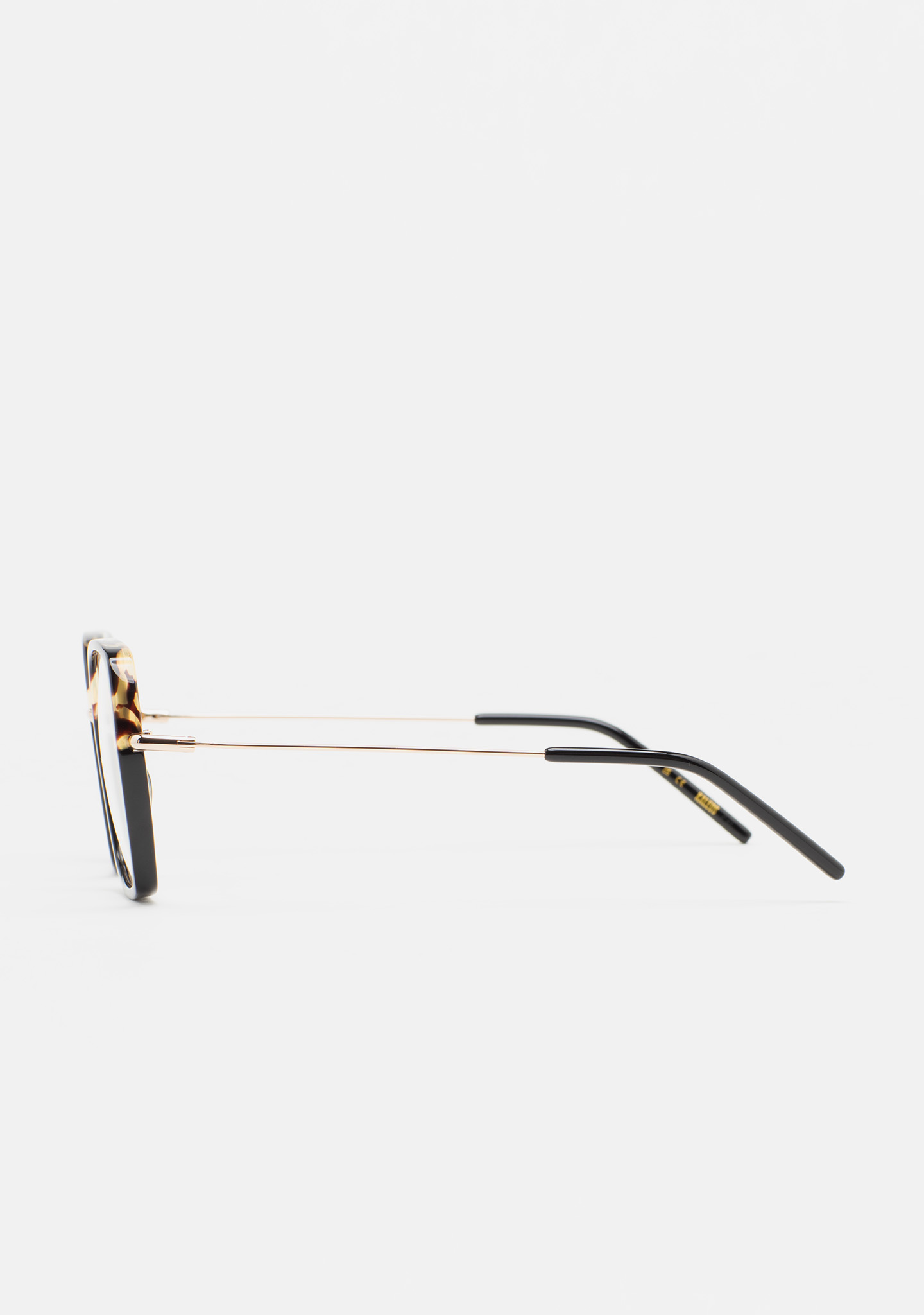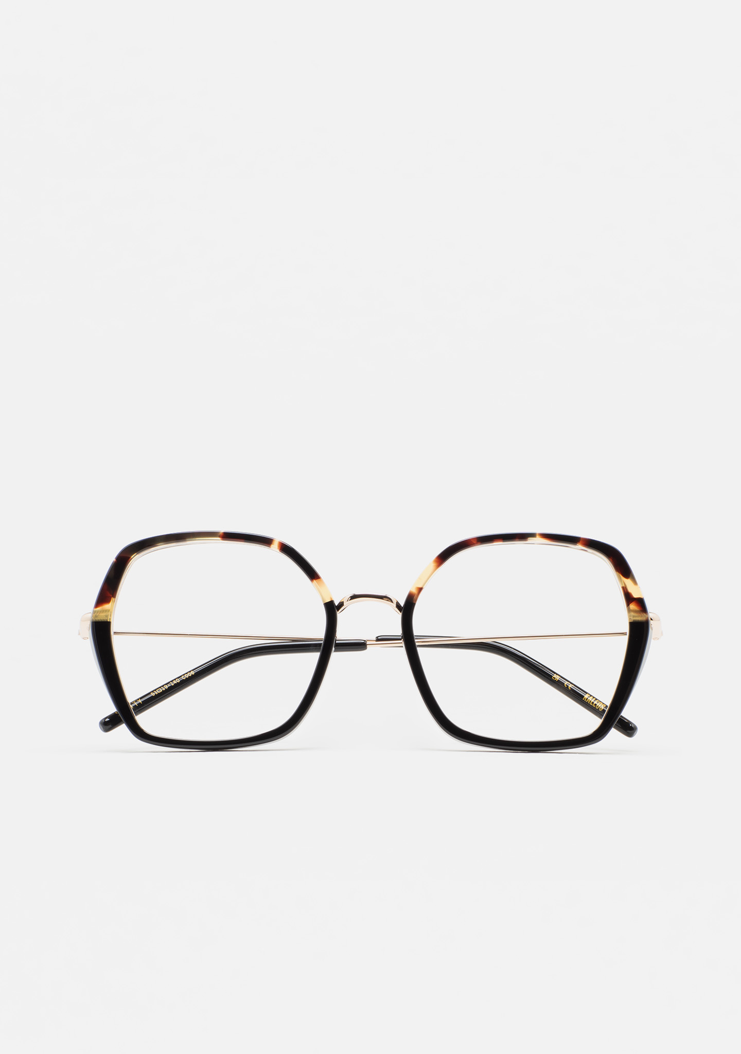 Lunettes de vue de forme hexagonale. Structure et pont en acier inoxydable doré. Monture avant en acétate havane marron vintage avec laminé noir. Branches en acier inoxydable doré avec embouts en acétate noir. Plaquettes en acétate intégrées. Fait main.