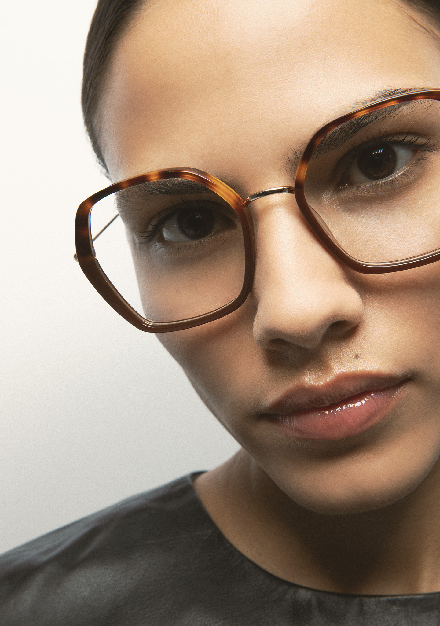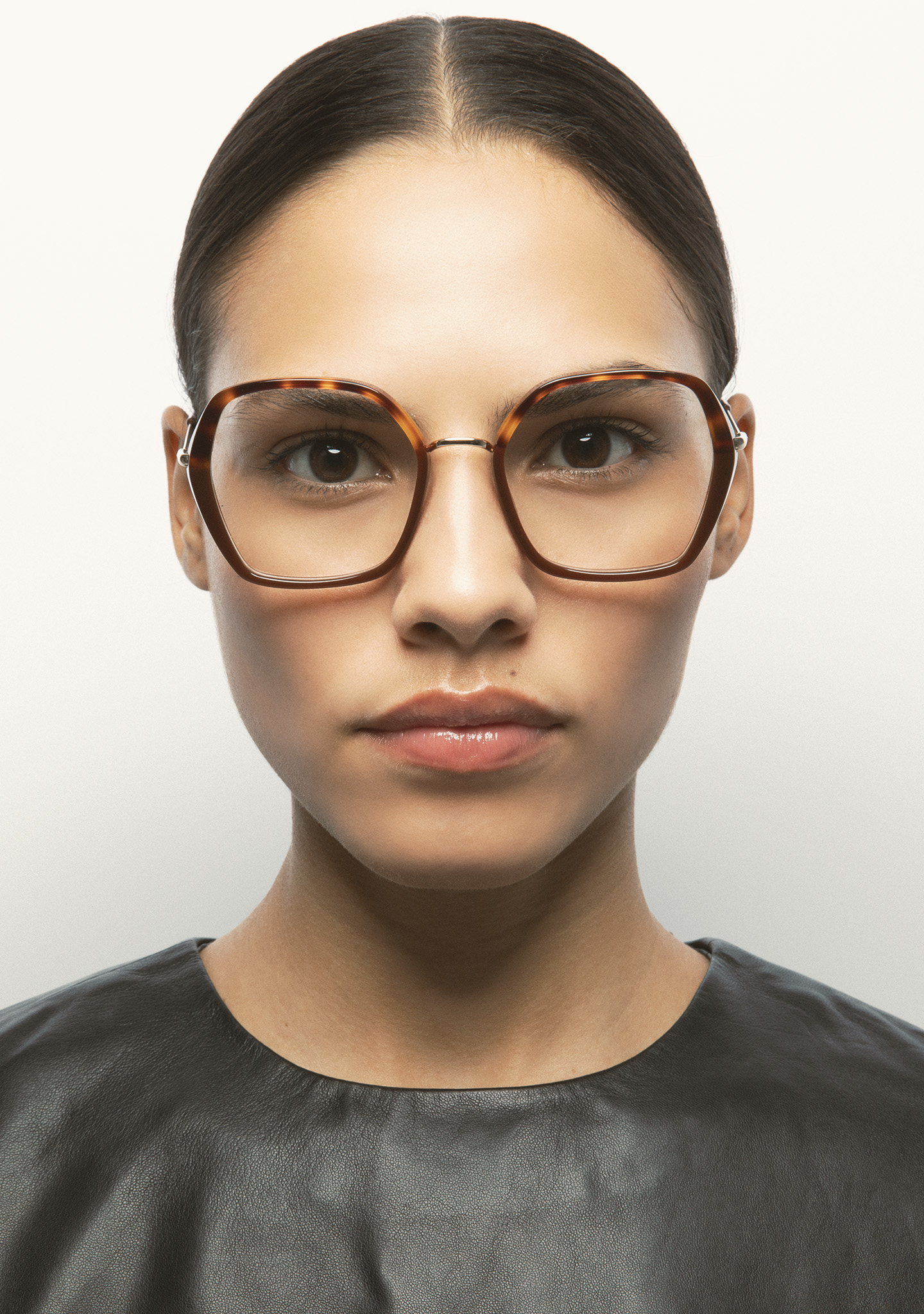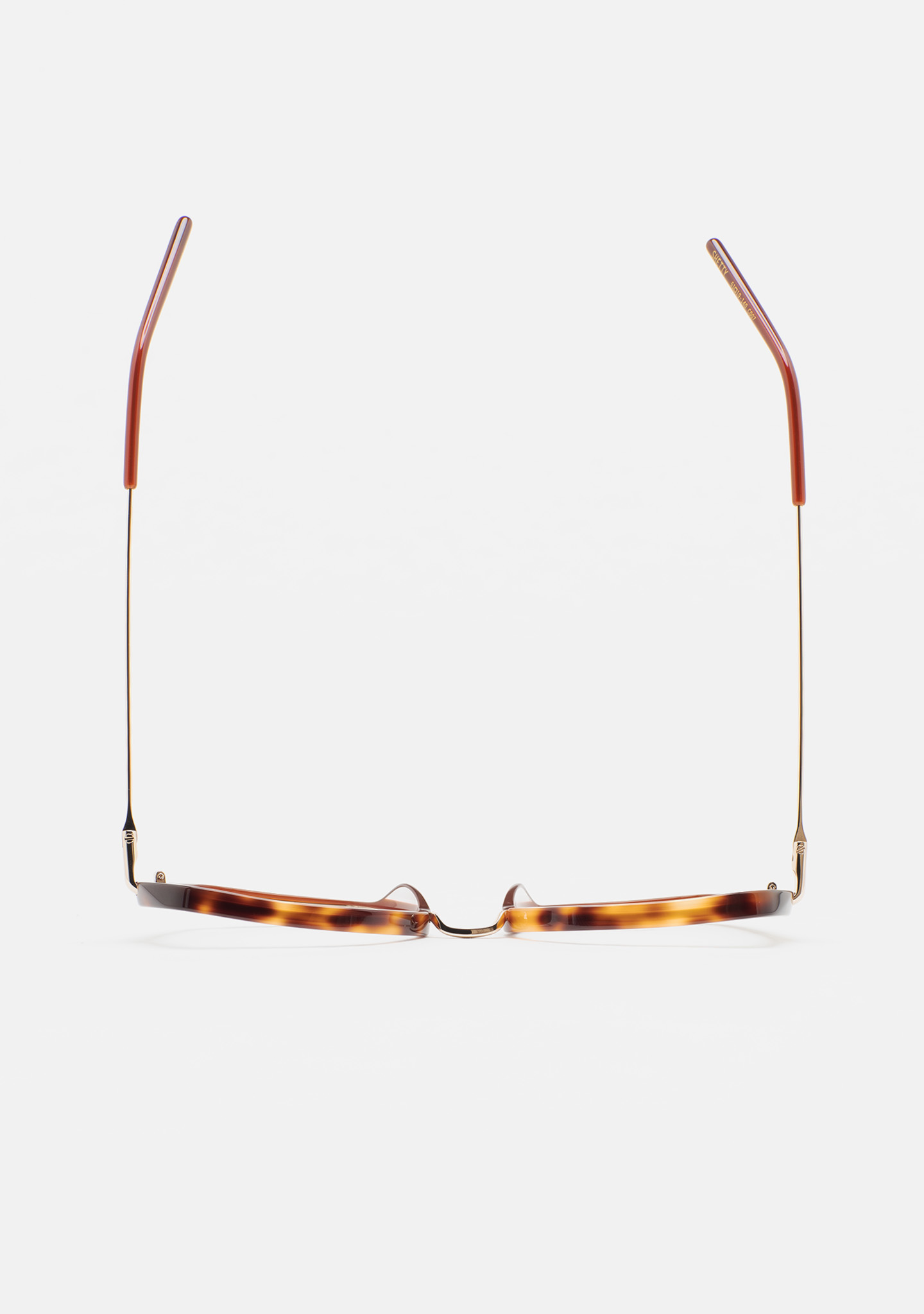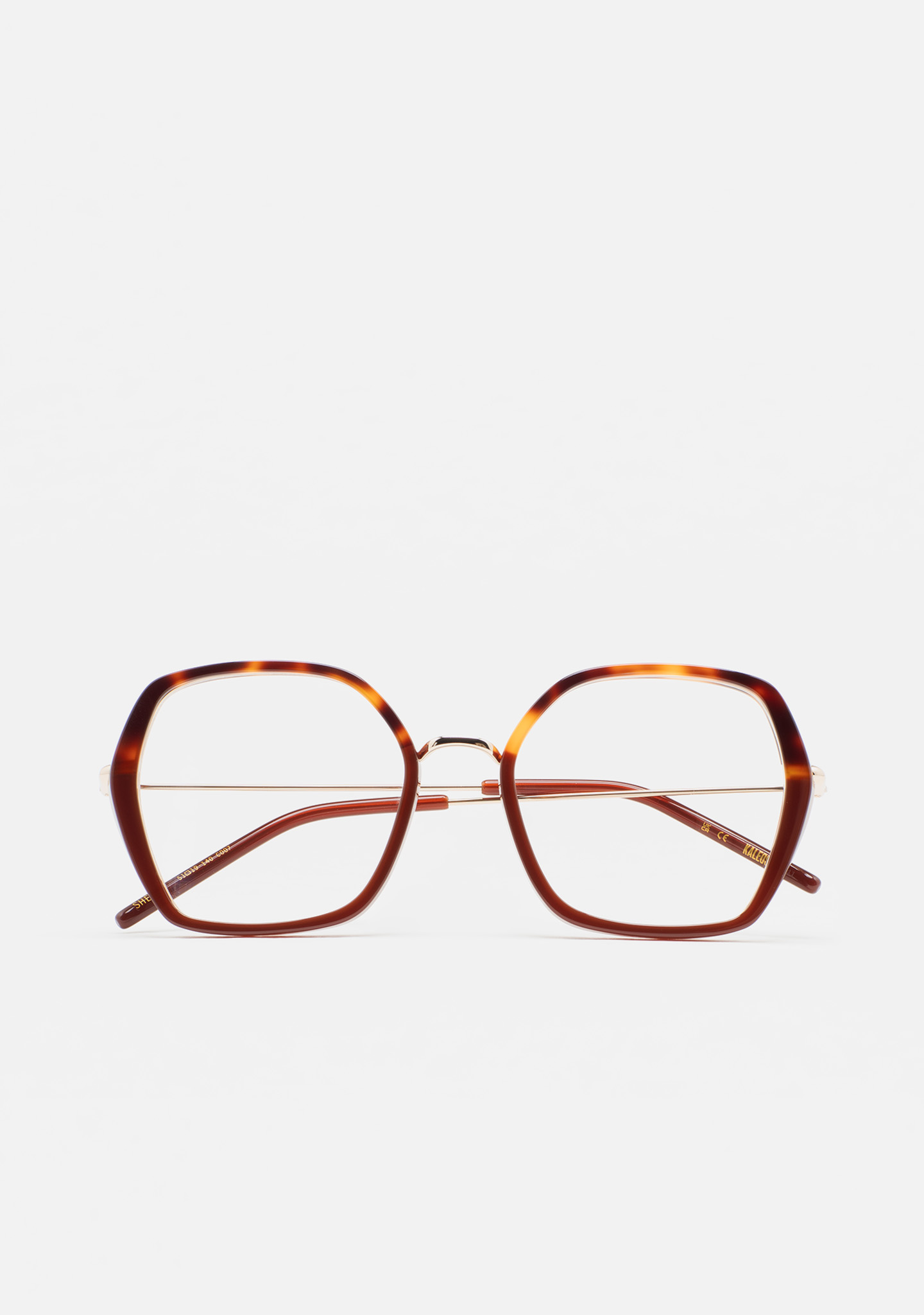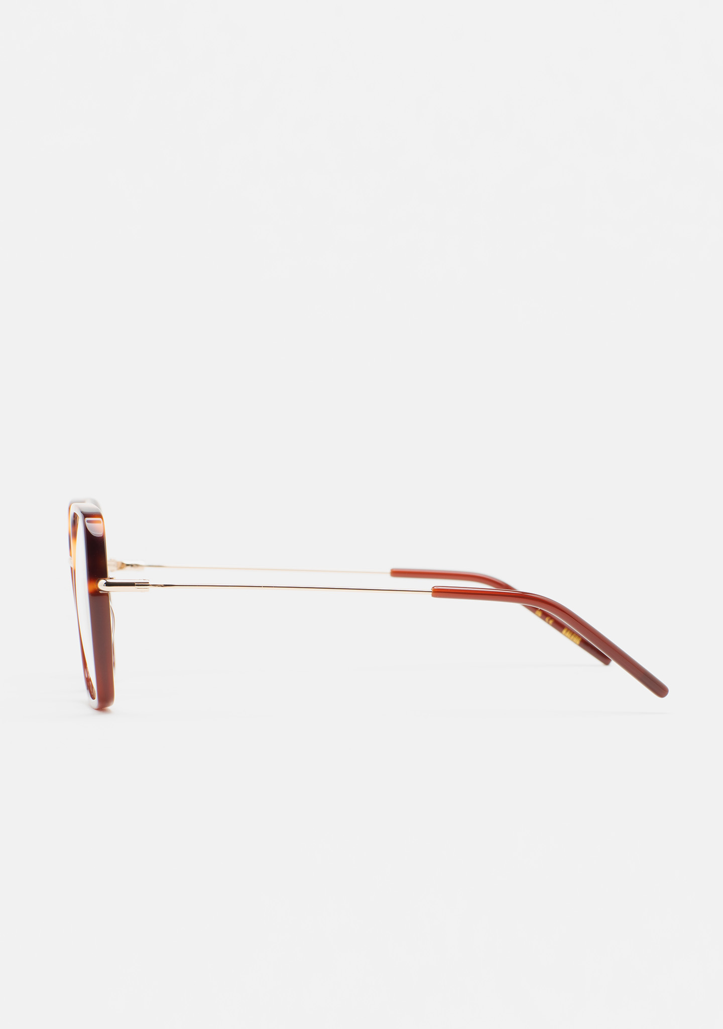 Lunettes de vue de forme hexagonale. Structure et pont en acier inoxydable doré. Monture avant en acétate havane marron avec laminé marron translucide. Branches en acier inoxydable doré avec embouts en acétate marron translucide. Plaquettes en acétate intégrées. Fait main.