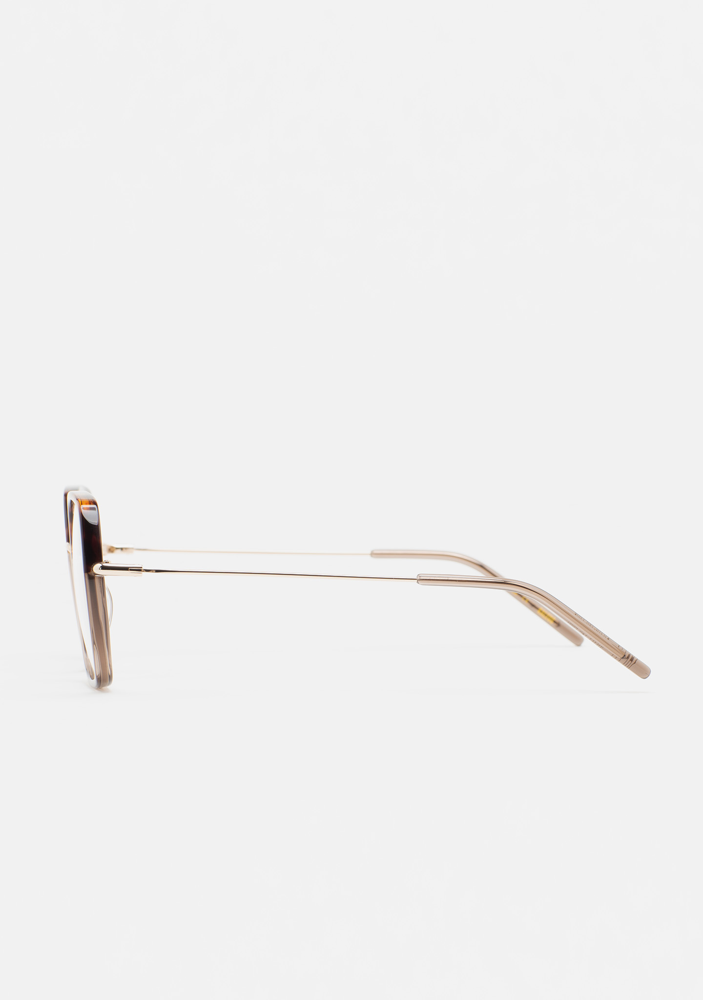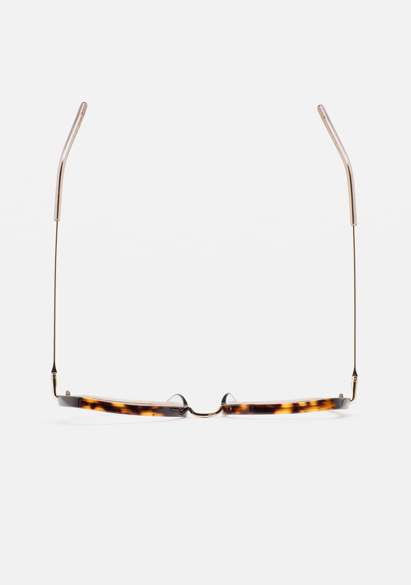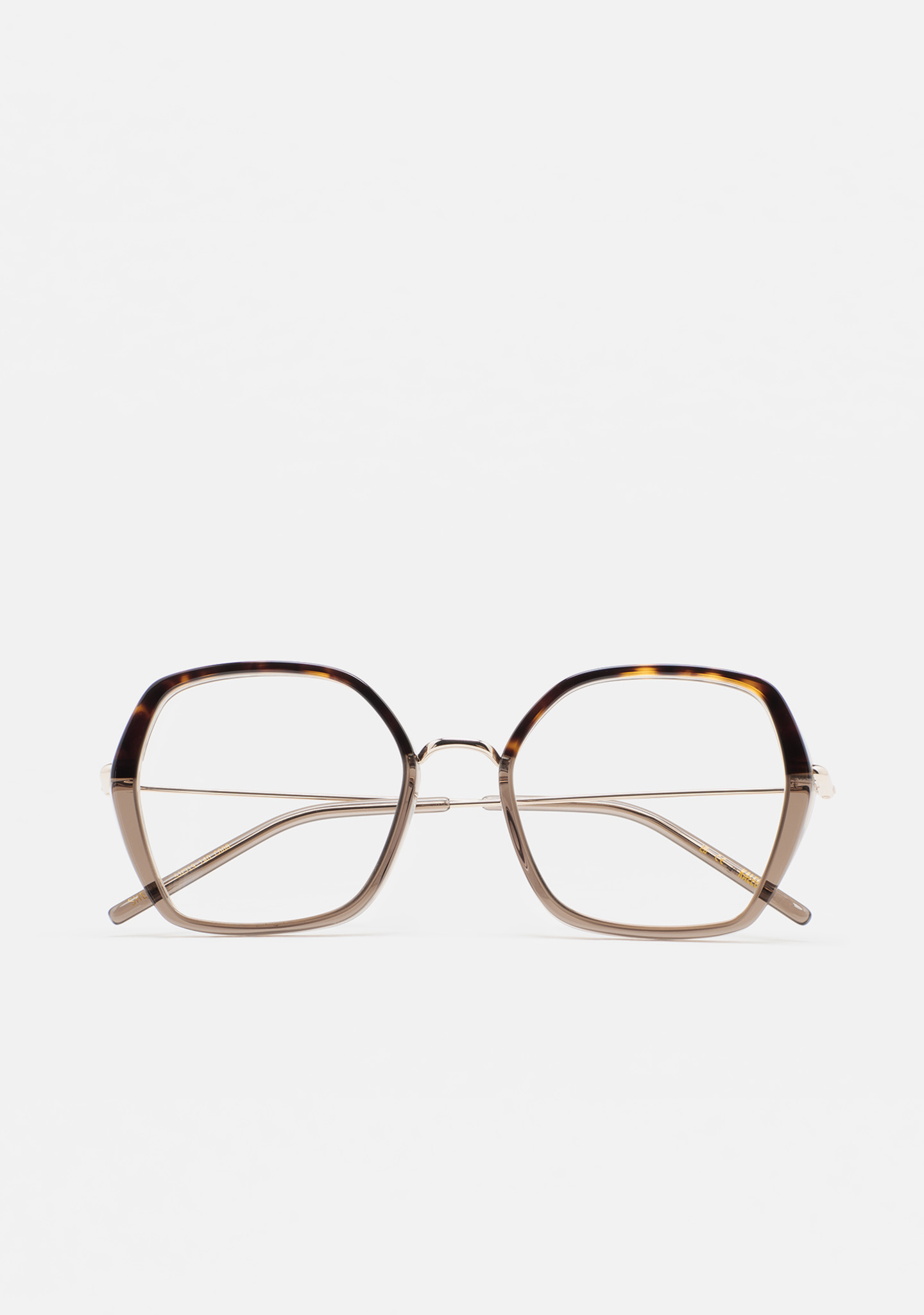 Lunettes de vue de forme hexagonale. Structure et pont en acier inoxydable doré. Monture avant en acétate havane marron foncé avec laminé marron transparent. Branches en acier inoxydable doré avec embouts en acétate marron transparent. Plaquettes en acétate intégrées. Fait main.
