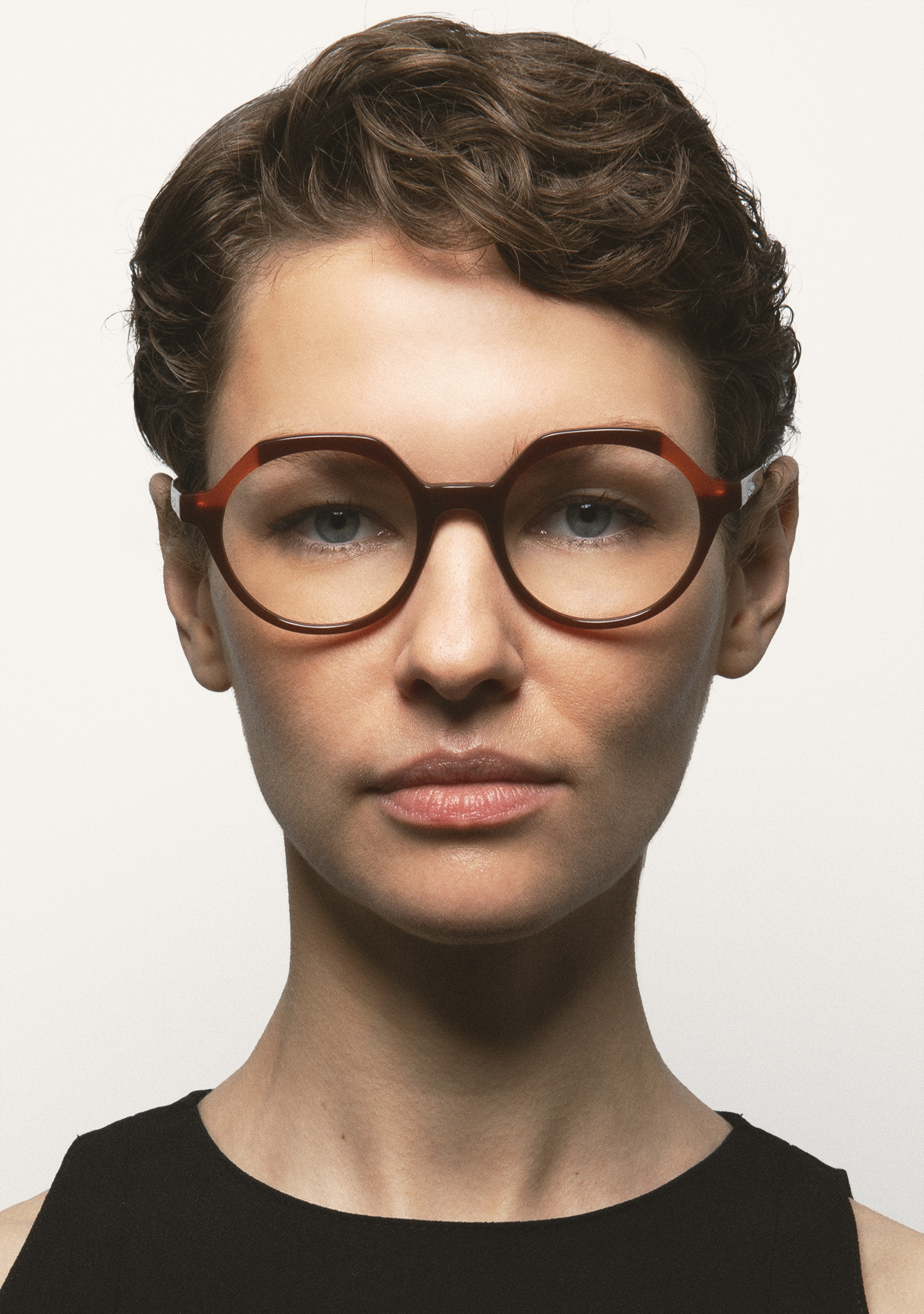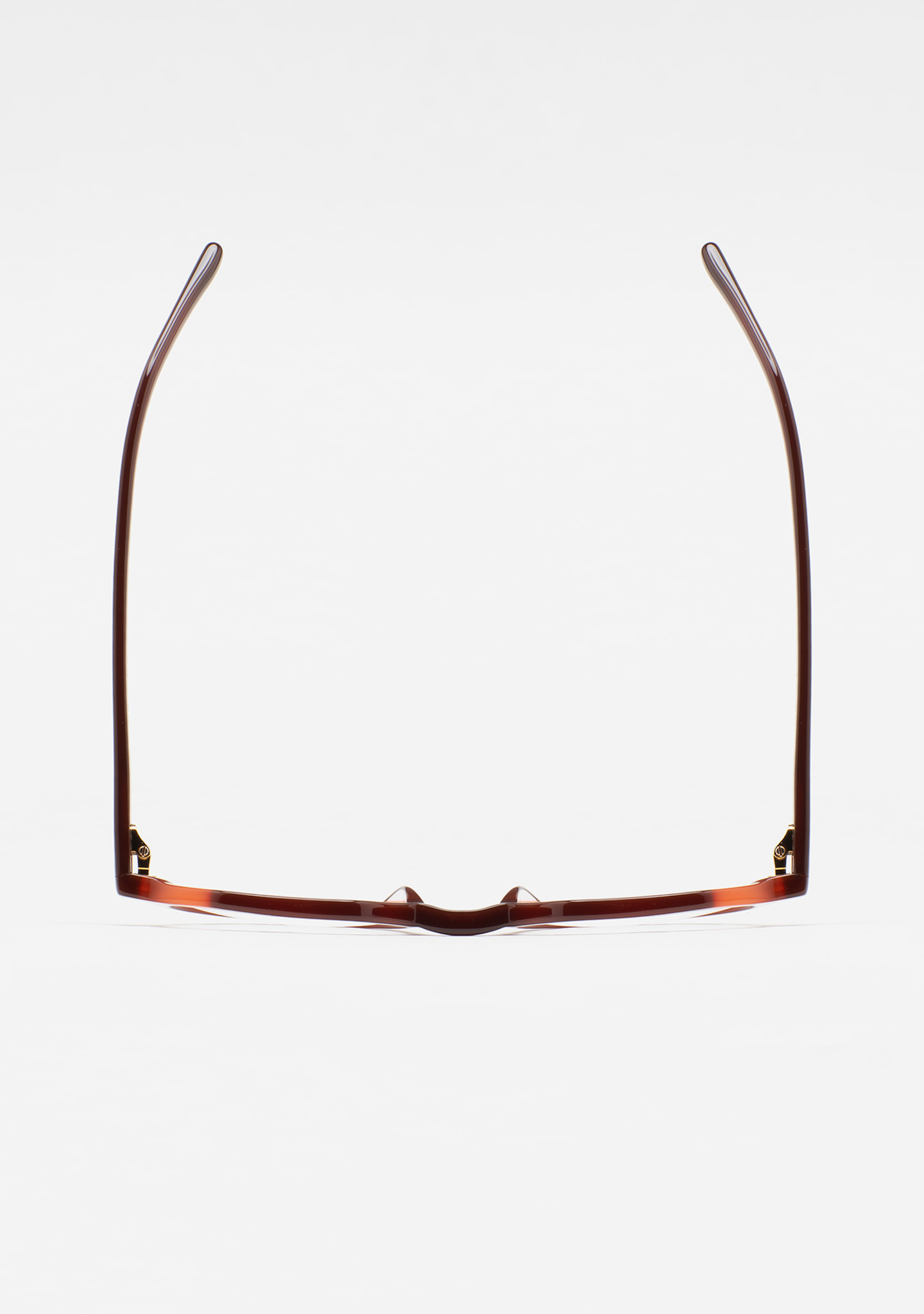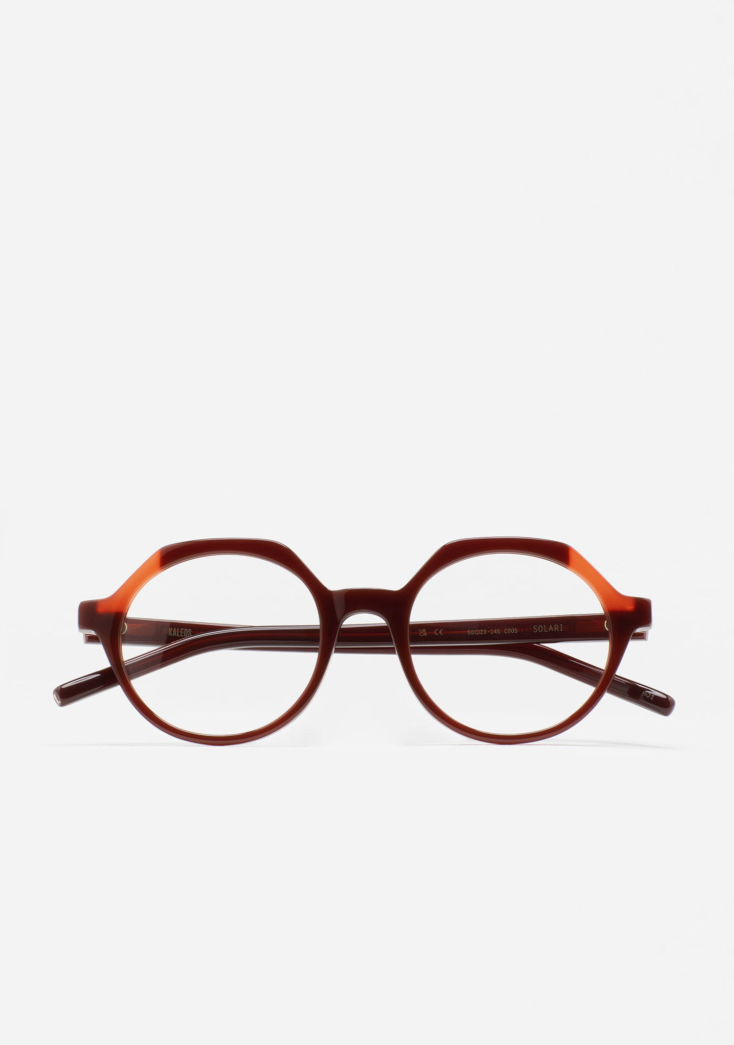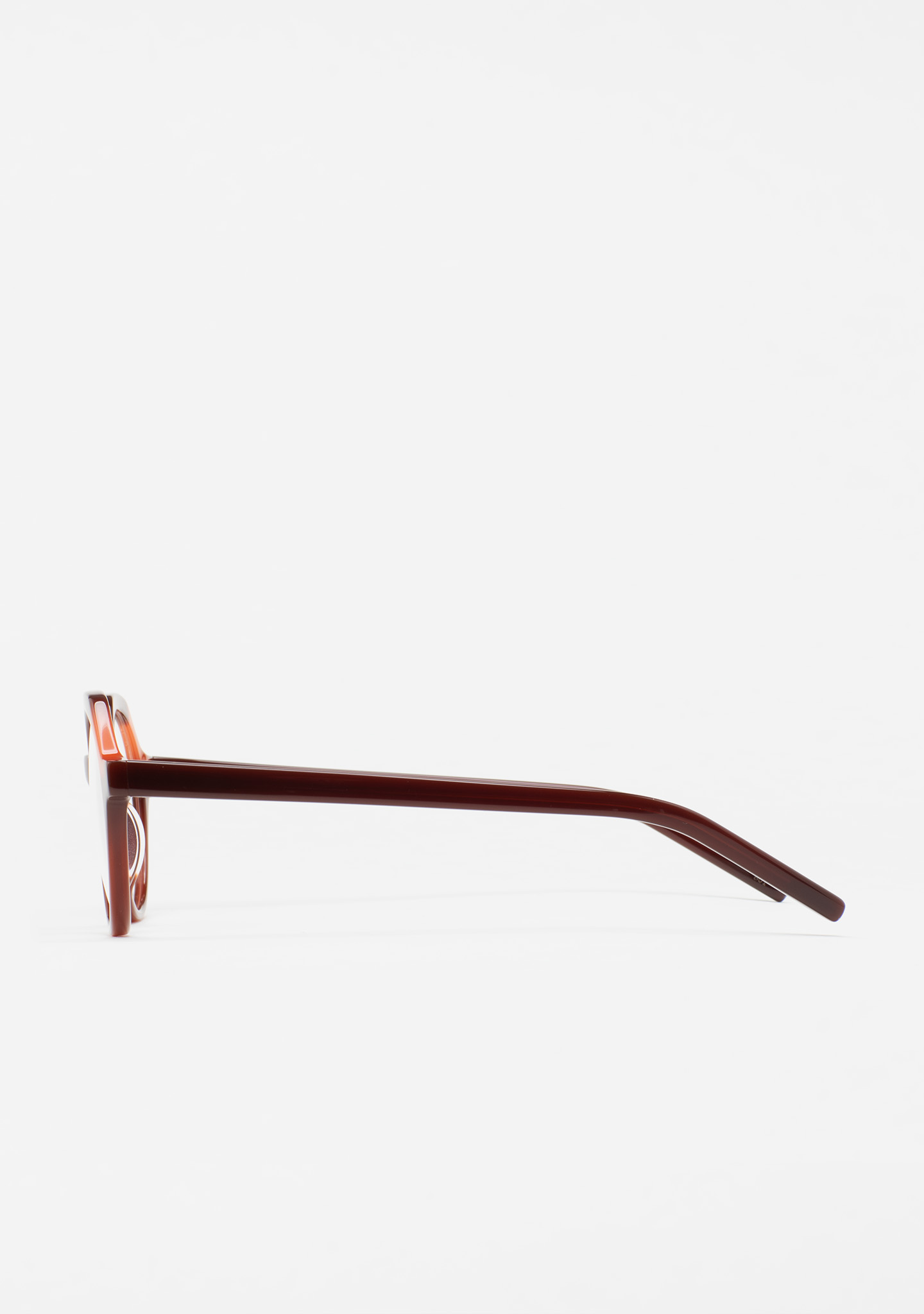 Lunettes de vue de forme ronde avec ceinture plate. Frontal en acétate marron translucide avec laminé orange translucide. Branches en acétate marron translucide. Plaquettes en acétate intégrées. Fait main.