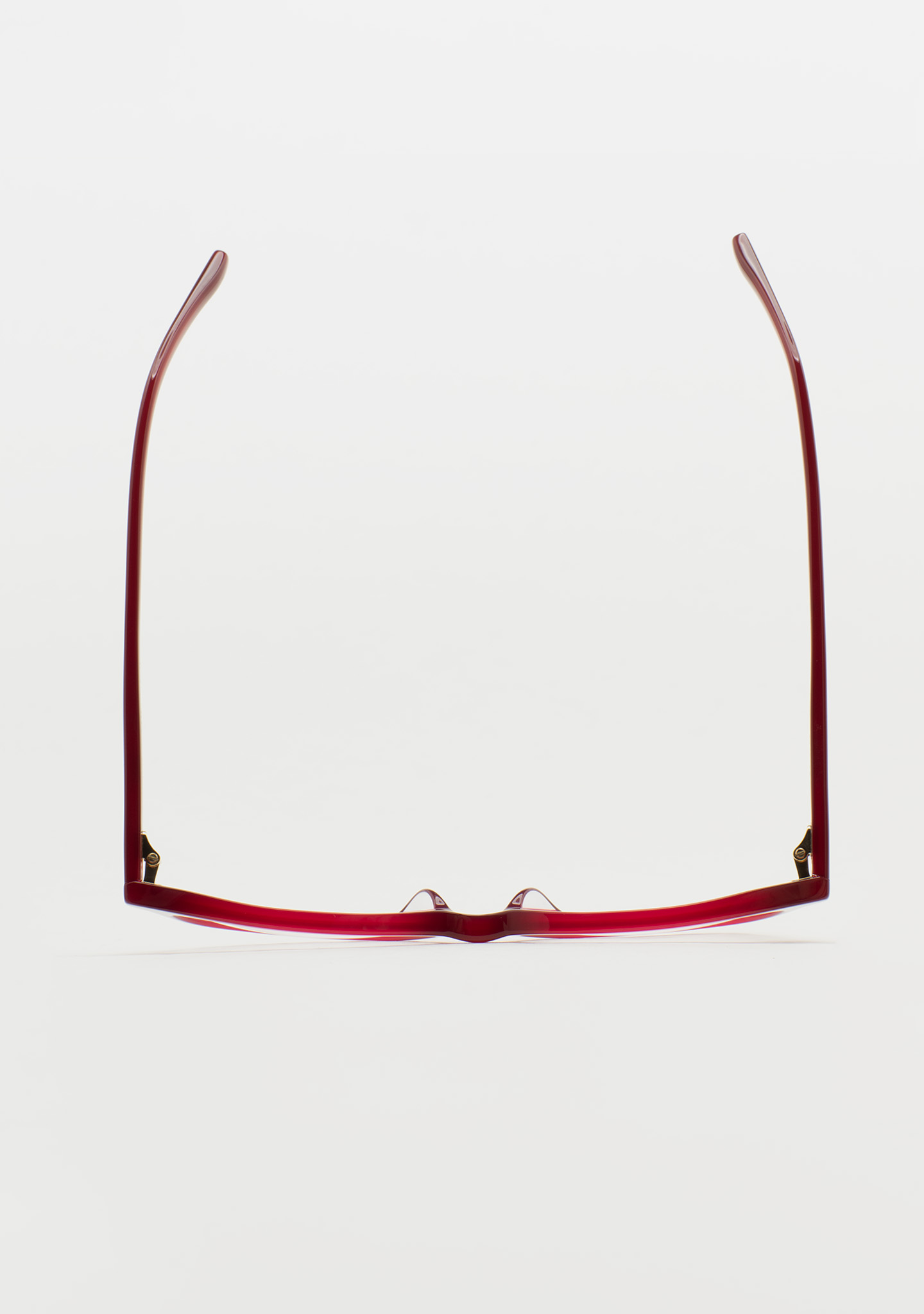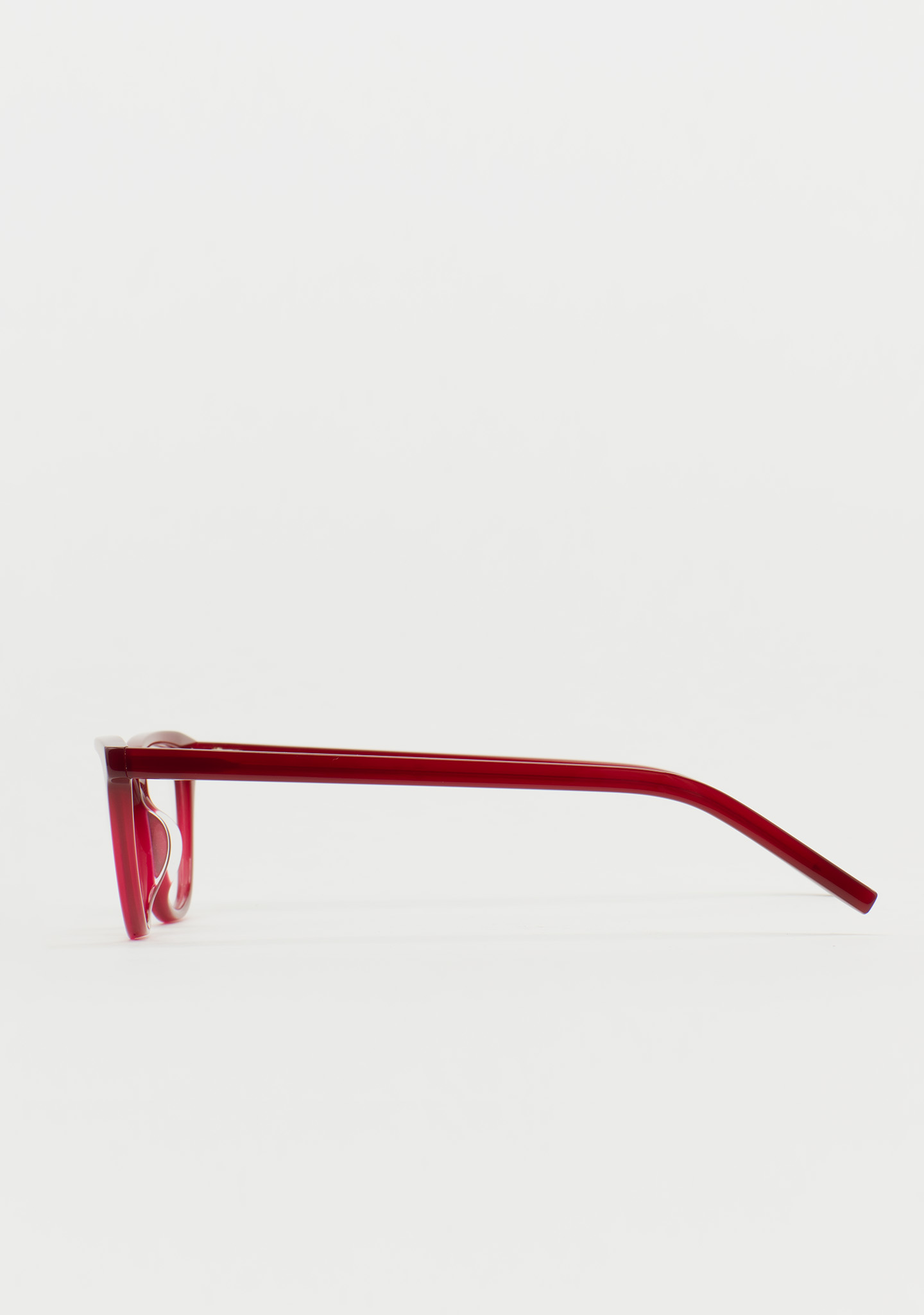 Lunettes de vue de forme Sil-de-chat. Une élégance qui se ressent, sans s imposer. Face et branches en acétate rouge transparent. Plaquettes en acétate intégrées. Fabriquées à la main.