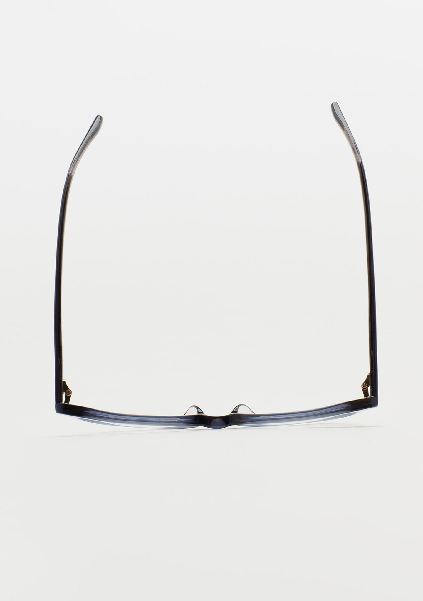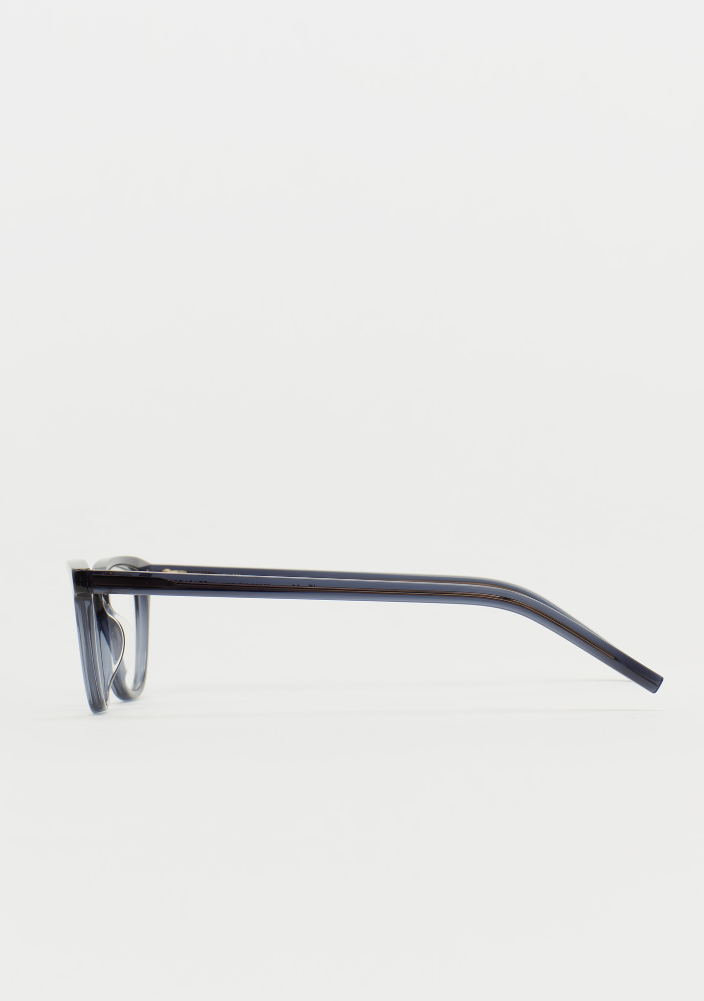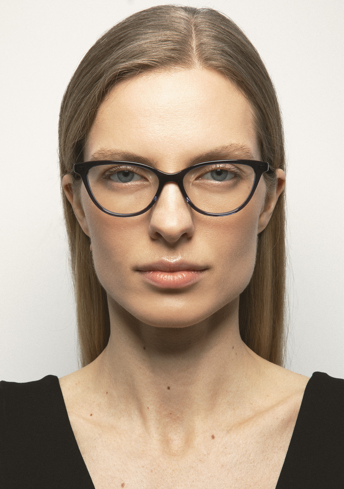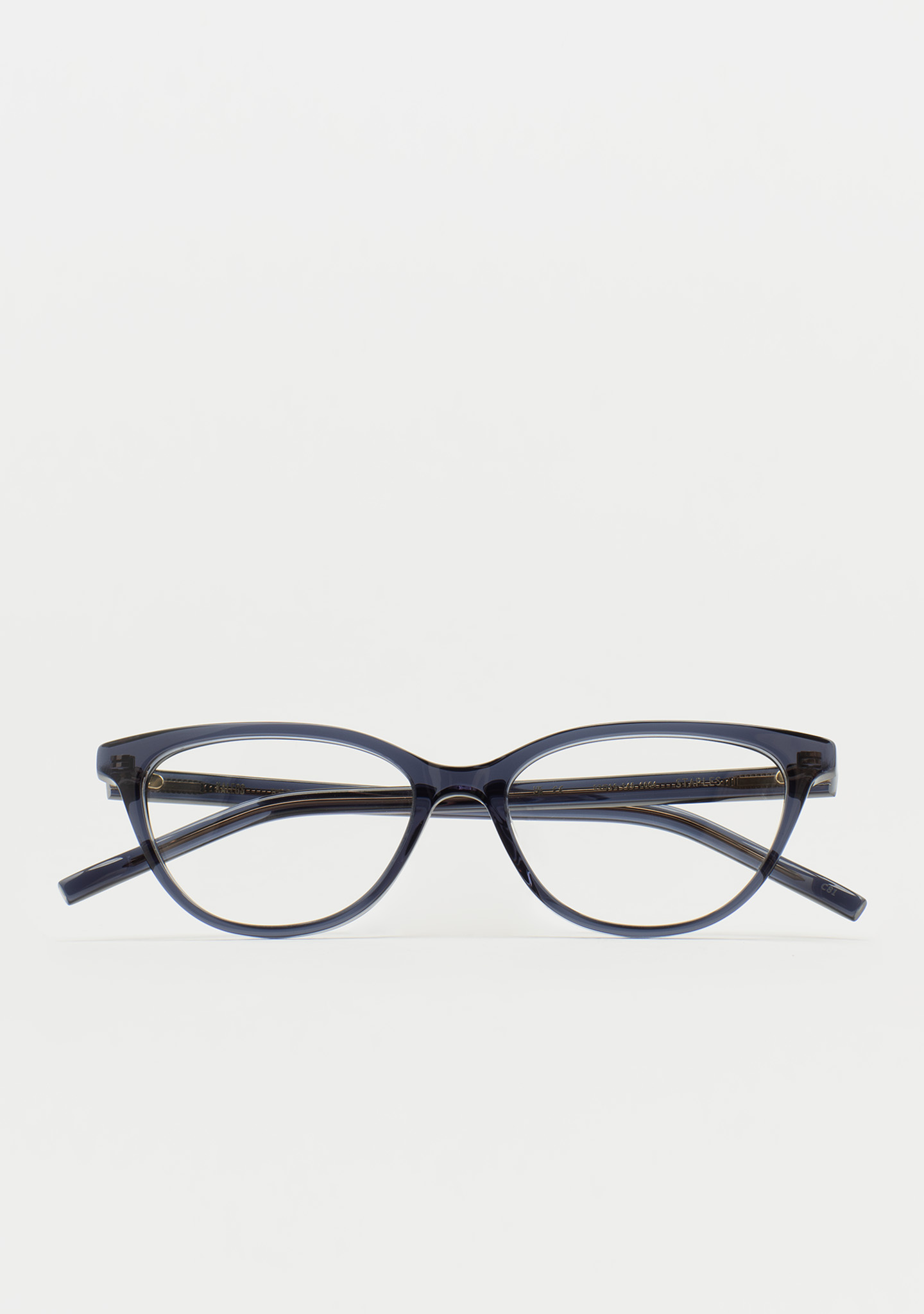 Lunettes de vue de forme Sil-de-chat. Une élégance qui se ressent, sans s imposer. Face et branches en acétate bleu grisâtre transparent. Plaquettes en acétate intégrées. Fabriquées à la main.