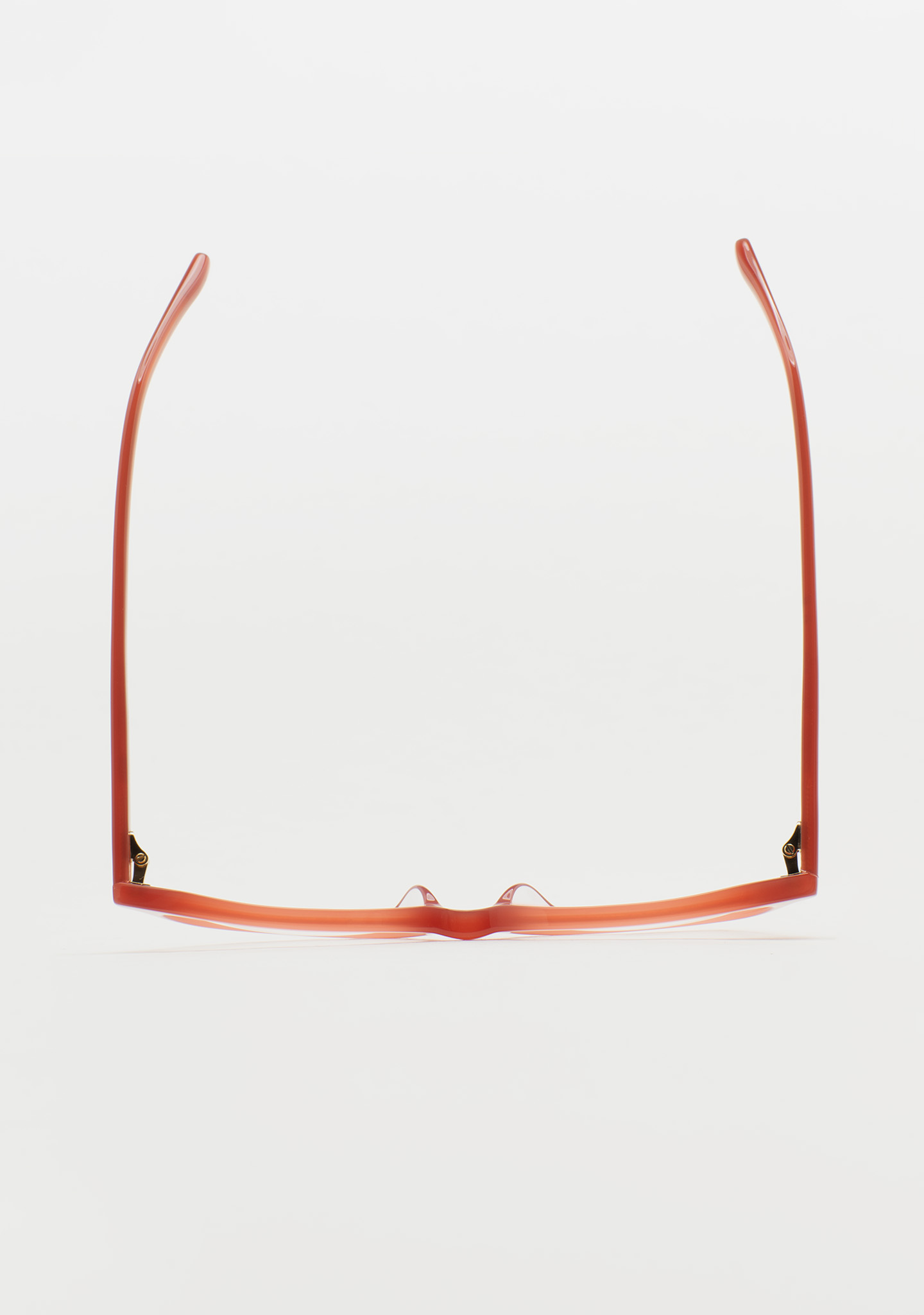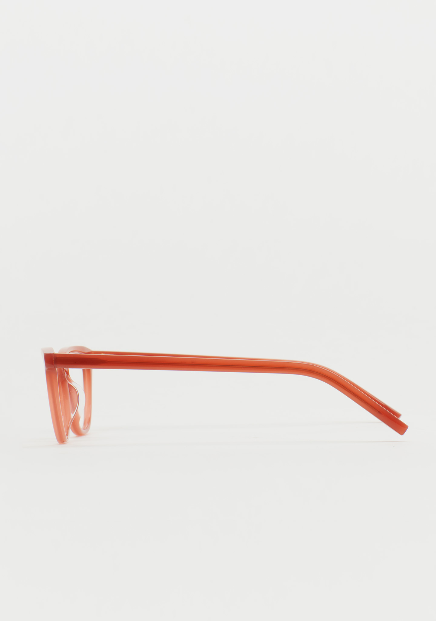 Lunettes de vue de forme Sil-de-chat. Une élégance qui se ressent, sans s imposer. Face et branches en acétate orange translucide. Plaquettes en acétate intégrées. Fabriquées à la main.