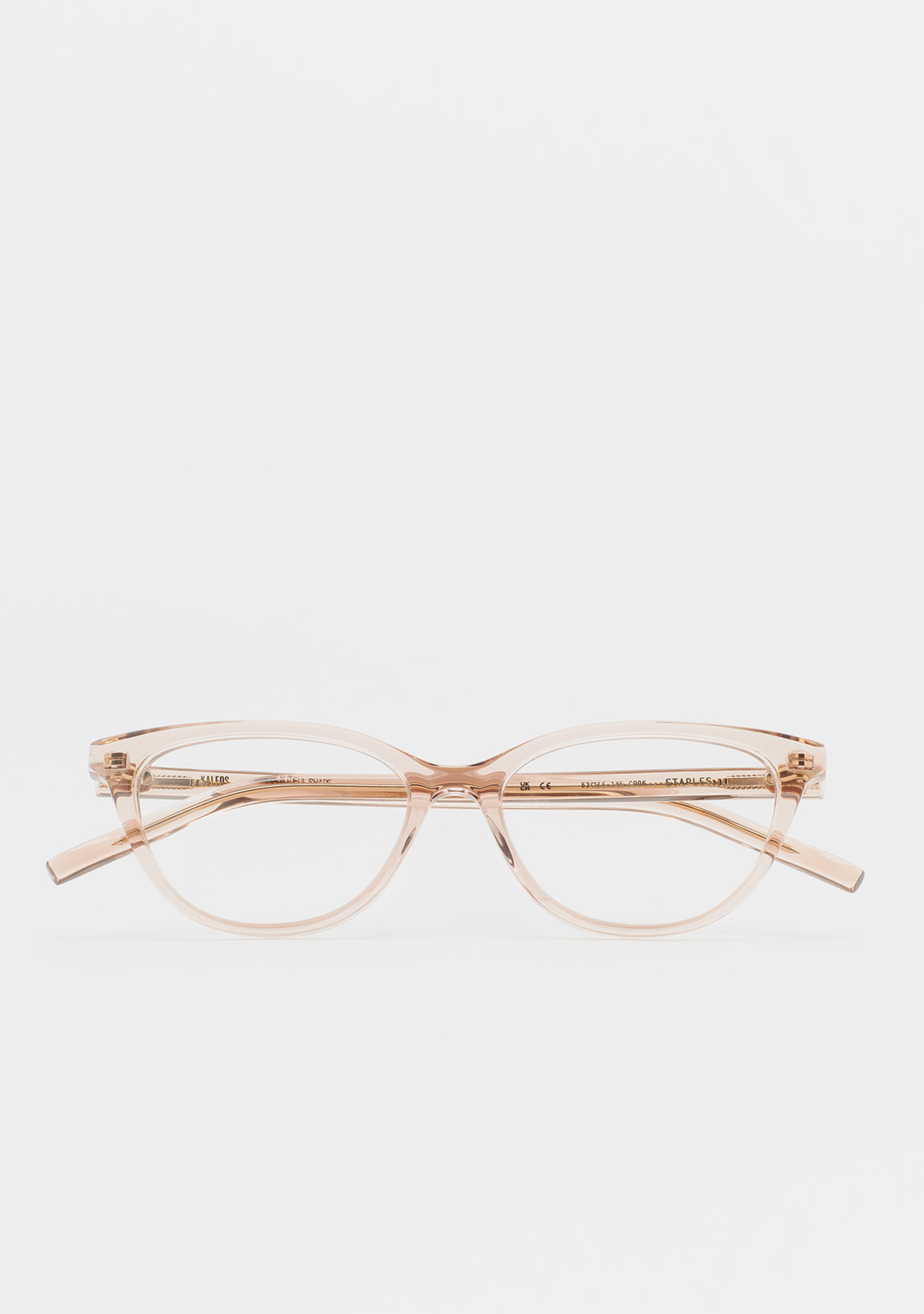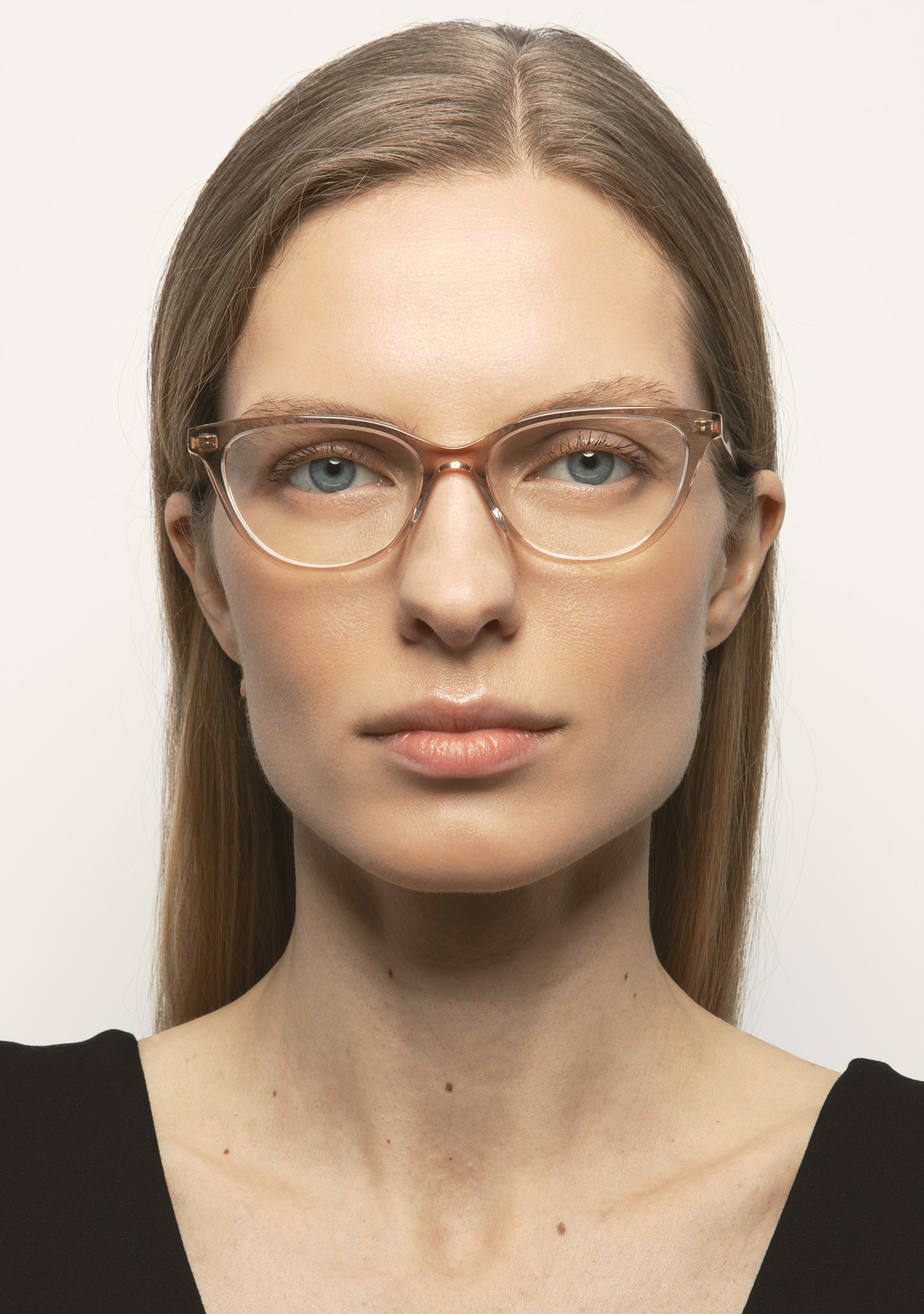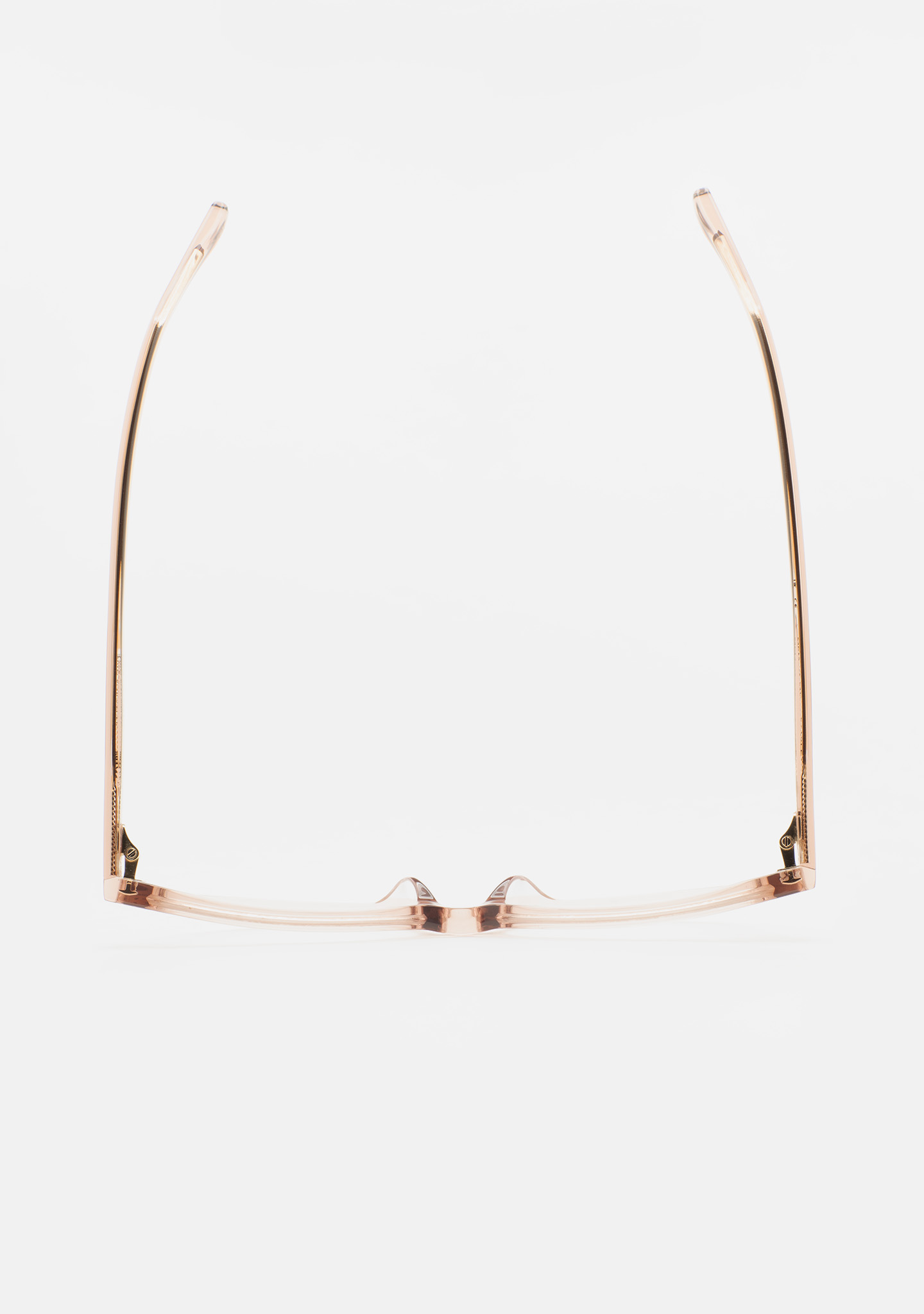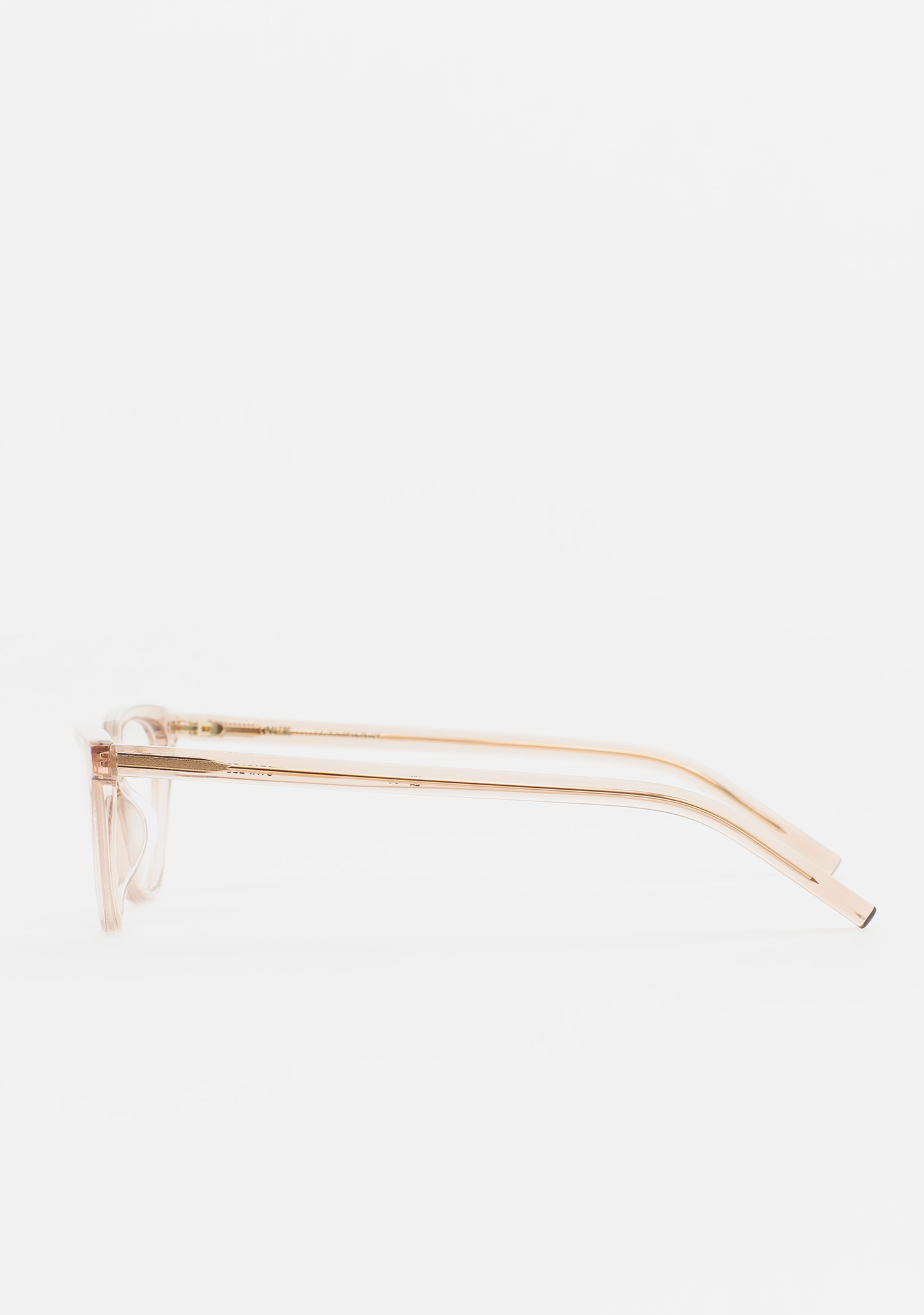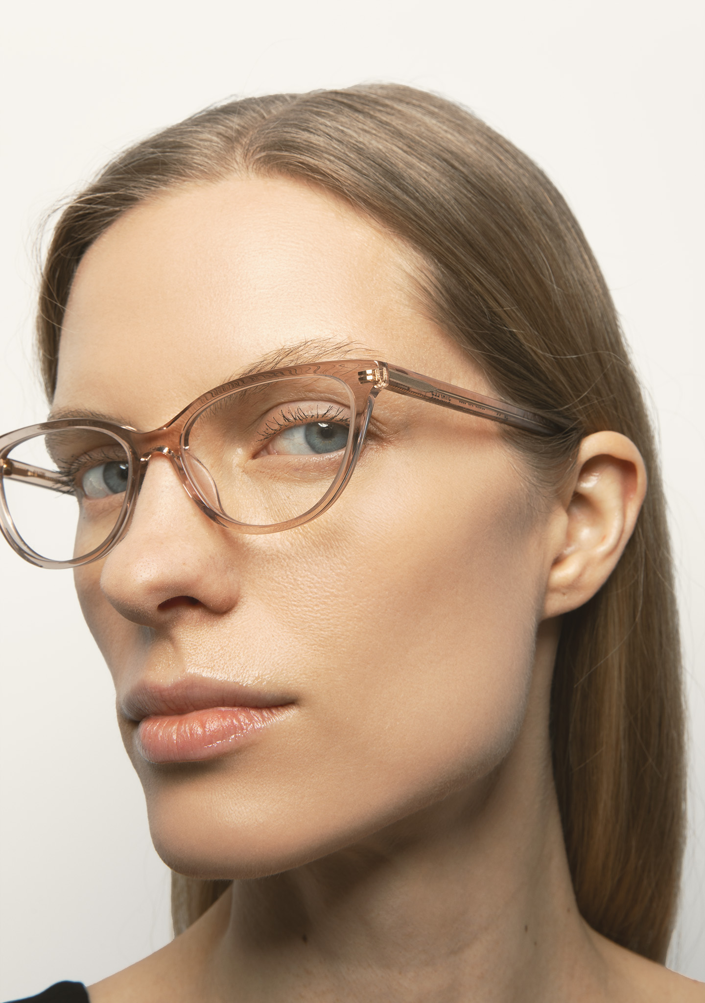 Lunettes de vue de forme cat-eye. Une élégance qui se ressent, sans s’imposer. Face et branches en acétate rose clair transparent. Plaquettes en acétate intégrées. Fabriquées à la main.