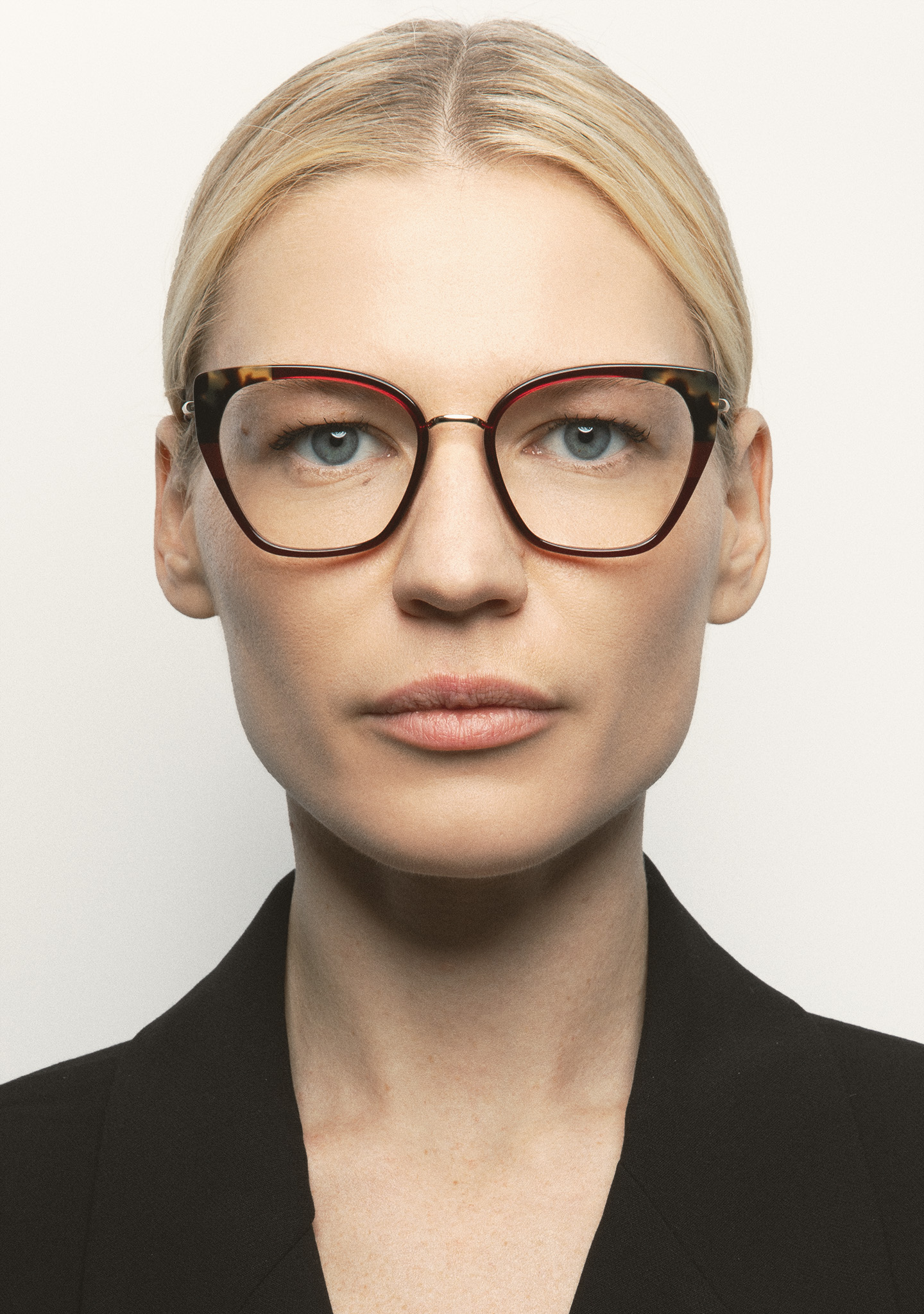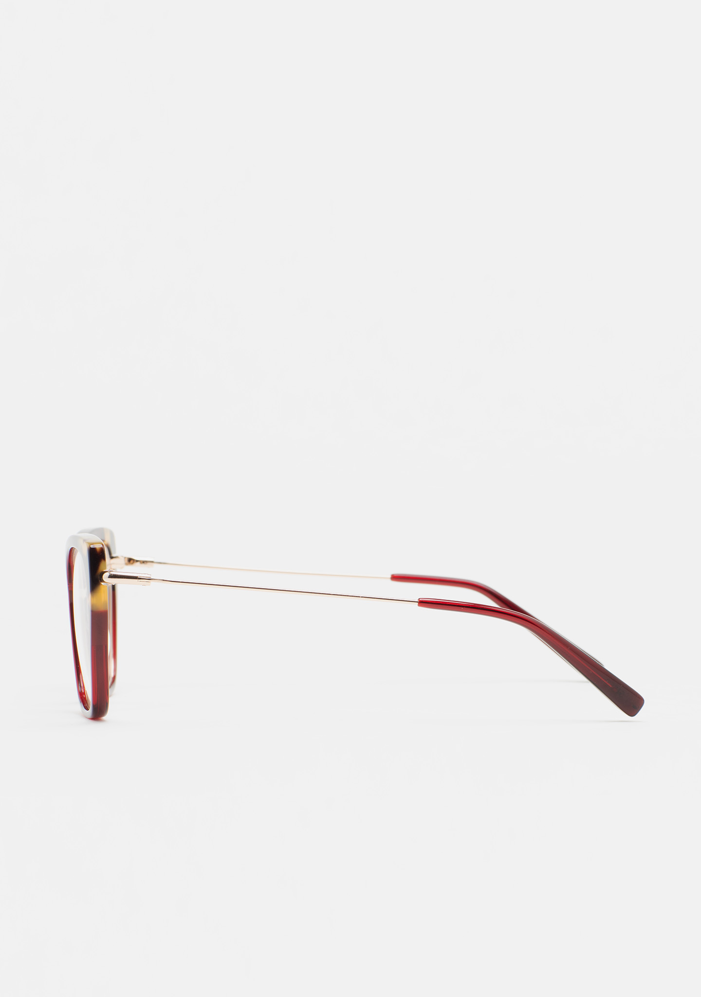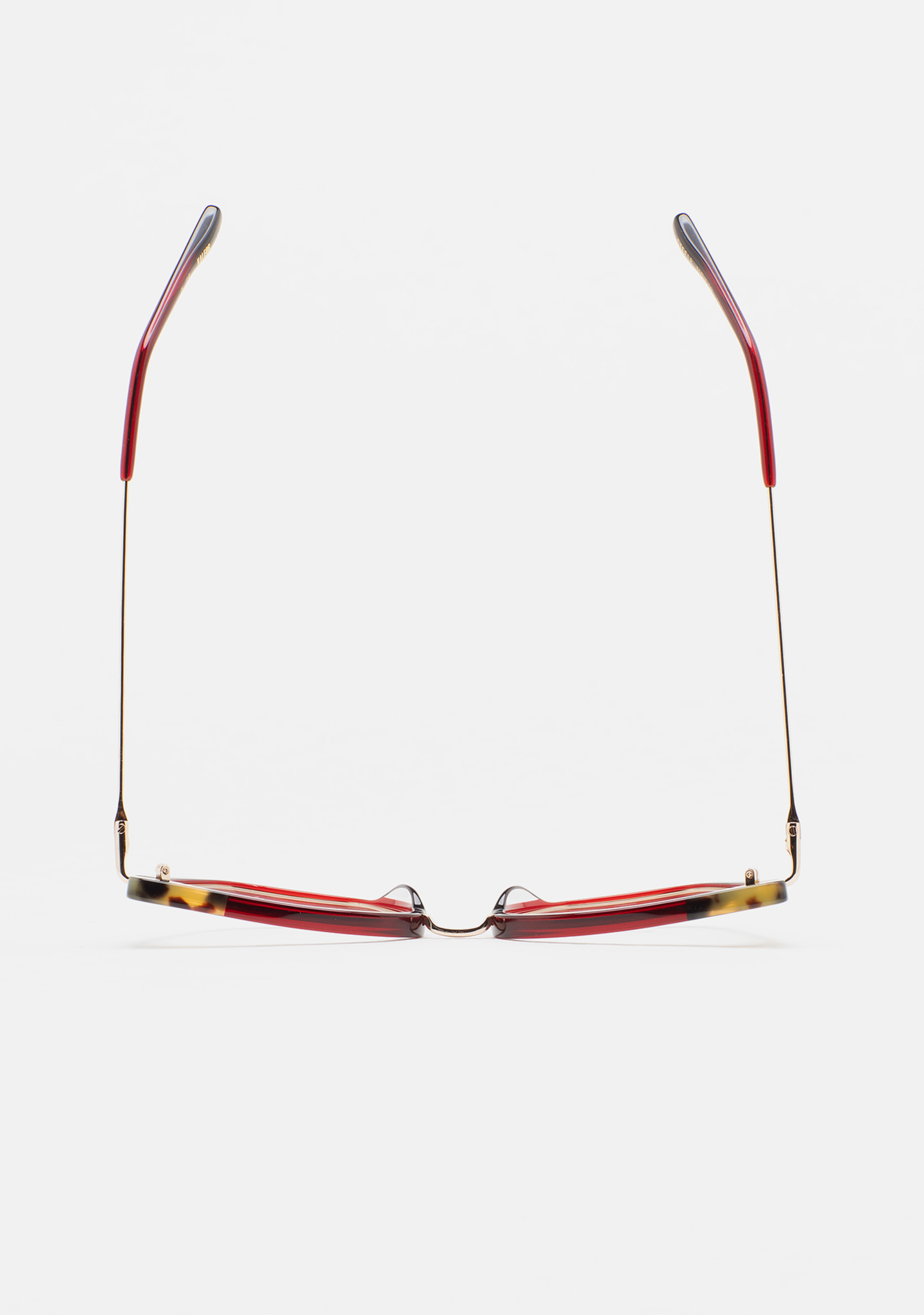 Lunettes de vue de forme papillon. Structure et pont en acier inoxydable doré. Monture avant en acétate bordeaux translucide avec double laminé havane marron foncé et bordeaux foncé. Branches en acier inoxydable doré avec embouts en acétate bordeaux translucide. Plaquettes en acétate intégrées. Fait main.