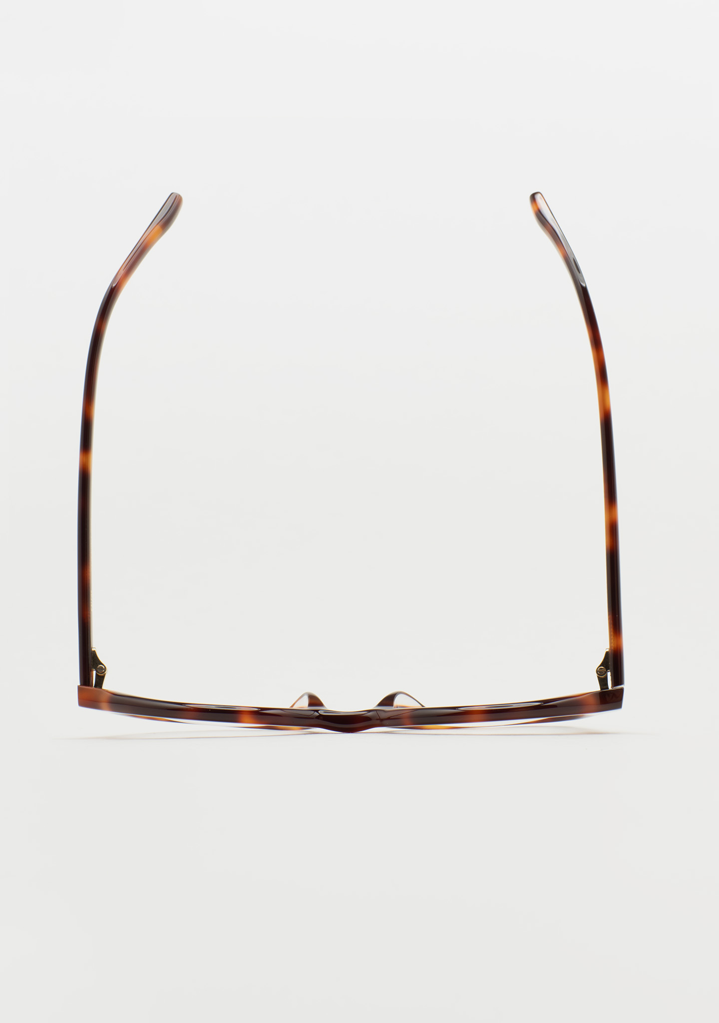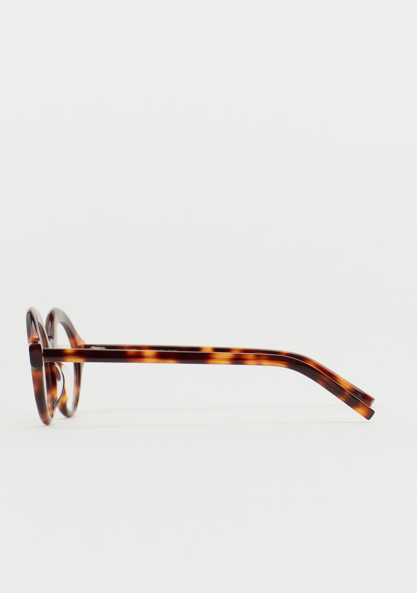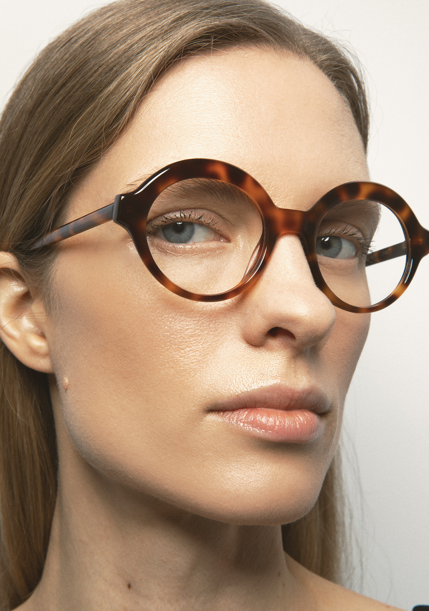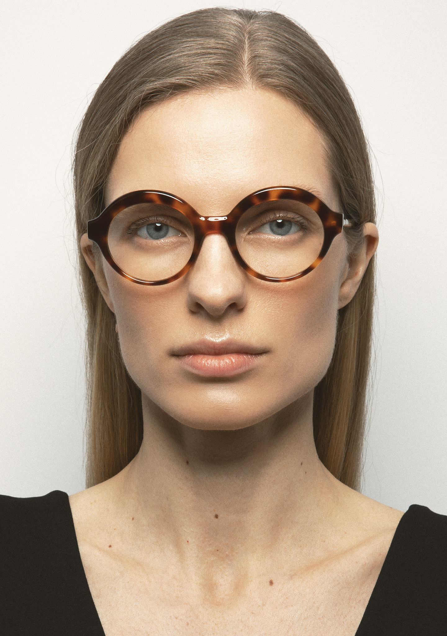 Lunettes de vue de forme ronde. Design pensé dans les moindres détails. Face et branches en acétate havane marron foncé. Plaquettes en acétate intégrées. Fabriquées à la main.