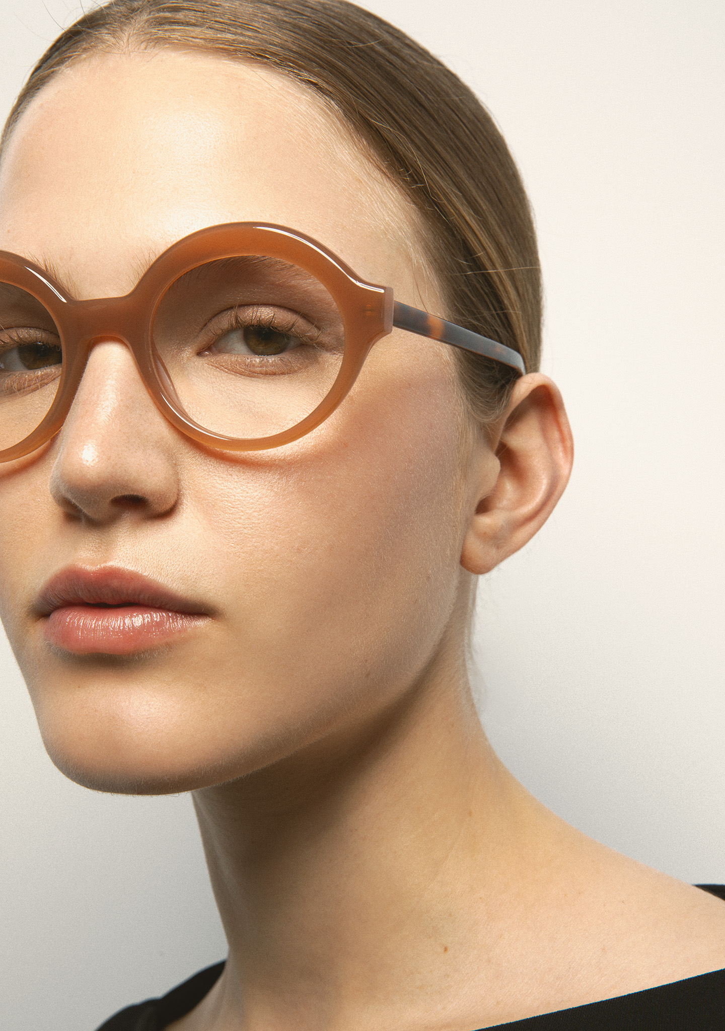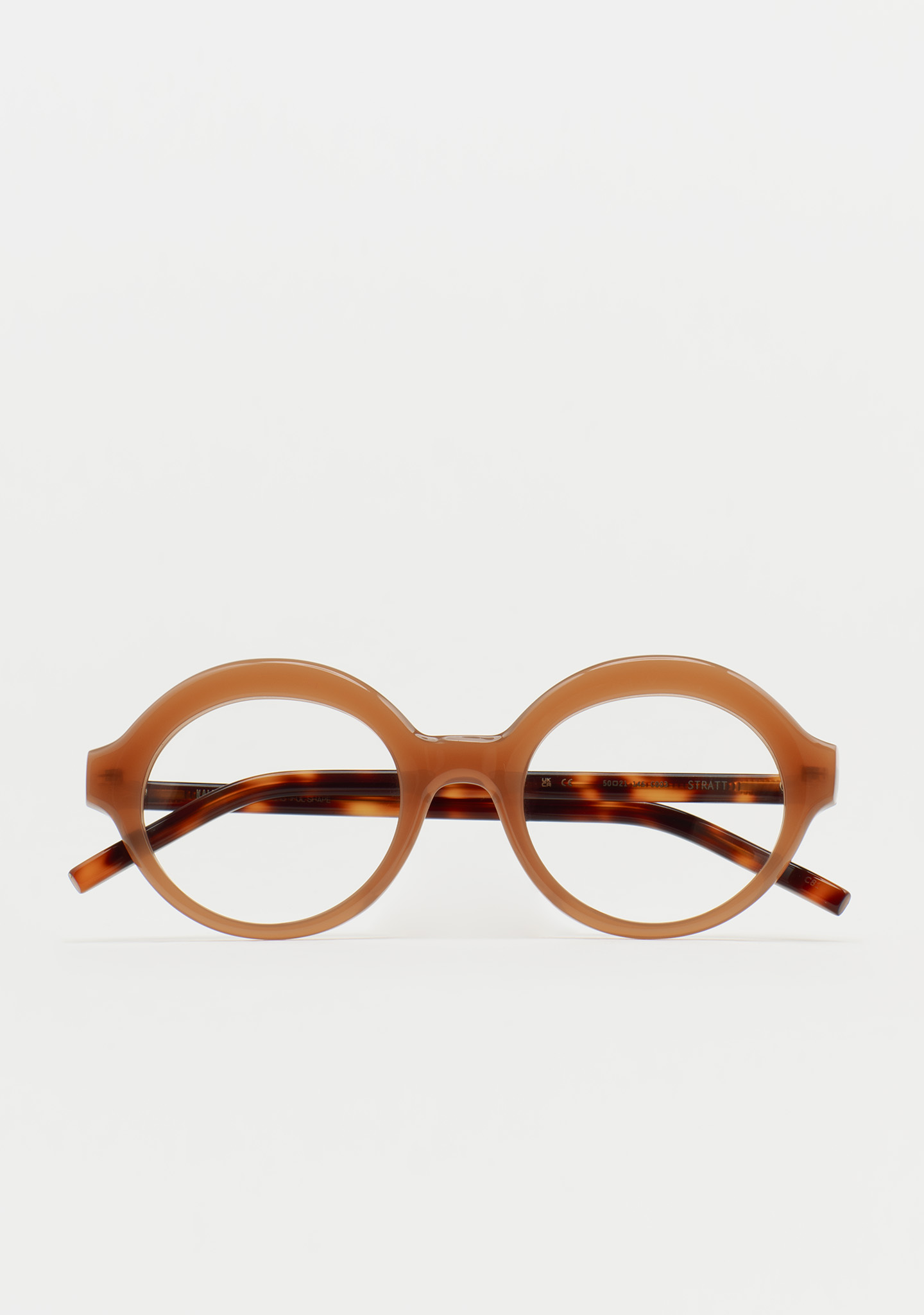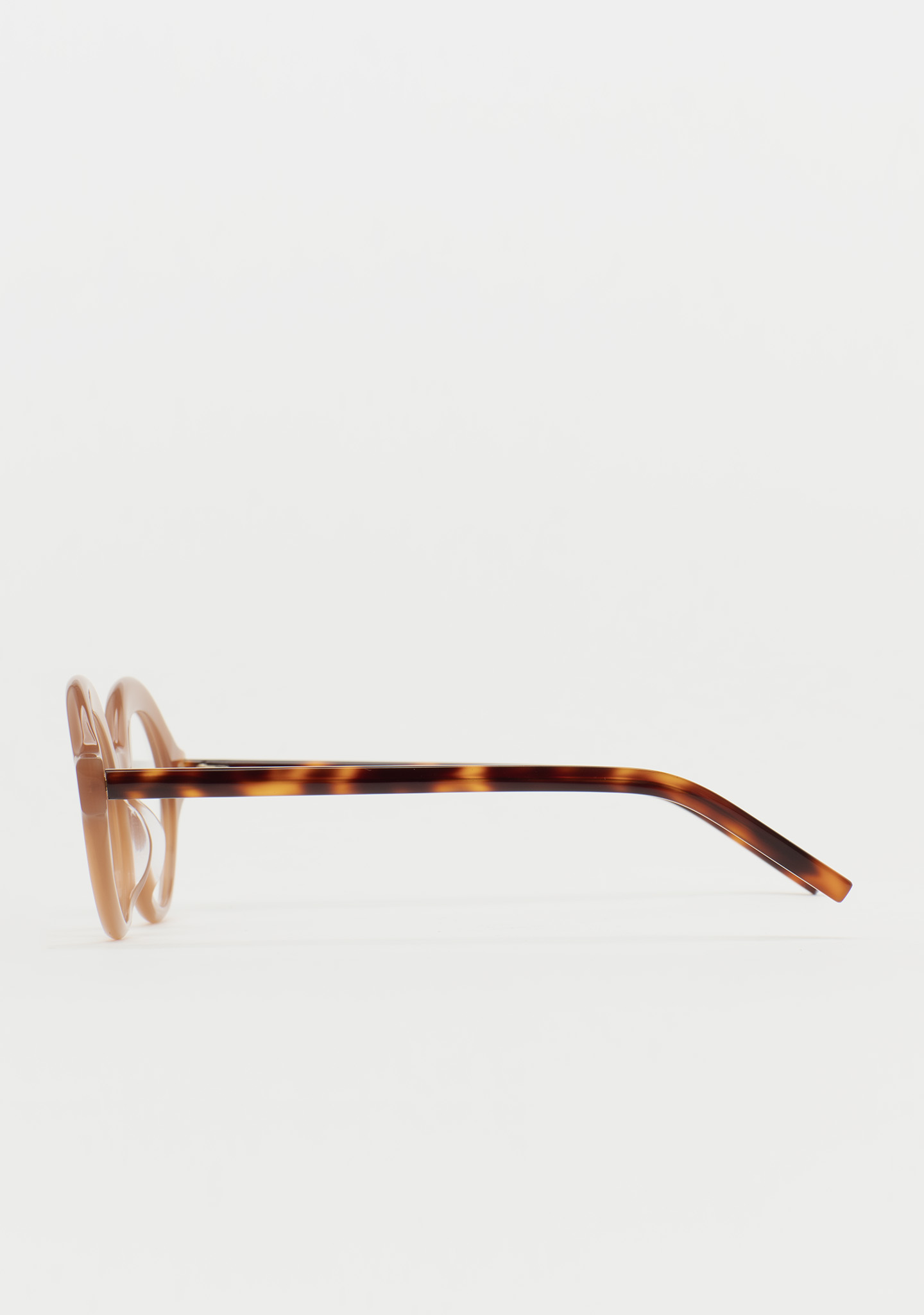 Lunettes de vue de forme ronde. Design pensé dans les moindres détails. Face en acétate marron translucide. Branches en acétate havane marron. Plaquettes en acétate intégrées. Fabriquées à la main.