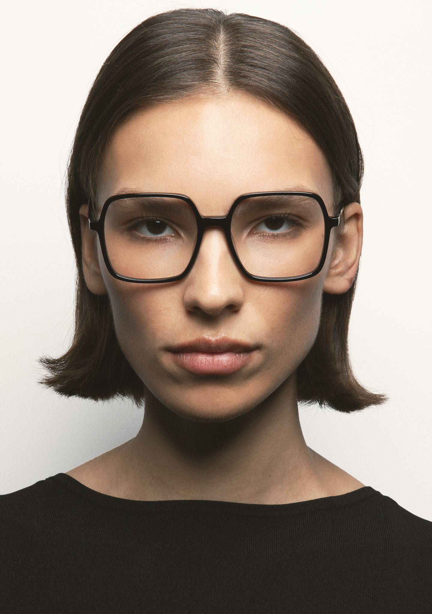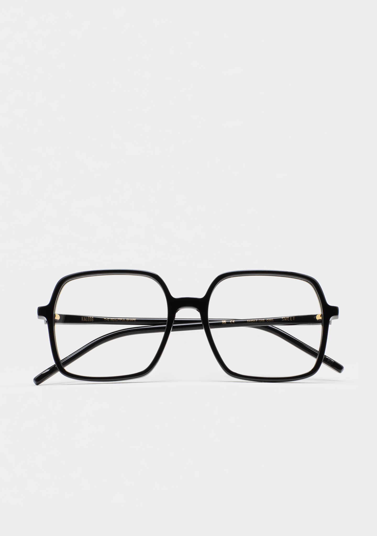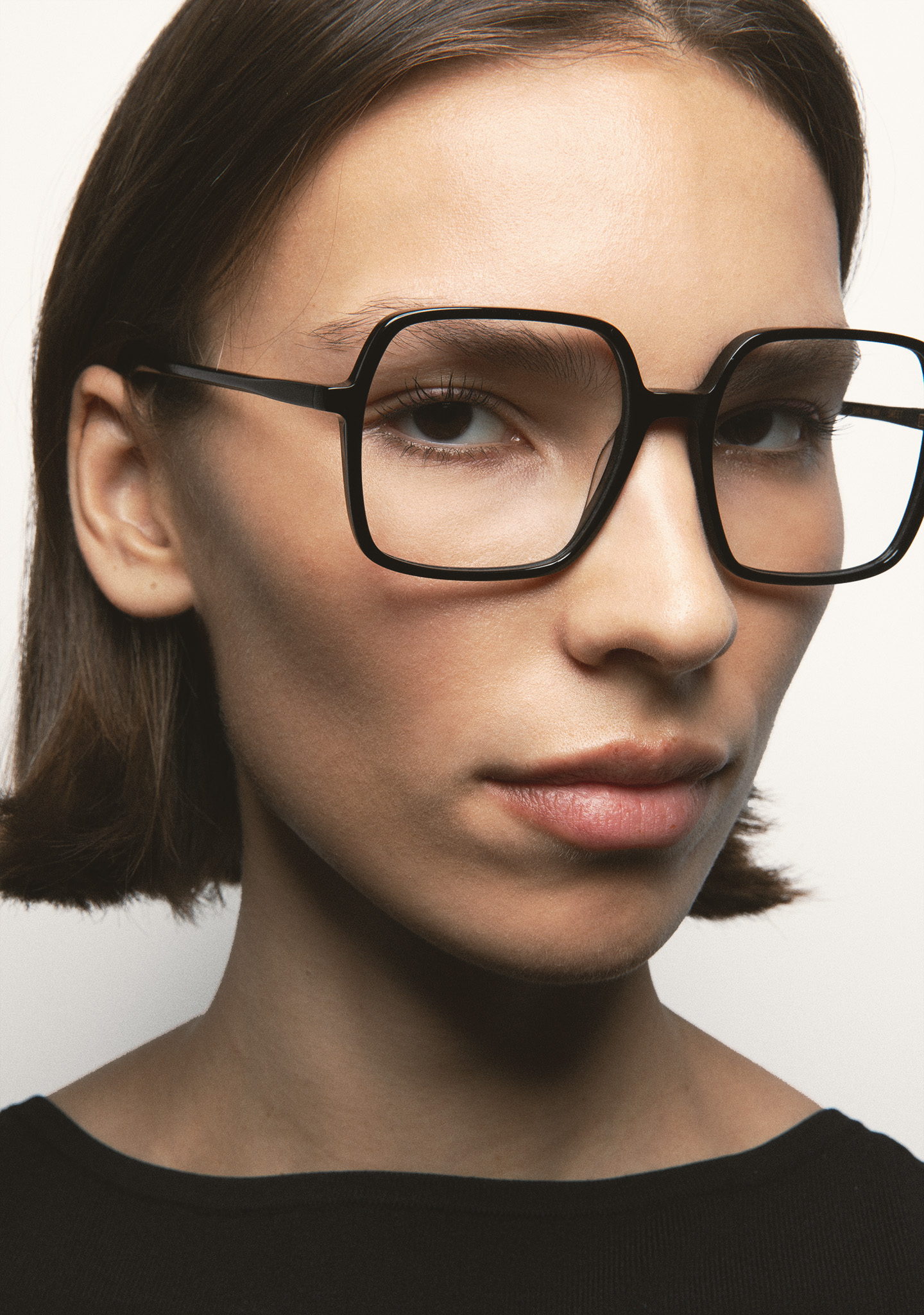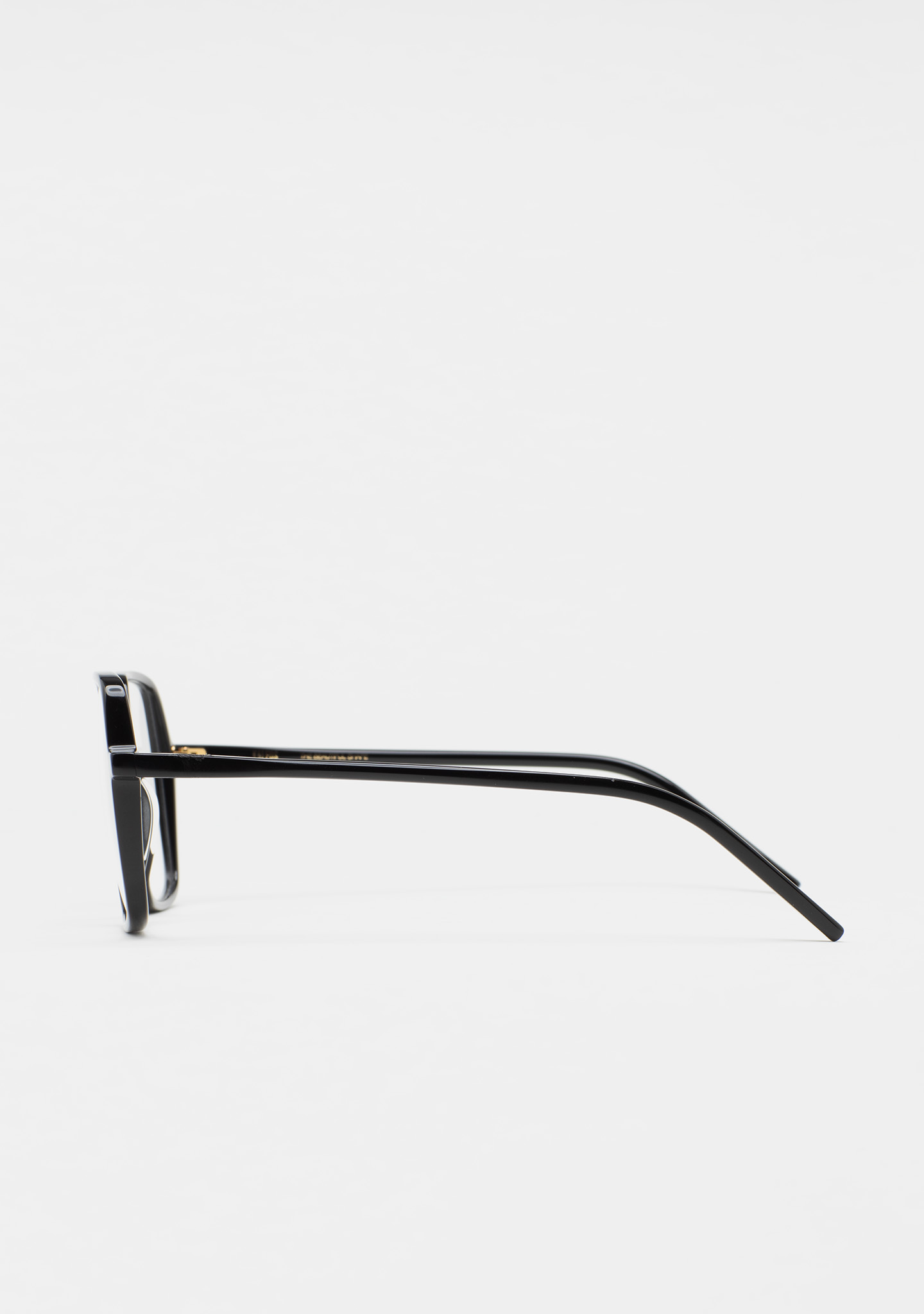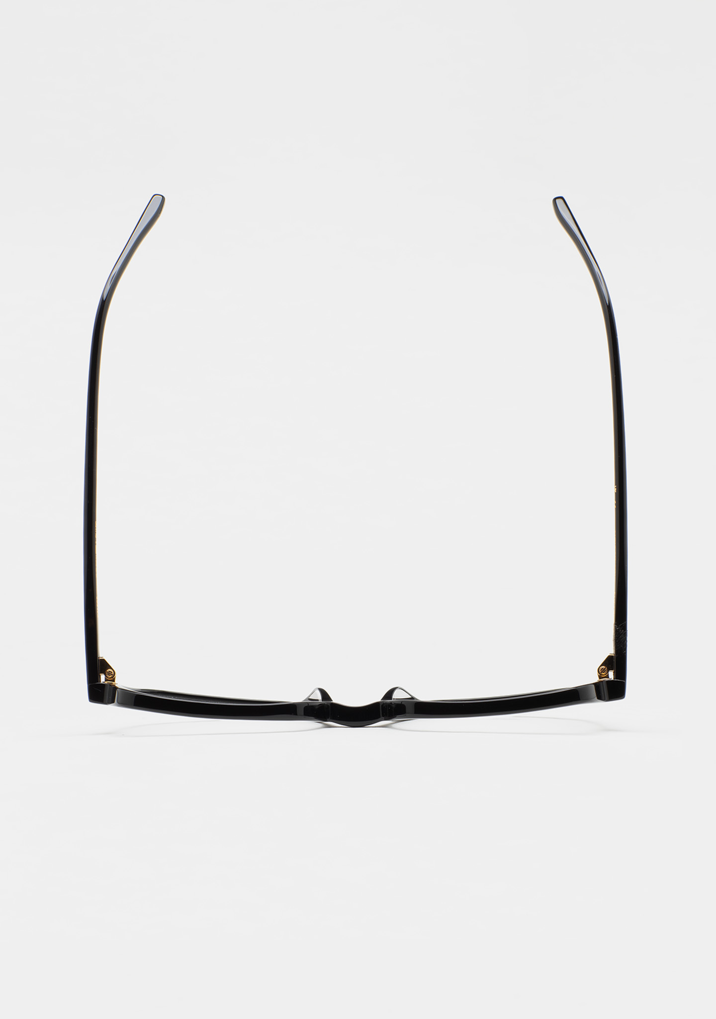 Lunettes de vue de forme carrée. Frontal et branches en acétate noir. Plaquettes en acétate intégrées. Fait main.