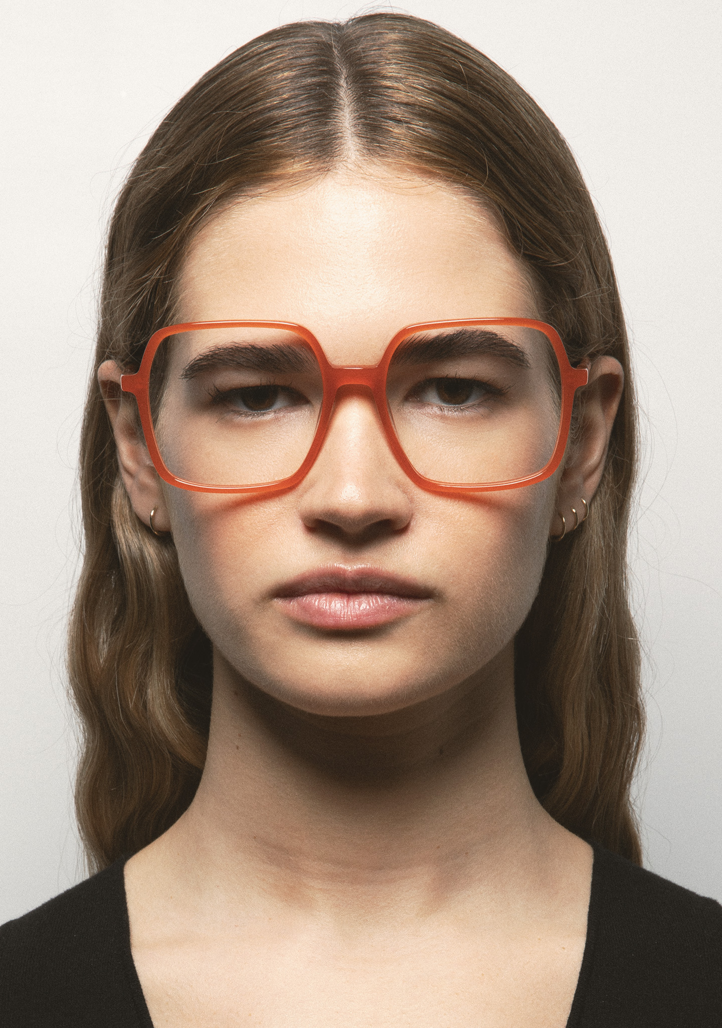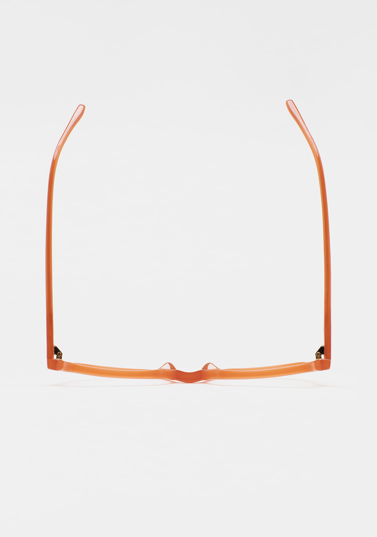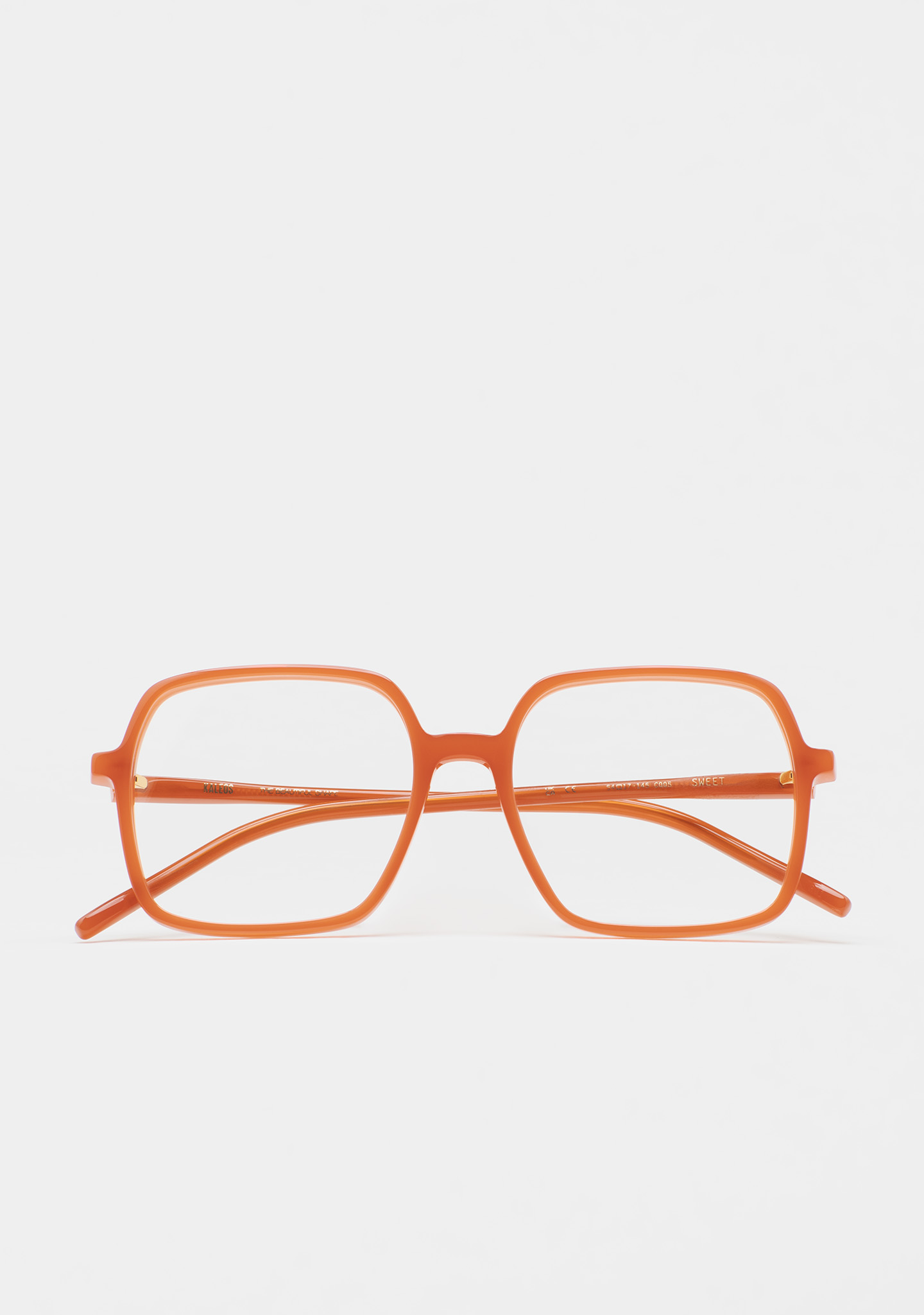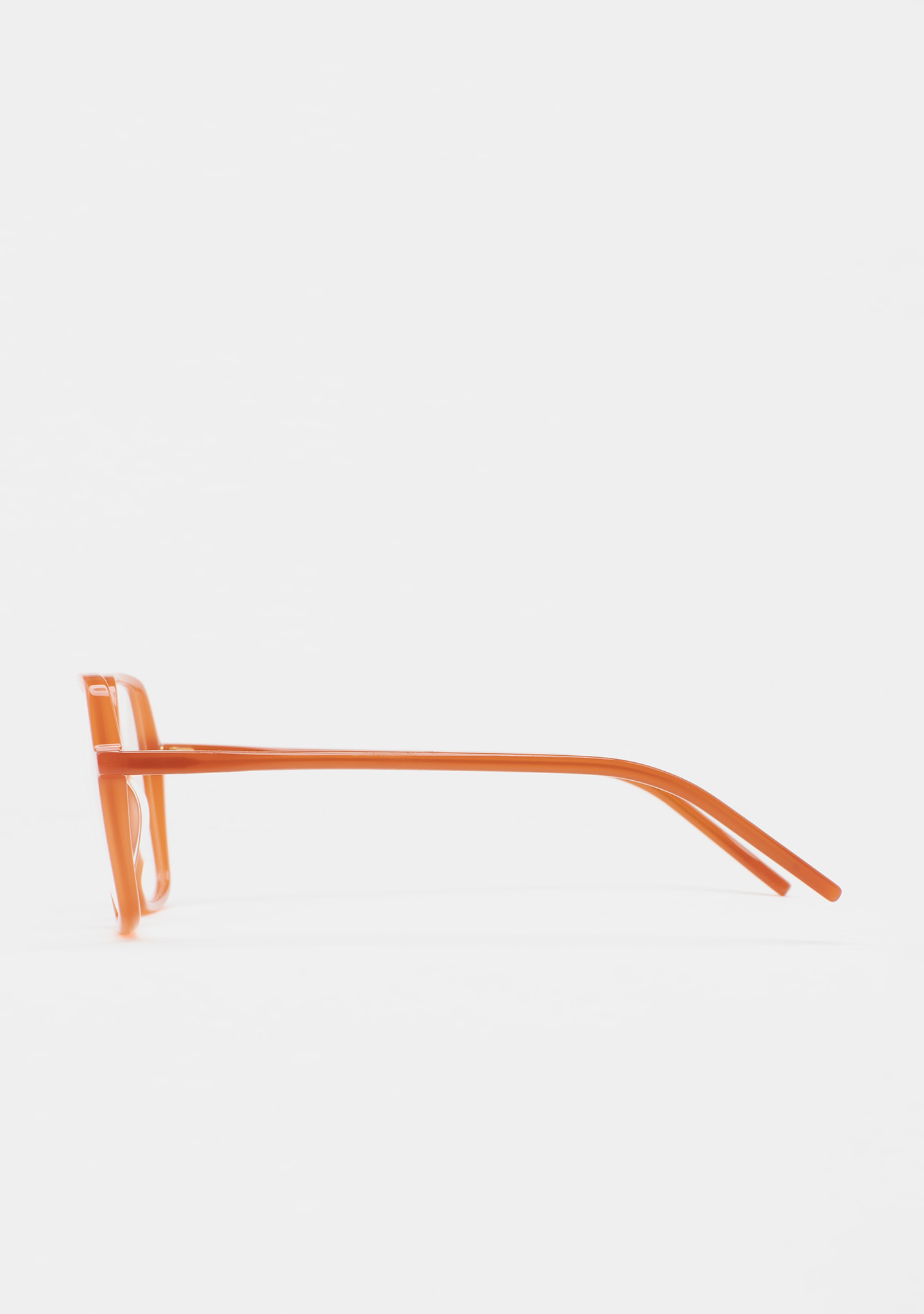 Lunettes de vue de forme carrée. Frontal et branches en acétate orange translucide. Plaquettes en acétate intégrées. Fait main.