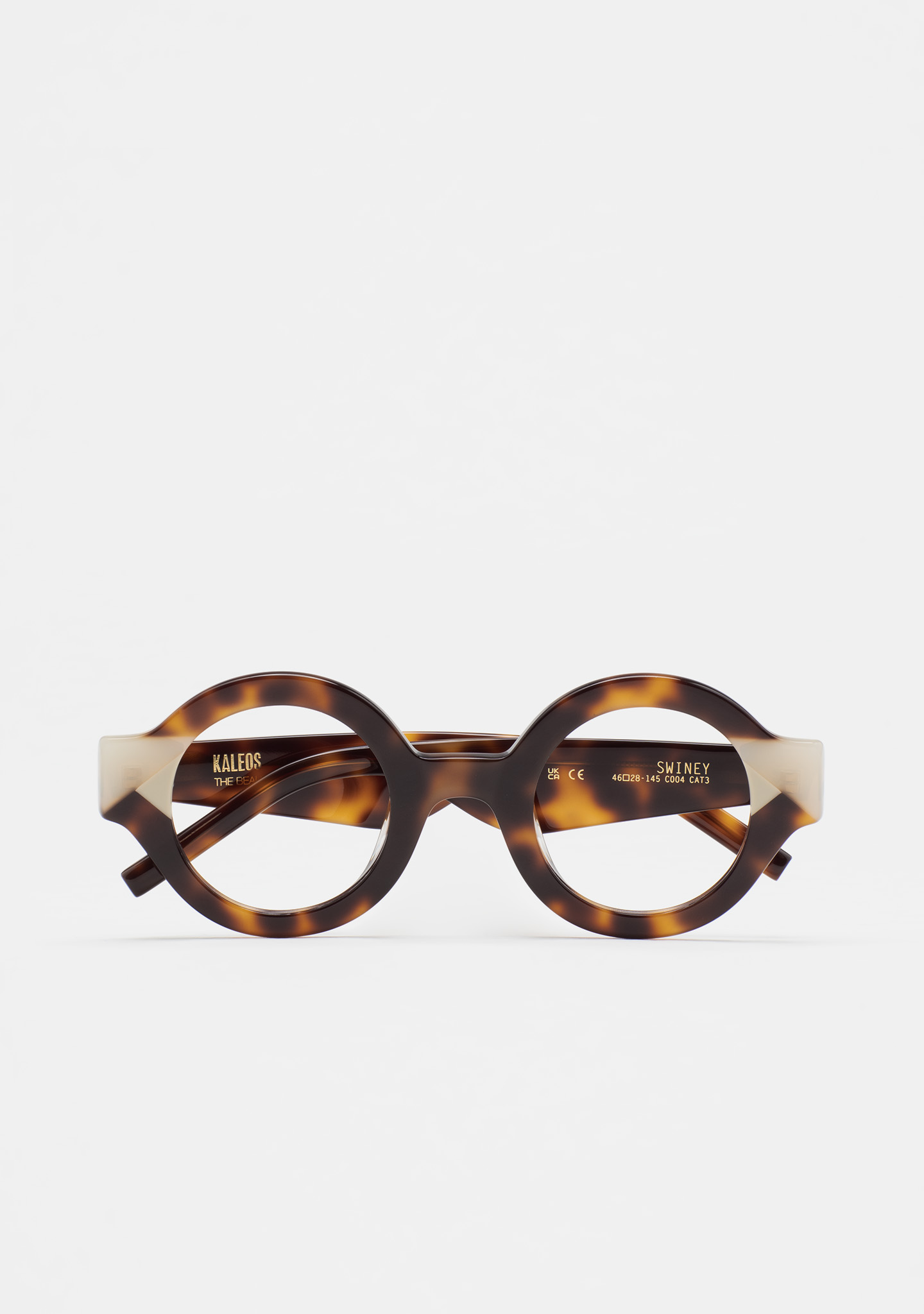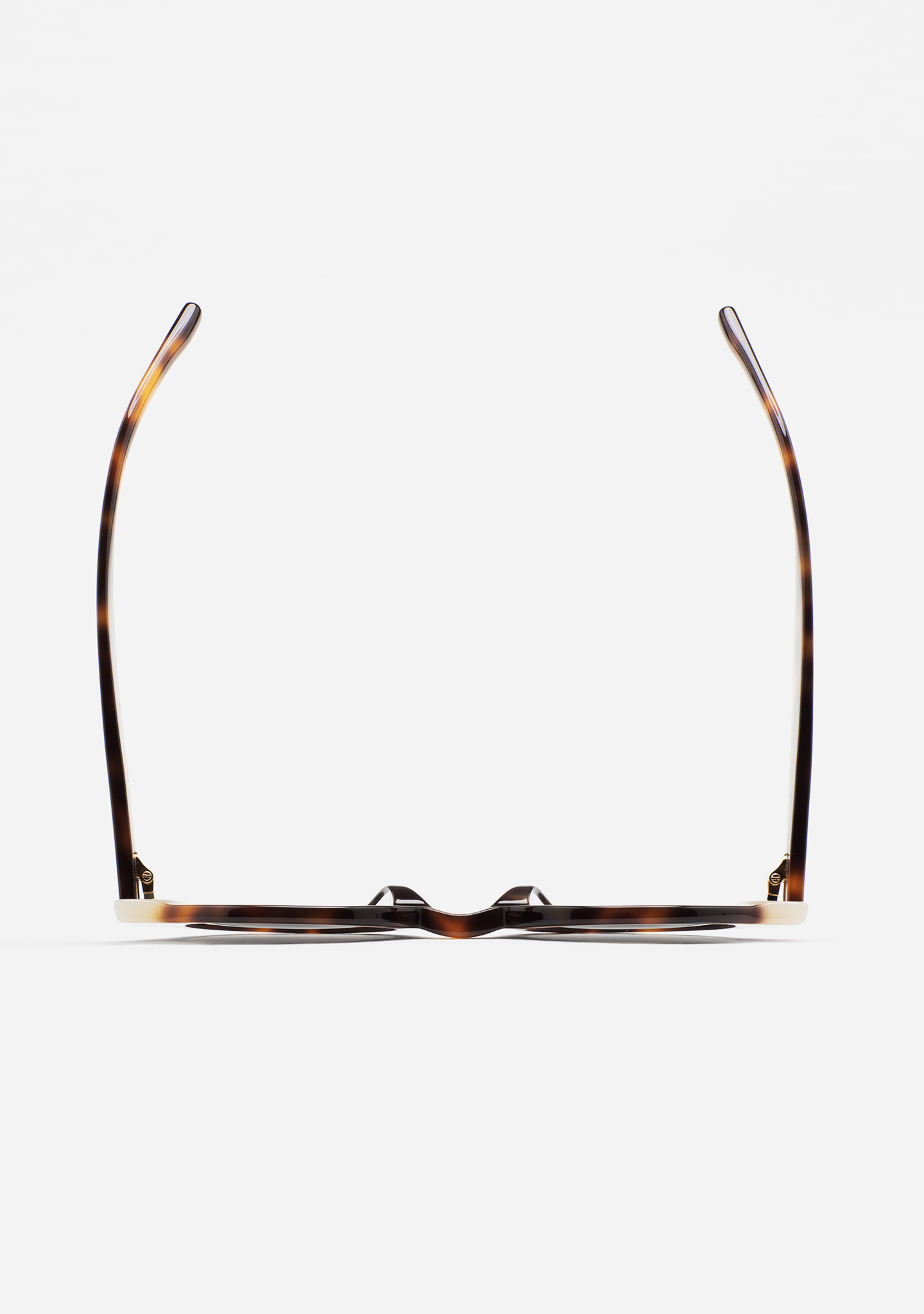 Lunettes de vue rondes. Frontal en acétate havane marron avec double laminage ivoire translucide et beige. Branches en acétate havane marron. Plaquettes fixes. Fait main.