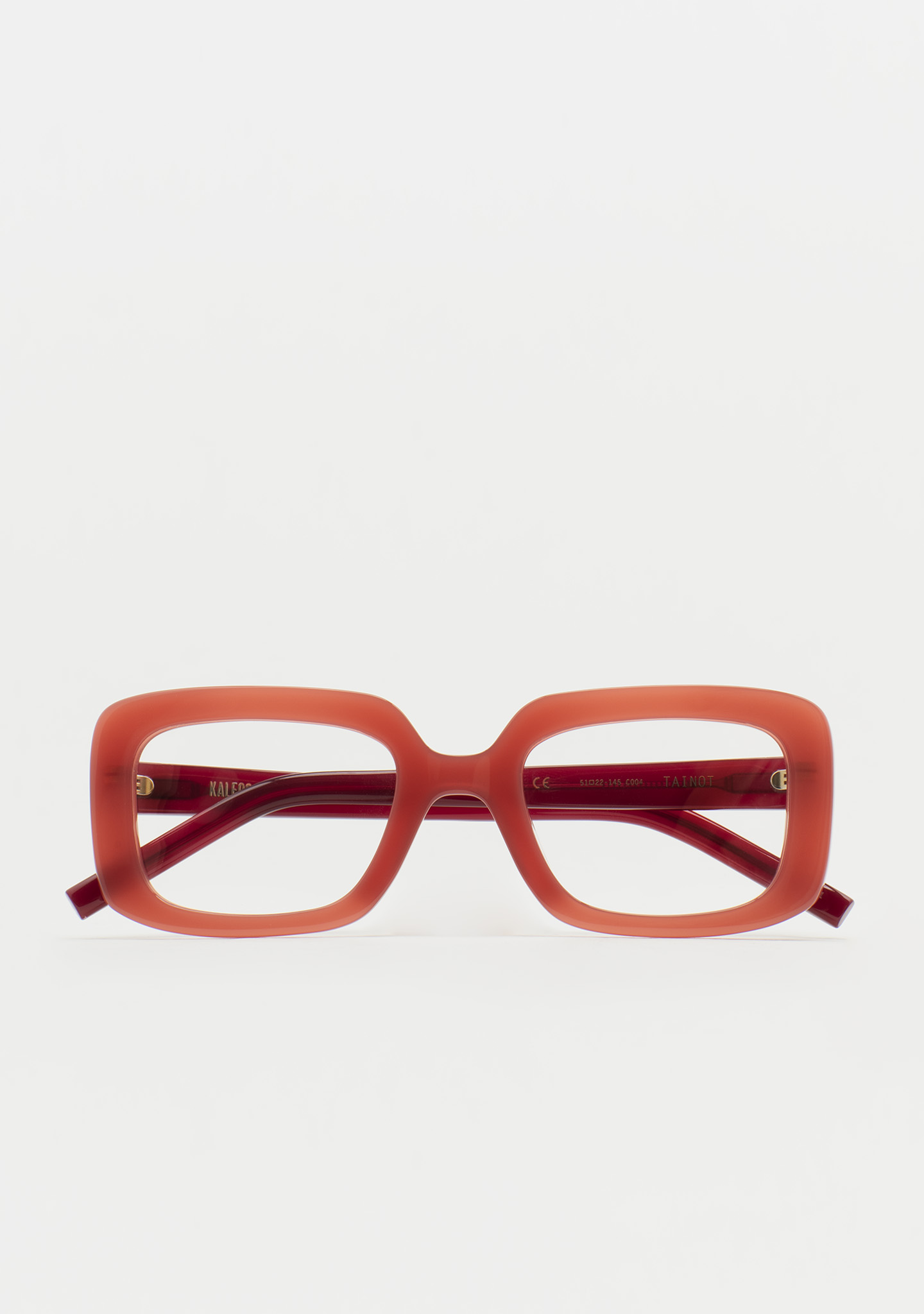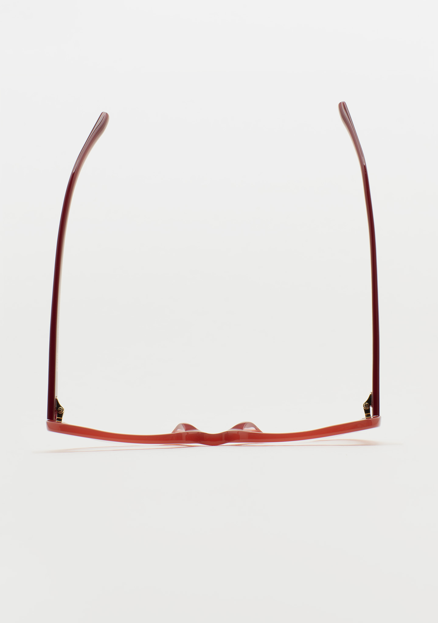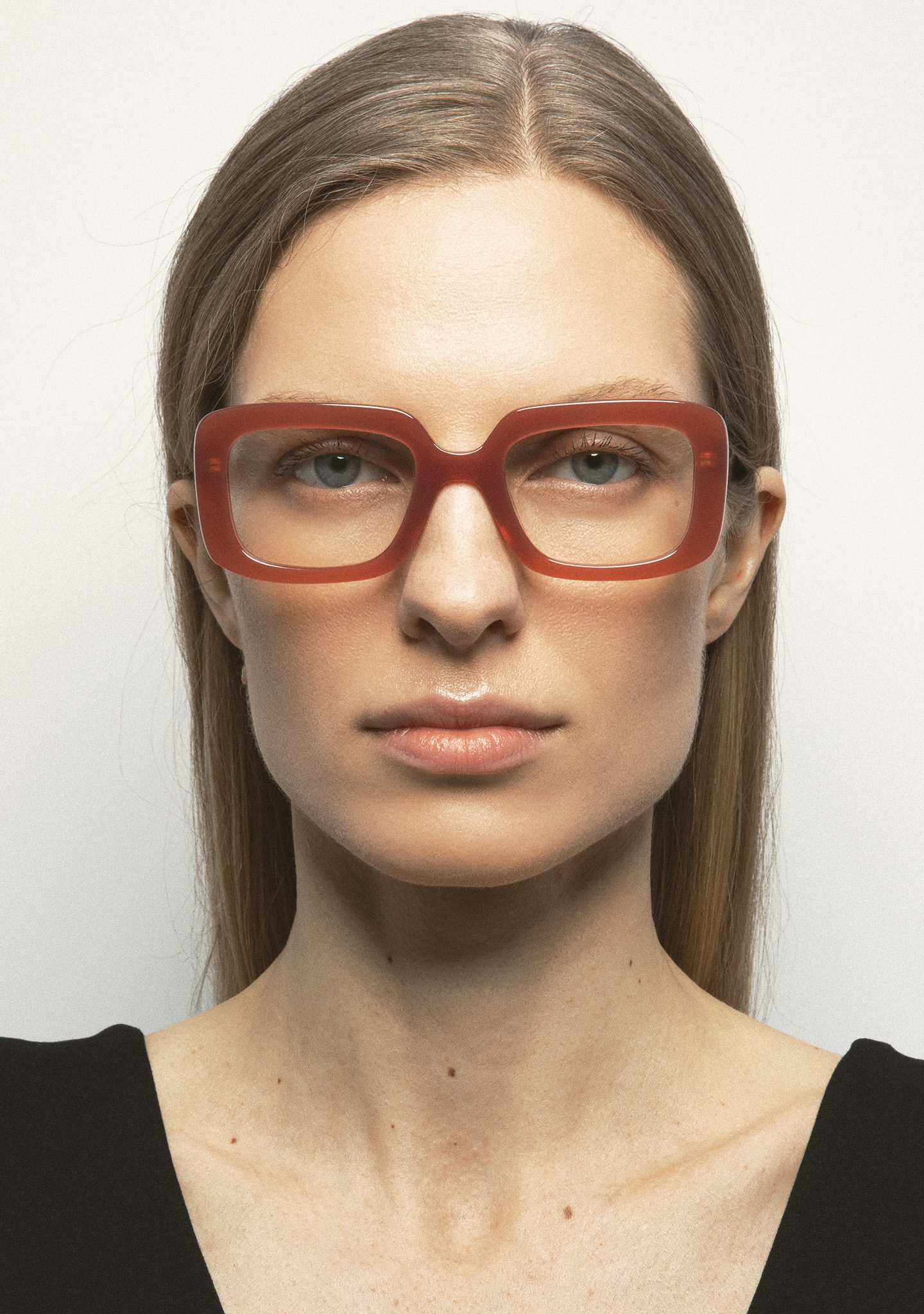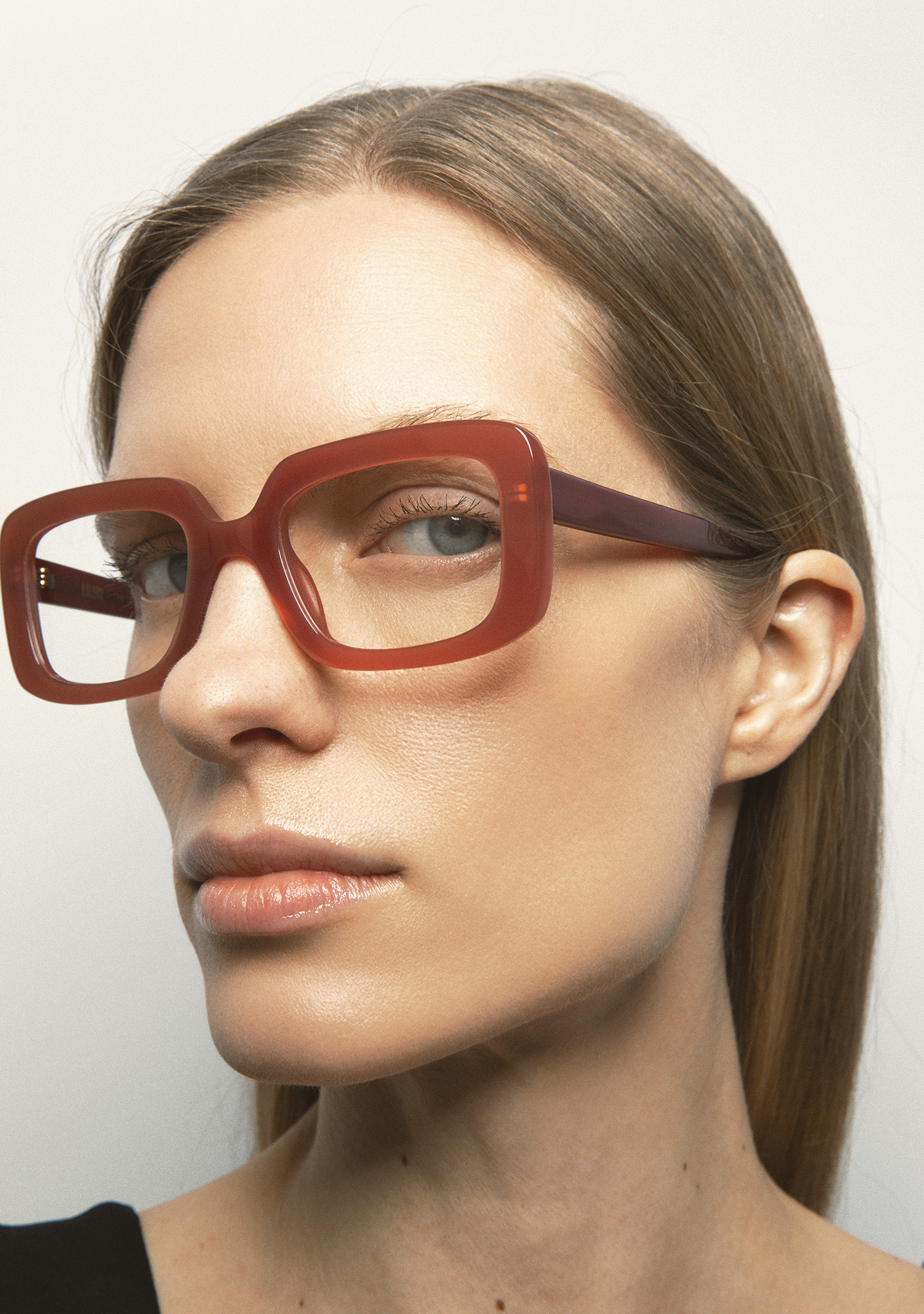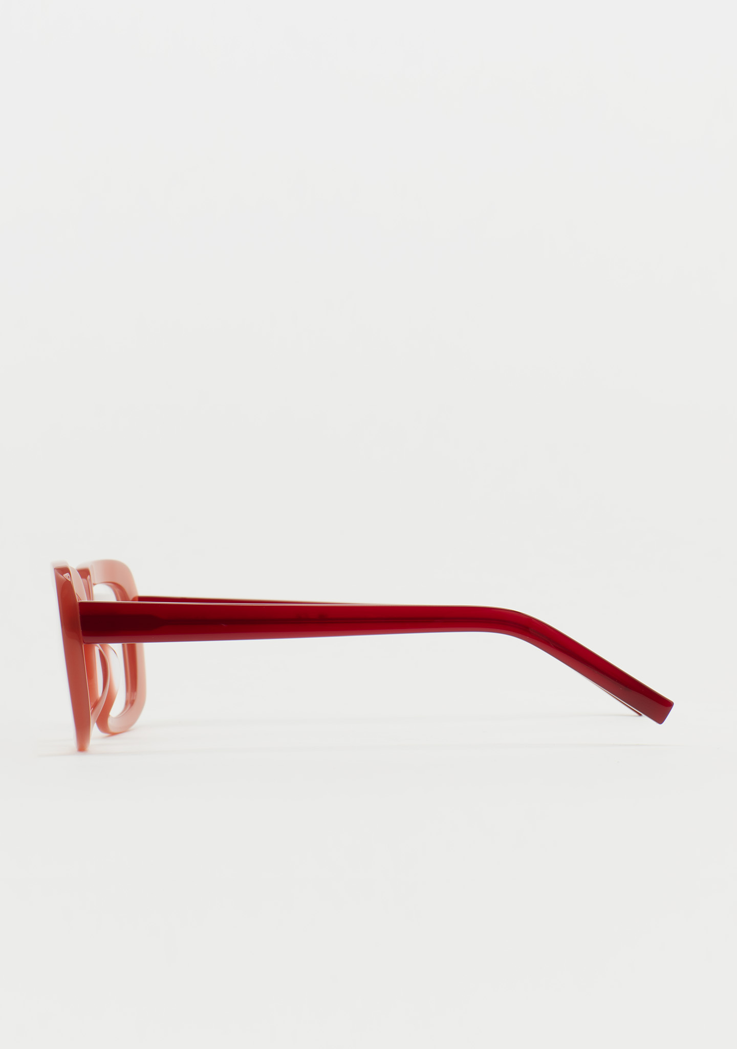 Lunettes de vue rectangulaires. Volume précis avec impact visuel. Face avant en acétate rose translucide. Branches en acétate violet translucide. Plaquettes de nez en acétate intégrées. Fabriquées à la main.