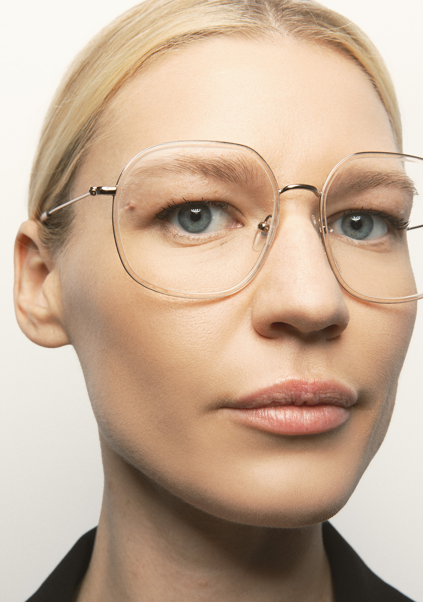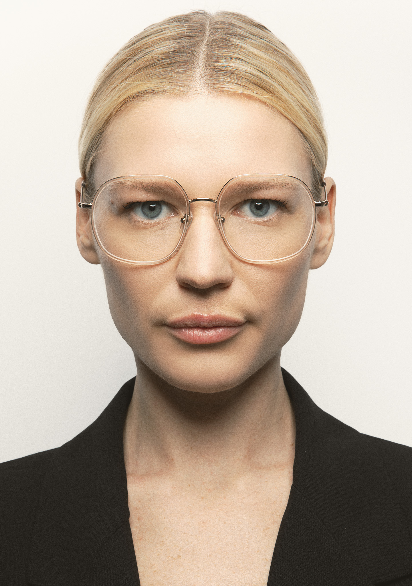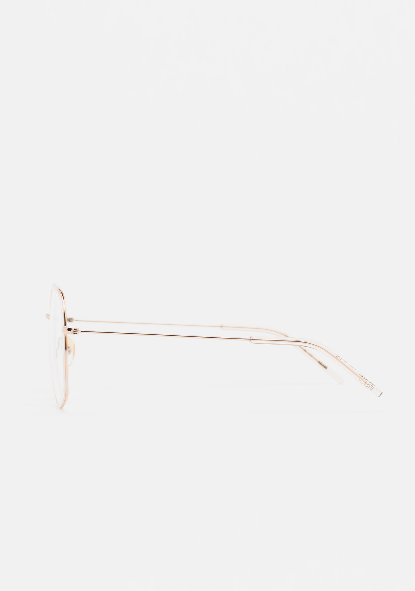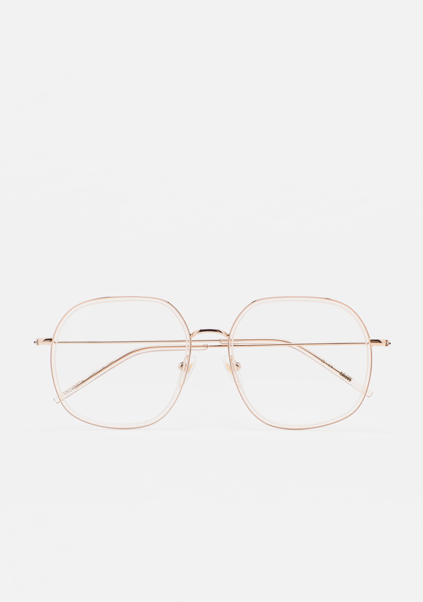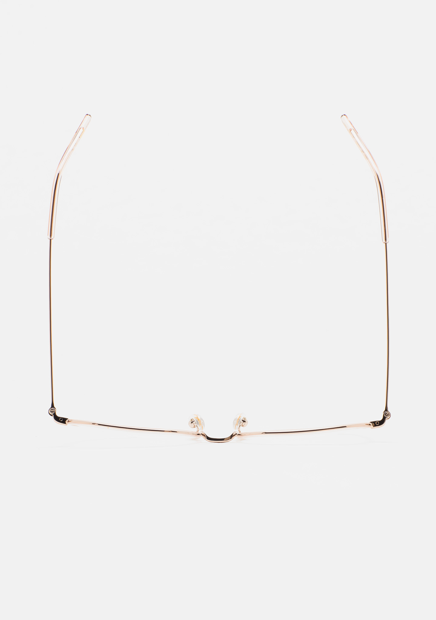 Lunettes de vue de forme carrée arrondie. Monture avant en acier inoxydable doré avec cerclage en acétate haute densité rose clair translucide. Pont et branches en acier inoxydable rose doré. Branches avec embouts en acétate rose clair translucide. Plaquettes en acétate intégrées. Fait main.