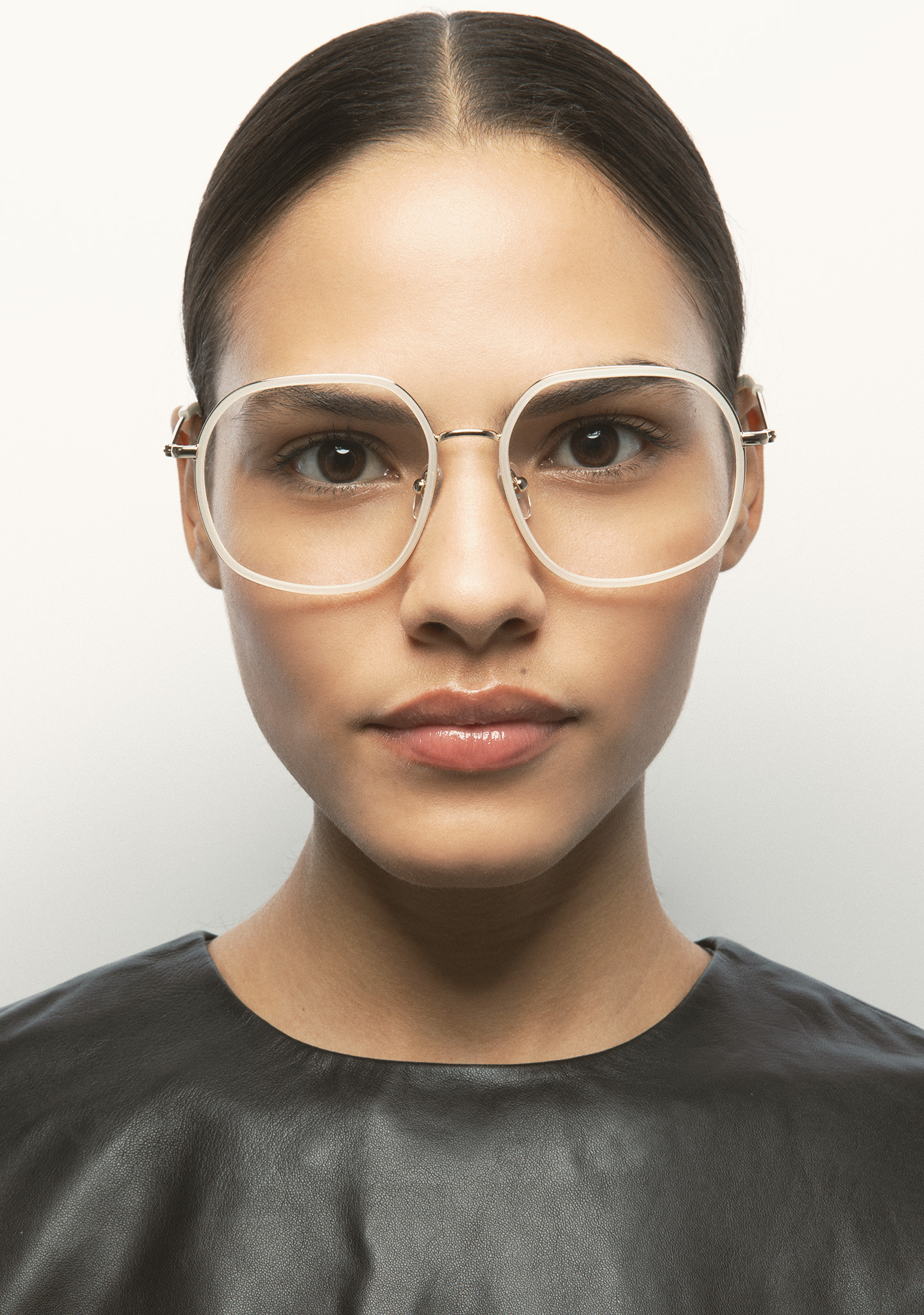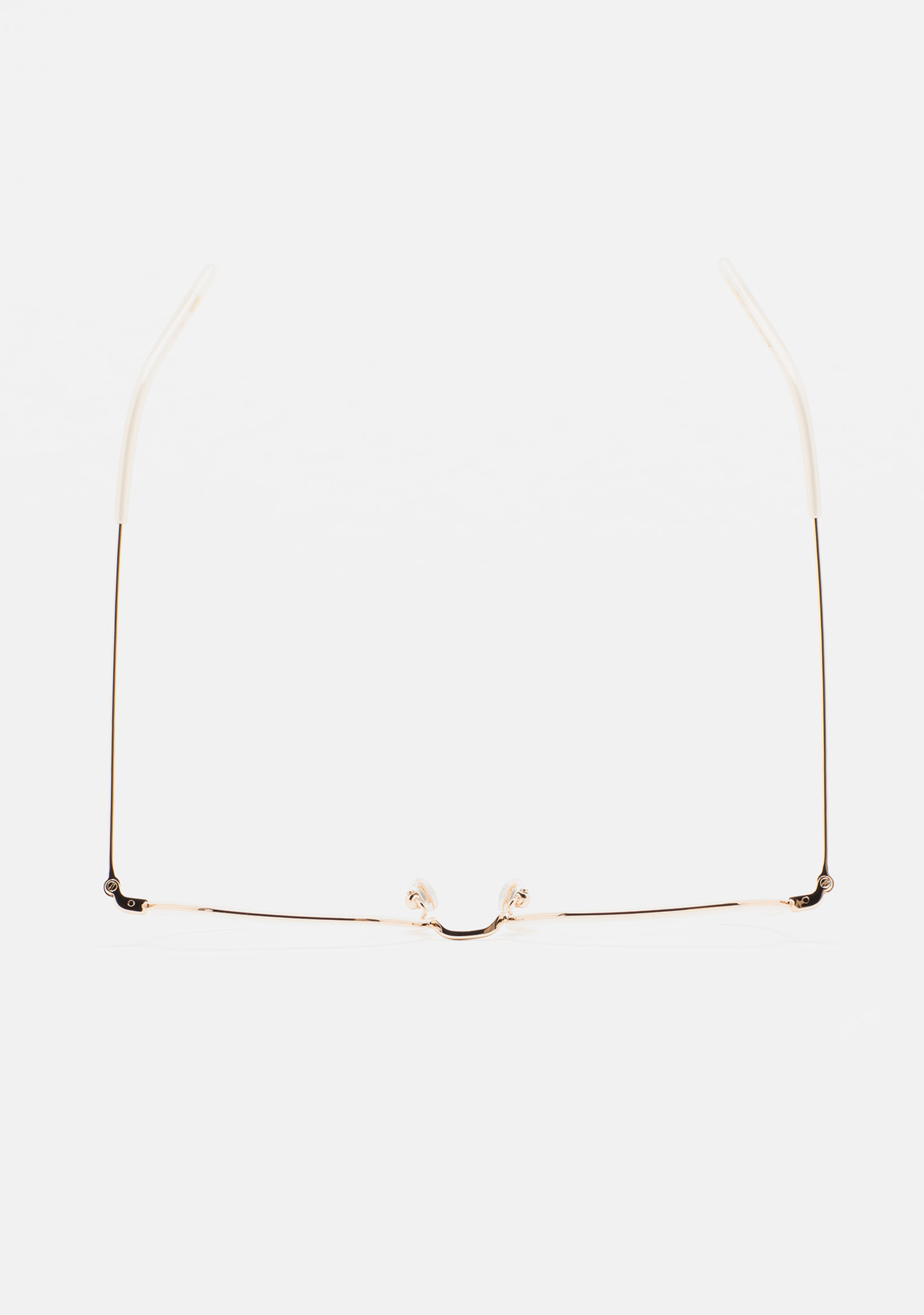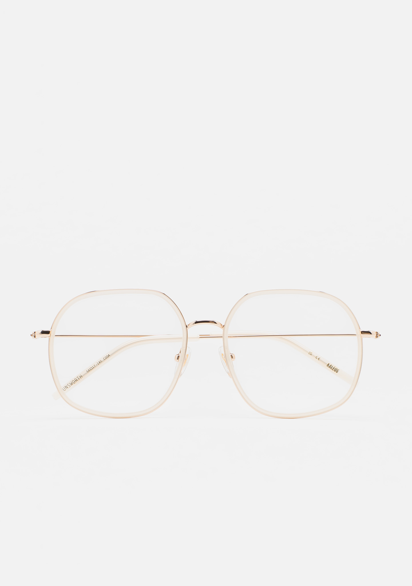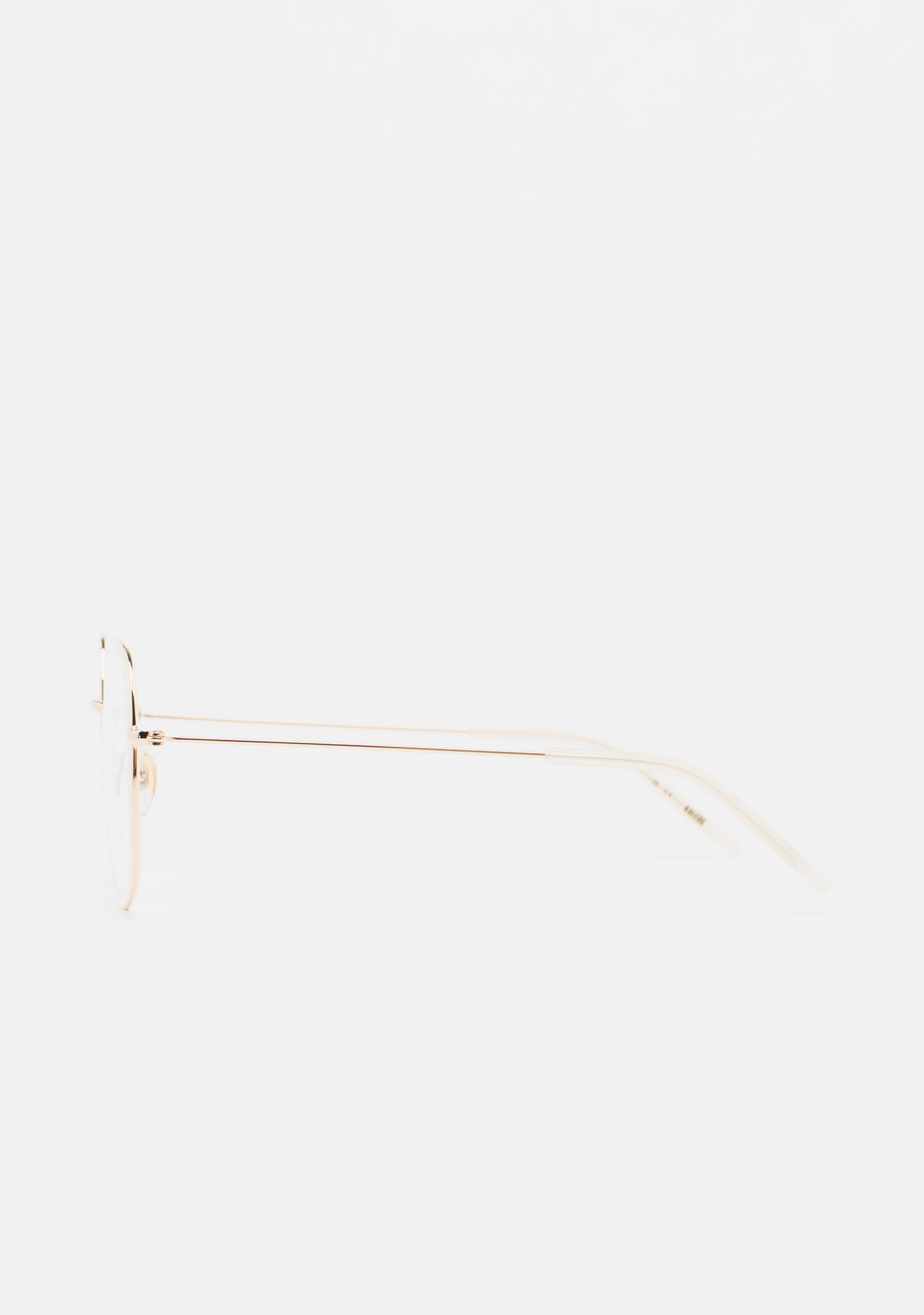 Lunettes de vue de forme carrée arrondie. Monture avant en acier inoxydable doré avec cerclage en acétate haute densité cristal transparent. Pont et branches en acier inoxydable doré. Branches avec embouts en acétate cristal transparent. Plaquettes en acétate intégrées. Fait main.