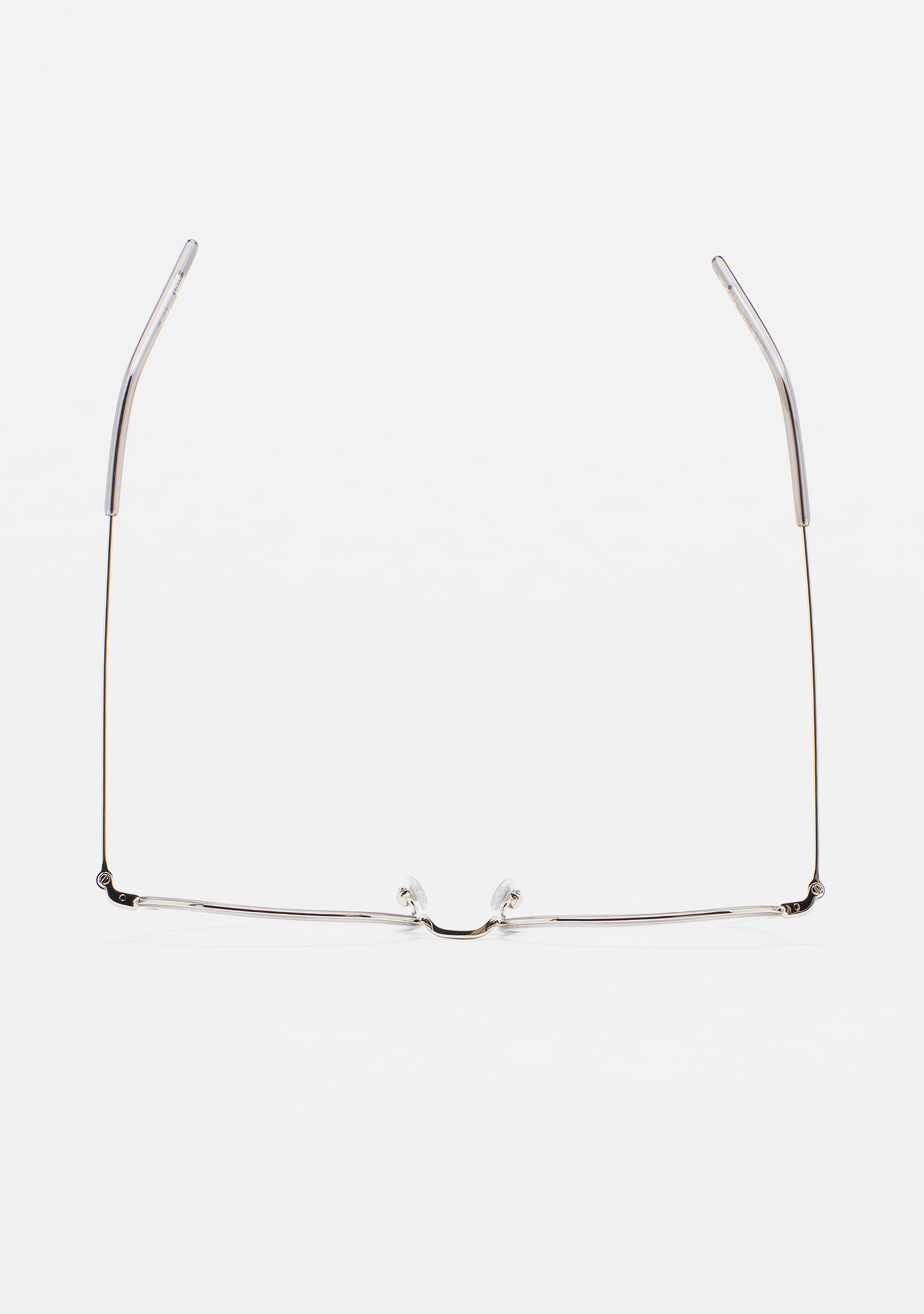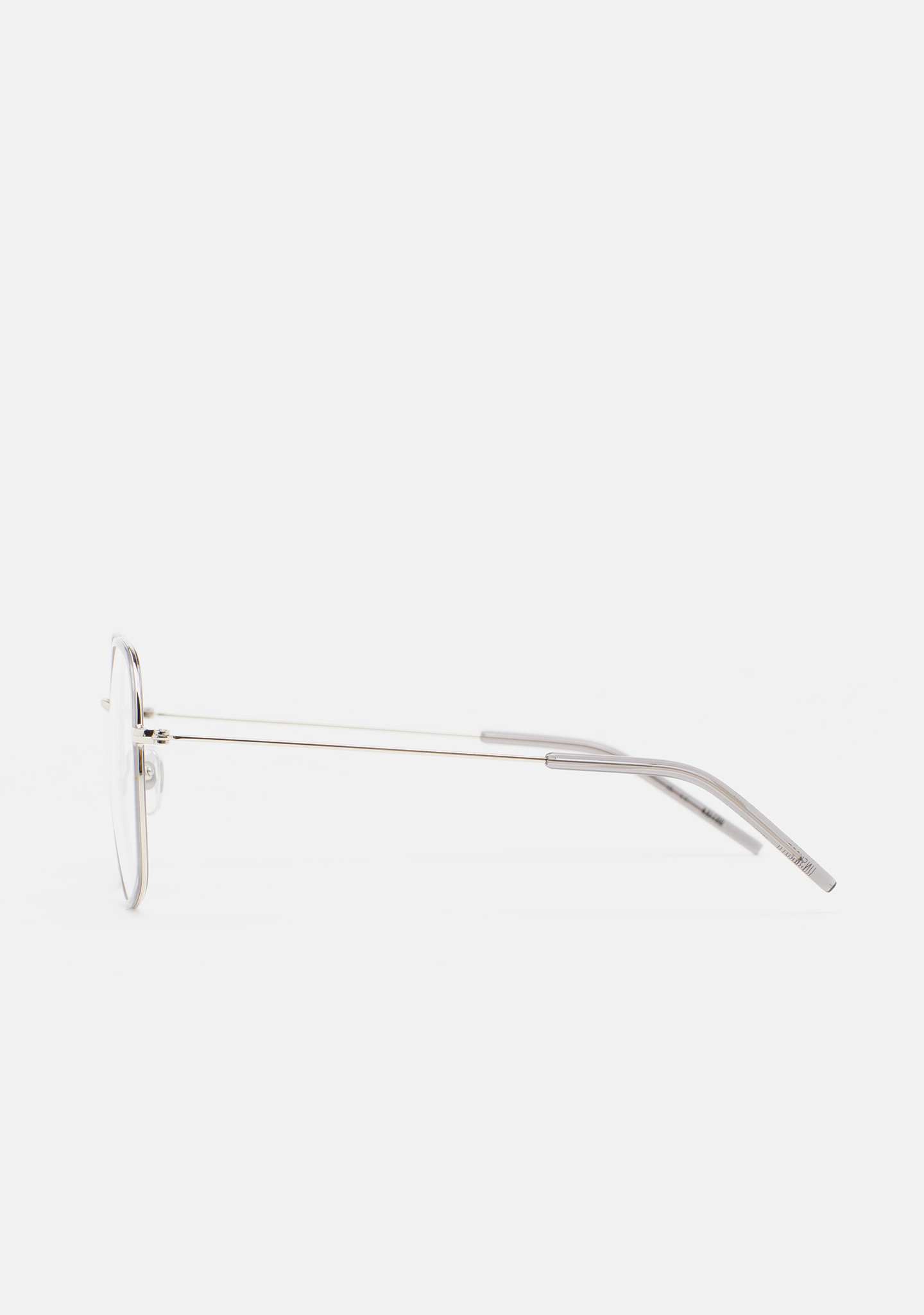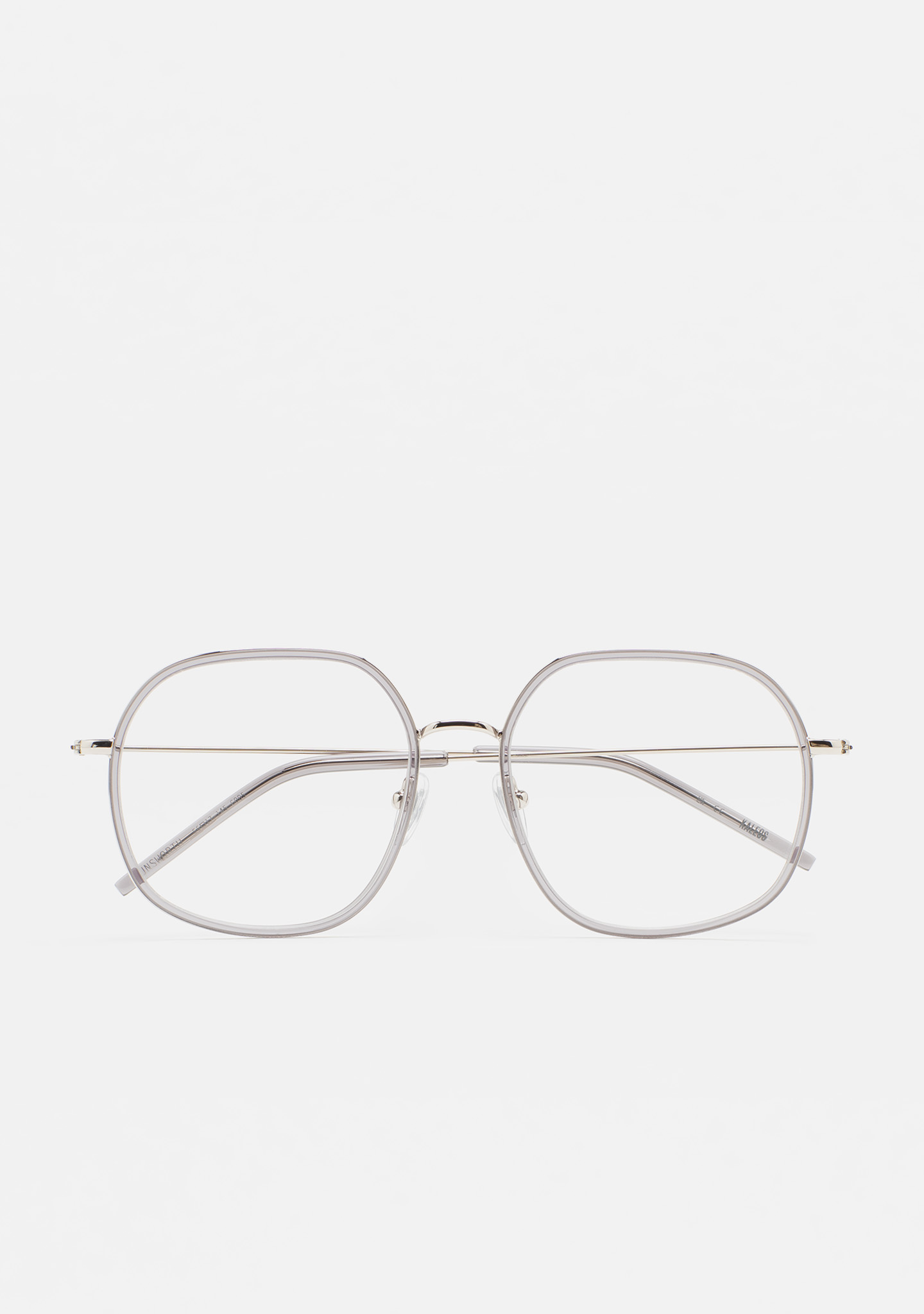 Lunettes de vue de forme carrée arrondie. Monture avant en acier inoxydable doré avec cerclage en acétate haute densité gris transparent. Pont et branches en acier inoxydable argenté. Branches avec embouts en acétate gris transparent. Plaquettes en acétate intégrées. Fait main.