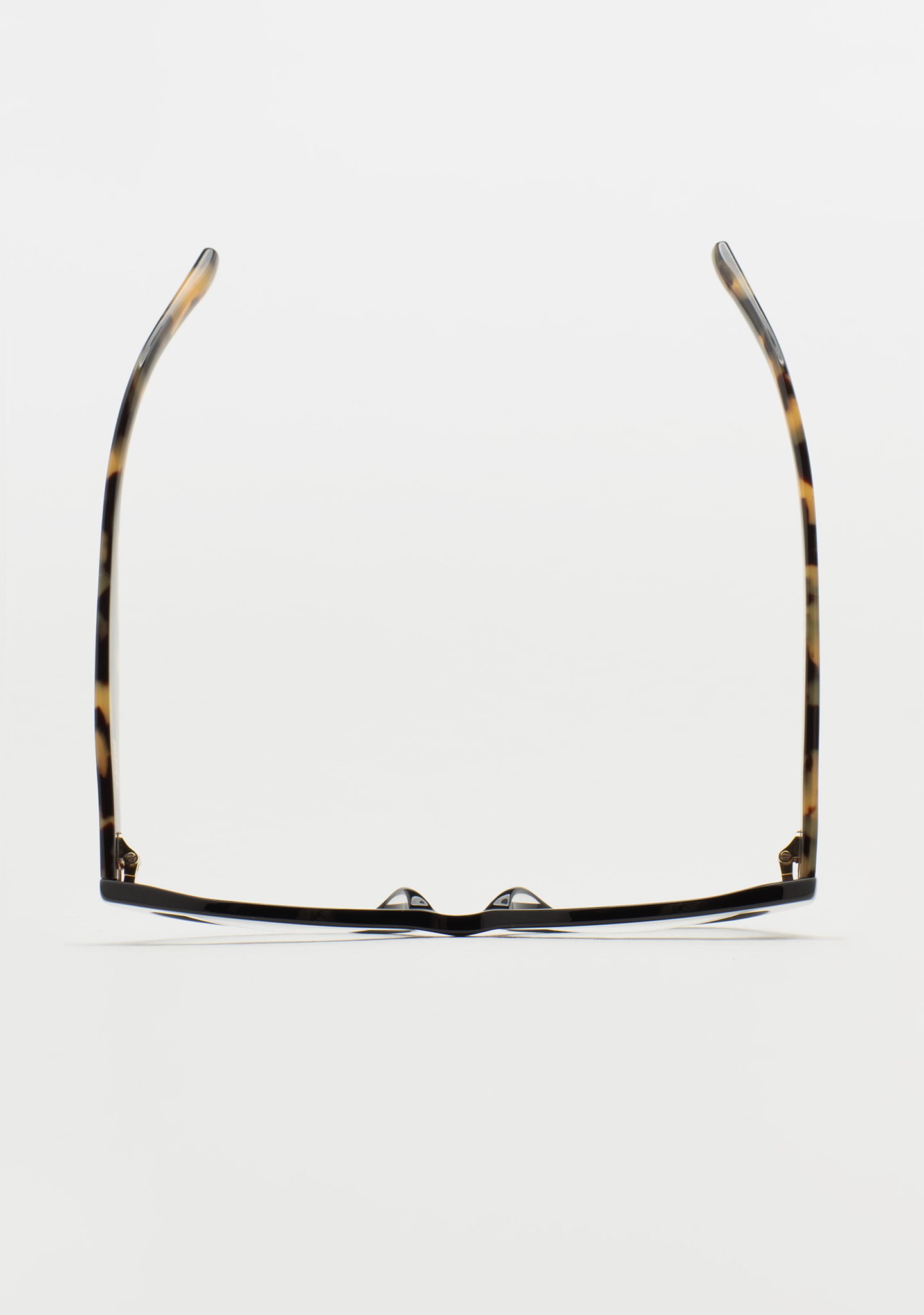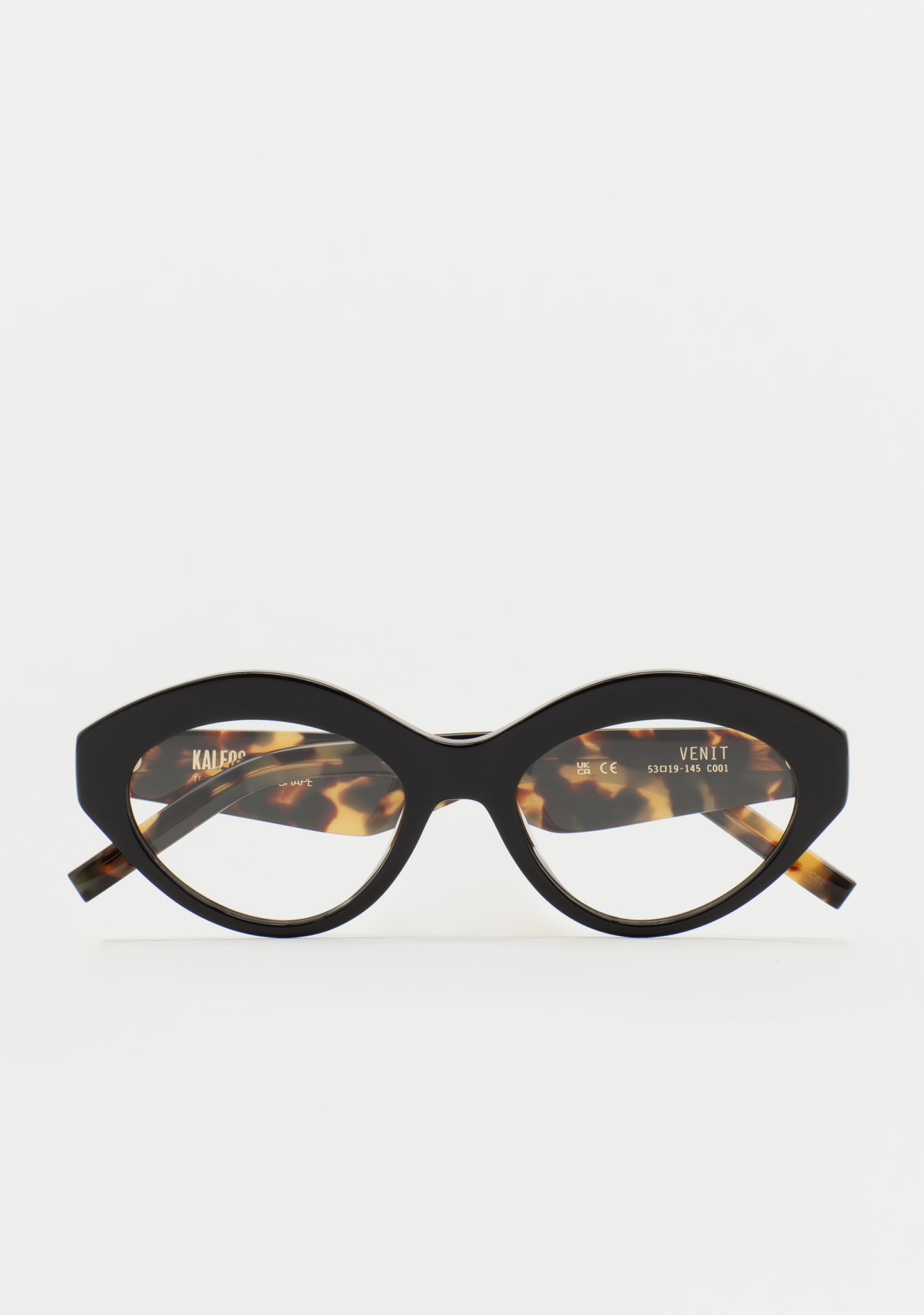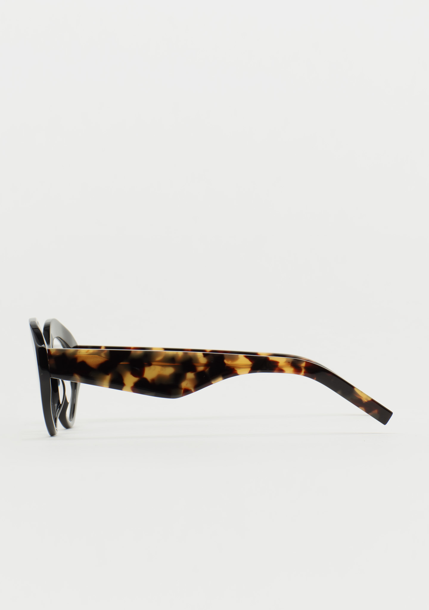 Lunettes de vue cat-eye. Audacieuses avec beaucoup de personnalité. Face avant en acétate noir. Branches en acétate havana brun. Plaquettes incorporées. Fait main.