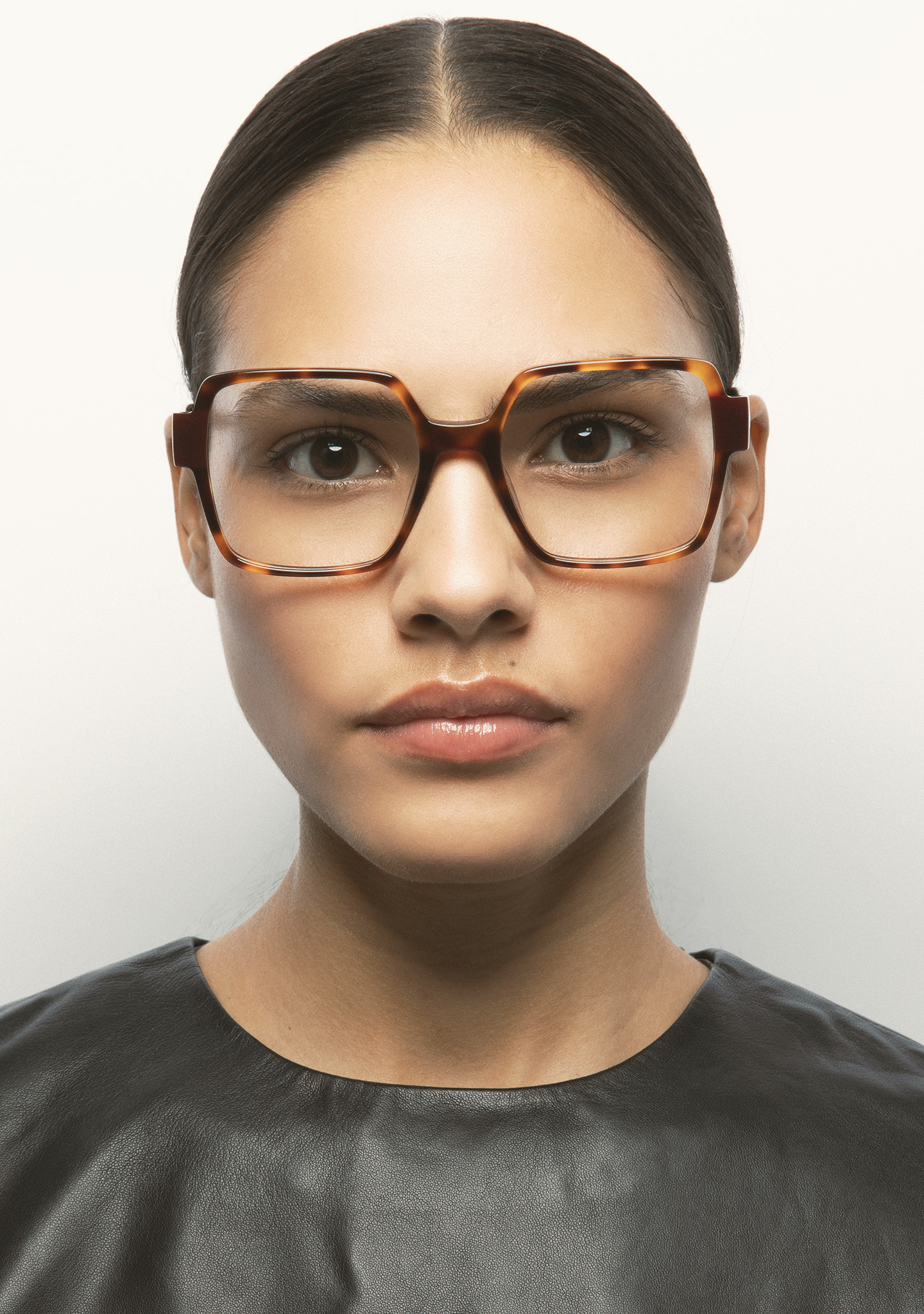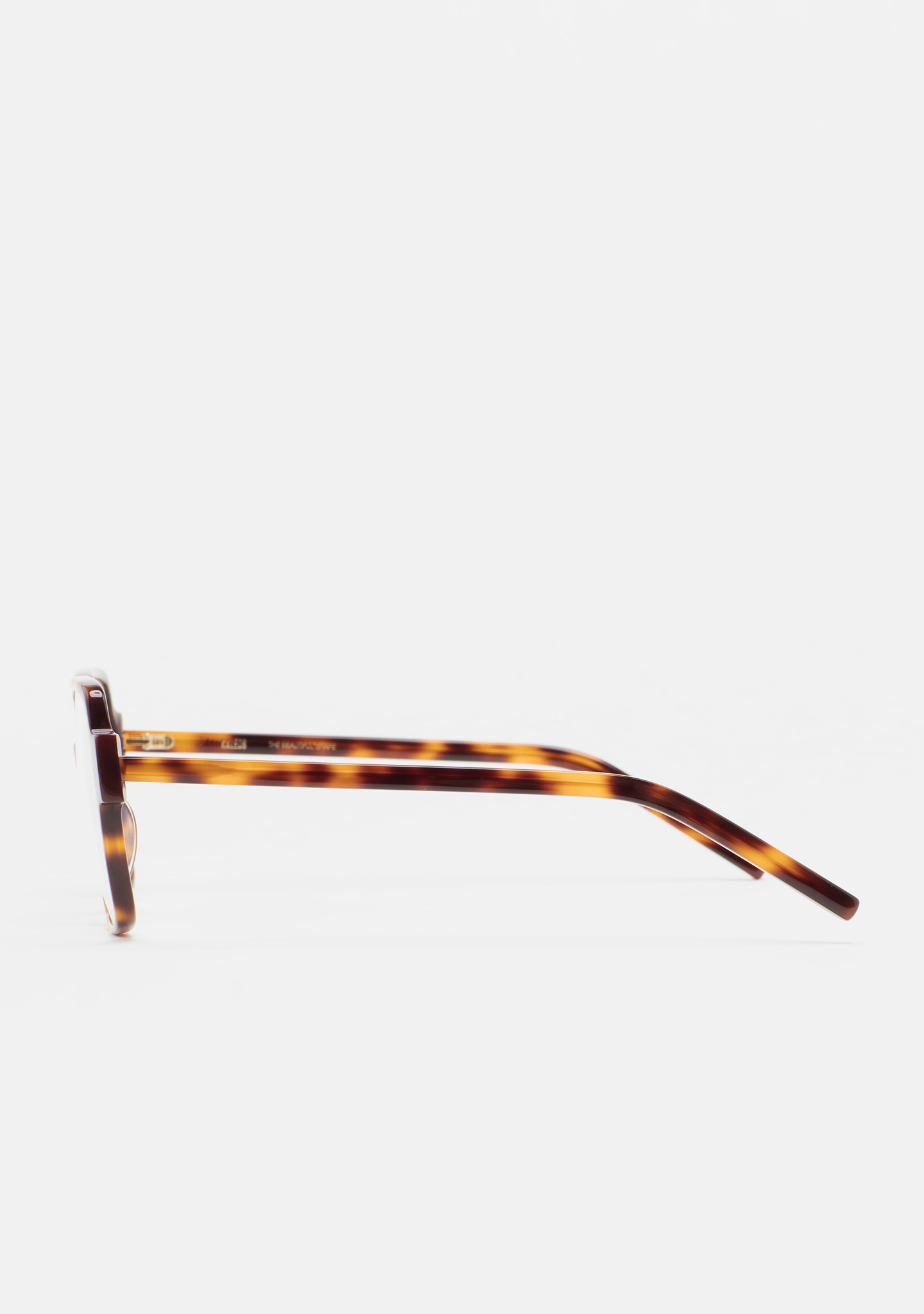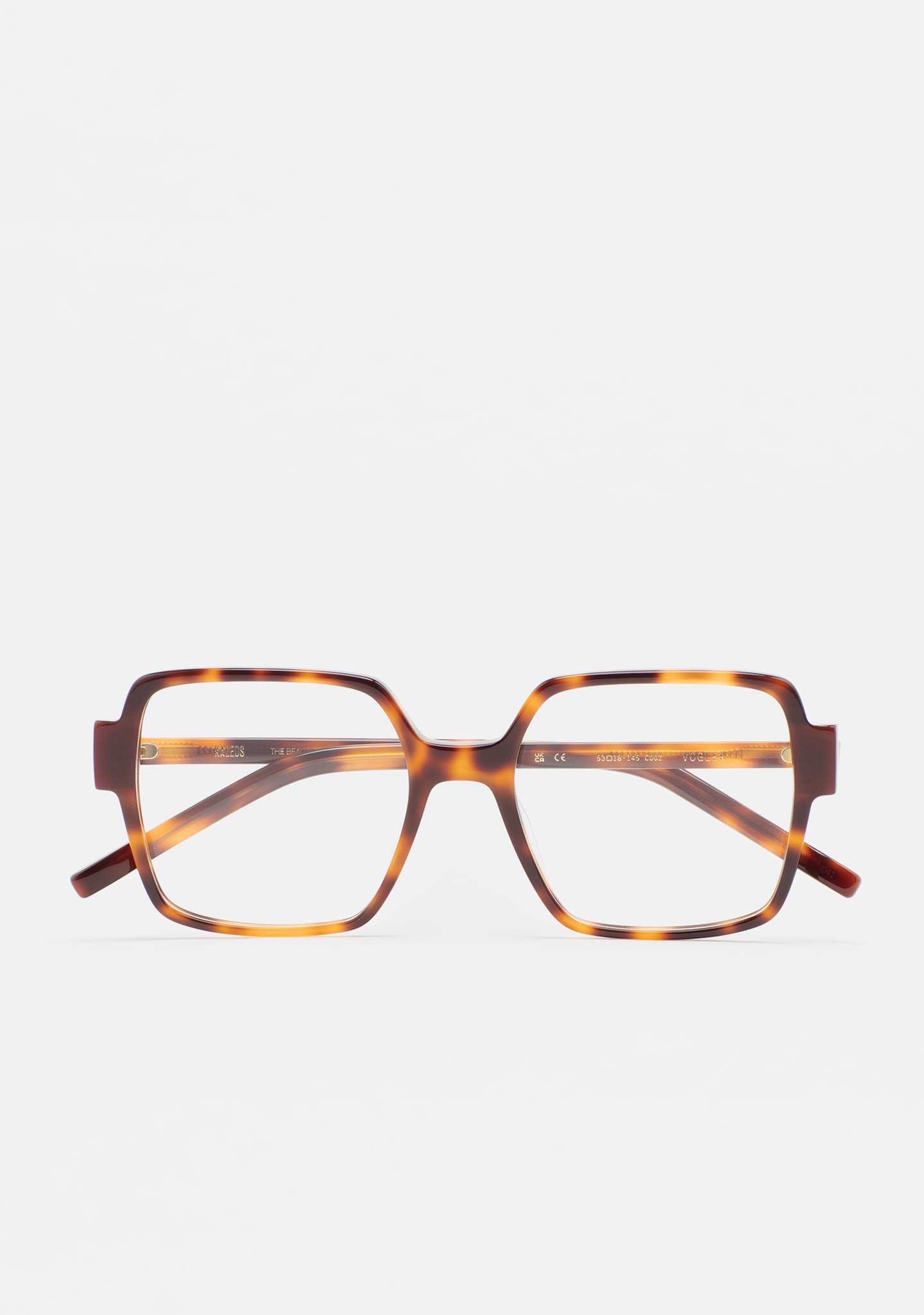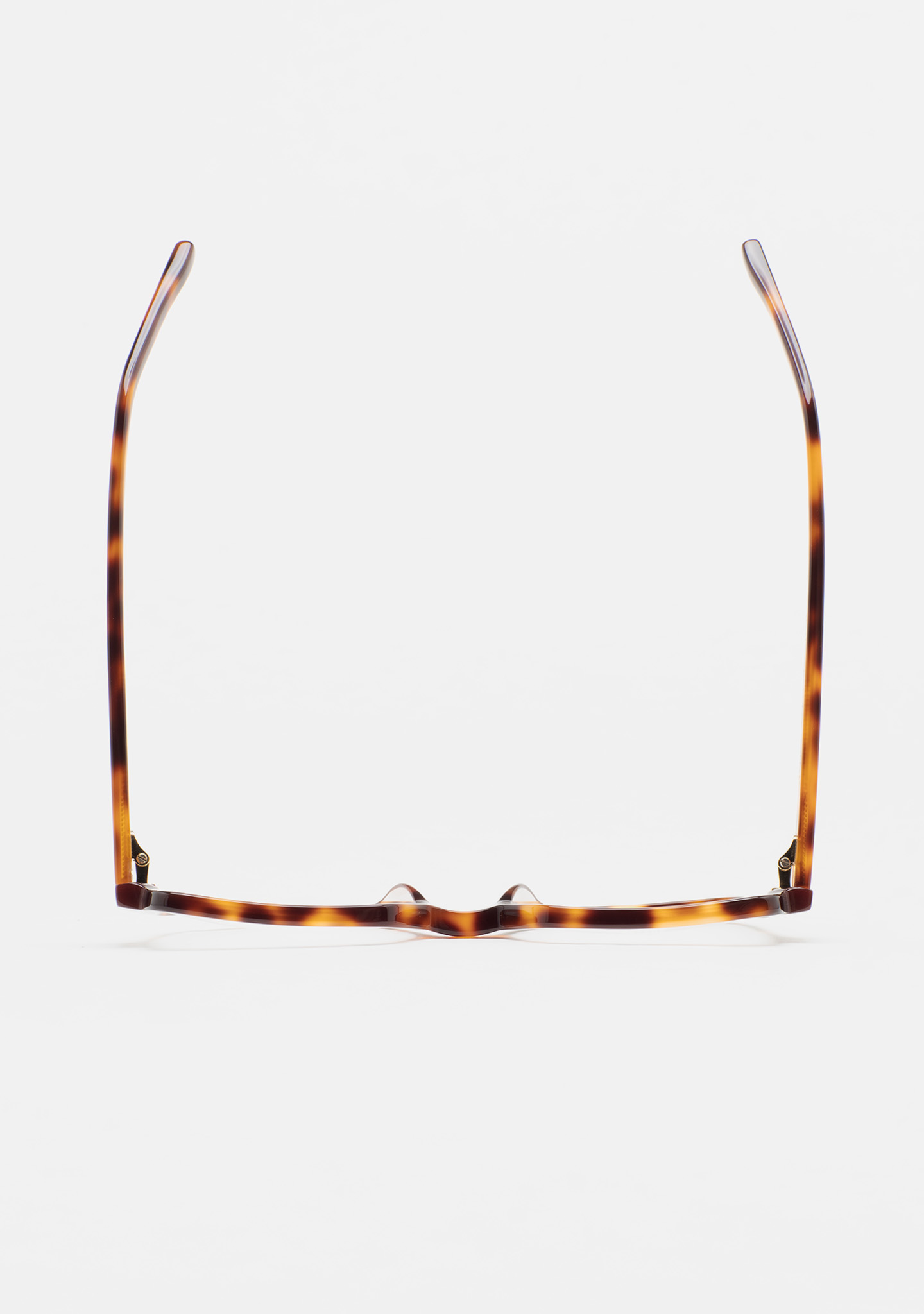 Lunettes de vue de forme carrée. Monture en acétate havane marron avec laminé marron translucide. Branches en acétate havane marron. Plaquettes en acétate intégrées. Fait main.