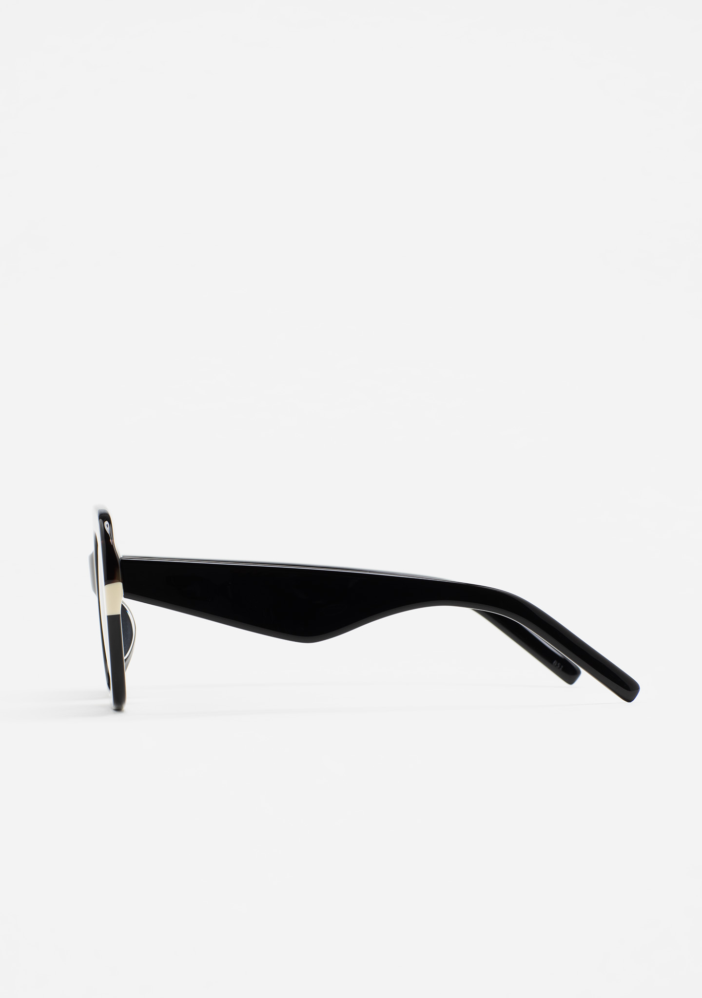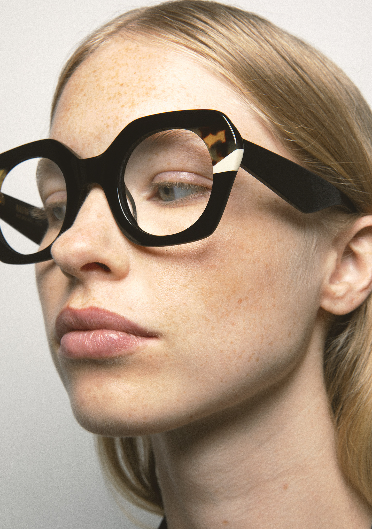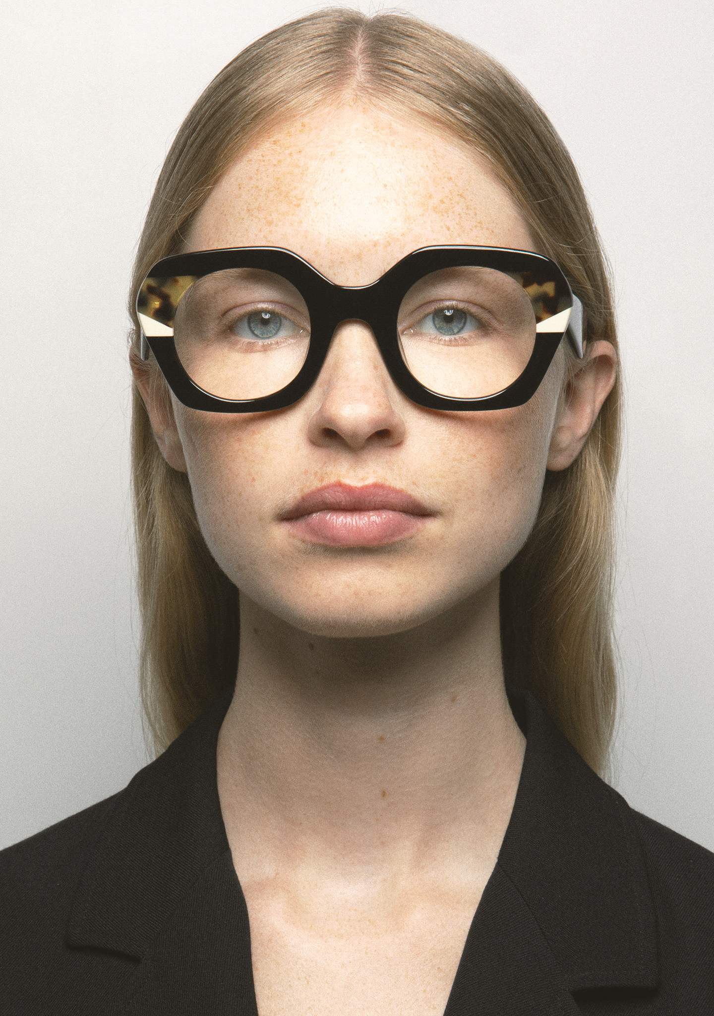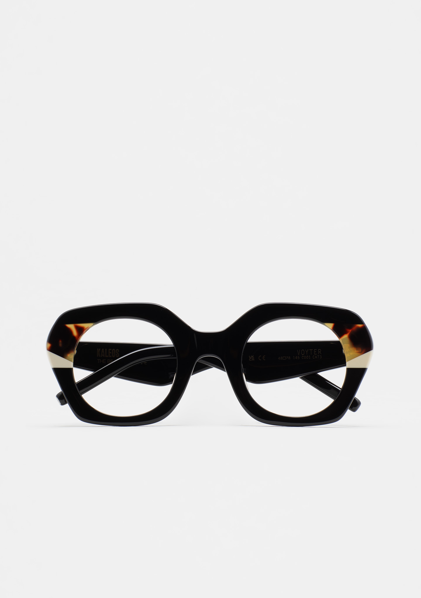 Lunettes de vue hexagonales. Frontal en acétate noir avec double laminage havane marron et blanc. Branches en acétate noir. Plaquettes fixes. Fait main.