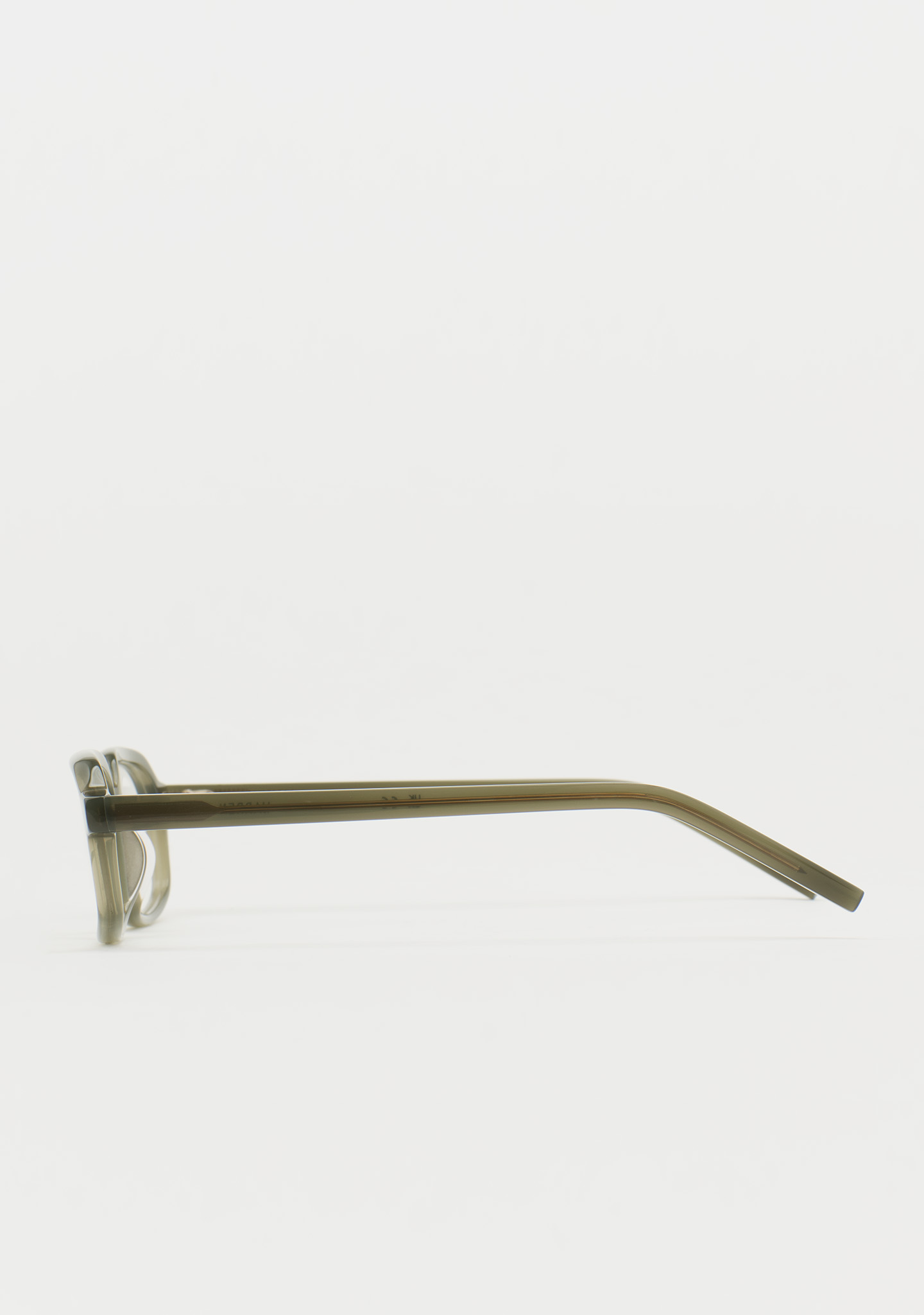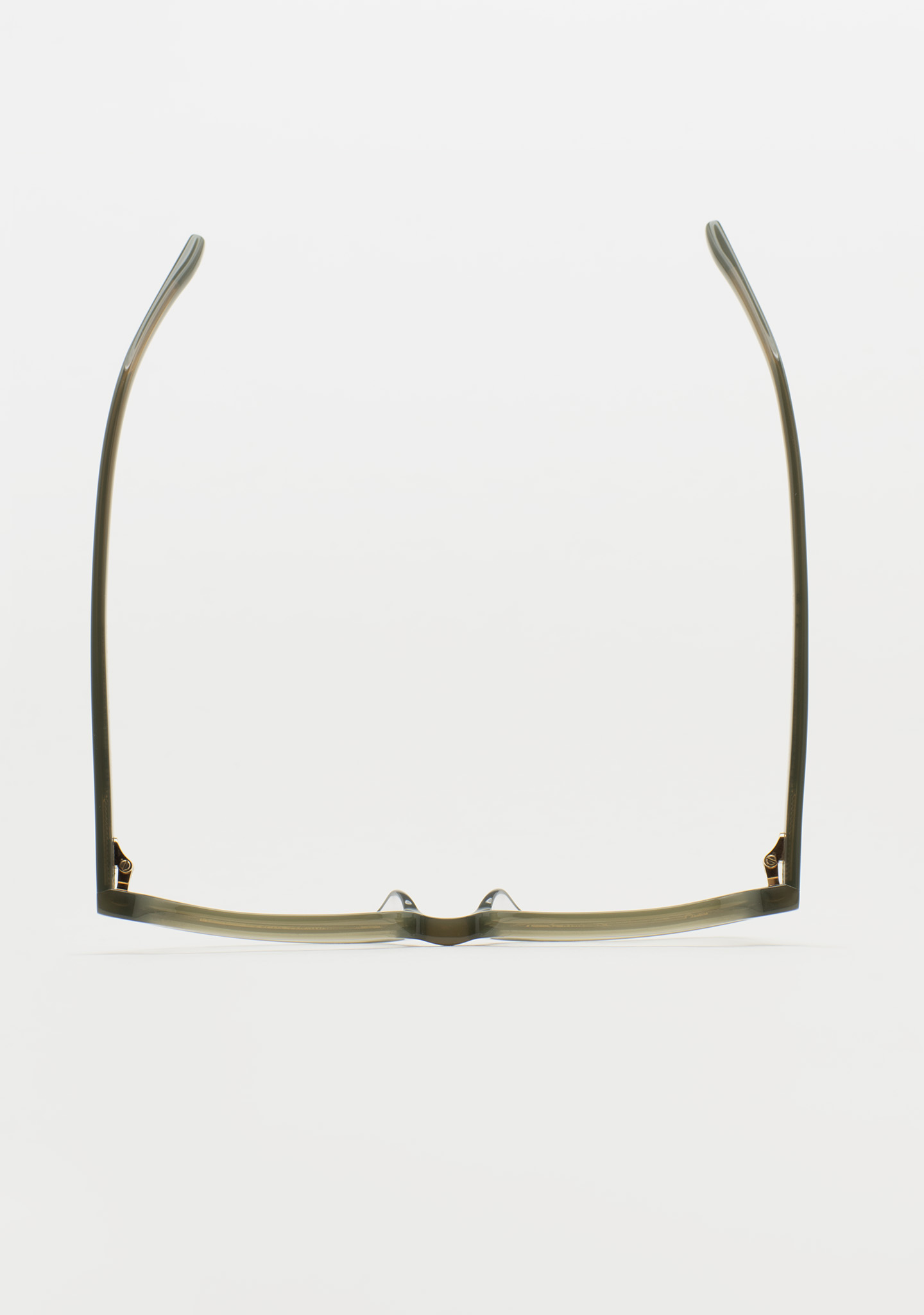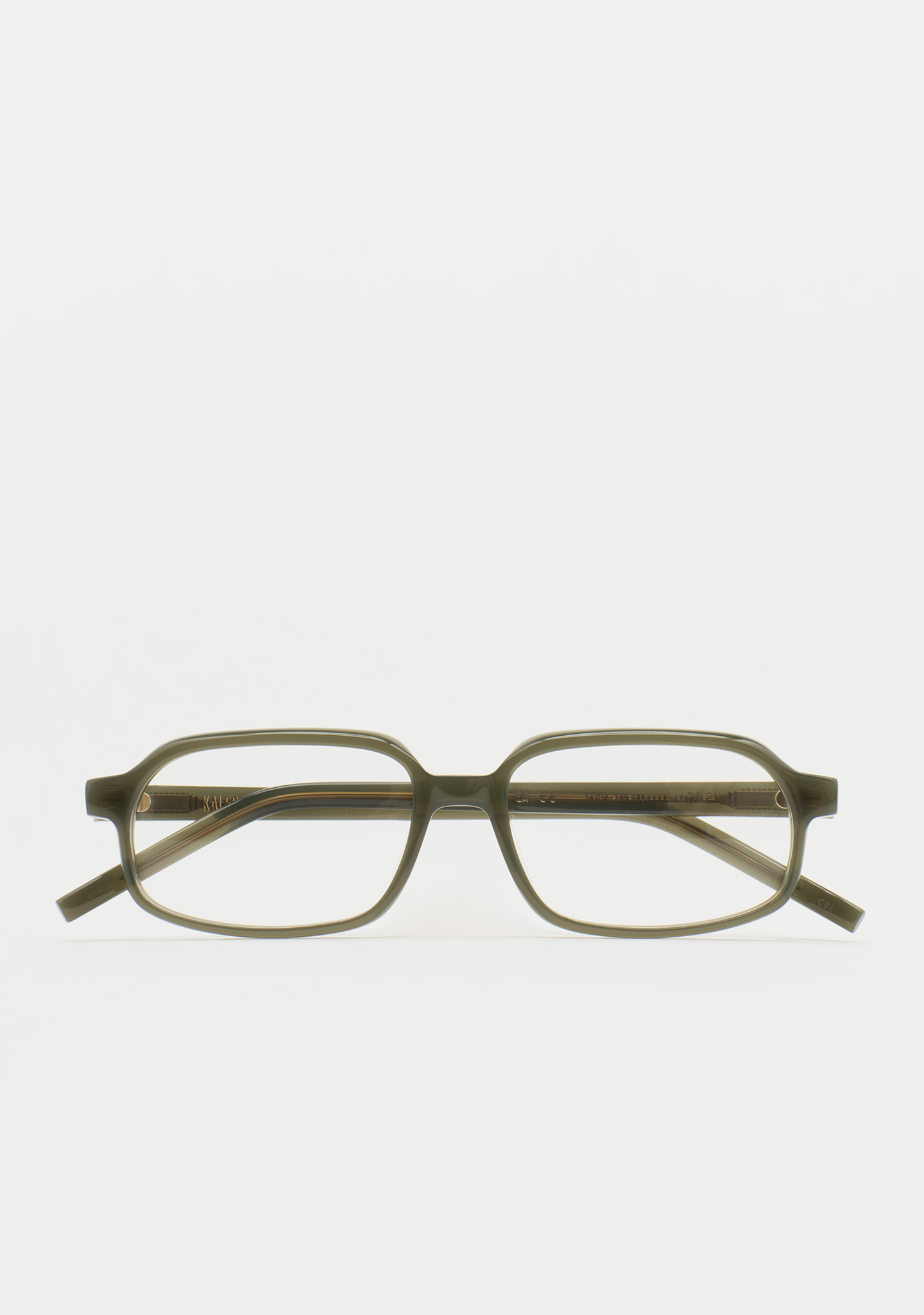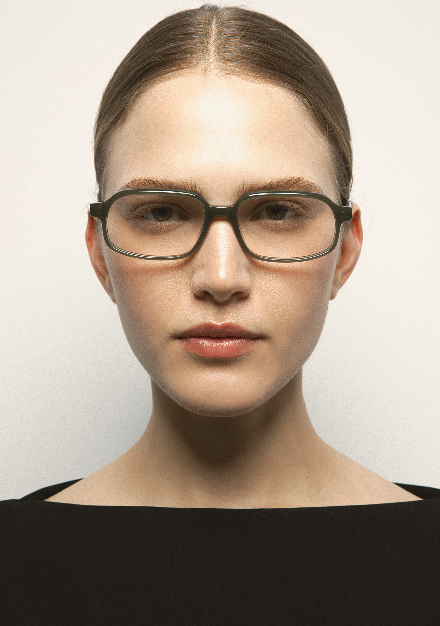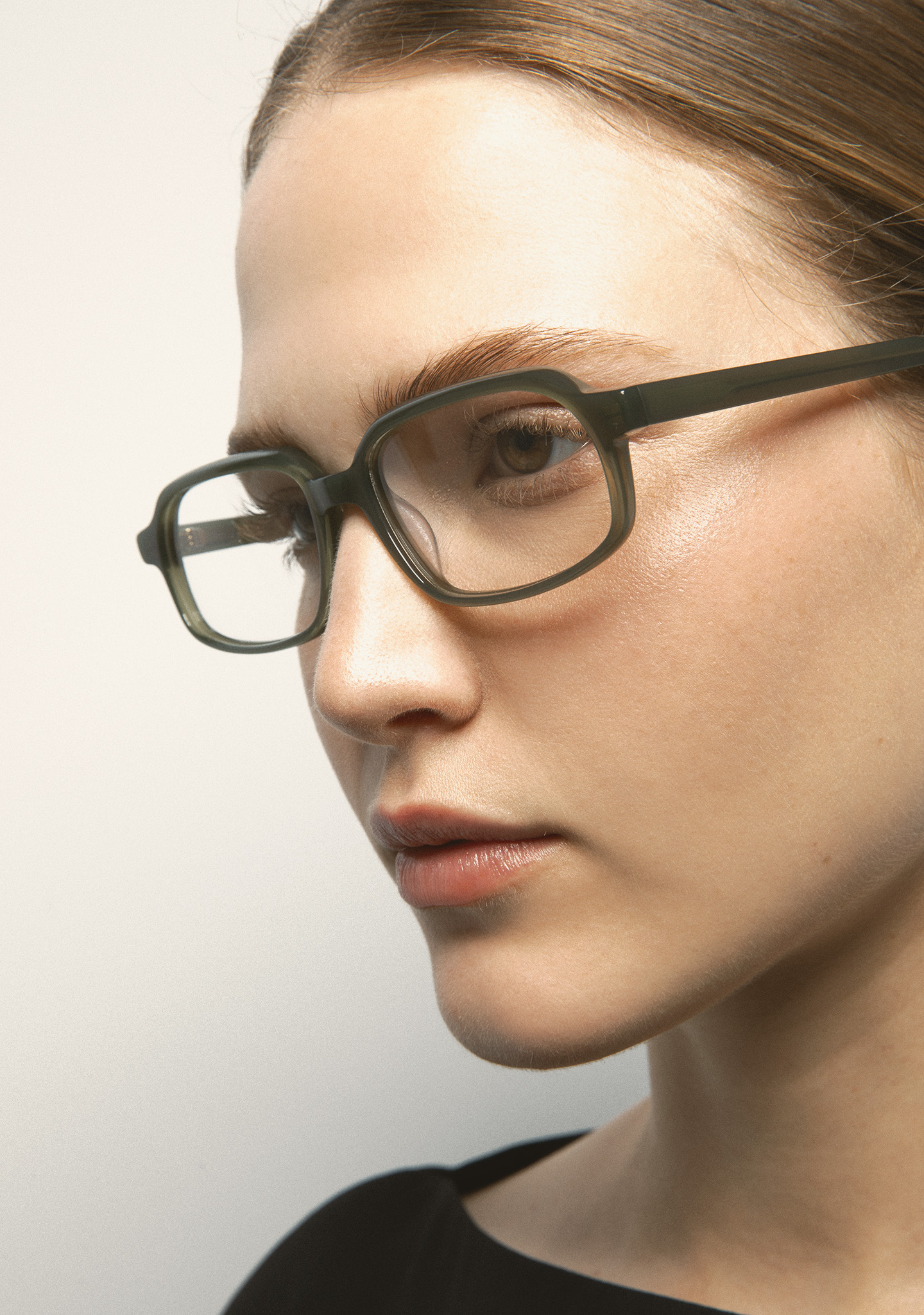 Lunettes de vue de forme rectangulaire. Minimalisme audacieux, détails raffinés. Face et branches en acétate vert translucide. Plaquettes en acétate intégrées. Fabriquées à la main.